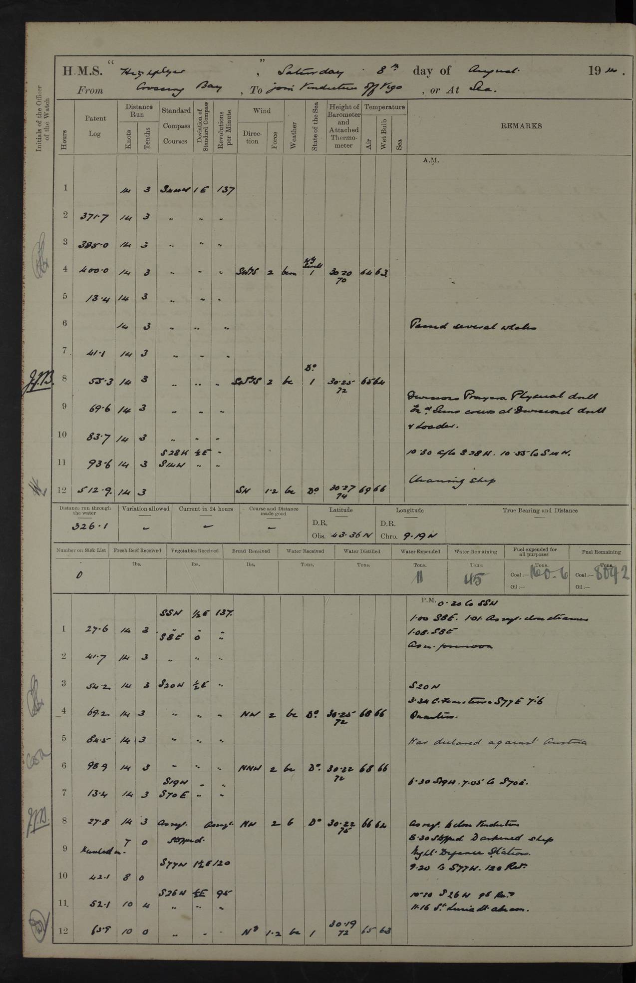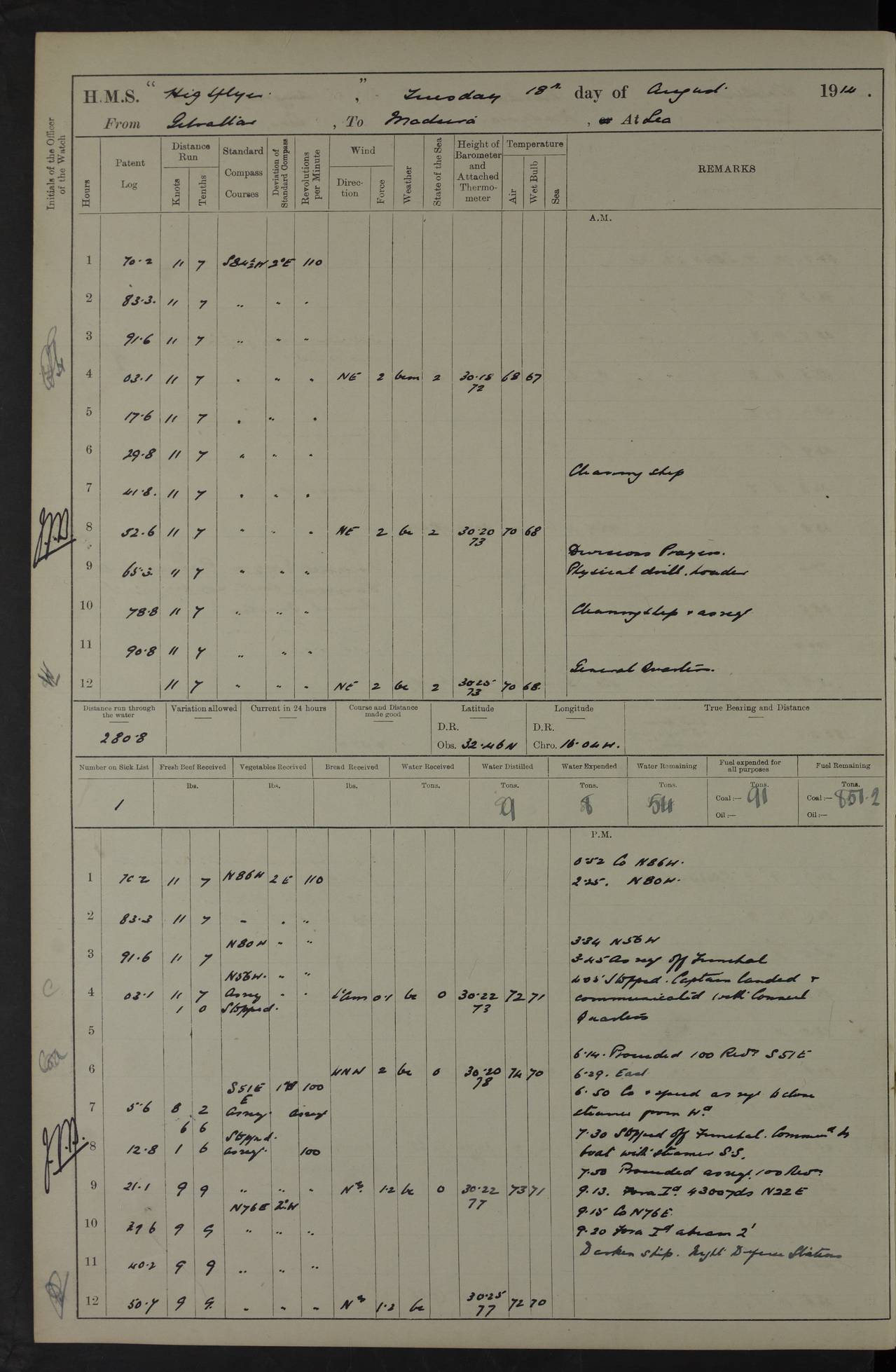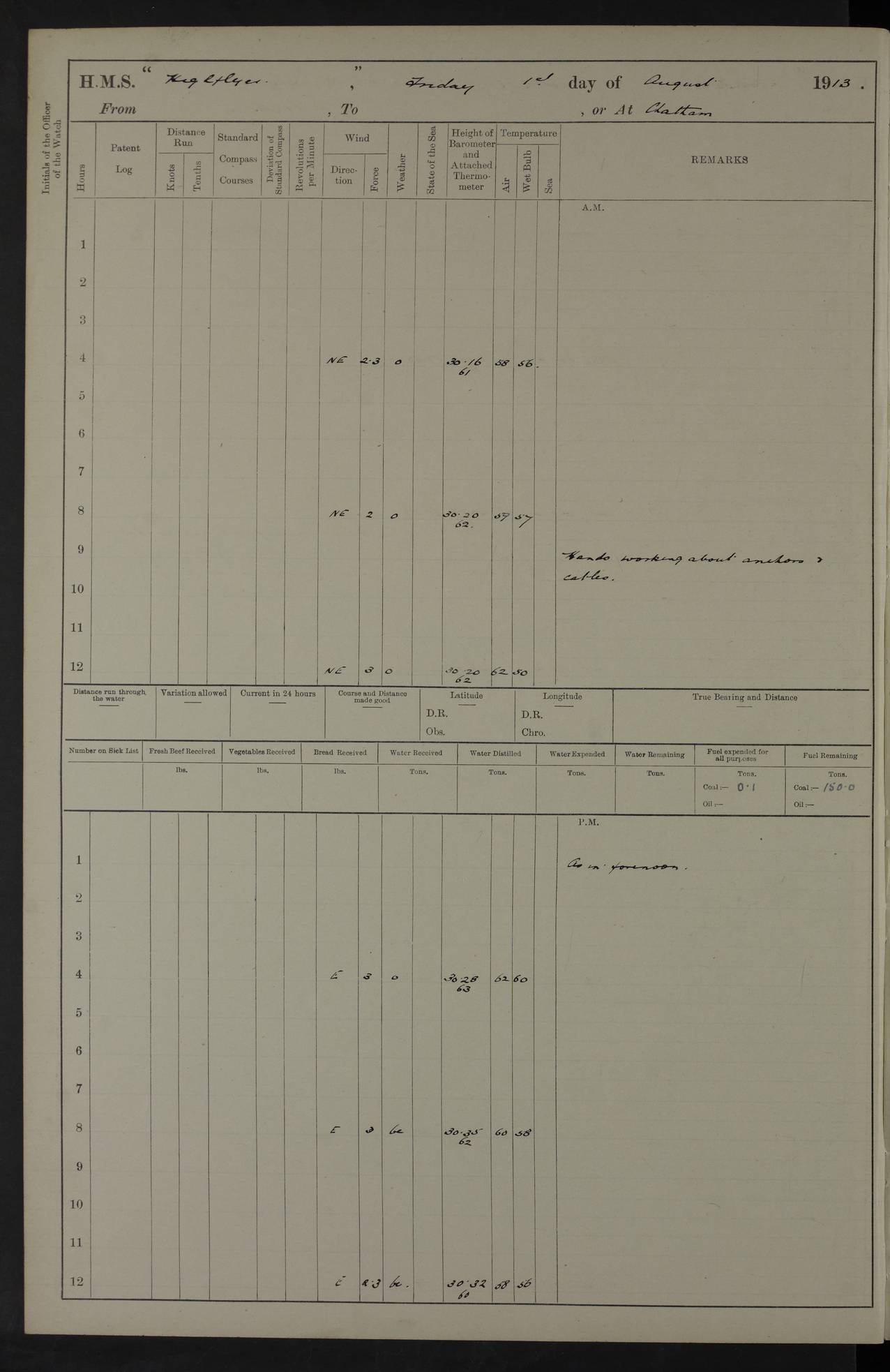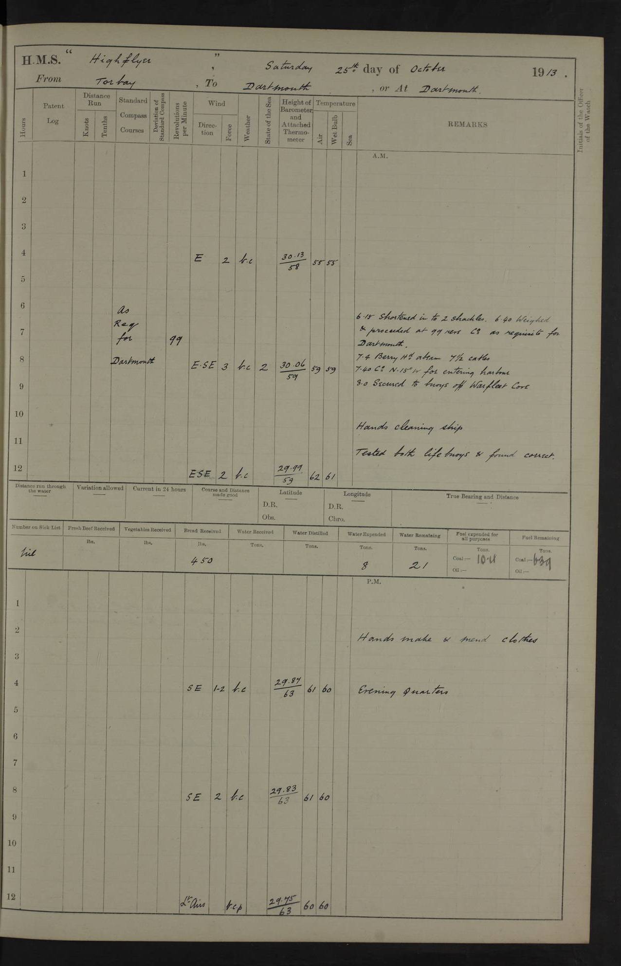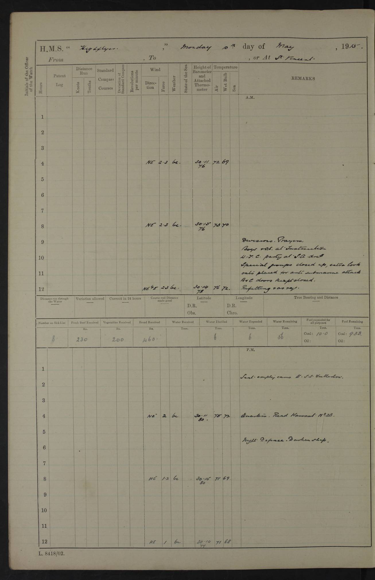 (Maps prepared using Journey Plotter, developed by Maikel. The Plots can only be approximate. They are made by joining-up positions on successive days, and sometimes positions are not given. There will therefore be occasions when the ship appears to have travelled overland) LOG BOOK – JUNE 14TH 1913 TO MAY 31ST 1914 4f960fe4a2fc8e2def00041b: (http://s3.amazonaws.com/oldweather/ADM53-44291/ADM 53-44291-001_0.jpg) 4f960fe5a2fc8e2def00041c: (http://s3.amazonaws.com/oldweather/ADM53-44291/ADM 53-44291-001_1.jpg) 4f960fe5a2fc8e2def00041d: (http://s3.amazonaws.com/oldweather/ADM53-44291/ADM 53-44291-002_0.jpg) 4f960fe5a2fc8e2def00041e: (http://s3.amazonaws.com/oldweather/ADM53-44291/ADM 53-44291-002_1.jpg) LOG of HMS Highflyer Commanded by Captain HT Buller MVO FOR THE PERIOD Commencing Saturday 14th June 1913 Ending Sunday 31st May 1914 Tonnage (displacement): 5600 Extreme length: 350 ft Extreme breadth: 54 ft ENGINES Manufacturer: Fairfield Shipbuilding & Engineering Co, Glasgow IHP: 10.000 Description: Vertical triple expansion 4 cylinders When fixed on board: 1898 BOILERS Manufacturer: Fairfield Shipbuilding & Engineering Co Description: Belleville with economisers 18 in No When made: 1898 When put in vessel: 1898 SCREW PROPELLER Manufacturer: Fairfield Shipbuilding & Engineering Co Description: Twin 3 bladed Admiralty design (bronze) General state of repair: Good 4f960fe6a2fc8e2def00041f: (http://s3.amazonaws.com/oldweather/ADM53-44291/ADM 53-44291-003_0.jpg) [Directions for using the log, figures to indicate the force of the wind and the state of the sea, and letters to denote the state of the weather.] 4f960fe6a2fc8e2def000420: (http://s3.amazonaws.com/oldweather/ADM53-44291/ADM 53-44291-003_1.jpg) Establishment of ship’s company Officers 32 Seamen 164 Boys 24 Marines 50 Engine-room establishment 134 Other non-executive ratings 466 BAROMETER Mercurial or aneroid: Mercurial Name of maker & number: Adie A 577 Height of cistern above sea: 9 feet Thermometers for air temperature Position in ship: Fore bridge Whether in screen: Yes Maker & number: Negretti & Zambra MO/A 9607 dry; from June 14, 1913 to June 1, 1914 MO/A 9603 wet; from June 14, 1913 to June 1, 1914 Thermometer for sea temperature Maker & number: J Hicks A 434; from June 14, 1913 to June 1, 1914 Position of standard compass Fore upper bridge DEVIATION OF STANDARD COMPASS Date obtained: August 29th 1913 Position: Sheerness, No 28 buoy ARMAMENT Fxle: one 6” QF PII S waist: four 6” QF PII P waist: four 6” QF PII OD: two 6” QF PII Battle deck: two 12-pounder 12-cwt SII S waist: three 12-pounder 12-cwt SII P waist: three 12-pounder 12-cwt SII AS deck: 3-pounder QF (Hotchkiss) P waist: 12-pounder 8-cwt field gun Torpedo armament 2 18” tubes BOATS 2 pinnaces, 36 ft sailing 2 cutters 1 gig, 30 ft 1 whaler 1 steam cutter, 32 ft MISCELLANEOUS INFORMATION Draught of water with bunkers full, and complete with provisions, stores and water: forward 22 ft 0 in, aft 23 ft 2 in Load draught, 600 tons coal: forward 19 ft 6 in, aft 21 ft 6 in Number of tons necessary to increase draught 1 inch: 31.5 Number of tons of coal carried (43 cubic feet per ton): a) At load draught, 600 b) With bunkers full, 1132 c) In places other than bunkers, nil Quantity of water carried: a) For boilers, 207 tons b) For drinking 60 tons THE VOYAGES OF HMS HIGHFLYER 1913-1914