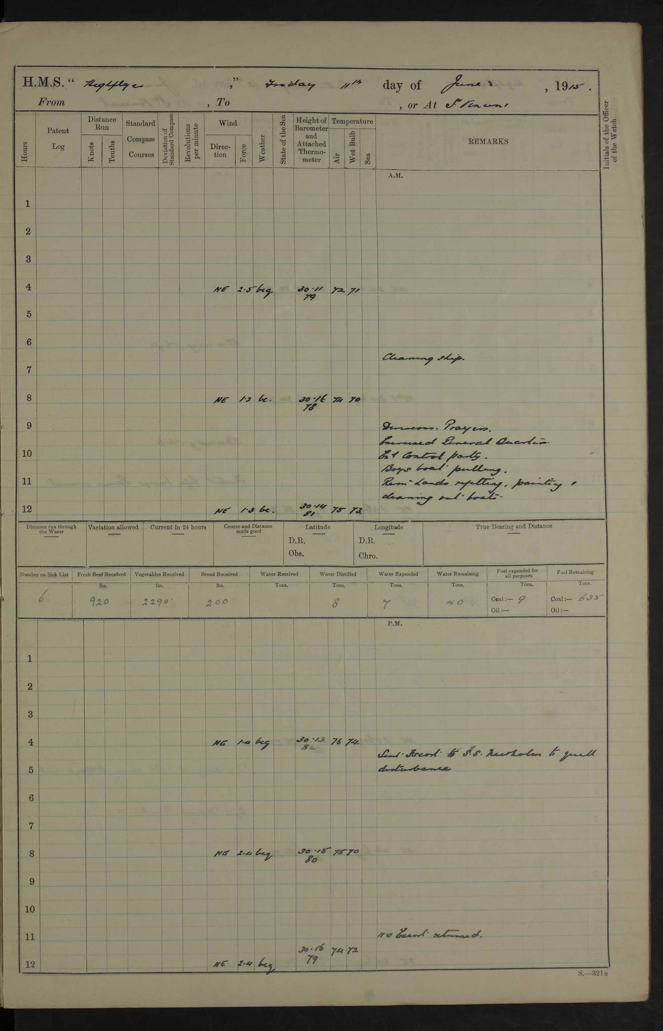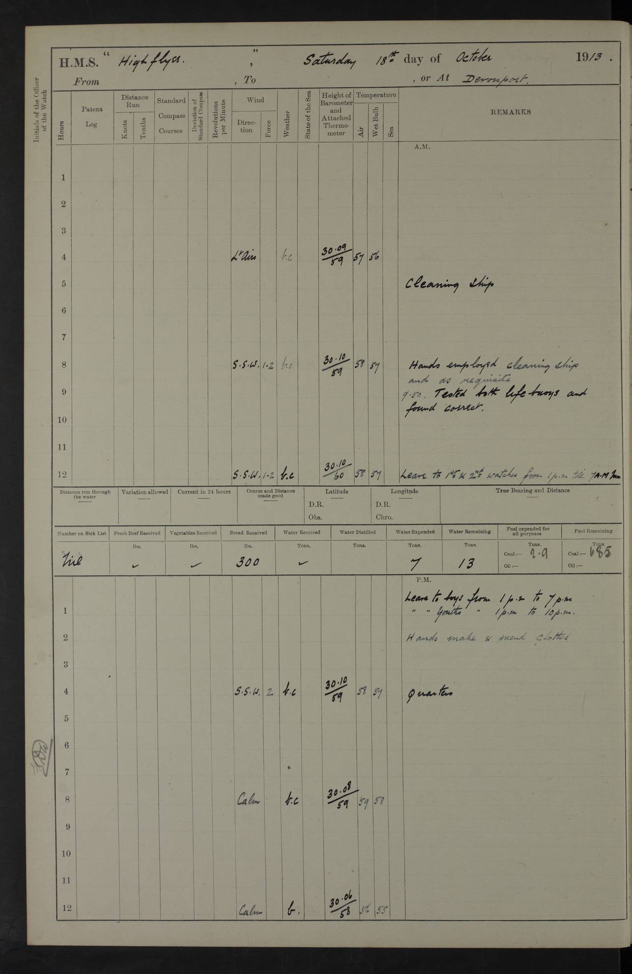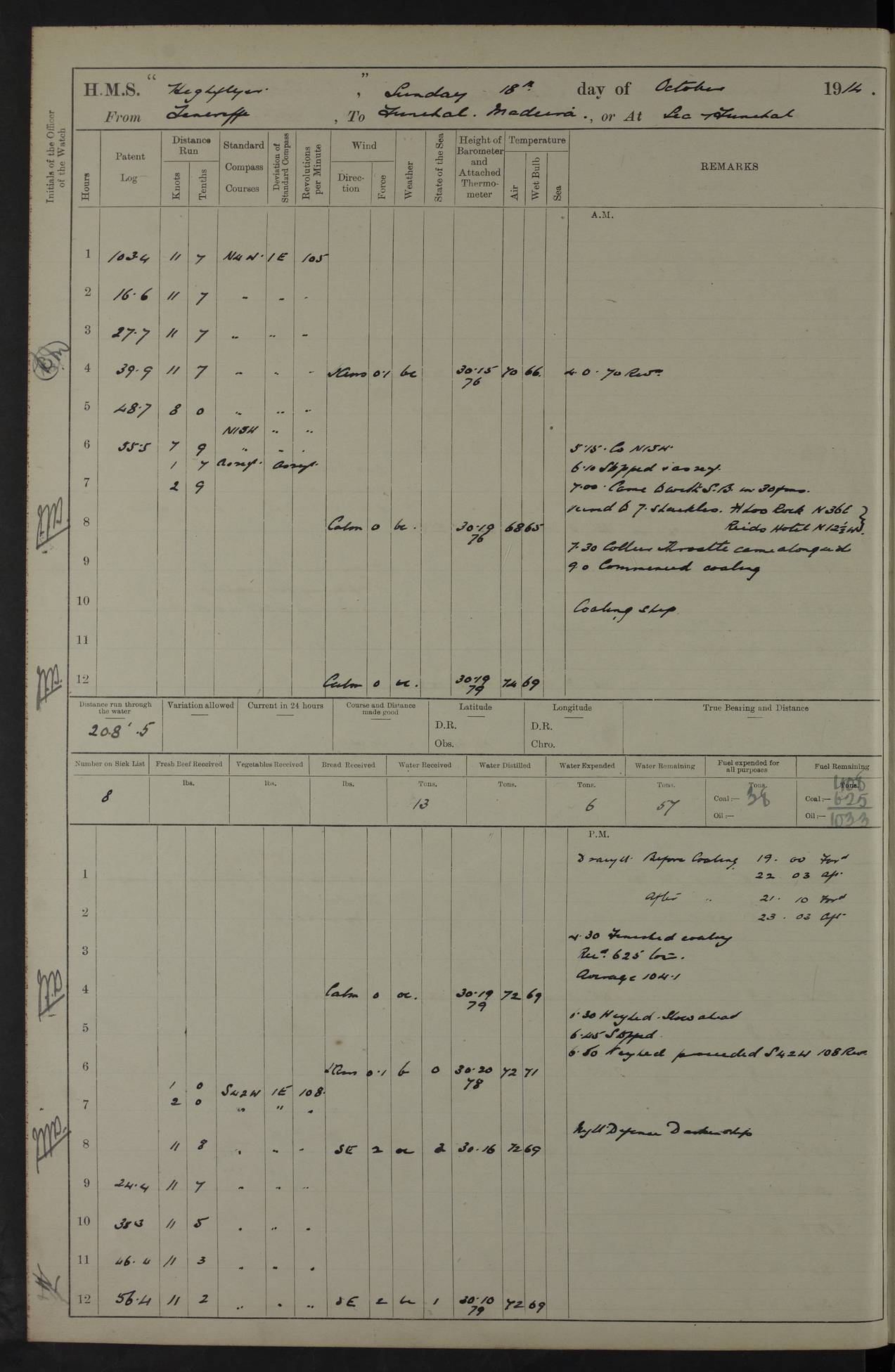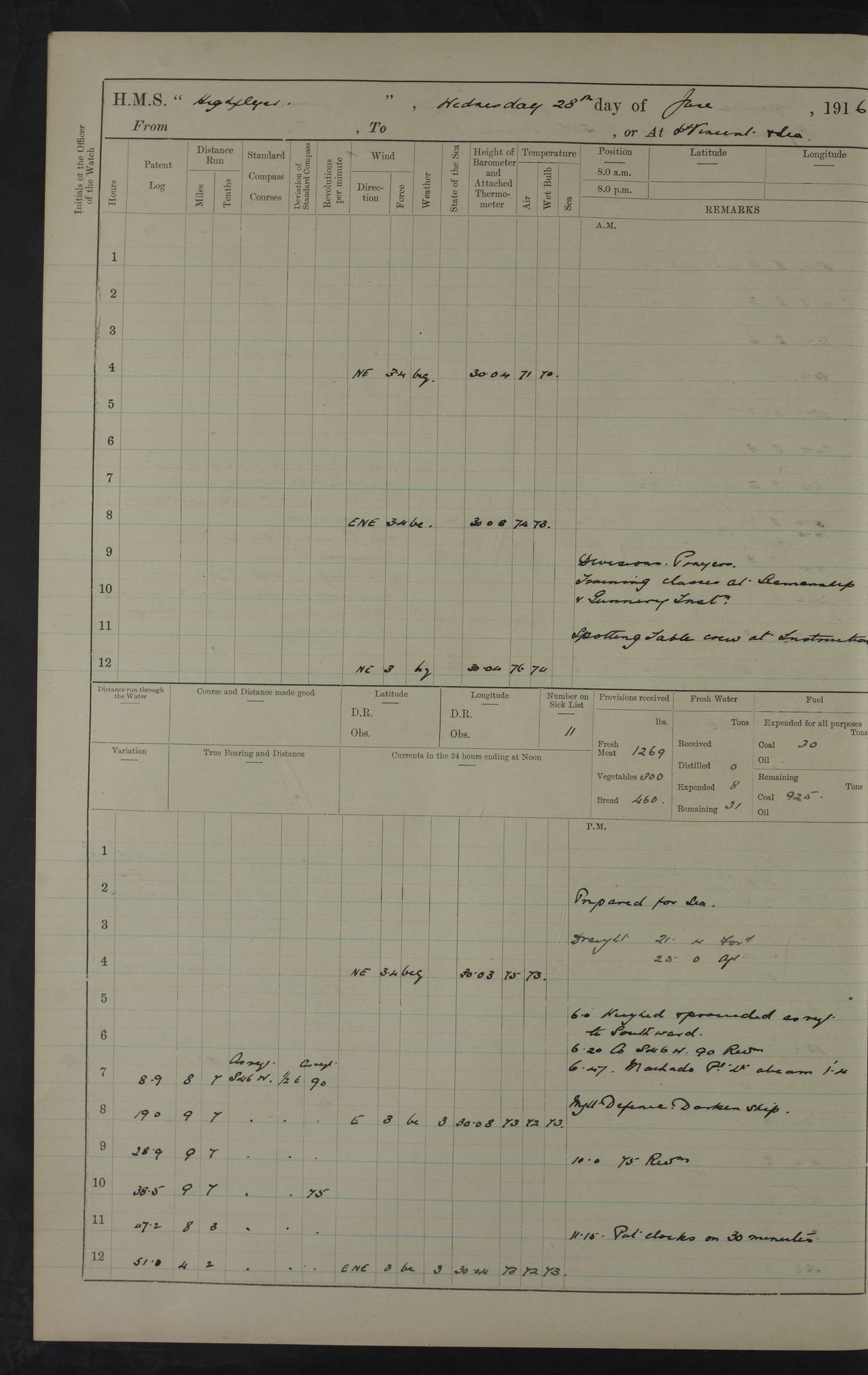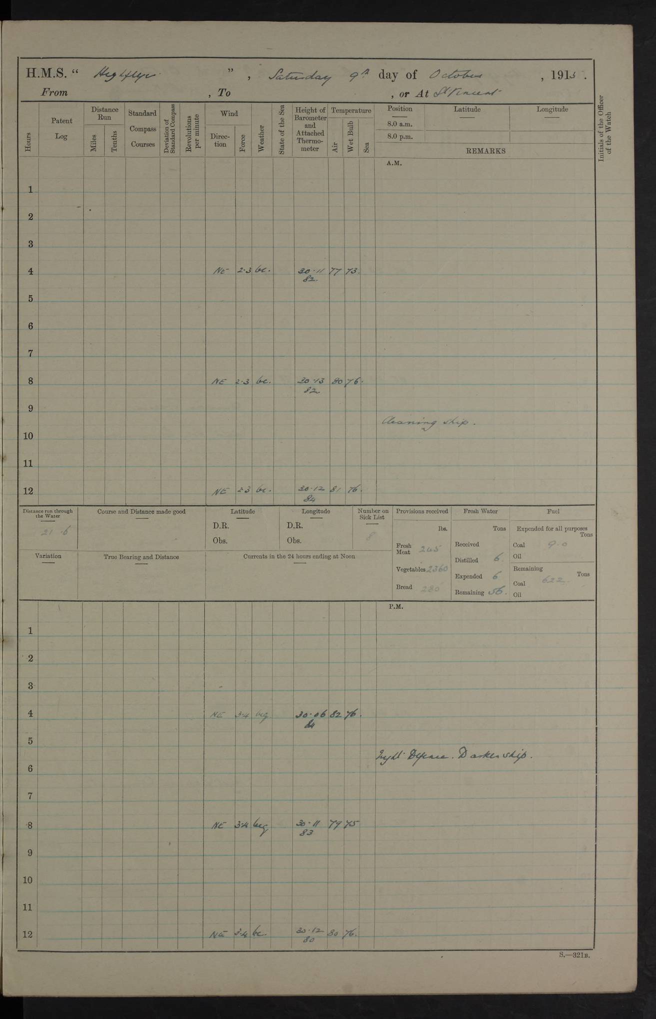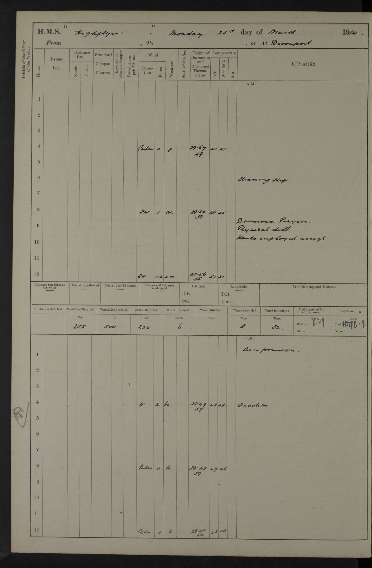 (Maps prepared using Journey Plotter, developed by Maikel. The Plots can only be approximate. They are made by joining-up positions on successive days, and sometimes positions are not given. There will therefore be occasions when the ship appears to have travelled overland) LOG BOOK – JUNE 14TH 1913 TO MAY 31ST 1914 4f960fe4a2fc8e2def00041b: (http://s3.amazonaws.com/oldweather/ADM53-44291/ADM 53-44291-001_0.jpg) 4f960fe5a2fc8e2def00041c: (http://s3.amazonaws.com/oldweather/ADM53-44291/ADM 53-44291-001_1.jpg) 4f960fe5a2fc8e2def00041d: (http://s3.amazonaws.com/oldweather/ADM53-44291/ADM 53-44291-002_0.jpg) 4f960fe5a2fc8e2def00041e: (http://s3.amazonaws.com/oldweather/ADM53-44291/ADM 53-44291-002_1.jpg) LOG of HMS Highflyer Commanded by Captain HT Buller MVO FOR THE PERIOD Commencing Saturday 14th June 1913 Ending Sunday 31st May 1914 Tonnage (displacement): 5600 Extreme length: 350 ft Extreme breadth: 54 ft ENGINES Manufacturer: Fairfield Shipbuilding & Engineering Co, Glasgow IHP: 10.000 Description: Vertical triple expansion 4 cylinders When fixed on board: 1898 BOILERS Manufacturer: Fairfield Shipbuilding & Engineering Co Description: Belleville with economisers 18 in No When made: 1898 When put in vessel: 1898 SCREW PROPELLER Manufacturer: Fairfield Shipbuilding & Engineering Co Description: Twin 3 bladed Admiralty design (bronze) General state of repair: Good 4f960fe6a2fc8e2def00041f: (http://s3.amazonaws.com/oldweather/ADM53-44291/ADM 53-44291-003_0.jpg) [Directions for using the log, figures to indicate the force of the wind and the state of the sea, and letters to denote the state of the weather.] 4f960fe6a2fc8e2def000420: (http://s3.amazonaws.com/oldweather/ADM53-44291/ADM 53-44291-003_1.jpg) Establishment of ship’s company Officers 32 Seamen 164 Boys 24 Marines 50 Engine-room establishment 134 Other non-executive ratings 466 BAROMETER Mercurial or aneroid: Mercurial Name of maker & number: Adie A 577 Height of cistern above sea: 9 feet Thermometers for air temperature Position in ship: Fore bridge Whether in screen: Yes Maker & number: Negretti & Zambra MO/A 9607 dry; from June 14, 1913 to June 1, 1914 MO/A 9603 wet; from June 14, 1913 to June 1, 1914 Thermometer for sea temperature Maker & number: J Hicks A 434; from June 14, 1913 to June 1, 1914 Position of standard compass Fore upper bridge DEVIATION OF STANDARD COMPASS Date obtained: August 29th 1913 Position: Sheerness, No 28 buoy ARMAMENT Fxle: one 6” QF PII S waist: four 6” QF PII P waist: four 6” QF PII OD: two 6” QF PII Battle deck: two 12-pounder 12-cwt SII S waist: three 12-pounder 12-cwt SII P waist: three 12-pounder 12-cwt SII AS deck: 3-pounder QF (Hotchkiss) P waist: 12-pounder 8-cwt field gun Torpedo armament 2 18” tubes BOATS 2 pinnaces, 36 ft sailing 2 cutters 1 gig, 30 ft 1 whaler 1 steam cutter, 32 ft MISCELLANEOUS INFORMATION Draught of water with bunkers full, and complete with provisions, stores and water: forward 22 ft 0 in, aft 23 ft 2 in Load draught, 600 tons coal: forward 19 ft 6 in, aft 21 ft 6 in Number of tons necessary to increase draught 1 inch: 31.5 Number of tons of coal carried (43 cubic feet per ton): a) At load draught, 600 b) With bunkers full, 1132 c) In places other than bunkers, nil Quantity of water carried: a) For boilers, 207 tons b) For drinking 60 tons THE VOYAGES OF HMS HIGHFLYER 1913-1914