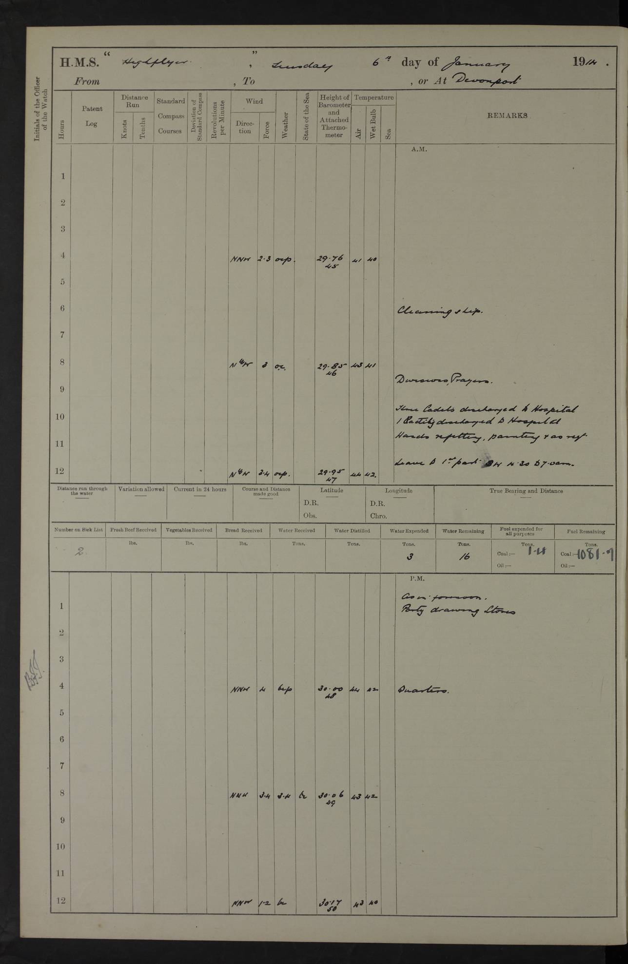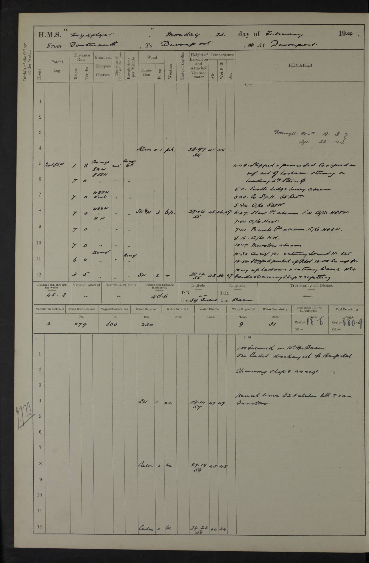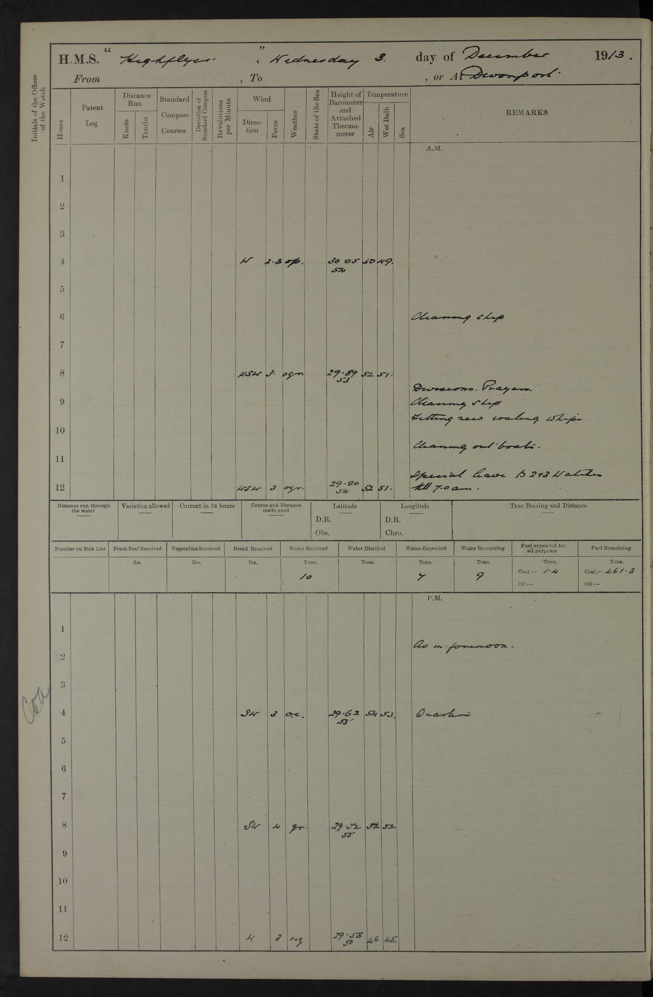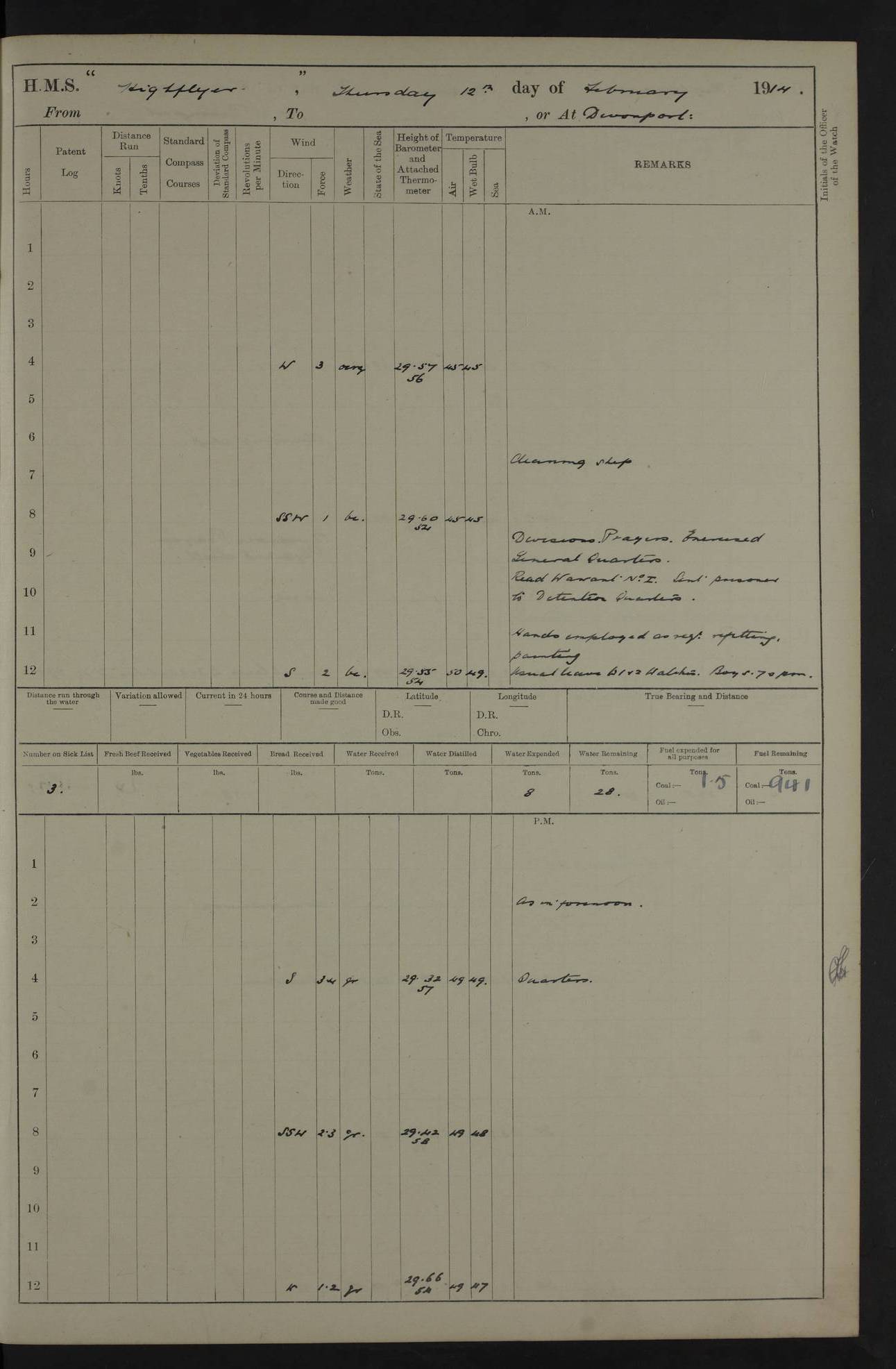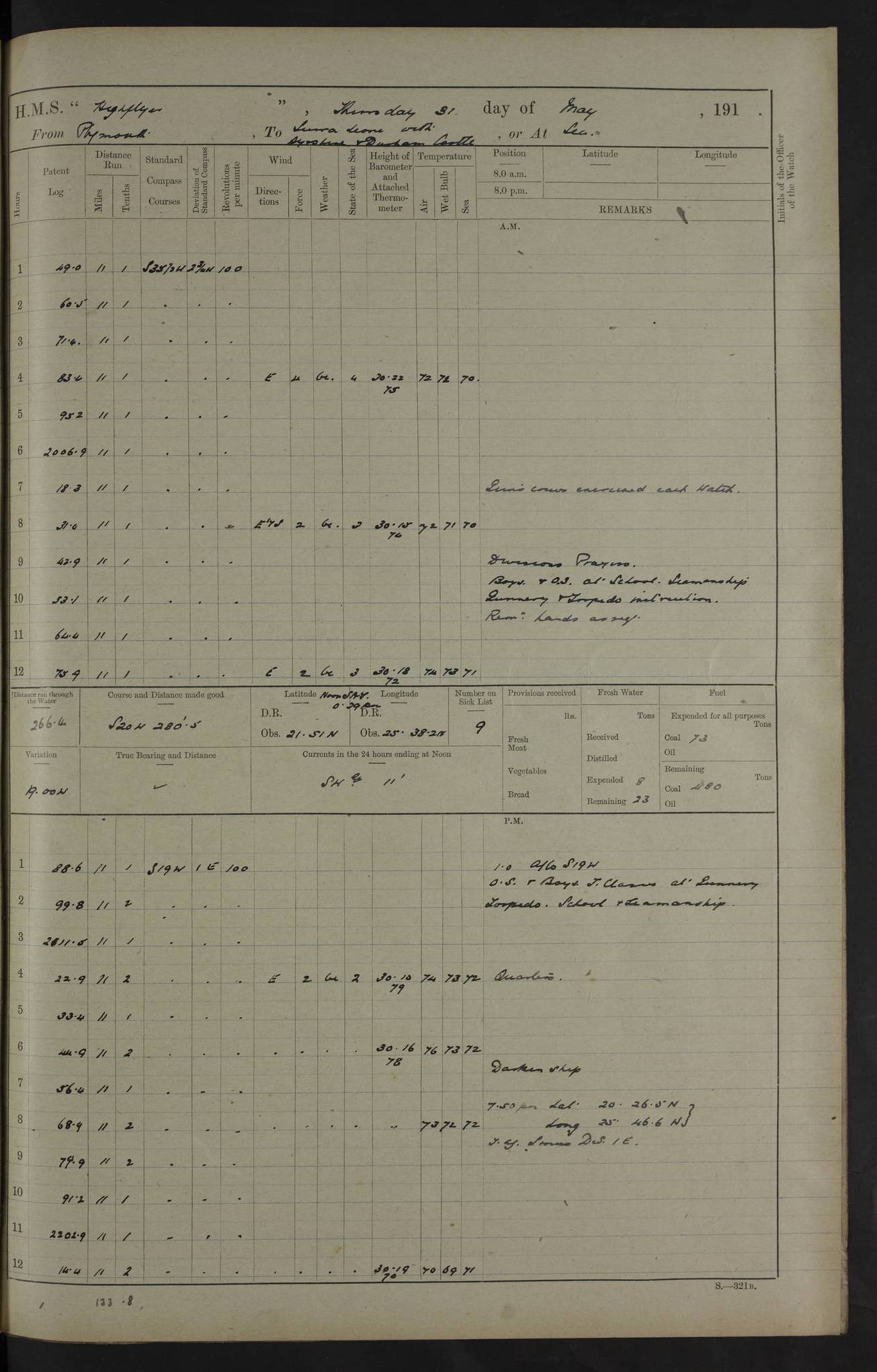 (Maps prepared using Journey Plotter, developed by Maikel. The Plots can only be approximate. They are made by joining-up positions on successive days, and sometimes positions are not given. There will therefore be occasions when the ship appears to have travelled overland) LOG BOOK – JUNE 14TH 1913 TO MAY 31ST 1914 4f960fe4a2fc8e2def00041b: (http://s3.amazonaws.com/oldweather/ADM53-44291/ADM 53-44291-001_0.jpg) 4f960fe5a2fc8e2def00041c: (http://s3.amazonaws.com/oldweather/ADM53-44291/ADM 53-44291-001_1.jpg) 4f960fe5a2fc8e2def00041d: (http://s3.amazonaws.com/oldweather/ADM53-44291/ADM 53-44291-002_0.jpg) 4f960fe5a2fc8e2def00041e: (http://s3.amazonaws.com/oldweather/ADM53-44291/ADM 53-44291-002_1.jpg) LOG of HMS Highflyer Commanded by Captain HT Buller MVO FOR THE PERIOD Commencing Saturday 14th June 1913 Ending Sunday 31st May 1914 Tonnage (displacement): 5600 Extreme length: 350 ft Extreme breadth: 54 ft ENGINES Manufacturer: Fairfield Shipbuilding & Engineering Co, Glasgow IHP: 10.000 Description: Vertical triple expansion 4 cylinders When fixed on board: 1898 BOILERS Manufacturer: Fairfield Shipbuilding & Engineering Co Description: Belleville with economisers 18 in No When made: 1898 When put in vessel: 1898 SCREW PROPELLER Manufacturer: Fairfield Shipbuilding & Engineering Co Description: Twin 3 bladed Admiralty design (bronze) General state of repair: Good 4f960fe6a2fc8e2def00041f: (http://s3.amazonaws.com/oldweather/ADM53-44291/ADM 53-44291-003_0.jpg) [Directions for using the log, figures to indicate the force of the wind and the state of the sea, and letters to denote the state of the weather.] 4f960fe6a2fc8e2def000420: (http://s3.amazonaws.com/oldweather/ADM53-44291/ADM 53-44291-003_1.jpg) Establishment of ship’s company Officers 32 Seamen 164 Boys 24 Marines 50 Engine-room establishment 134 Other non-executive ratings 466 BAROMETER Mercurial or aneroid: Mercurial Name of maker & number: Adie A 577 Height of cistern above sea: 9 feet Thermometers for air temperature Position in ship: Fore bridge Whether in screen: Yes Maker & number: Negretti & Zambra MO/A 9607 dry; from June 14, 1913 to June 1, 1914 MO/A 9603 wet; from June 14, 1913 to June 1, 1914 Thermometer for sea temperature Maker & number: J Hicks A 434; from June 14, 1913 to June 1, 1914 Position of standard compass Fore upper bridge DEVIATION OF STANDARD COMPASS Date obtained: August 29th 1913 Position: Sheerness, No 28 buoy ARMAMENT Fxle: one 6” QF PII S waist: four 6” QF PII P waist: four 6” QF PII OD: two 6” QF PII Battle deck: two 12-pounder 12-cwt SII S waist: three 12-pounder 12-cwt SII P waist: three 12-pounder 12-cwt SII AS deck: 3-pounder QF (Hotchkiss) P waist: 12-pounder 8-cwt field gun Torpedo armament 2 18” tubes BOATS 2 pinnaces, 36 ft sailing 2 cutters 1 gig, 30 ft 1 whaler 1 steam cutter, 32 ft MISCELLANEOUS INFORMATION Draught of water with bunkers full, and complete with provisions, stores and water: forward 22 ft 0 in, aft 23 ft 2 in Load draught, 600 tons coal: forward 19 ft 6 in, aft 21 ft 6 in Number of tons necessary to increase draught 1 inch: 31.5 Number of tons of coal carried (43 cubic feet per ton): a) At load draught, 600 b) With bunkers full, 1132 c) In places other than bunkers, nil Quantity of water carried: a) For boilers, 207 tons b) For drinking 60 tons THE VOYAGES OF HMS HIGHFLYER 1913-1914