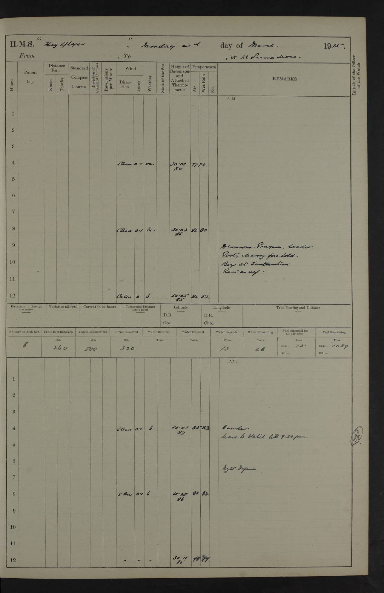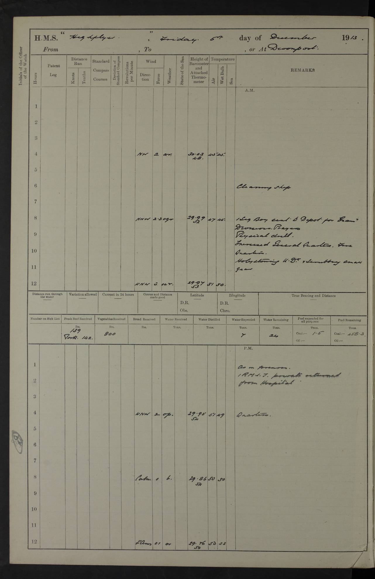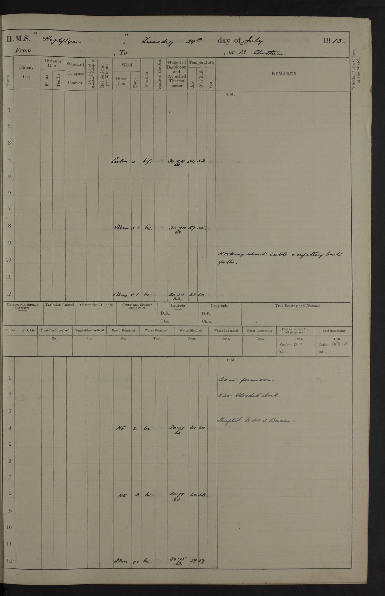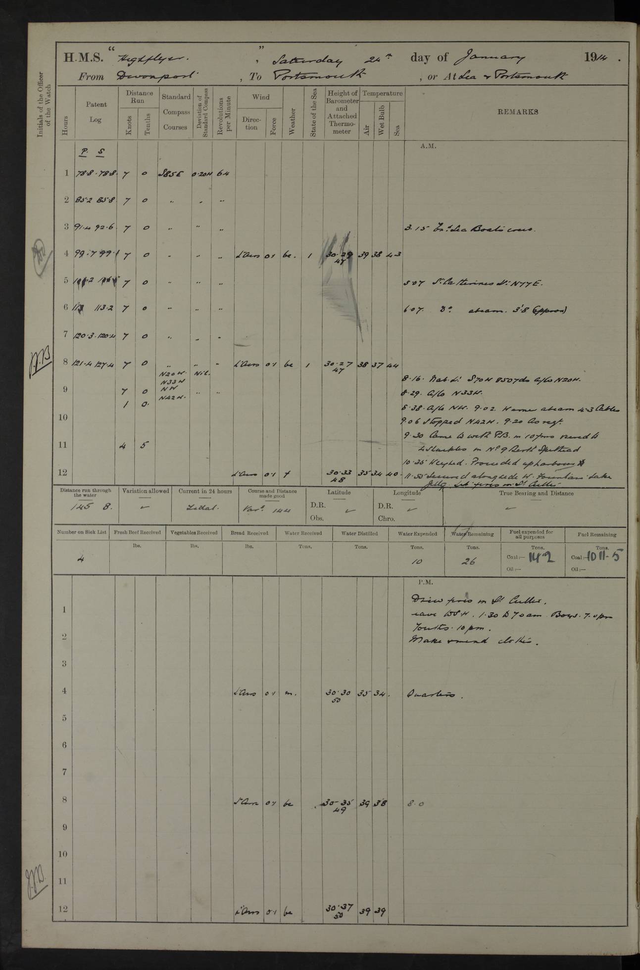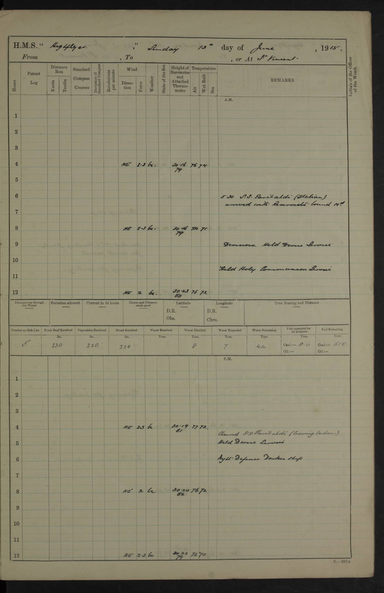 (Maps prepared using Journey Plotter, developed by Maikel. The Plots can only be approximate. They are made by joining-up positions on successive days, and sometimes positions are not given. There will therefore be occasions when the ship appears to have travelled overland) LOG BOOK – JUNE 14TH 1913 TO MAY 31ST 1914 4f960fe4a2fc8e2def00041b: (http://s3.amazonaws.com/oldweather/ADM53-44291/ADM 53-44291-001_0.jpg) 4f960fe5a2fc8e2def00041c: (http://s3.amazonaws.com/oldweather/ADM53-44291/ADM 53-44291-001_1.jpg) 4f960fe5a2fc8e2def00041d: (http://s3.amazonaws.com/oldweather/ADM53-44291/ADM 53-44291-002_0.jpg) 4f960fe5a2fc8e2def00041e: (http://s3.amazonaws.com/oldweather/ADM53-44291/ADM 53-44291-002_1.jpg) LOG of HMS Highflyer Commanded by Captain HT Buller MVO FOR THE PERIOD Commencing Saturday 14th June 1913 Ending Sunday 31st May 1914 Tonnage (displacement): 5600 Extreme length: 350 ft Extreme breadth: 54 ft ENGINES Manufacturer: Fairfield Shipbuilding & Engineering Co, Glasgow IHP: 10.000 Description: Vertical triple expansion 4 cylinders When fixed on board: 1898 BOILERS Manufacturer: Fairfield Shipbuilding & Engineering Co Description: Belleville with economisers 18 in No When made: 1898 When put in vessel: 1898 SCREW PROPELLER Manufacturer: Fairfield Shipbuilding & Engineering Co Description: Twin 3 bladed Admiralty design (bronze) General state of repair: Good 4f960fe6a2fc8e2def00041f: (http://s3.amazonaws.com/oldweather/ADM53-44291/ADM 53-44291-003_0.jpg) [Directions for using the log, figures to indicate the force of the wind and the state of the sea, and letters to denote the state of the weather.] 4f960fe6a2fc8e2def000420: (http://s3.amazonaws.com/oldweather/ADM53-44291/ADM 53-44291-003_1.jpg) Establishment of ship’s company Officers 32 Seamen 164 Boys 24 Marines 50 Engine-room establishment 134 Other non-executive ratings 466 BAROMETER Mercurial or aneroid: Mercurial Name of maker & number: Adie A 577 Height of cistern above sea: 9 feet Thermometers for air temperature Position in ship: Fore bridge Whether in screen: Yes Maker & number: Negretti & Zambra MO/A 9607 dry; from June 14, 1913 to June 1, 1914 MO/A 9603 wet; from June 14, 1913 to June 1, 1914 Thermometer for sea temperature Maker & number: J Hicks A 434; from June 14, 1913 to June 1, 1914 Position of standard compass Fore upper bridge DEVIATION OF STANDARD COMPASS Date obtained: August 29th 1913 Position: Sheerness, No 28 buoy ARMAMENT Fxle: one 6” QF PII S waist: four 6” QF PII P waist: four 6” QF PII OD: two 6” QF PII Battle deck: two 12-pounder 12-cwt SII S waist: three 12-pounder 12-cwt SII P waist: three 12-pounder 12-cwt SII AS deck: 3-pounder QF (Hotchkiss) P waist: 12-pounder 8-cwt field gun Torpedo armament 2 18” tubes BOATS 2 pinnaces, 36 ft sailing 2 cutters 1 gig, 30 ft 1 whaler 1 steam cutter, 32 ft MISCELLANEOUS INFORMATION Draught of water with bunkers full, and complete with provisions, stores and water: forward 22 ft 0 in, aft 23 ft 2 in Load draught, 600 tons coal: forward 19 ft 6 in, aft 21 ft 6 in Number of tons necessary to increase draught 1 inch: 31.5 Number of tons of coal carried (43 cubic feet per ton): a) At load draught, 600 b) With bunkers full, 1132 c) In places other than bunkers, nil Quantity of water carried: a) For boilers, 207 tons b) For drinking 60 tons THE VOYAGES OF HMS HIGHFLYER 1913-1914