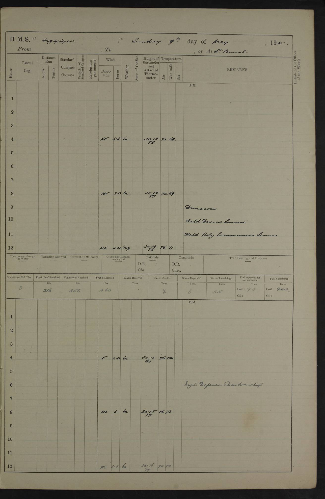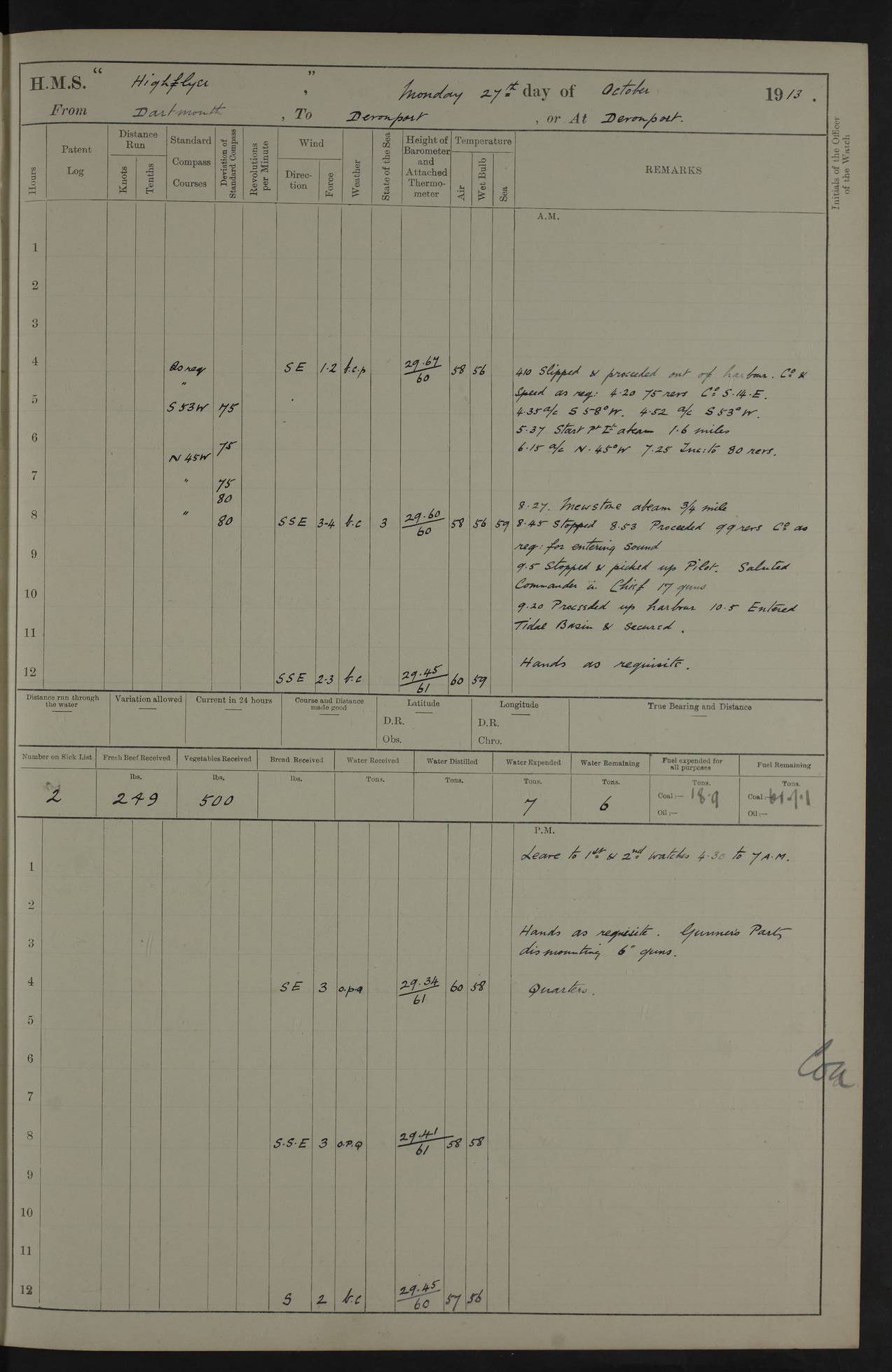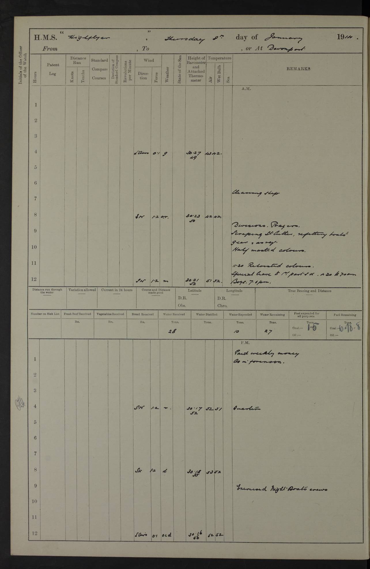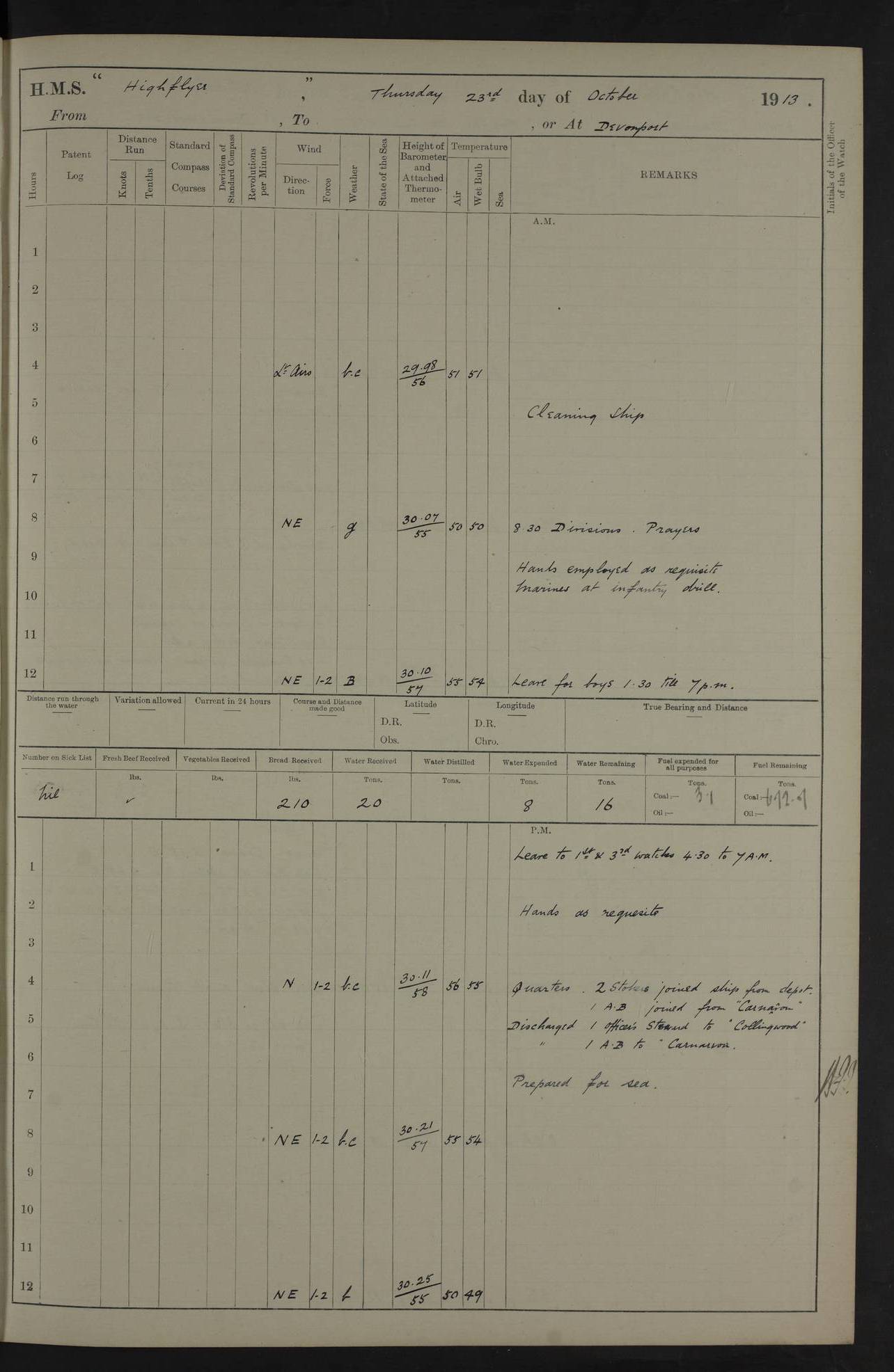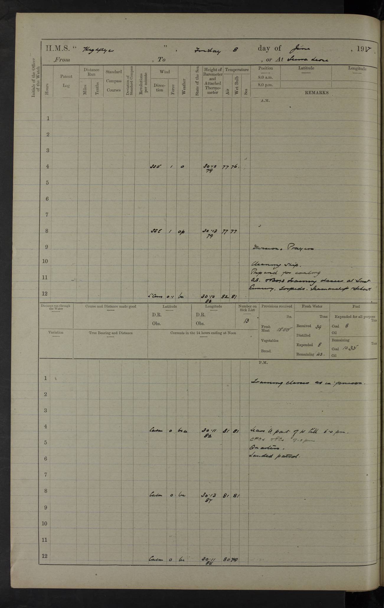 (Maps prepared using Journey Plotter, developed by Maikel. The Plots can only be approximate. They are made by joining-up positions on successive days, and sometimes positions are not given. There will therefore be occasions when the ship appears to have travelled overland) LOG BOOK – JUNE 14TH 1913 TO MAY 31ST 1914 4f960fe4a2fc8e2def00041b: (http://s3.amazonaws.com/oldweather/ADM53-44291/ADM 53-44291-001_0.jpg) 4f960fe5a2fc8e2def00041c: (http://s3.amazonaws.com/oldweather/ADM53-44291/ADM 53-44291-001_1.jpg) 4f960fe5a2fc8e2def00041d: (http://s3.amazonaws.com/oldweather/ADM53-44291/ADM 53-44291-002_0.jpg) 4f960fe5a2fc8e2def00041e: (http://s3.amazonaws.com/oldweather/ADM53-44291/ADM 53-44291-002_1.jpg) LOG of HMS Highflyer Commanded by Captain HT Buller MVO FOR THE PERIOD Commencing Saturday 14th June 1913 Ending Sunday 31st May 1914 Tonnage (displacement): 5600 Extreme length: 350 ft Extreme breadth: 54 ft ENGINES Manufacturer: Fairfield Shipbuilding & Engineering Co, Glasgow IHP: 10.000 Description: Vertical triple expansion 4 cylinders When fixed on board: 1898 BOILERS Manufacturer: Fairfield Shipbuilding & Engineering Co Description: Belleville with economisers 18 in No When made: 1898 When put in vessel: 1898 SCREW PROPELLER Manufacturer: Fairfield Shipbuilding & Engineering Co Description: Twin 3 bladed Admiralty design (bronze) General state of repair: Good 4f960fe6a2fc8e2def00041f: (http://s3.amazonaws.com/oldweather/ADM53-44291/ADM 53-44291-003_0.jpg) [Directions for using the log, figures to indicate the force of the wind and the state of the sea, and letters to denote the state of the weather.] 4f960fe6a2fc8e2def000420: (http://s3.amazonaws.com/oldweather/ADM53-44291/ADM 53-44291-003_1.jpg) Establishment of ship’s company Officers 32 Seamen 164 Boys 24 Marines 50 Engine-room establishment 134 Other non-executive ratings 466 BAROMETER Mercurial or aneroid: Mercurial Name of maker & number: Adie A 577 Height of cistern above sea: 9 feet Thermometers for air temperature Position in ship: Fore bridge Whether in screen: Yes Maker & number: Negretti & Zambra MO/A 9607 dry; from June 14, 1913 to June 1, 1914 MO/A 9603 wet; from June 14, 1913 to June 1, 1914 Thermometer for sea temperature Maker & number: J Hicks A 434; from June 14, 1913 to June 1, 1914 Position of standard compass Fore upper bridge DEVIATION OF STANDARD COMPASS Date obtained: August 29th 1913 Position: Sheerness, No 28 buoy ARMAMENT Fxle: one 6” QF PII S waist: four 6” QF PII P waist: four 6” QF PII OD: two 6” QF PII Battle deck: two 12-pounder 12-cwt SII S waist: three 12-pounder 12-cwt SII P waist: three 12-pounder 12-cwt SII AS deck: 3-pounder QF (Hotchkiss) P waist: 12-pounder 8-cwt field gun Torpedo armament 2 18” tubes BOATS 2 pinnaces, 36 ft sailing 2 cutters 1 gig, 30 ft 1 whaler 1 steam cutter, 32 ft MISCELLANEOUS INFORMATION Draught of water with bunkers full, and complete with provisions, stores and water: forward 22 ft 0 in, aft 23 ft 2 in Load draught, 600 tons coal: forward 19 ft 6 in, aft 21 ft 6 in Number of tons necessary to increase draught 1 inch: 31.5 Number of tons of coal carried (43 cubic feet per ton): a) At load draught, 600 b) With bunkers full, 1132 c) In places other than bunkers, nil Quantity of water carried: a) For boilers, 207 tons b) For drinking 60 tons THE VOYAGES OF HMS HIGHFLYER 1913-1914