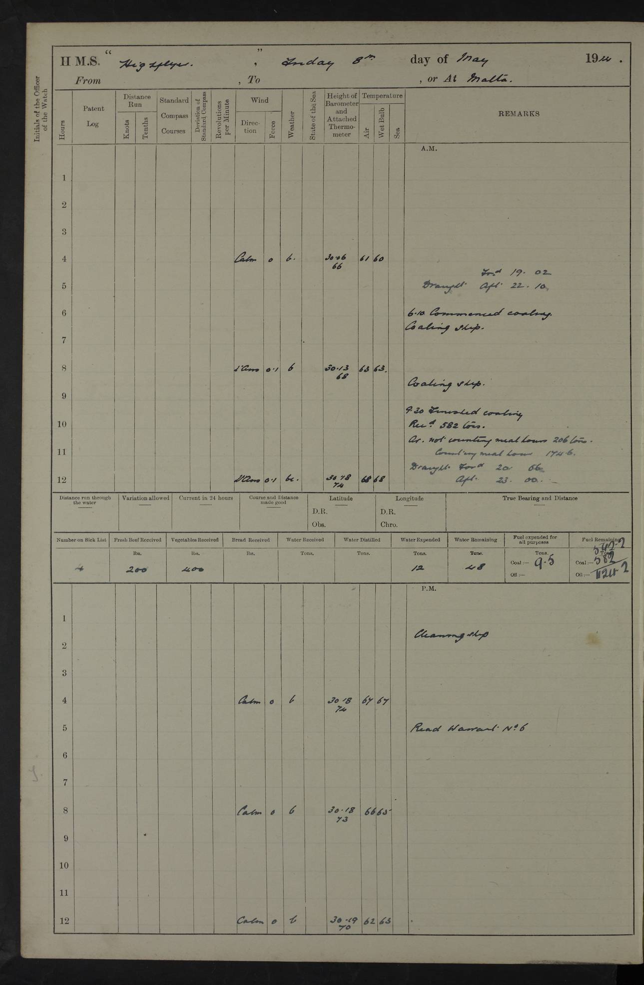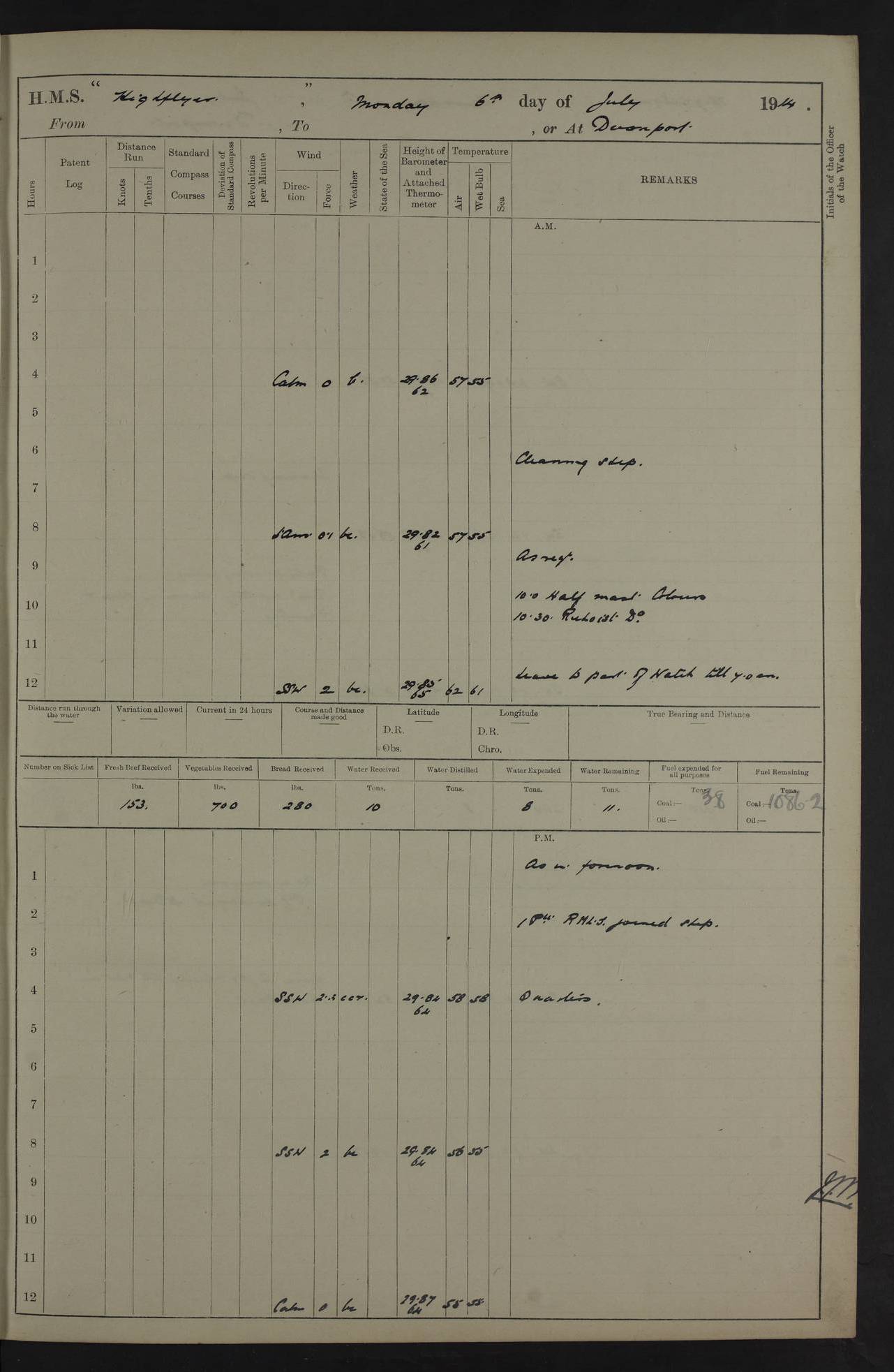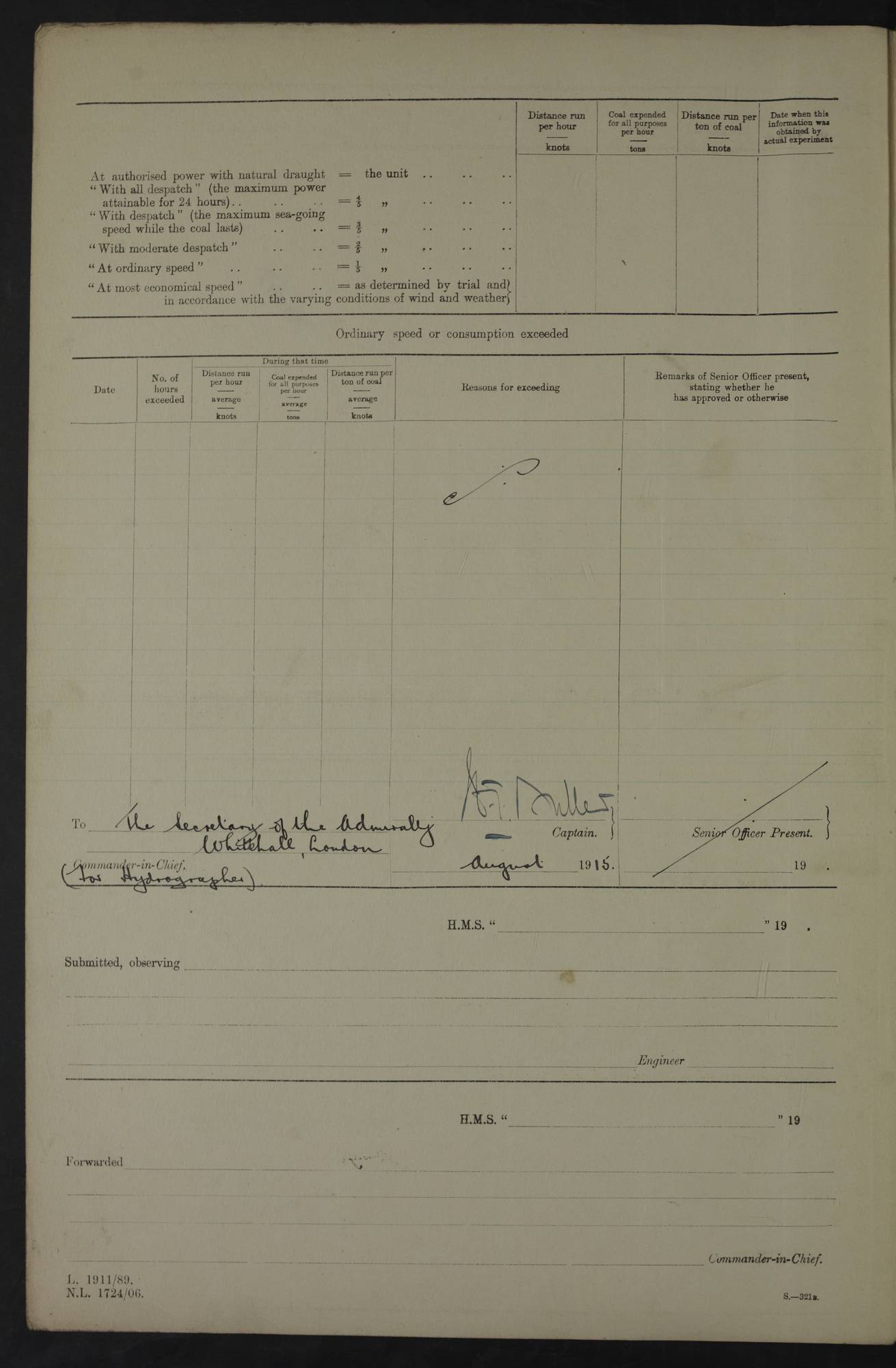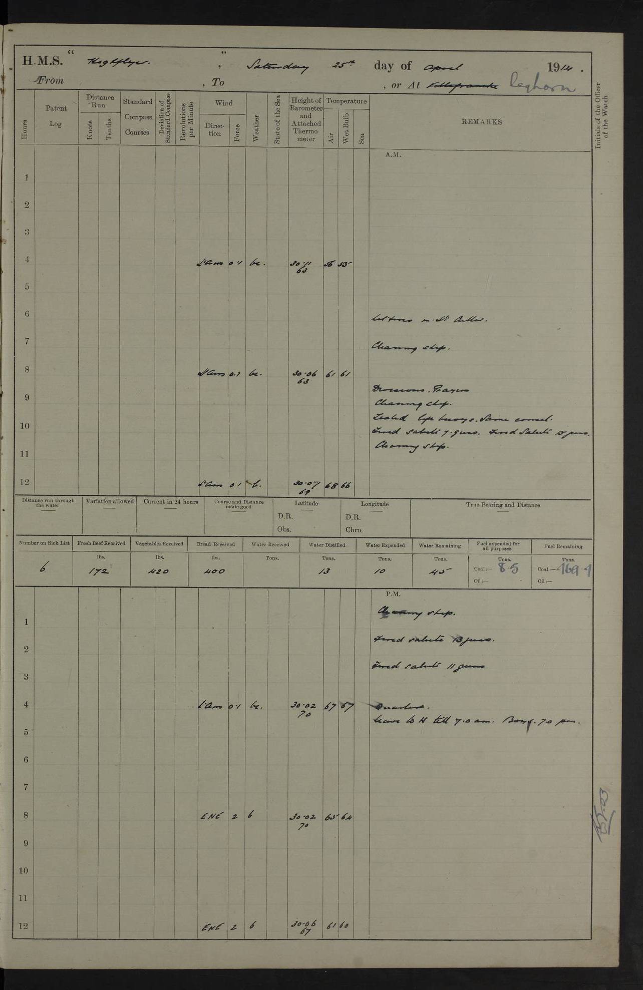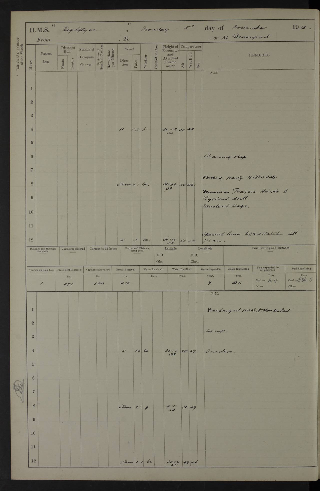 (Maps prepared using Journey Plotter, developed by Maikel. The Plots can only be approximate. They are made by joining-up positions on successive days, and sometimes positions are not given. There will therefore be occasions when the ship appears to have travelled overland) LOG BOOK – JUNE 14TH 1913 TO MAY 31ST 1914 4f960fe4a2fc8e2def00041b: (http://s3.amazonaws.com/oldweather/ADM53-44291/ADM 53-44291-001_0.jpg) 4f960fe5a2fc8e2def00041c: (http://s3.amazonaws.com/oldweather/ADM53-44291/ADM 53-44291-001_1.jpg) 4f960fe5a2fc8e2def00041d: (http://s3.amazonaws.com/oldweather/ADM53-44291/ADM 53-44291-002_0.jpg) 4f960fe5a2fc8e2def00041e: (http://s3.amazonaws.com/oldweather/ADM53-44291/ADM 53-44291-002_1.jpg) LOG of HMS Highflyer Commanded by Captain HT Buller MVO FOR THE PERIOD Commencing Saturday 14th June 1913 Ending Sunday 31st May 1914 Tonnage (displacement): 5600 Extreme length: 350 ft Extreme breadth: 54 ft ENGINES Manufacturer: Fairfield Shipbuilding & Engineering Co, Glasgow IHP: 10.000 Description: Vertical triple expansion 4 cylinders When fixed on board: 1898 BOILERS Manufacturer: Fairfield Shipbuilding & Engineering Co Description: Belleville with economisers 18 in No When made: 1898 When put in vessel: 1898 SCREW PROPELLER Manufacturer: Fairfield Shipbuilding & Engineering Co Description: Twin 3 bladed Admiralty design (bronze) General state of repair: Good 4f960fe6a2fc8e2def00041f: (http://s3.amazonaws.com/oldweather/ADM53-44291/ADM 53-44291-003_0.jpg) [Directions for using the log, figures to indicate the force of the wind and the state of the sea, and letters to denote the state of the weather.] 4f960fe6a2fc8e2def000420: (http://s3.amazonaws.com/oldweather/ADM53-44291/ADM 53-44291-003_1.jpg) Establishment of ship’s company Officers 32 Seamen 164 Boys 24 Marines 50 Engine-room establishment 134 Other non-executive ratings 466 BAROMETER Mercurial or aneroid: Mercurial Name of maker & number: Adie A 577 Height of cistern above sea: 9 feet Thermometers for air temperature Position in ship: Fore bridge Whether in screen: Yes Maker & number: Negretti & Zambra MO/A 9607 dry; from June 14, 1913 to June 1, 1914 MO/A 9603 wet; from June 14, 1913 to June 1, 1914 Thermometer for sea temperature Maker & number: J Hicks A 434; from June 14, 1913 to June 1, 1914 Position of standard compass Fore upper bridge DEVIATION OF STANDARD COMPASS Date obtained: August 29th 1913 Position: Sheerness, No 28 buoy ARMAMENT Fxle: one 6” QF PII S waist: four 6” QF PII P waist: four 6” QF PII OD: two 6” QF PII Battle deck: two 12-pounder 12-cwt SII S waist: three 12-pounder 12-cwt SII P waist: three 12-pounder 12-cwt SII AS deck: 3-pounder QF (Hotchkiss) P waist: 12-pounder 8-cwt field gun Torpedo armament 2 18” tubes BOATS 2 pinnaces, 36 ft sailing 2 cutters 1 gig, 30 ft 1 whaler 1 steam cutter, 32 ft MISCELLANEOUS INFORMATION Draught of water with bunkers full, and complete with provisions, stores and water: forward 22 ft 0 in, aft 23 ft 2 in Load draught, 600 tons coal: forward 19 ft 6 in, aft 21 ft 6 in Number of tons necessary to increase draught 1 inch: 31.5 Number of tons of coal carried (43 cubic feet per ton): a) At load draught, 600 b) With bunkers full, 1132 c) In places other than bunkers, nil Quantity of water carried: a) For boilers, 207 tons b) For drinking 60 tons THE VOYAGES OF HMS HIGHFLYER 1913-1914