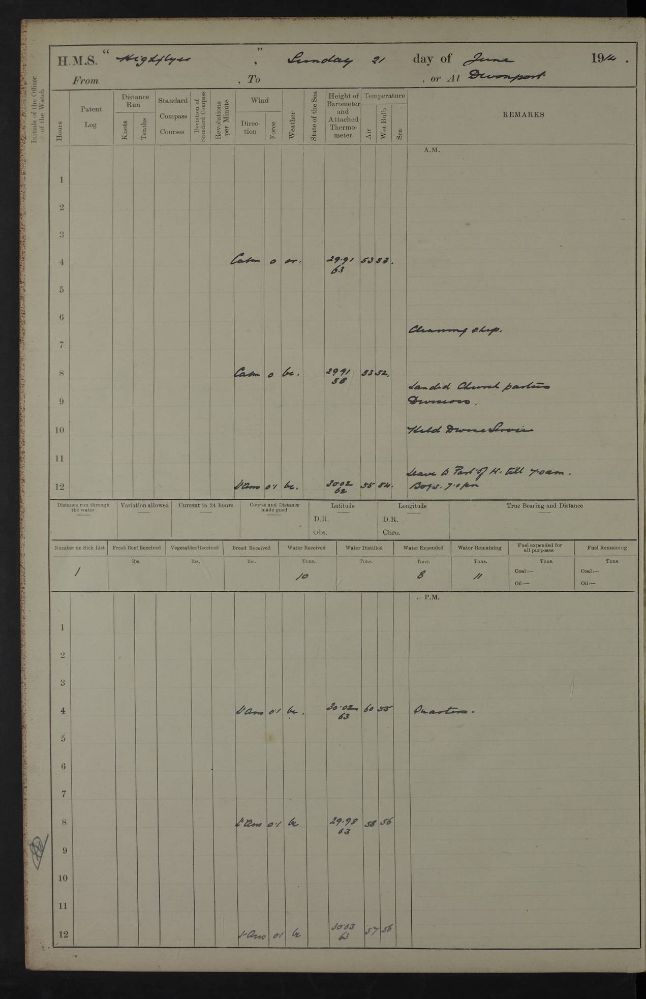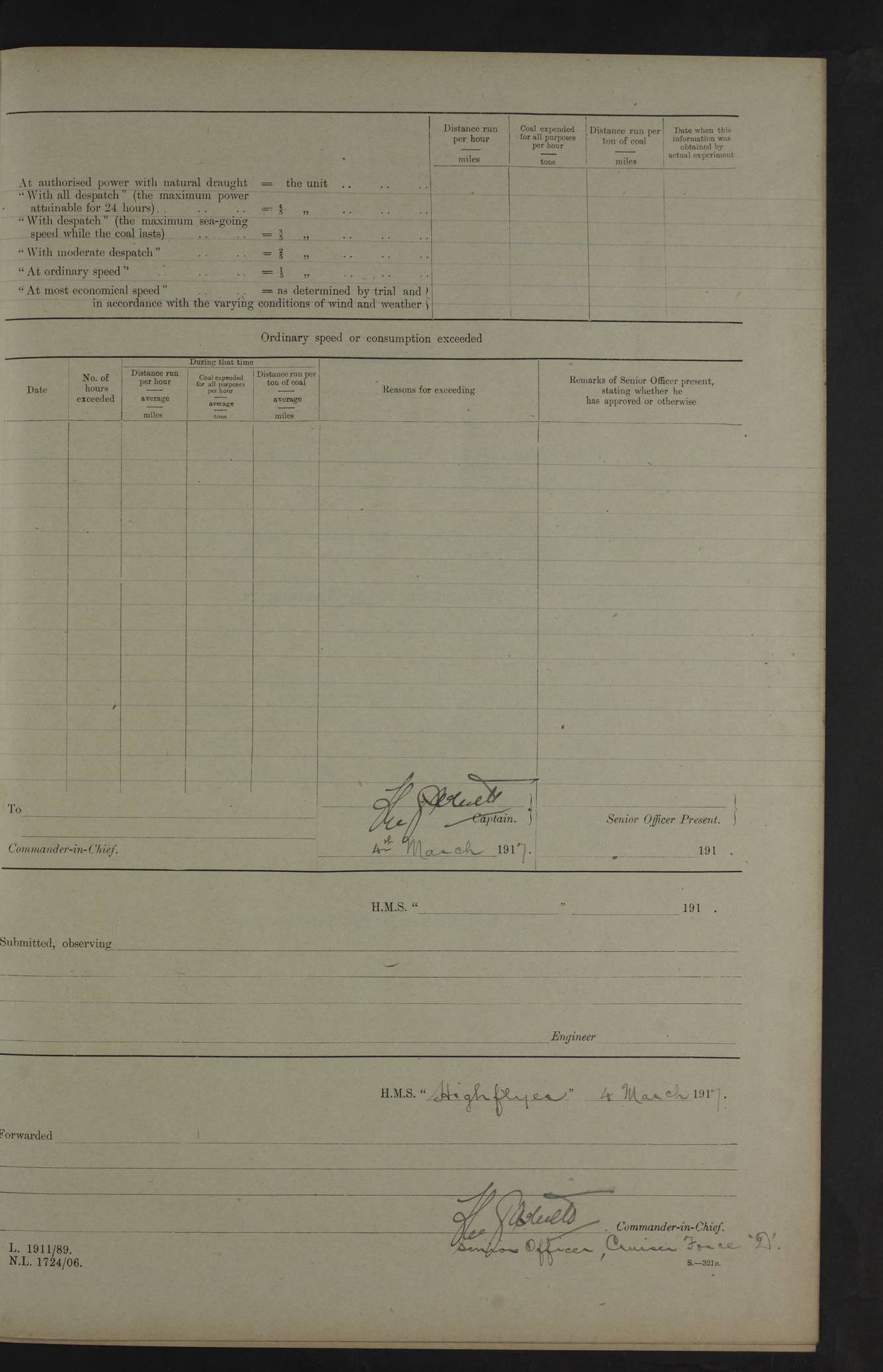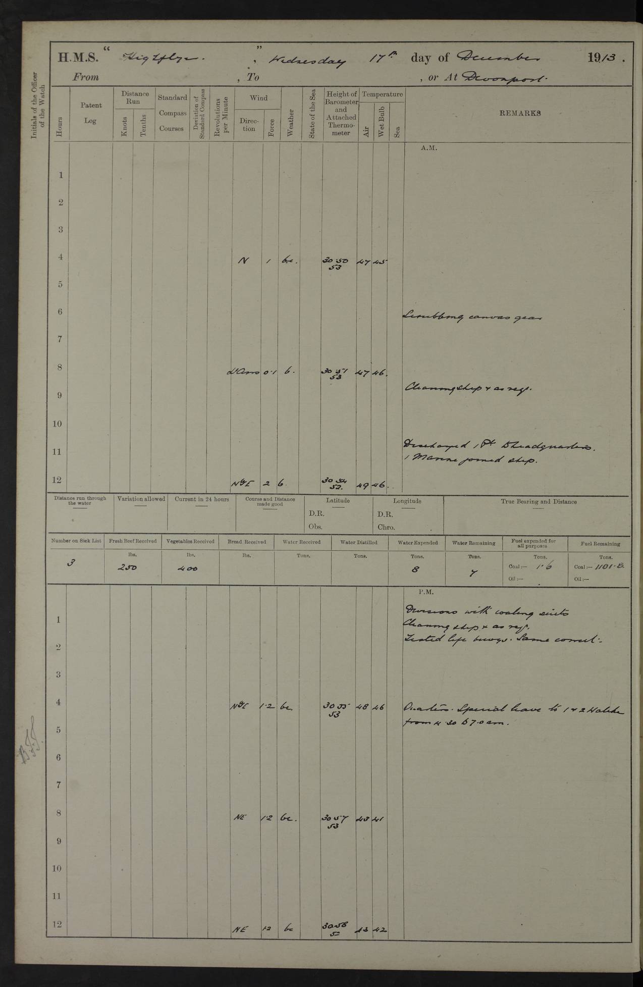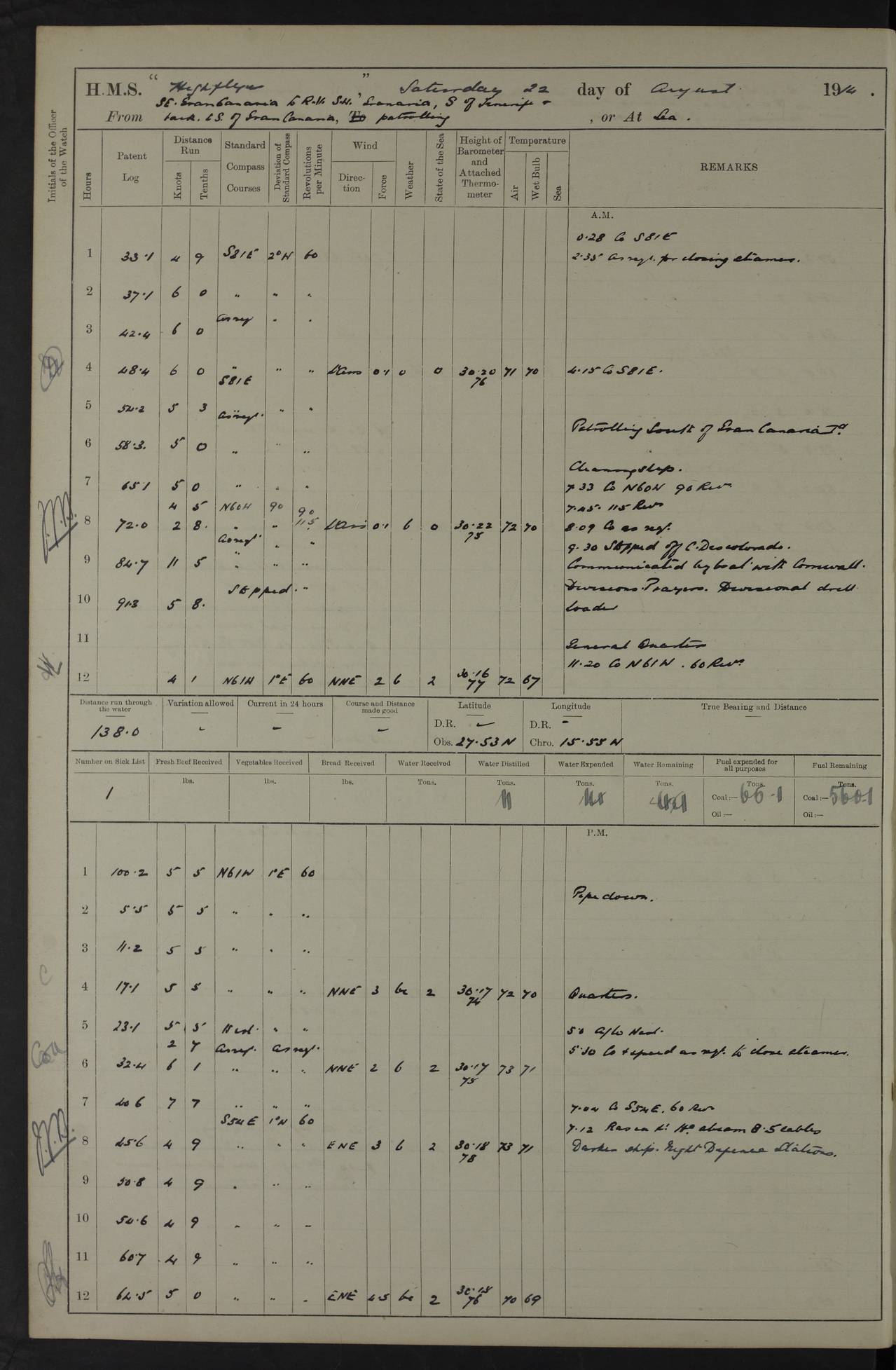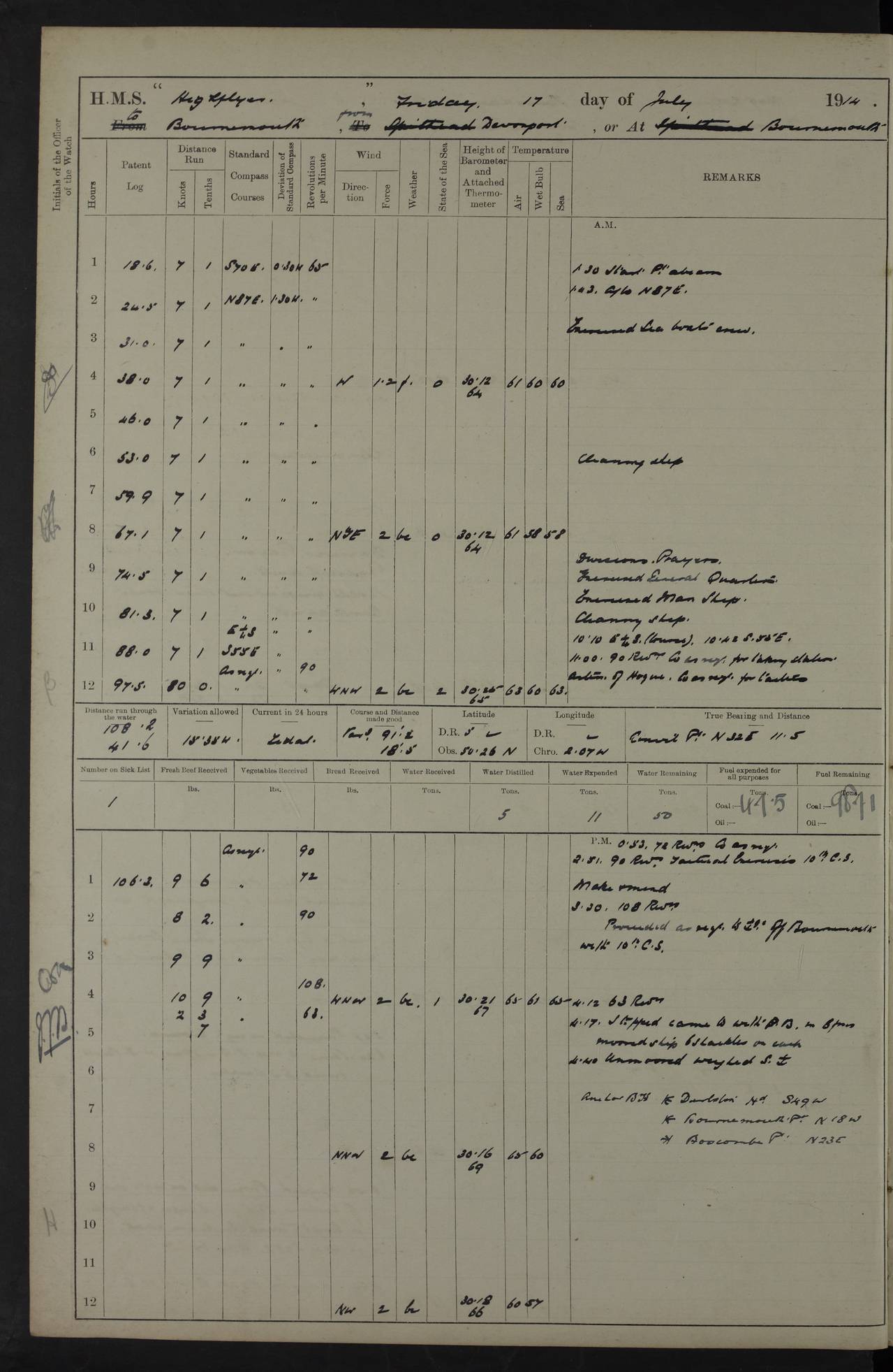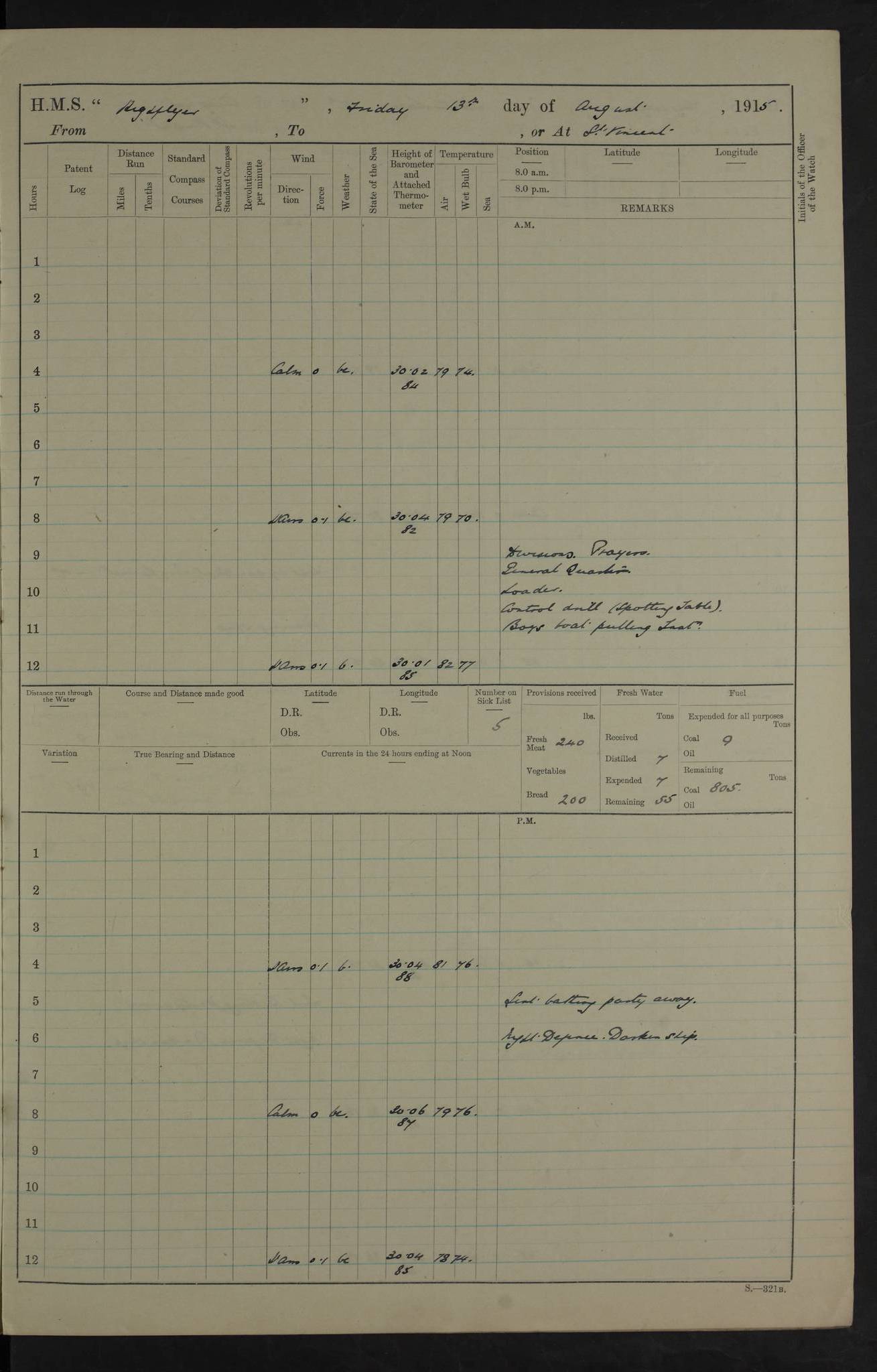 (Maps prepared using Journey Plotter, developed by Maikel. The Plots can only be approximate. They are made by joining-up positions on successive days, and sometimes positions are not given. There will therefore be occasions when the ship appears to have travelled overland) LOG BOOK – JUNE 14TH 1913 TO MAY 31ST 1914 4f960fe4a2fc8e2def00041b: (http://s3.amazonaws.com/oldweather/ADM53-44291/ADM 53-44291-001_0.jpg) 4f960fe5a2fc8e2def00041c: (http://s3.amazonaws.com/oldweather/ADM53-44291/ADM 53-44291-001_1.jpg) 4f960fe5a2fc8e2def00041d: (http://s3.amazonaws.com/oldweather/ADM53-44291/ADM 53-44291-002_0.jpg) 4f960fe5a2fc8e2def00041e: (http://s3.amazonaws.com/oldweather/ADM53-44291/ADM 53-44291-002_1.jpg) LOG of HMS Highflyer Commanded by Captain HT Buller MVO FOR THE PERIOD Commencing Saturday 14th June 1913 Ending Sunday 31st May 1914 Tonnage (displacement): 5600 Extreme length: 350 ft Extreme breadth: 54 ft ENGINES Manufacturer: Fairfield Shipbuilding & Engineering Co, Glasgow IHP: 10.000 Description: Vertical triple expansion 4 cylinders When fixed on board: 1898 BOILERS Manufacturer: Fairfield Shipbuilding & Engineering Co Description: Belleville with economisers 18 in No When made: 1898 When put in vessel: 1898 SCREW PROPELLER Manufacturer: Fairfield Shipbuilding & Engineering Co Description: Twin 3 bladed Admiralty design (bronze) General state of repair: Good 4f960fe6a2fc8e2def00041f: (http://s3.amazonaws.com/oldweather/ADM53-44291/ADM 53-44291-003_0.jpg) [Directions for using the log, figures to indicate the force of the wind and the state of the sea, and letters to denote the state of the weather.] 4f960fe6a2fc8e2def000420: (http://s3.amazonaws.com/oldweather/ADM53-44291/ADM 53-44291-003_1.jpg) Establishment of ship’s company Officers 32 Seamen 164 Boys 24 Marines 50 Engine-room establishment 134 Other non-executive ratings 466 BAROMETER Mercurial or aneroid: Mercurial Name of maker & number: Adie A 577 Height of cistern above sea: 9 feet Thermometers for air temperature Position in ship: Fore bridge Whether in screen: Yes Maker & number: Negretti & Zambra MO/A 9607 dry; from June 14, 1913 to June 1, 1914 MO/A 9603 wet; from June 14, 1913 to June 1, 1914 Thermometer for sea temperature Maker & number: J Hicks A 434; from June 14, 1913 to June 1, 1914 Position of standard compass Fore upper bridge DEVIATION OF STANDARD COMPASS Date obtained: August 29th 1913 Position: Sheerness, No 28 buoy ARMAMENT Fxle: one 6” QF PII S waist: four 6” QF PII P waist: four 6” QF PII OD: two 6” QF PII Battle deck: two 12-pounder 12-cwt SII S waist: three 12-pounder 12-cwt SII P waist: three 12-pounder 12-cwt SII AS deck: 3-pounder QF (Hotchkiss) P waist: 12-pounder 8-cwt field gun Torpedo armament 2 18” tubes BOATS 2 pinnaces, 36 ft sailing 2 cutters 1 gig, 30 ft 1 whaler 1 steam cutter, 32 ft MISCELLANEOUS INFORMATION Draught of water with bunkers full, and complete with provisions, stores and water: forward 22 ft 0 in, aft 23 ft 2 in Load draught, 600 tons coal: forward 19 ft 6 in, aft 21 ft 6 in Number of tons necessary to increase draught 1 inch: 31.5 Number of tons of coal carried (43 cubic feet per ton): a) At load draught, 600 b) With bunkers full, 1132 c) In places other than bunkers, nil Quantity of water carried: a) For boilers, 207 tons b) For drinking 60 tons THE VOYAGES OF HMS HIGHFLYER 1913-1914