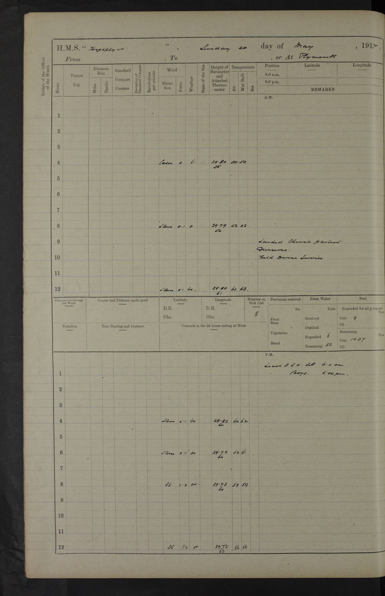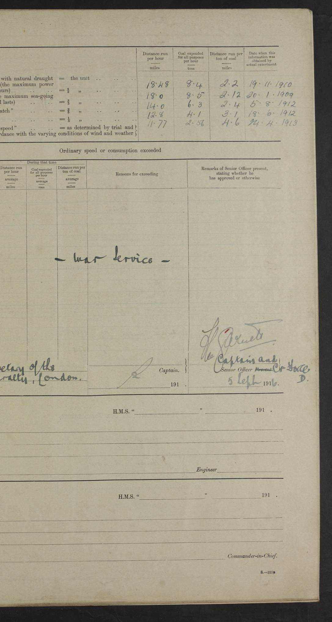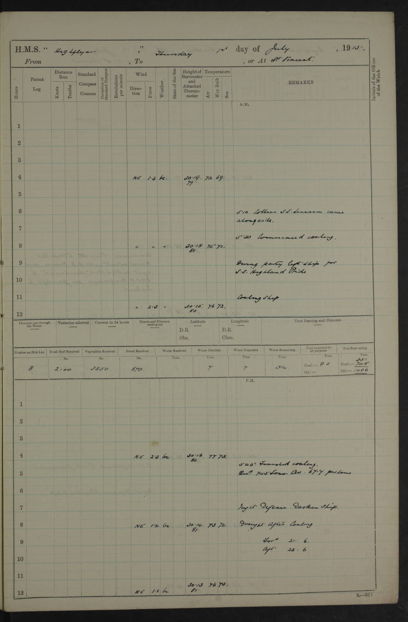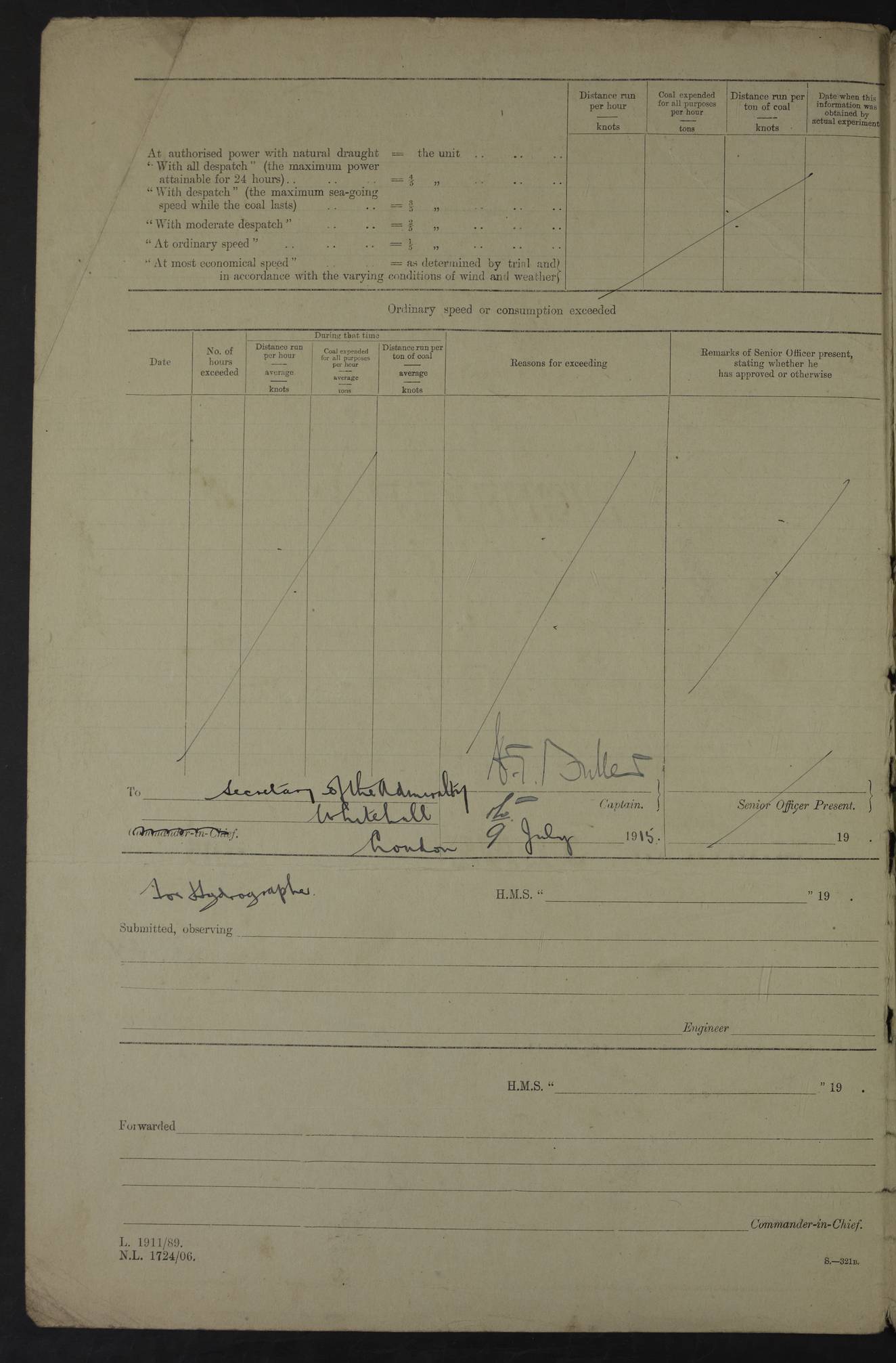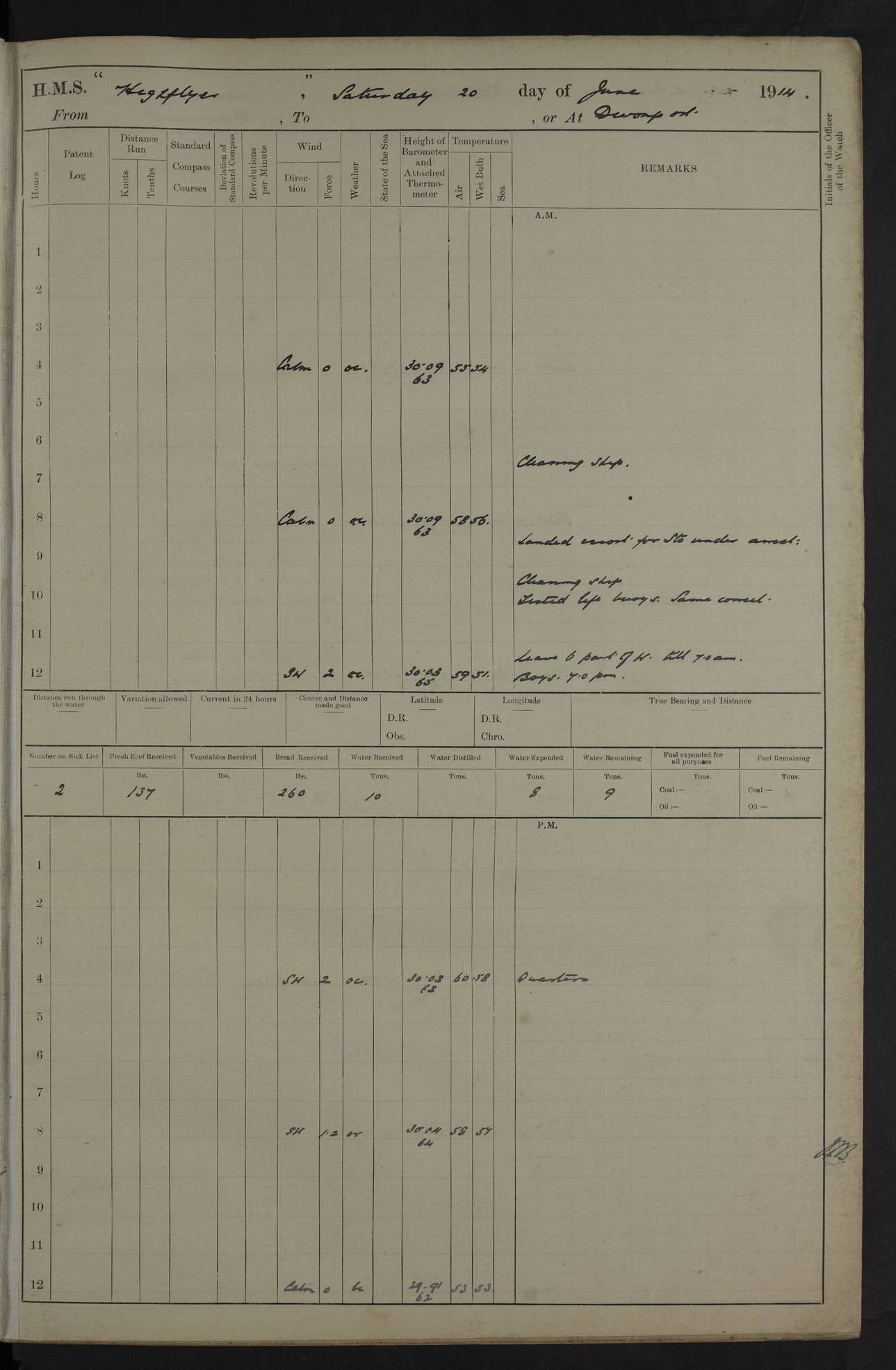 (Maps prepared using Journey Plotter, developed by Maikel. The Plots can only be approximate. They are made by joining-up positions on successive days, and sometimes positions are not given. There will therefore be occasions when the ship appears to have travelled overland) LOG BOOK – JUNE 14TH 1913 TO MAY 31ST 1914 4f960fe4a2fc8e2def00041b: (http://s3.amazonaws.com/oldweather/ADM53-44291/ADM 53-44291-001_0.jpg) 4f960fe5a2fc8e2def00041c: (http://s3.amazonaws.com/oldweather/ADM53-44291/ADM 53-44291-001_1.jpg) 4f960fe5a2fc8e2def00041d: (http://s3.amazonaws.com/oldweather/ADM53-44291/ADM 53-44291-002_0.jpg) 4f960fe5a2fc8e2def00041e: (http://s3.amazonaws.com/oldweather/ADM53-44291/ADM 53-44291-002_1.jpg) LOG of HMS Highflyer Commanded by Captain HT Buller MVO FOR THE PERIOD Commencing Saturday 14th June 1913 Ending Sunday 31st May 1914 Tonnage (displacement): 5600 Extreme length: 350 ft Extreme breadth: 54 ft ENGINES Manufacturer: Fairfield Shipbuilding & Engineering Co, Glasgow IHP: 10.000 Description: Vertical triple expansion 4 cylinders When fixed on board: 1898 BOILERS Manufacturer: Fairfield Shipbuilding & Engineering Co Description: Belleville with economisers 18 in No When made: 1898 When put in vessel: 1898 SCREW PROPELLER Manufacturer: Fairfield Shipbuilding & Engineering Co Description: Twin 3 bladed Admiralty design (bronze) General state of repair: Good 4f960fe6a2fc8e2def00041f: (http://s3.amazonaws.com/oldweather/ADM53-44291/ADM 53-44291-003_0.jpg) [Directions for using the log, figures to indicate the force of the wind and the state of the sea, and letters to denote the state of the weather.] 4f960fe6a2fc8e2def000420: (http://s3.amazonaws.com/oldweather/ADM53-44291/ADM 53-44291-003_1.jpg) Establishment of ship’s company Officers 32 Seamen 164 Boys 24 Marines 50 Engine-room establishment 134 Other non-executive ratings 466 BAROMETER Mercurial or aneroid: Mercurial Name of maker & number: Adie A 577 Height of cistern above sea: 9 feet Thermometers for air temperature Position in ship: Fore bridge Whether in screen: Yes Maker & number: Negretti & Zambra MO/A 9607 dry; from June 14, 1913 to June 1, 1914 MO/A 9603 wet; from June 14, 1913 to June 1, 1914 Thermometer for sea temperature Maker & number: J Hicks A 434; from June 14, 1913 to June 1, 1914 Position of standard compass Fore upper bridge DEVIATION OF STANDARD COMPASS Date obtained: August 29th 1913 Position: Sheerness, No 28 buoy ARMAMENT Fxle: one 6” QF PII S waist: four 6” QF PII P waist: four 6” QF PII OD: two 6” QF PII Battle deck: two 12-pounder 12-cwt SII S waist: three 12-pounder 12-cwt SII P waist: three 12-pounder 12-cwt SII AS deck: 3-pounder QF (Hotchkiss) P waist: 12-pounder 8-cwt field gun Torpedo armament 2 18” tubes BOATS 2 pinnaces, 36 ft sailing 2 cutters 1 gig, 30 ft 1 whaler 1 steam cutter, 32 ft MISCELLANEOUS INFORMATION Draught of water with bunkers full, and complete with provisions, stores and water: forward 22 ft 0 in, aft 23 ft 2 in Load draught, 600 tons coal: forward 19 ft 6 in, aft 21 ft 6 in Number of tons necessary to increase draught 1 inch: 31.5 Number of tons of coal carried (43 cubic feet per ton): a) At load draught, 600 b) With bunkers full, 1132 c) In places other than bunkers, nil Quantity of water carried: a) For boilers, 207 tons b) For drinking 60 tons THE VOYAGES OF HMS HIGHFLYER 1913-1914