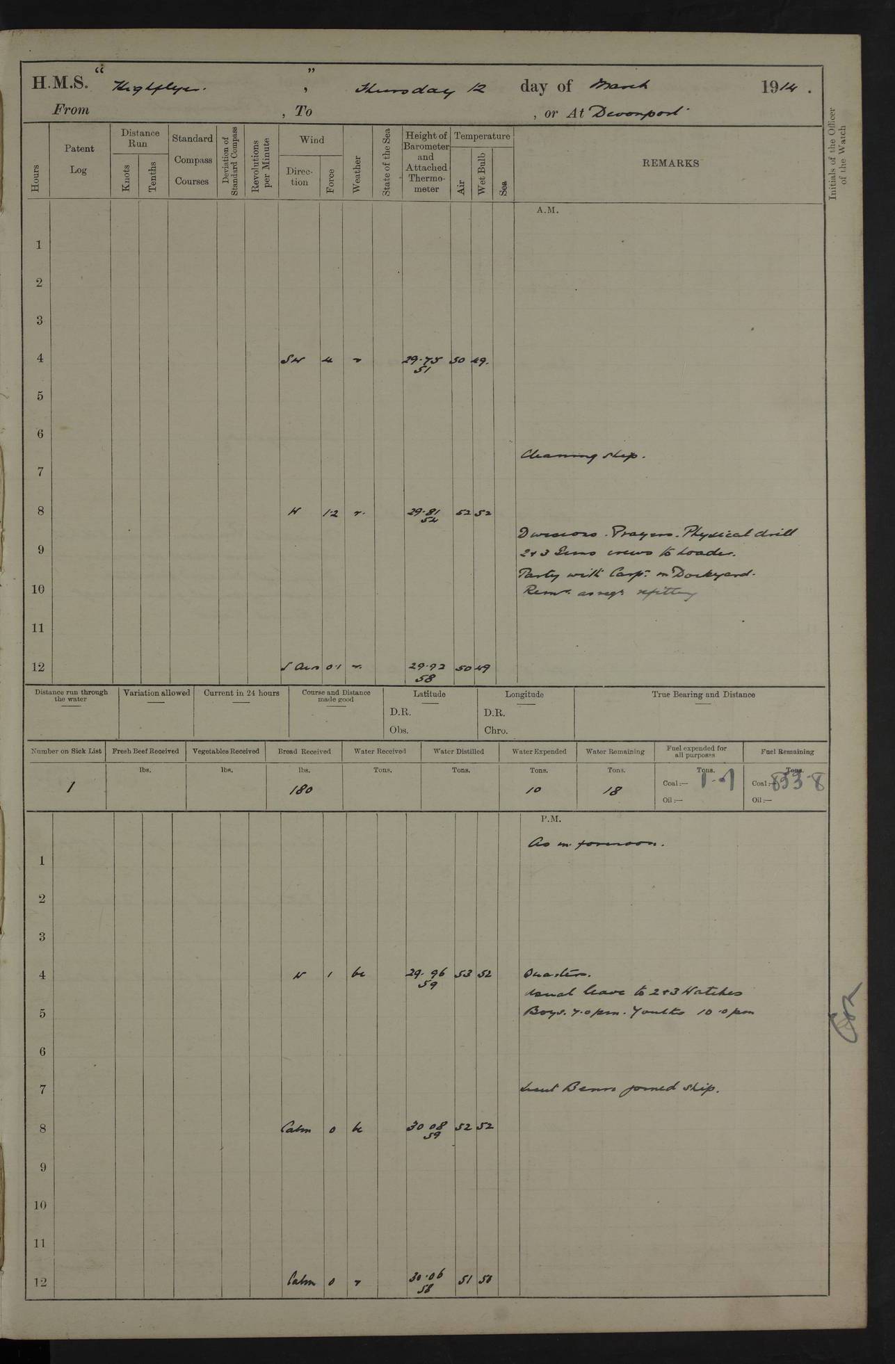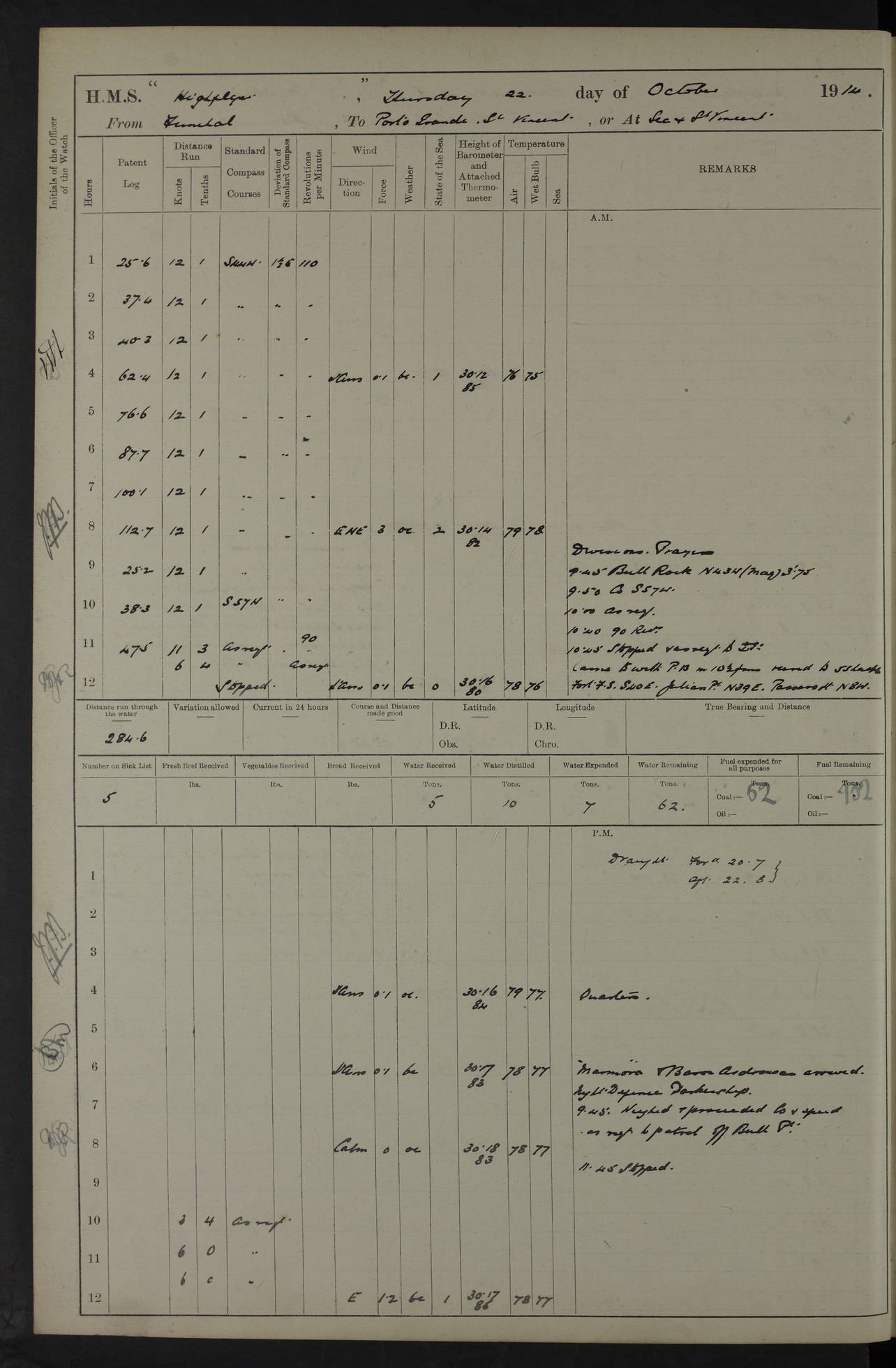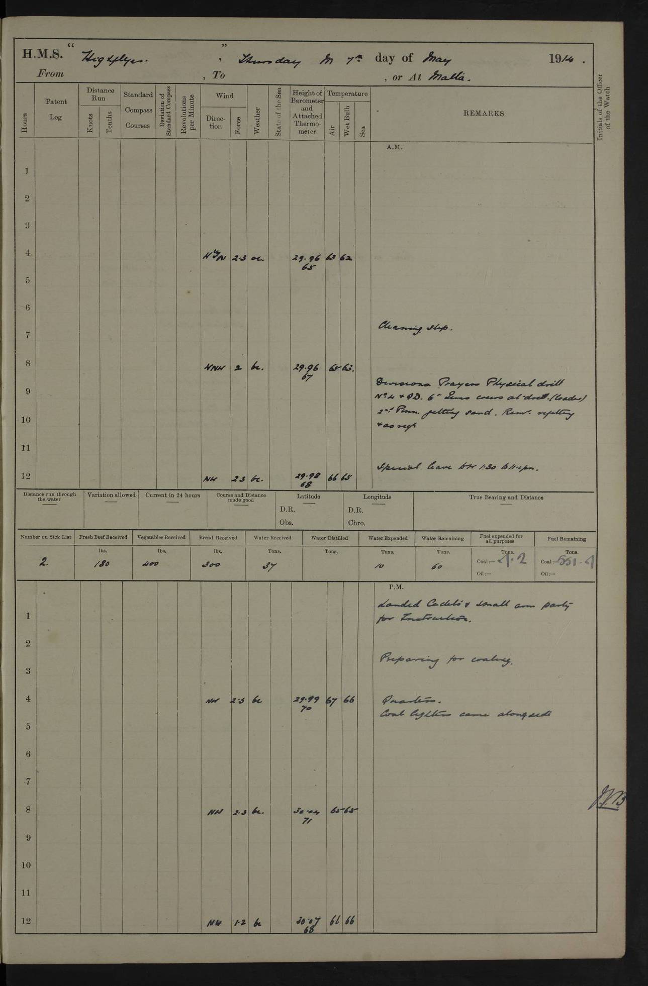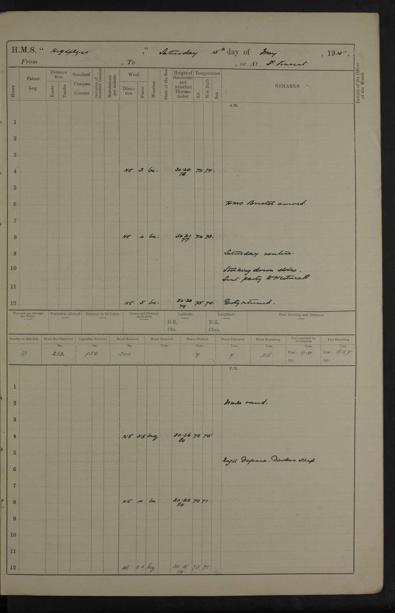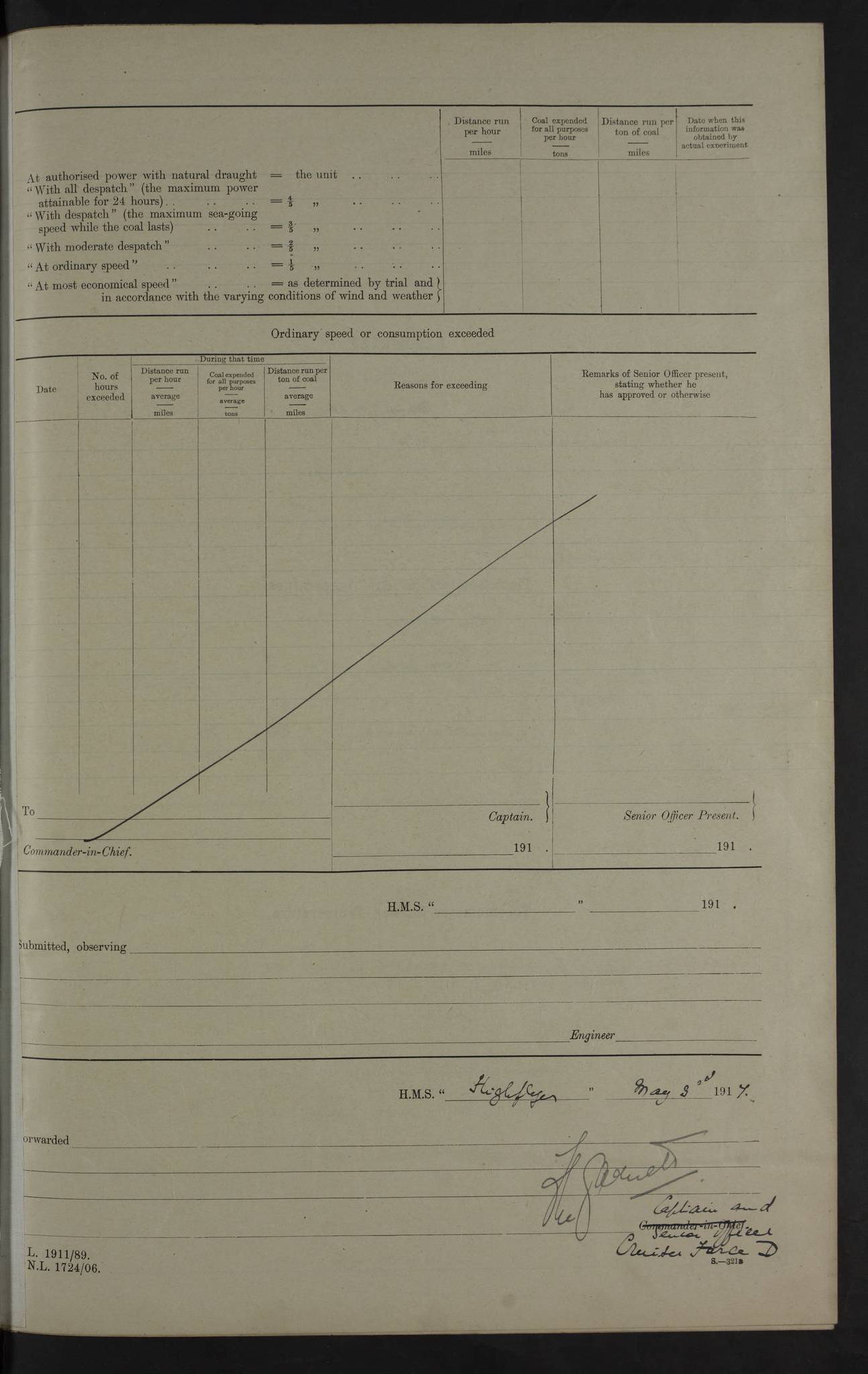 (Maps prepared using Journey Plotter, developed by Maikel. The Plots can only be approximate. They are made by joining-up positions on successive days, and sometimes positions are not given. There will therefore be occasions when the ship appears to have travelled overland) LOG BOOK – JUNE 14TH 1913 TO MAY 31ST 1914 4f960fe4a2fc8e2def00041b: (http://s3.amazonaws.com/oldweather/ADM53-44291/ADM 53-44291-001_0.jpg) 4f960fe5a2fc8e2def00041c: (http://s3.amazonaws.com/oldweather/ADM53-44291/ADM 53-44291-001_1.jpg) 4f960fe5a2fc8e2def00041d: (http://s3.amazonaws.com/oldweather/ADM53-44291/ADM 53-44291-002_0.jpg) 4f960fe5a2fc8e2def00041e: (http://s3.amazonaws.com/oldweather/ADM53-44291/ADM 53-44291-002_1.jpg) LOG of HMS Highflyer Commanded by Captain HT Buller MVO FOR THE PERIOD Commencing Saturday 14th June 1913 Ending Sunday 31st May 1914 Tonnage (displacement): 5600 Extreme length: 350 ft Extreme breadth: 54 ft ENGINES Manufacturer: Fairfield Shipbuilding & Engineering Co, Glasgow IHP: 10.000 Description: Vertical triple expansion 4 cylinders When fixed on board: 1898 BOILERS Manufacturer: Fairfield Shipbuilding & Engineering Co Description: Belleville with economisers 18 in No When made: 1898 When put in vessel: 1898 SCREW PROPELLER Manufacturer: Fairfield Shipbuilding & Engineering Co Description: Twin 3 bladed Admiralty design (bronze) General state of repair: Good 4f960fe6a2fc8e2def00041f: (http://s3.amazonaws.com/oldweather/ADM53-44291/ADM 53-44291-003_0.jpg) [Directions for using the log, figures to indicate the force of the wind and the state of the sea, and letters to denote the state of the weather.] 4f960fe6a2fc8e2def000420: (http://s3.amazonaws.com/oldweather/ADM53-44291/ADM 53-44291-003_1.jpg) Establishment of ship’s company Officers 32 Seamen 164 Boys 24 Marines 50 Engine-room establishment 134 Other non-executive ratings 466 BAROMETER Mercurial or aneroid: Mercurial Name of maker & number: Adie A 577 Height of cistern above sea: 9 feet Thermometers for air temperature Position in ship: Fore bridge Whether in screen: Yes Maker & number: Negretti & Zambra MO/A 9607 dry; from June 14, 1913 to June 1, 1914 MO/A 9603 wet; from June 14, 1913 to June 1, 1914 Thermometer for sea temperature Maker & number: J Hicks A 434; from June 14, 1913 to June 1, 1914 Position of standard compass Fore upper bridge DEVIATION OF STANDARD COMPASS Date obtained: August 29th 1913 Position: Sheerness, No 28 buoy ARMAMENT Fxle: one 6” QF PII S waist: four 6” QF PII P waist: four 6” QF PII OD: two 6” QF PII Battle deck: two 12-pounder 12-cwt SII S waist: three 12-pounder 12-cwt SII P waist: three 12-pounder 12-cwt SII AS deck: 3-pounder QF (Hotchkiss) P waist: 12-pounder 8-cwt field gun Torpedo armament 2 18” tubes BOATS 2 pinnaces, 36 ft sailing 2 cutters 1 gig, 30 ft 1 whaler 1 steam cutter, 32 ft MISCELLANEOUS INFORMATION Draught of water with bunkers full, and complete with provisions, stores and water: forward 22 ft 0 in, aft 23 ft 2 in Load draught, 600 tons coal: forward 19 ft 6 in, aft 21 ft 6 in Number of tons necessary to increase draught 1 inch: 31.5 Number of tons of coal carried (43 cubic feet per ton): a) At load draught, 600 b) With bunkers full, 1132 c) In places other than bunkers, nil Quantity of water carried: a) For boilers, 207 tons b) For drinking 60 tons THE VOYAGES OF HMS HIGHFLYER 1913-1914