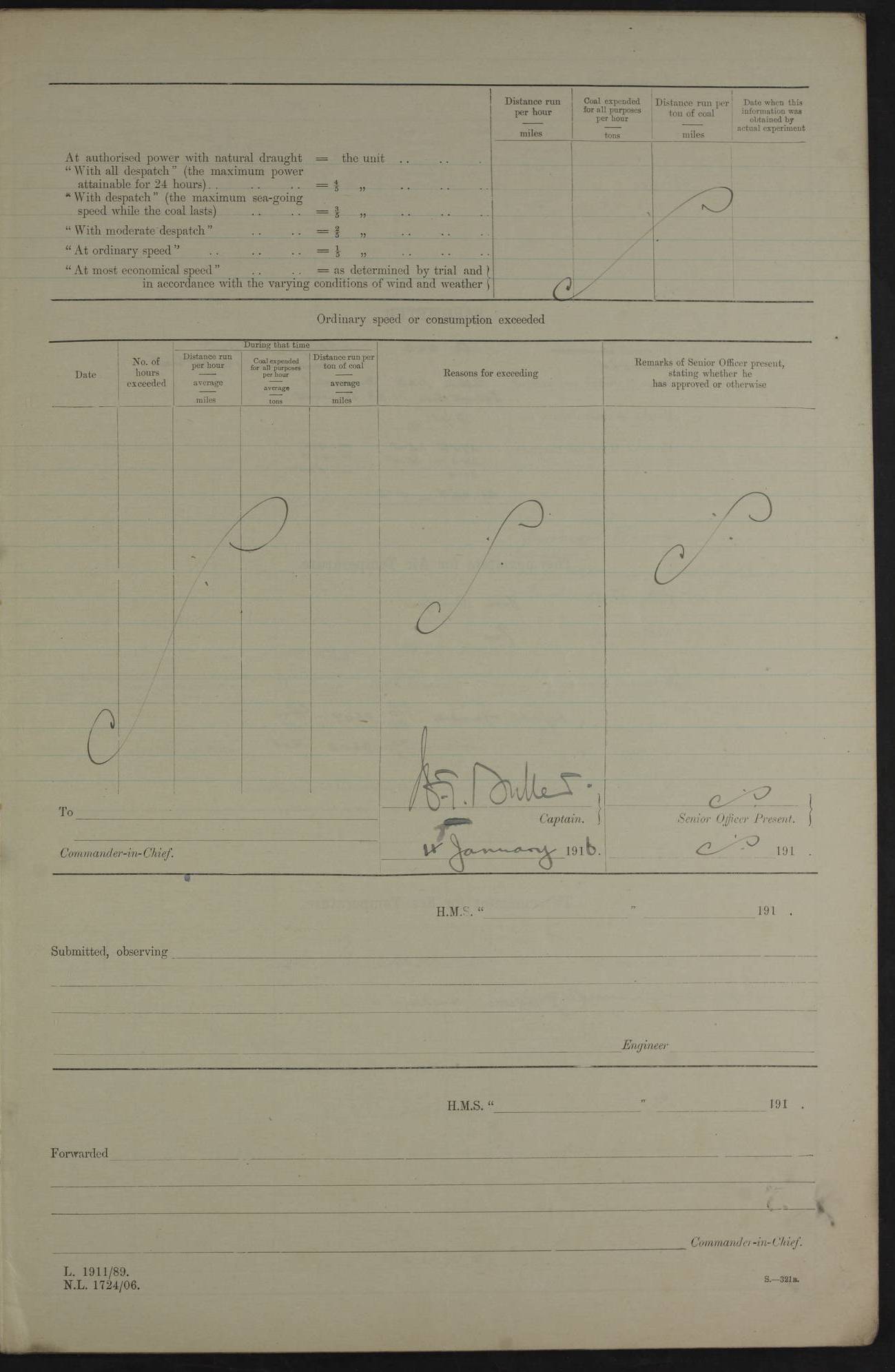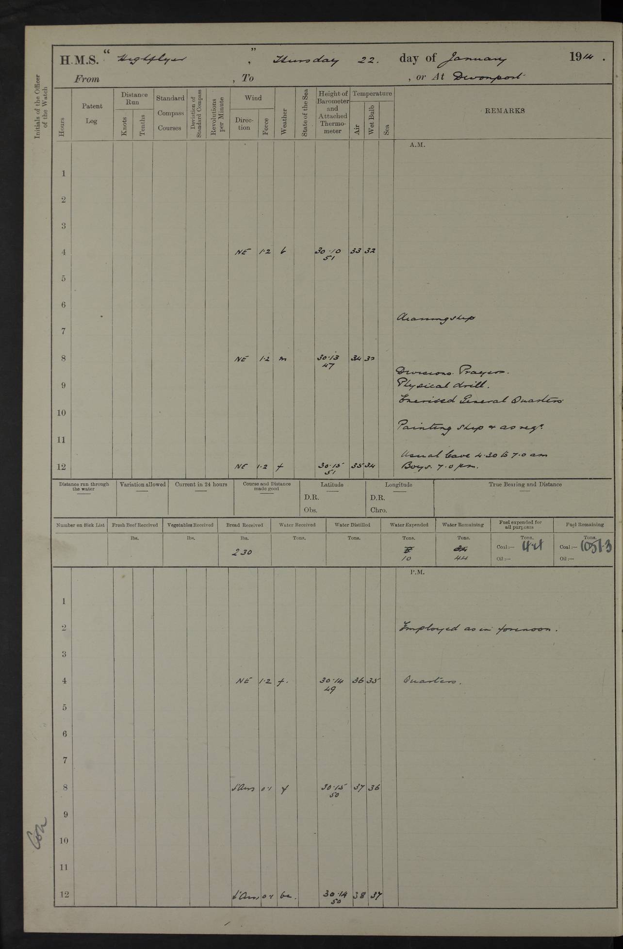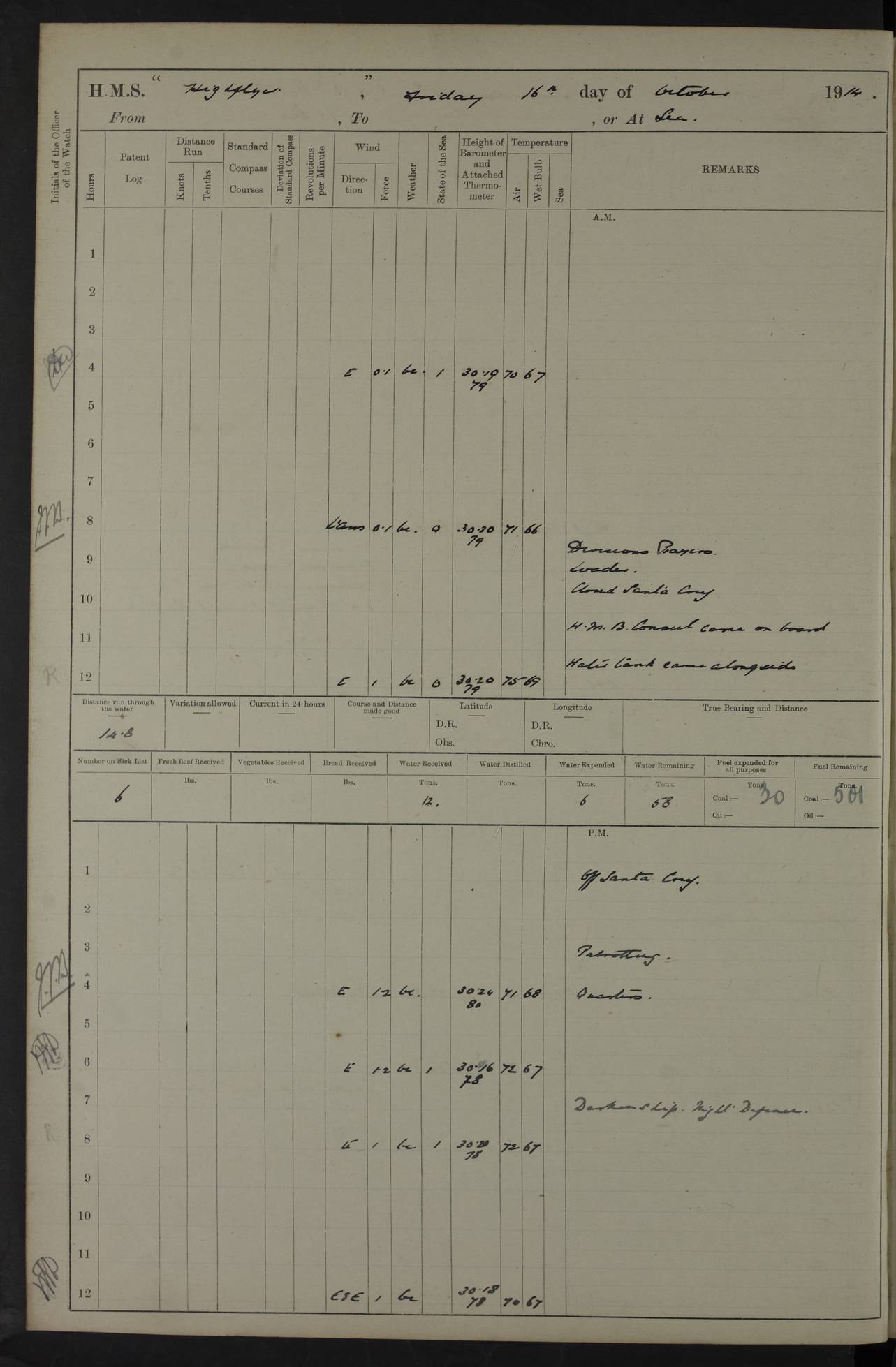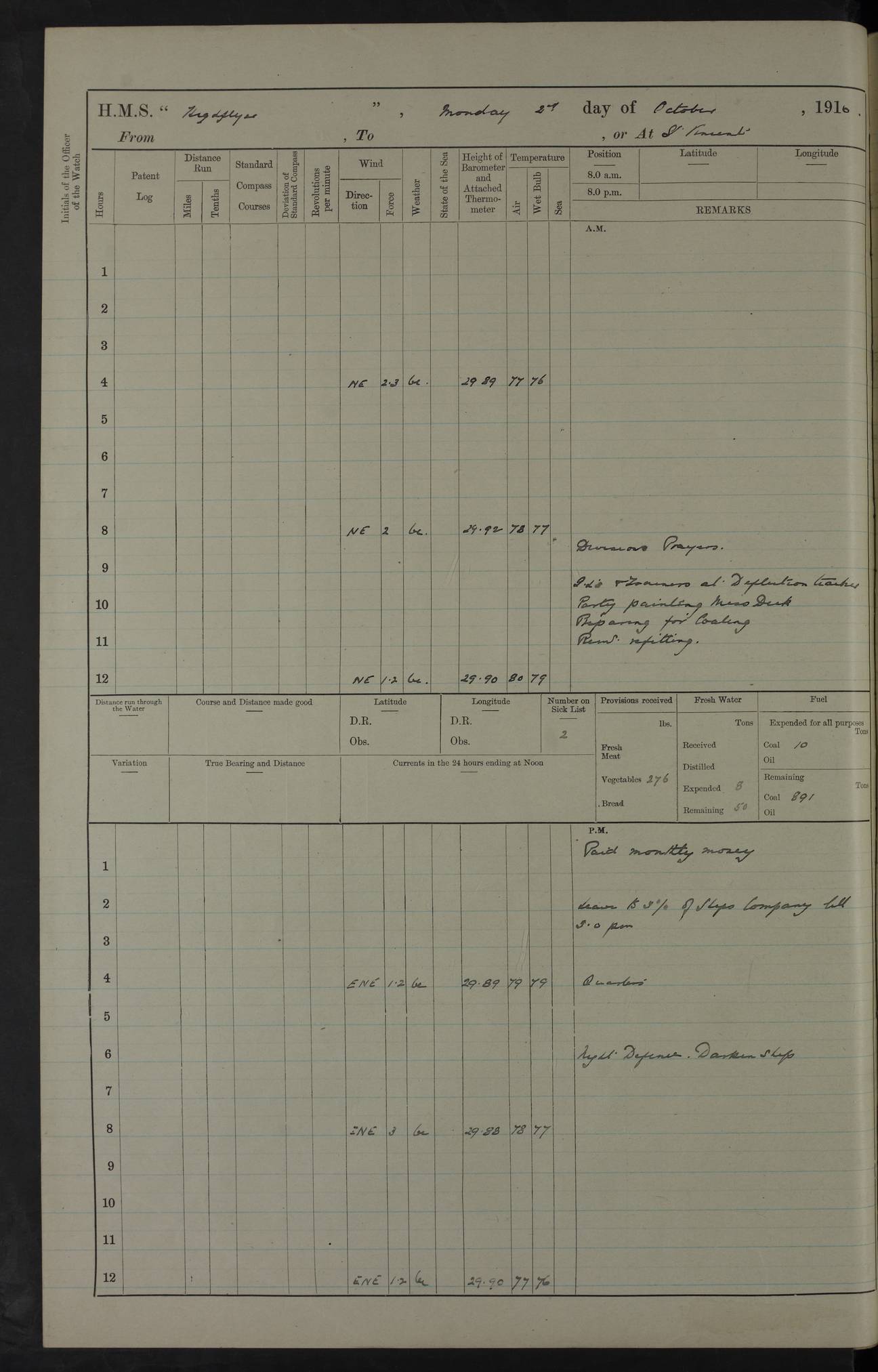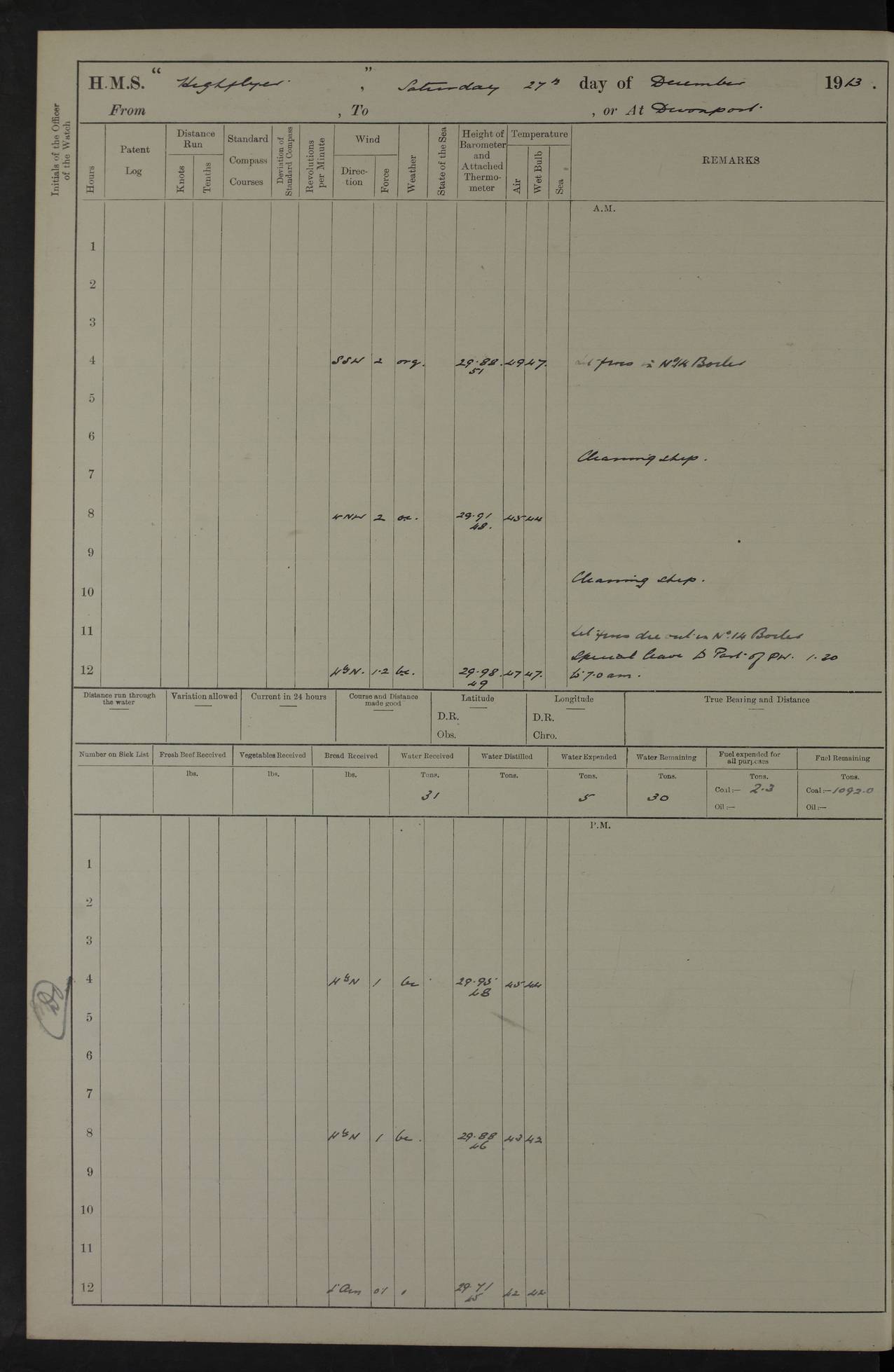 (Maps prepared using Journey Plotter, developed by Maikel. The Plots can only be approximate. They are made by joining-up positions on successive days, and sometimes positions are not given. There will therefore be occasions when the ship appears to have travelled overland) LOG BOOK – JUNE 14TH 1913 TO MAY 31ST 1914 4f960fe4a2fc8e2def00041b: (http://s3.amazonaws.com/oldweather/ADM53-44291/ADM 53-44291-001_0.jpg) 4f960fe5a2fc8e2def00041c: (http://s3.amazonaws.com/oldweather/ADM53-44291/ADM 53-44291-001_1.jpg) 4f960fe5a2fc8e2def00041d: (http://s3.amazonaws.com/oldweather/ADM53-44291/ADM 53-44291-002_0.jpg) 4f960fe5a2fc8e2def00041e: (http://s3.amazonaws.com/oldweather/ADM53-44291/ADM 53-44291-002_1.jpg) LOG of HMS Highflyer Commanded by Captain HT Buller MVO FOR THE PERIOD Commencing Saturday 14th June 1913 Ending Sunday 31st May 1914 Tonnage (displacement): 5600 Extreme length: 350 ft Extreme breadth: 54 ft ENGINES Manufacturer: Fairfield Shipbuilding & Engineering Co, Glasgow IHP: 10.000 Description: Vertical triple expansion 4 cylinders When fixed on board: 1898 BOILERS Manufacturer: Fairfield Shipbuilding & Engineering Co Description: Belleville with economisers 18 in No When made: 1898 When put in vessel: 1898 SCREW PROPELLER Manufacturer: Fairfield Shipbuilding & Engineering Co Description: Twin 3 bladed Admiralty design (bronze) General state of repair: Good 4f960fe6a2fc8e2def00041f: (http://s3.amazonaws.com/oldweather/ADM53-44291/ADM 53-44291-003_0.jpg) [Directions for using the log, figures to indicate the force of the wind and the state of the sea, and letters to denote the state of the weather.] 4f960fe6a2fc8e2def000420: (http://s3.amazonaws.com/oldweather/ADM53-44291/ADM 53-44291-003_1.jpg) Establishment of ship’s company Officers 32 Seamen 164 Boys 24 Marines 50 Engine-room establishment 134 Other non-executive ratings 466 BAROMETER Mercurial or aneroid: Mercurial Name of maker & number: Adie A 577 Height of cistern above sea: 9 feet Thermometers for air temperature Position in ship: Fore bridge Whether in screen: Yes Maker & number: Negretti & Zambra MO/A 9607 dry; from June 14, 1913 to June 1, 1914 MO/A 9603 wet; from June 14, 1913 to June 1, 1914 Thermometer for sea temperature Maker & number: J Hicks A 434; from June 14, 1913 to June 1, 1914 Position of standard compass Fore upper bridge DEVIATION OF STANDARD COMPASS Date obtained: August 29th 1913 Position: Sheerness, No 28 buoy ARMAMENT Fxle: one 6” QF PII S waist: four 6” QF PII P waist: four 6” QF PII OD: two 6” QF PII Battle deck: two 12-pounder 12-cwt SII S waist: three 12-pounder 12-cwt SII P waist: three 12-pounder 12-cwt SII AS deck: 3-pounder QF (Hotchkiss) P waist: 12-pounder 8-cwt field gun Torpedo armament 2 18” tubes BOATS 2 pinnaces, 36 ft sailing 2 cutters 1 gig, 30 ft 1 whaler 1 steam cutter, 32 ft MISCELLANEOUS INFORMATION Draught of water with bunkers full, and complete with provisions, stores and water: forward 22 ft 0 in, aft 23 ft 2 in Load draught, 600 tons coal: forward 19 ft 6 in, aft 21 ft 6 in Number of tons necessary to increase draught 1 inch: 31.5 Number of tons of coal carried (43 cubic feet per ton): a) At load draught, 600 b) With bunkers full, 1132 c) In places other than bunkers, nil Quantity of water carried: a) For boilers, 207 tons b) For drinking 60 tons THE VOYAGES OF HMS HIGHFLYER 1913-1914