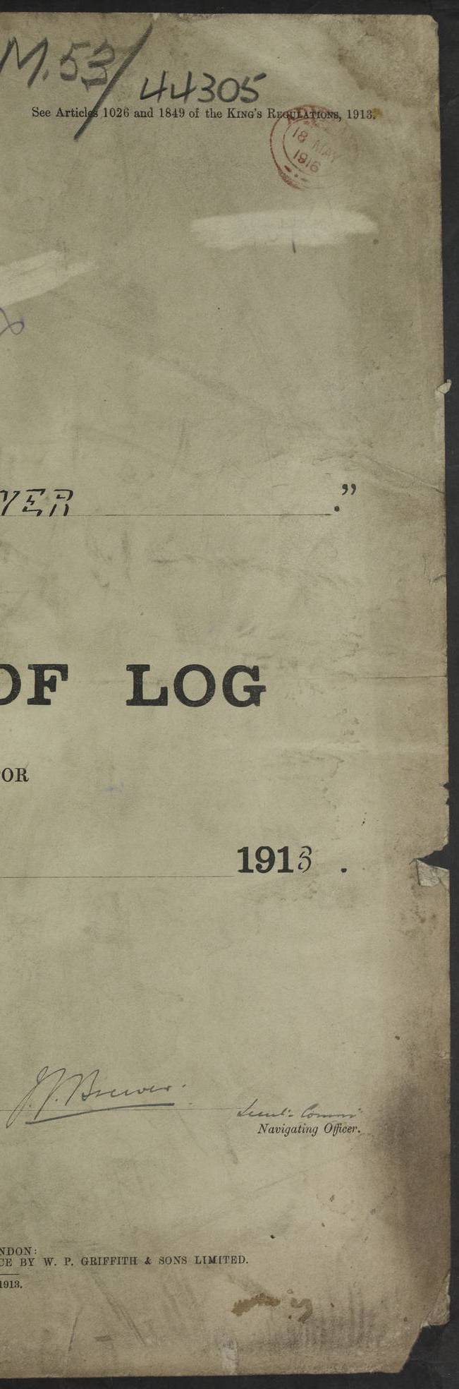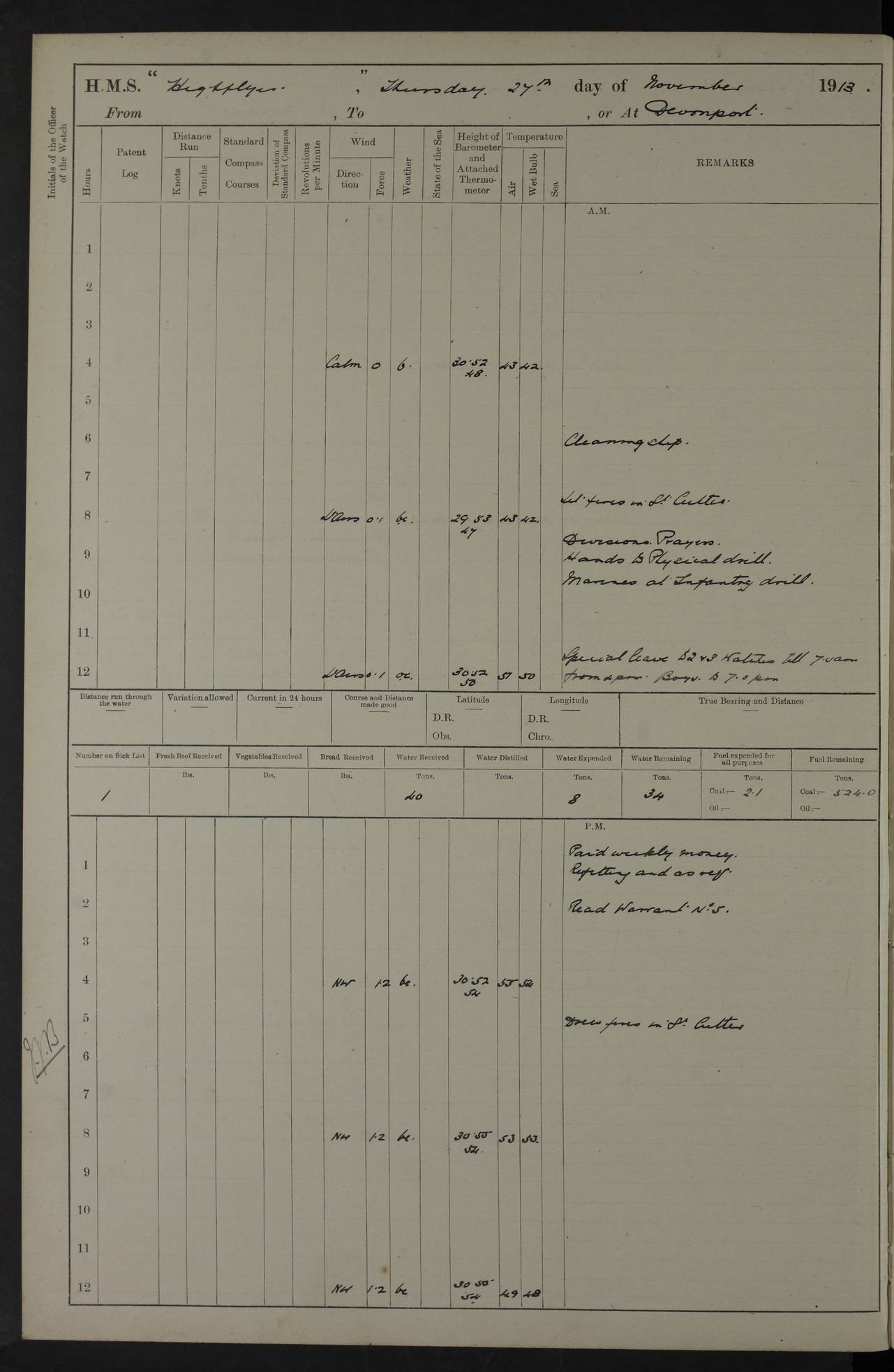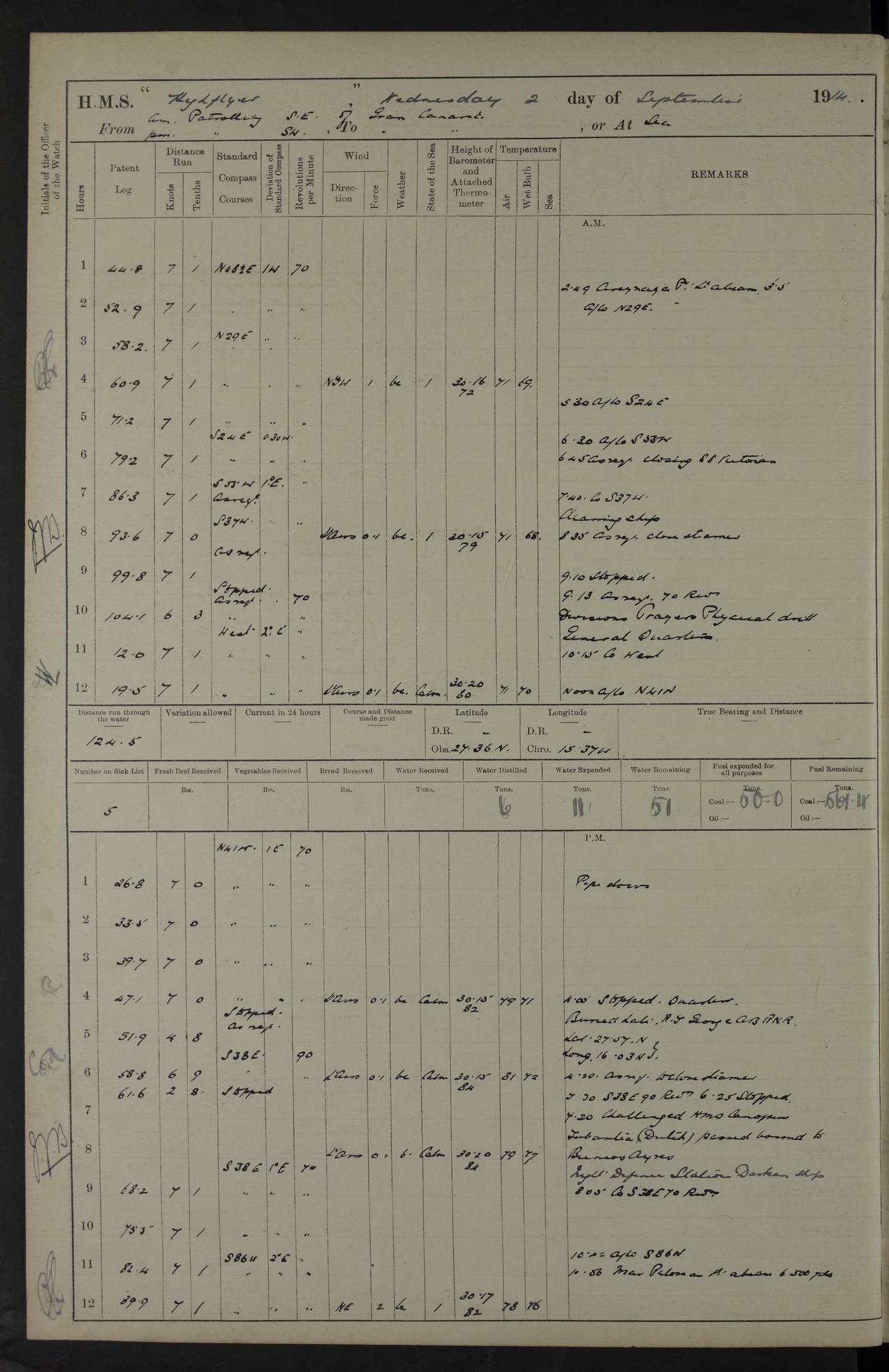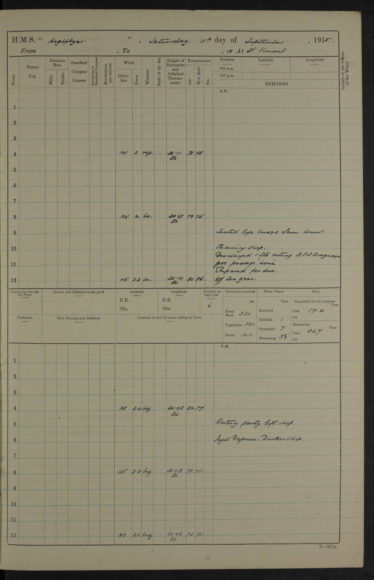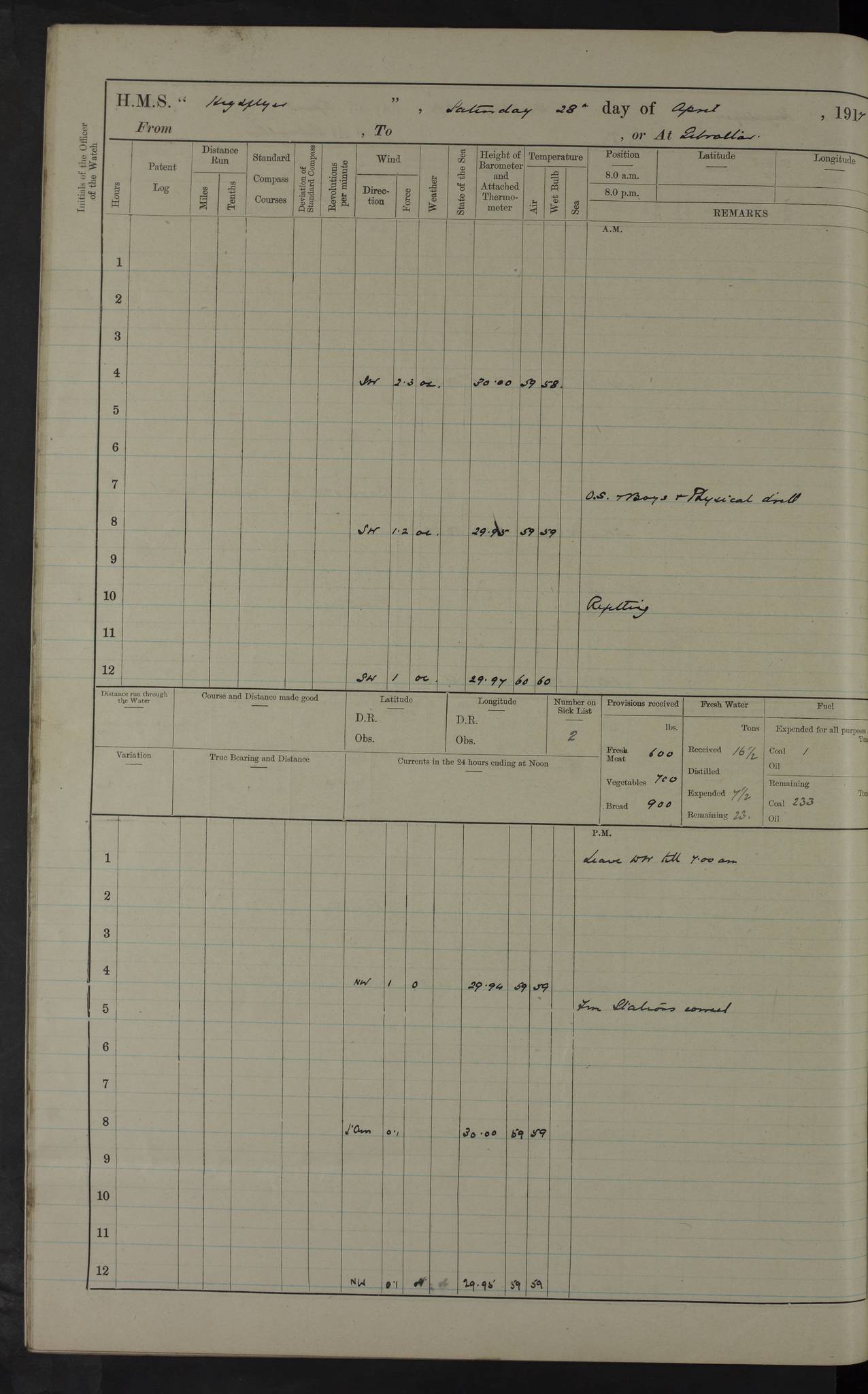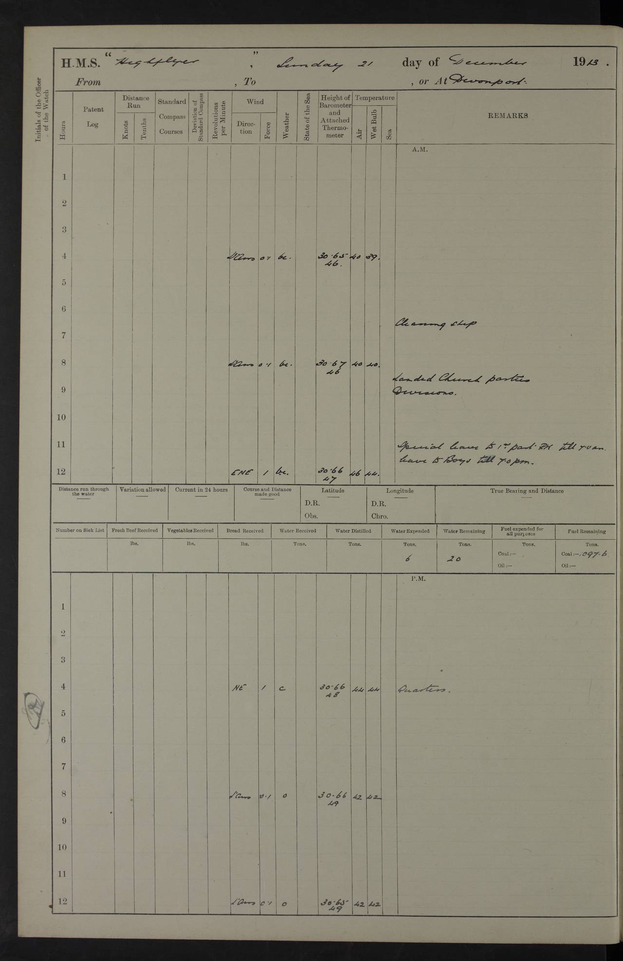(Maps prepared using Journey Plotter, developed by Maikel. The Plots can only be approximate. They are made by joining-up positions on successive days, and sometimes positions are not given. There will therefore be occasions when the ship appears to have travelled overland) LOG BOOK – JUNE 14TH 1913 TO MAY 31ST 1914 4f960fe4a2fc8e2def00041b: (http://s3.amazonaws.com/oldweather/ADM53-44291/ADM 53-44291-001_0.jpg) 4f960fe5a2fc8e2def00041c: (http://s3.amazonaws.com/oldweather/ADM53-44291/ADM 53-44291-001_1.jpg) 4f960fe5a2fc8e2def00041d: (http://s3.amazonaws.com/oldweather/ADM53-44291/ADM 53-44291-002_0.jpg) 4f960fe5a2fc8e2def00041e: (http://s3.amazonaws.com/oldweather/ADM53-44291/ADM 53-44291-002_1.jpg) LOG of HMS Highflyer Commanded by Captain HT Buller MVO FOR THE PERIOD Commencing Saturday 14th June 1913 Ending Sunday 31st May 1914 Tonnage (displacement): 5600 Extreme length: 350 ft Extreme breadth: 54 ft ENGINES Manufacturer: Fairfield Shipbuilding & Engineering Co, Glasgow IHP: 10.000 Description: Vertical triple expansion 4 cylinders When fixed on board: 1898 BOILERS Manufacturer: Fairfield Shipbuilding & Engineering Co Description: Belleville with economisers 18 in No When made: 1898 When put in vessel: 1898 SCREW PROPELLER Manufacturer: Fairfield Shipbuilding & Engineering Co Description: Twin 3 bladed Admiralty design (bronze) General state of repair: Good 4f960fe6a2fc8e2def00041f: (http://s3.amazonaws.com/oldweather/ADM53-44291/ADM 53-44291-003_0.jpg) [Directions for using the log, figures to indicate the force of the wind and the state of the sea, and letters to denote the state of the weather.] 4f960fe6a2fc8e2def000420: (http://s3.amazonaws.com/oldweather/ADM53-44291/ADM 53-44291-003_1.jpg) Establishment of ship’s company Officers 32 Seamen 164 Boys 24 Marines 50 Engine-room establishment 134 Other non-executive ratings 466 BAROMETER Mercurial or aneroid: Mercurial Name of maker & number: Adie A 577 Height of cistern above sea: 9 feet Thermometers for air temperature Position in ship: Fore bridge Whether in screen: Yes Maker & number: Negretti & Zambra MO/A 9607 dry; from June 14, 1913 to June 1, 1914 MO/A 9603 wet; from June 14, 1913 to June 1, 1914 Thermometer for sea temperature Maker & number: J Hicks A 434; from June 14, 1913 to June 1, 1914 Position of standard compass Fore upper bridge DEVIATION OF STANDARD COMPASS Date obtained: August 29th 1913 Position: Sheerness, No 28 buoy ARMAMENT Fxle: one 6” QF PII S waist: four 6” QF PII P waist: four 6” QF PII OD: two 6” QF PII Battle deck: two 12-pounder 12-cwt SII S waist: three 12-pounder 12-cwt SII P waist: three 12-pounder 12-cwt SII AS deck: 3-pounder QF (Hotchkiss) P waist: 12-pounder 8-cwt field gun Torpedo armament 2 18” tubes BOATS 2 pinnaces, 36 ft sailing 2 cutters 1 gig, 30 ft 1 whaler 1 steam cutter, 32 ft MISCELLANEOUS INFORMATION Draught of water with bunkers full, and complete with provisions, stores and water: forward 22 ft 0 in, aft 23 ft 2 in Load draught, 600 tons coal: forward 19 ft 6 in, aft 21 ft 6 in Number of tons necessary to increase draught 1 inch: 31.5 Number of tons of coal carried (43 cubic feet per ton): a) At load draught, 600 b) With bunkers full, 1132 c) In places other than bunkers, nil Quantity of water carried: a) For boilers, 207 tons b) For drinking 60 tons THE VOYAGES OF HMS HIGHFLYER 1913-1914