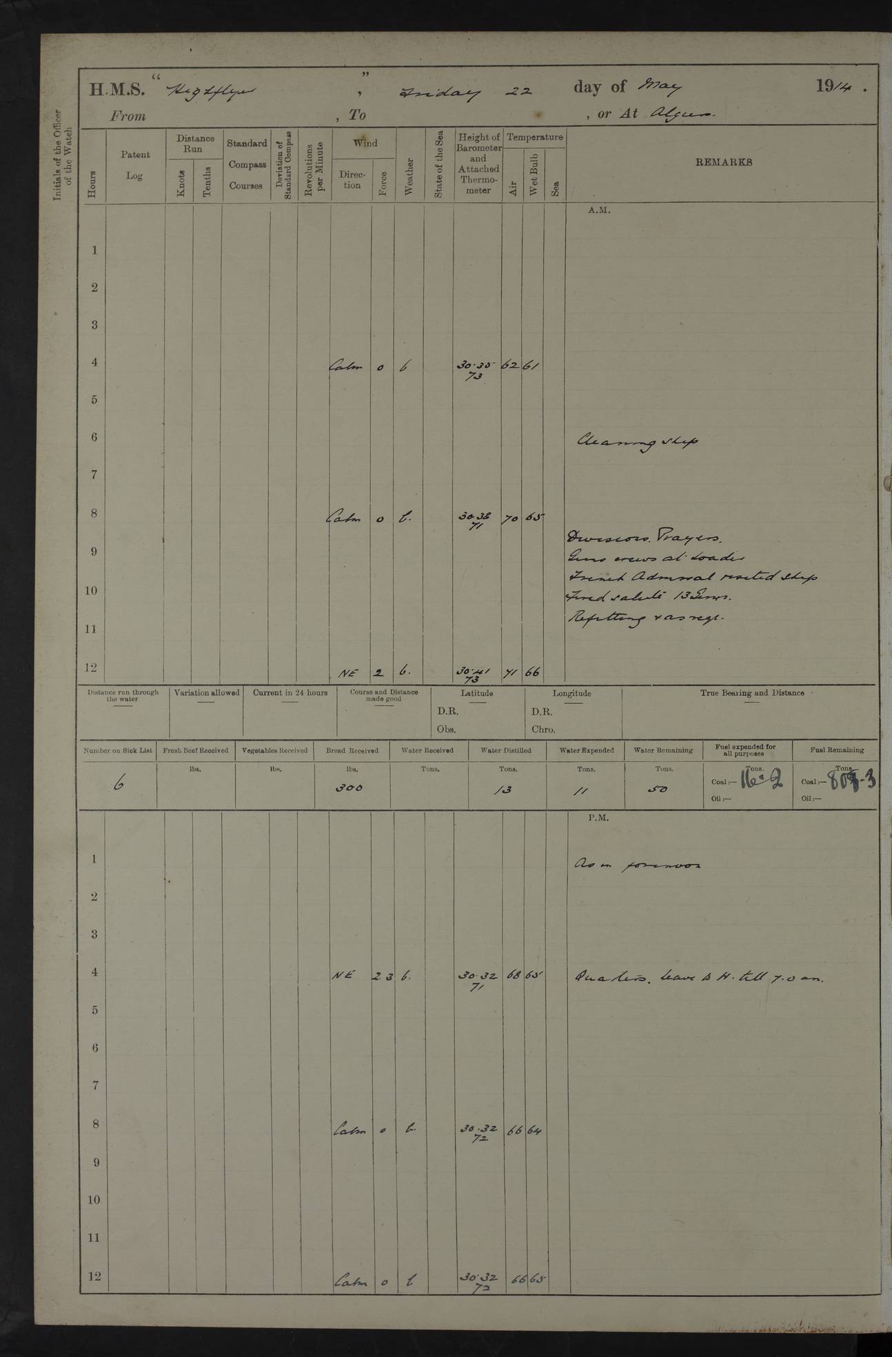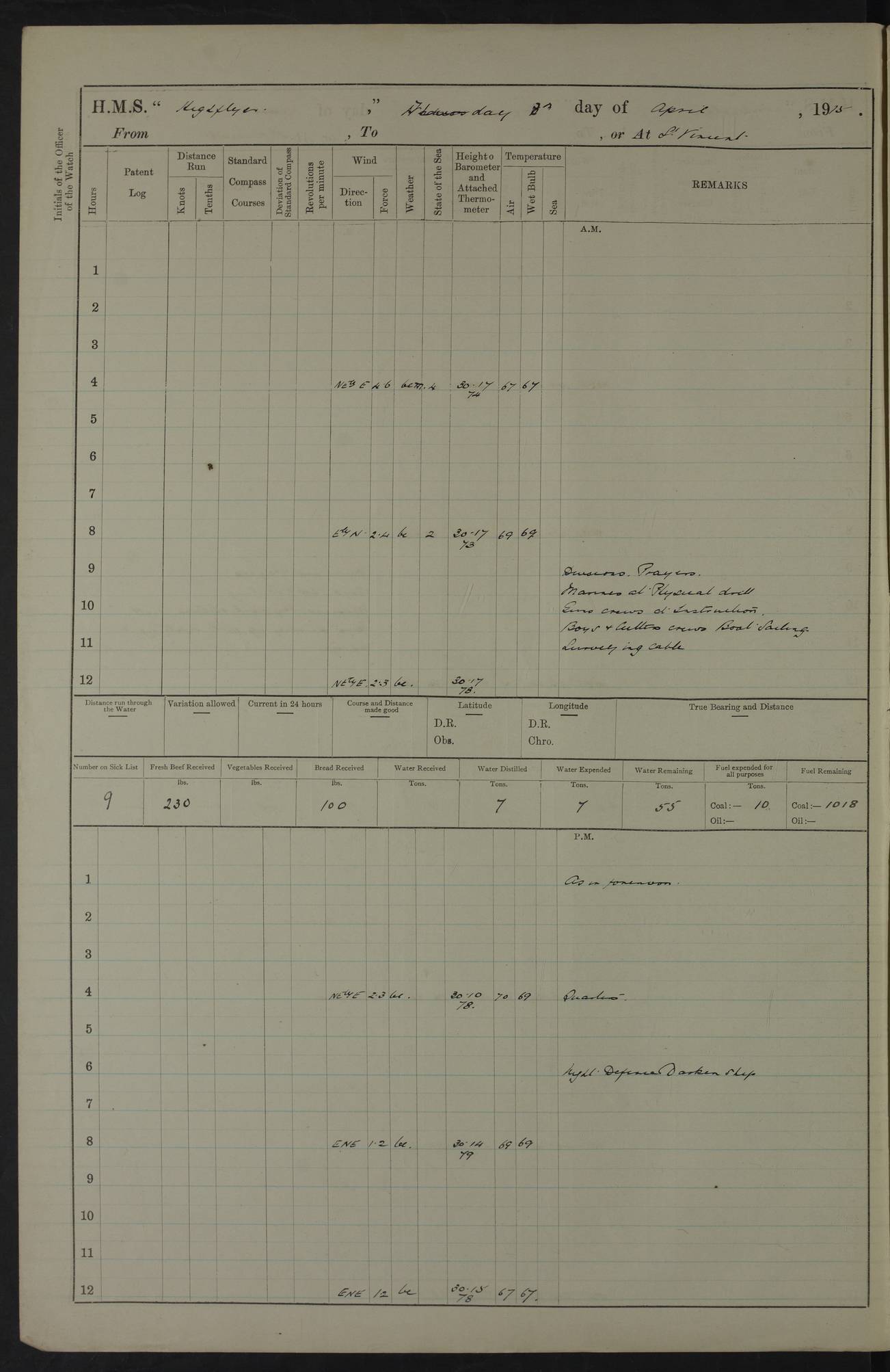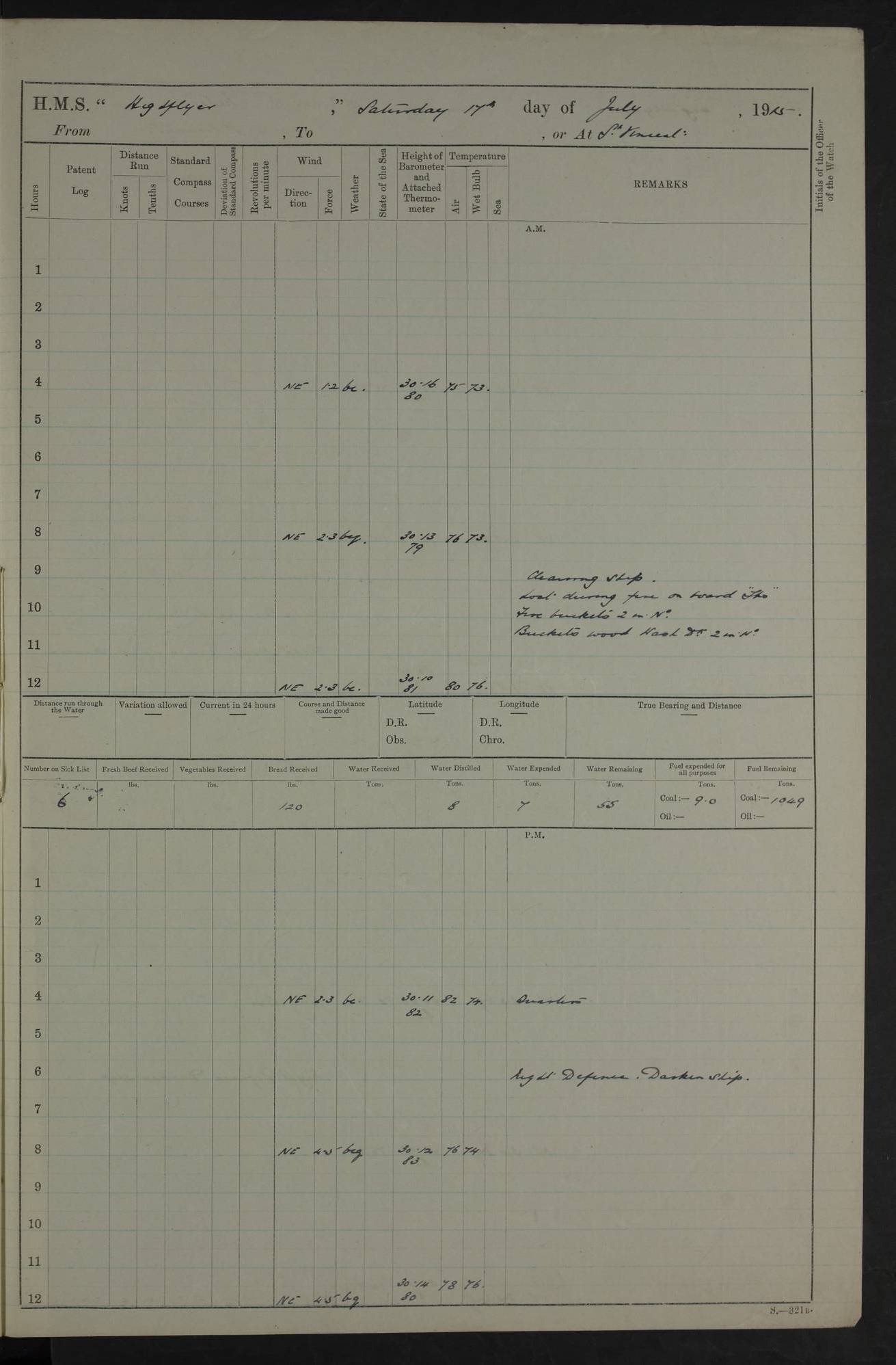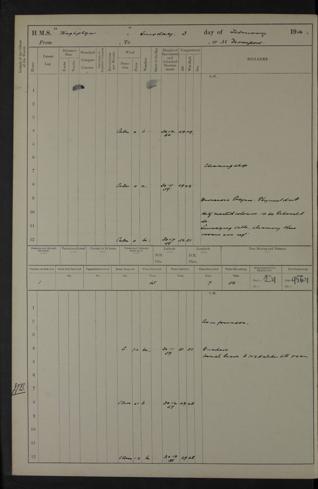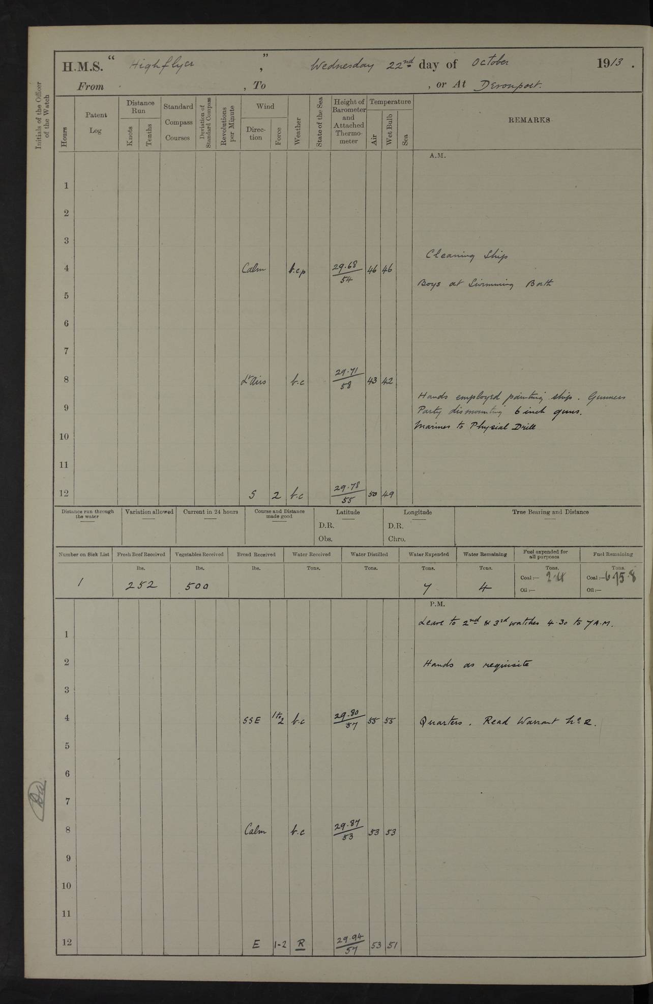 (Maps prepared using Journey Plotter, developed by Maikel. The Plots can only be approximate. They are made by joining-up positions on successive days, and sometimes positions are not given. There will therefore be occasions when the ship appears to have travelled overland) LOG BOOK – JUNE 14TH 1913 TO MAY 31ST 1914 4f960fe4a2fc8e2def00041b: (http://s3.amazonaws.com/oldweather/ADM53-44291/ADM 53-44291-001_0.jpg) 4f960fe5a2fc8e2def00041c: (http://s3.amazonaws.com/oldweather/ADM53-44291/ADM 53-44291-001_1.jpg) 4f960fe5a2fc8e2def00041d: (http://s3.amazonaws.com/oldweather/ADM53-44291/ADM 53-44291-002_0.jpg) 4f960fe5a2fc8e2def00041e: (http://s3.amazonaws.com/oldweather/ADM53-44291/ADM 53-44291-002_1.jpg) LOG of HMS Highflyer Commanded by Captain HT Buller MVO FOR THE PERIOD Commencing Saturday 14th June 1913 Ending Sunday 31st May 1914 Tonnage (displacement): 5600 Extreme length: 350 ft Extreme breadth: 54 ft ENGINES Manufacturer: Fairfield Shipbuilding & Engineering Co, Glasgow IHP: 10.000 Description: Vertical triple expansion 4 cylinders When fixed on board: 1898 BOILERS Manufacturer: Fairfield Shipbuilding & Engineering Co Description: Belleville with economisers 18 in No When made: 1898 When put in vessel: 1898 SCREW PROPELLER Manufacturer: Fairfield Shipbuilding & Engineering Co Description: Twin 3 bladed Admiralty design (bronze) General state of repair: Good 4f960fe6a2fc8e2def00041f: (http://s3.amazonaws.com/oldweather/ADM53-44291/ADM 53-44291-003_0.jpg) [Directions for using the log, figures to indicate the force of the wind and the state of the sea, and letters to denote the state of the weather.] 4f960fe6a2fc8e2def000420: (http://s3.amazonaws.com/oldweather/ADM53-44291/ADM 53-44291-003_1.jpg) Establishment of ship’s company Officers 32 Seamen 164 Boys 24 Marines 50 Engine-room establishment 134 Other non-executive ratings 466 BAROMETER Mercurial or aneroid: Mercurial Name of maker & number: Adie A 577 Height of cistern above sea: 9 feet Thermometers for air temperature Position in ship: Fore bridge Whether in screen: Yes Maker & number: Negretti & Zambra MO/A 9607 dry; from June 14, 1913 to June 1, 1914 MO/A 9603 wet; from June 14, 1913 to June 1, 1914 Thermometer for sea temperature Maker & number: J Hicks A 434; from June 14, 1913 to June 1, 1914 Position of standard compass Fore upper bridge DEVIATION OF STANDARD COMPASS Date obtained: August 29th 1913 Position: Sheerness, No 28 buoy ARMAMENT Fxle: one 6” QF PII S waist: four 6” QF PII P waist: four 6” QF PII OD: two 6” QF PII Battle deck: two 12-pounder 12-cwt SII S waist: three 12-pounder 12-cwt SII P waist: three 12-pounder 12-cwt SII AS deck: 3-pounder QF (Hotchkiss) P waist: 12-pounder 8-cwt field gun Torpedo armament 2 18” tubes BOATS 2 pinnaces, 36 ft sailing 2 cutters 1 gig, 30 ft 1 whaler 1 steam cutter, 32 ft MISCELLANEOUS INFORMATION Draught of water with bunkers full, and complete with provisions, stores and water: forward 22 ft 0 in, aft 23 ft 2 in Load draught, 600 tons coal: forward 19 ft 6 in, aft 21 ft 6 in Number of tons necessary to increase draught 1 inch: 31.5 Number of tons of coal carried (43 cubic feet per ton): a) At load draught, 600 b) With bunkers full, 1132 c) In places other than bunkers, nil Quantity of water carried: a) For boilers, 207 tons b) For drinking 60 tons THE VOYAGES OF HMS HIGHFLYER 1913-1914