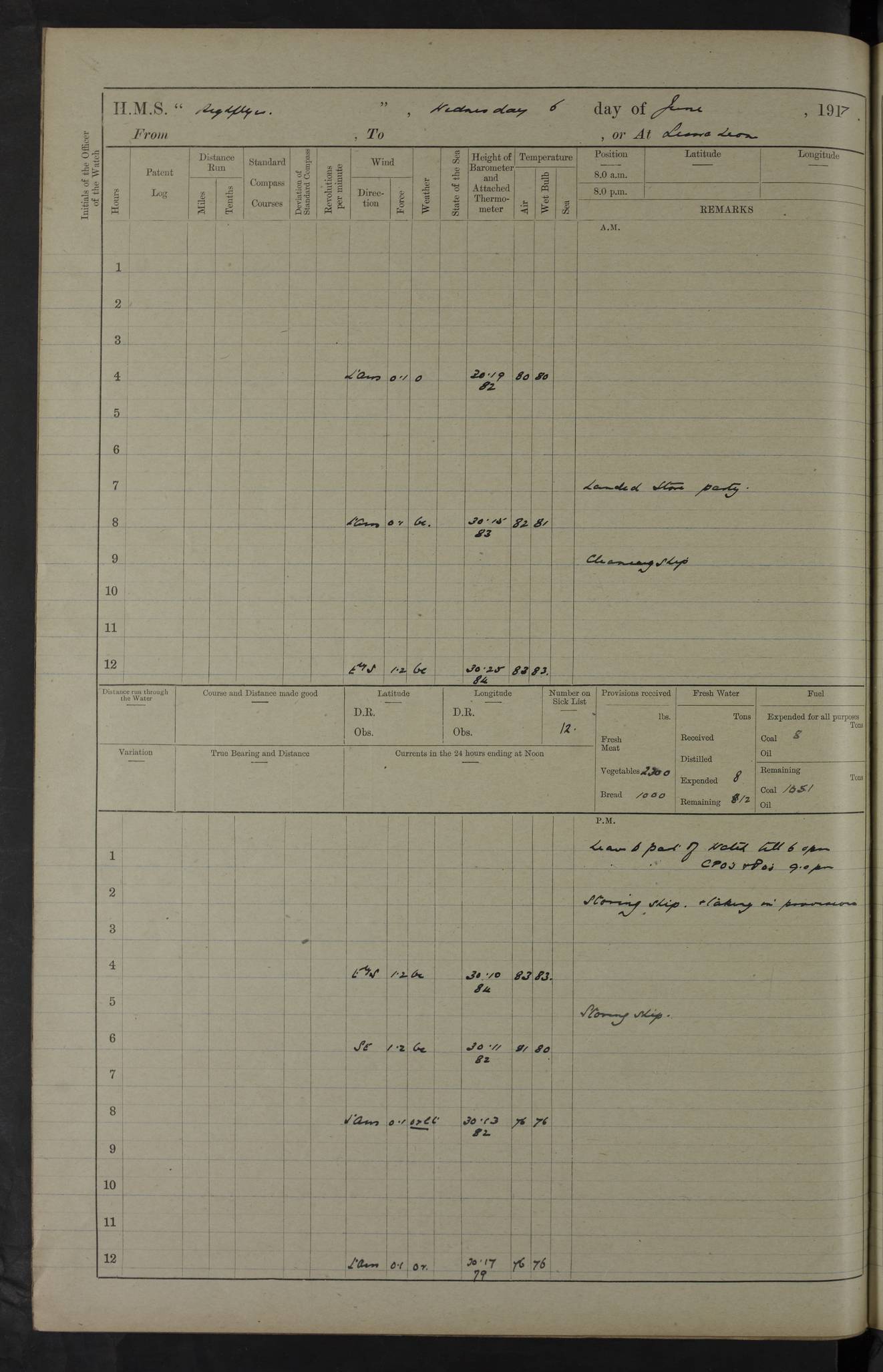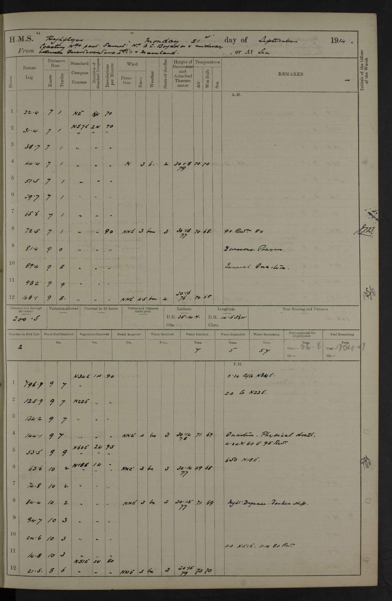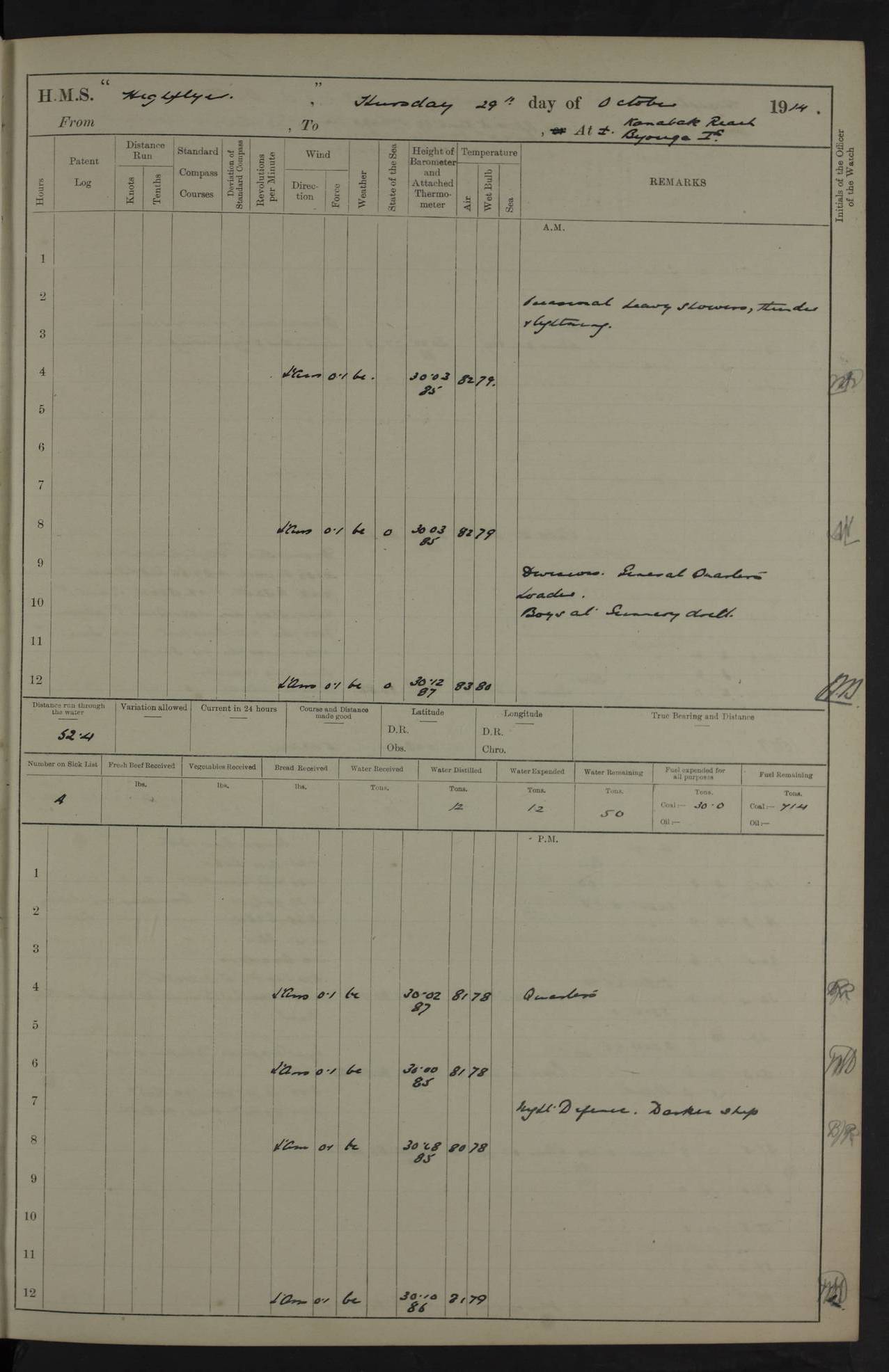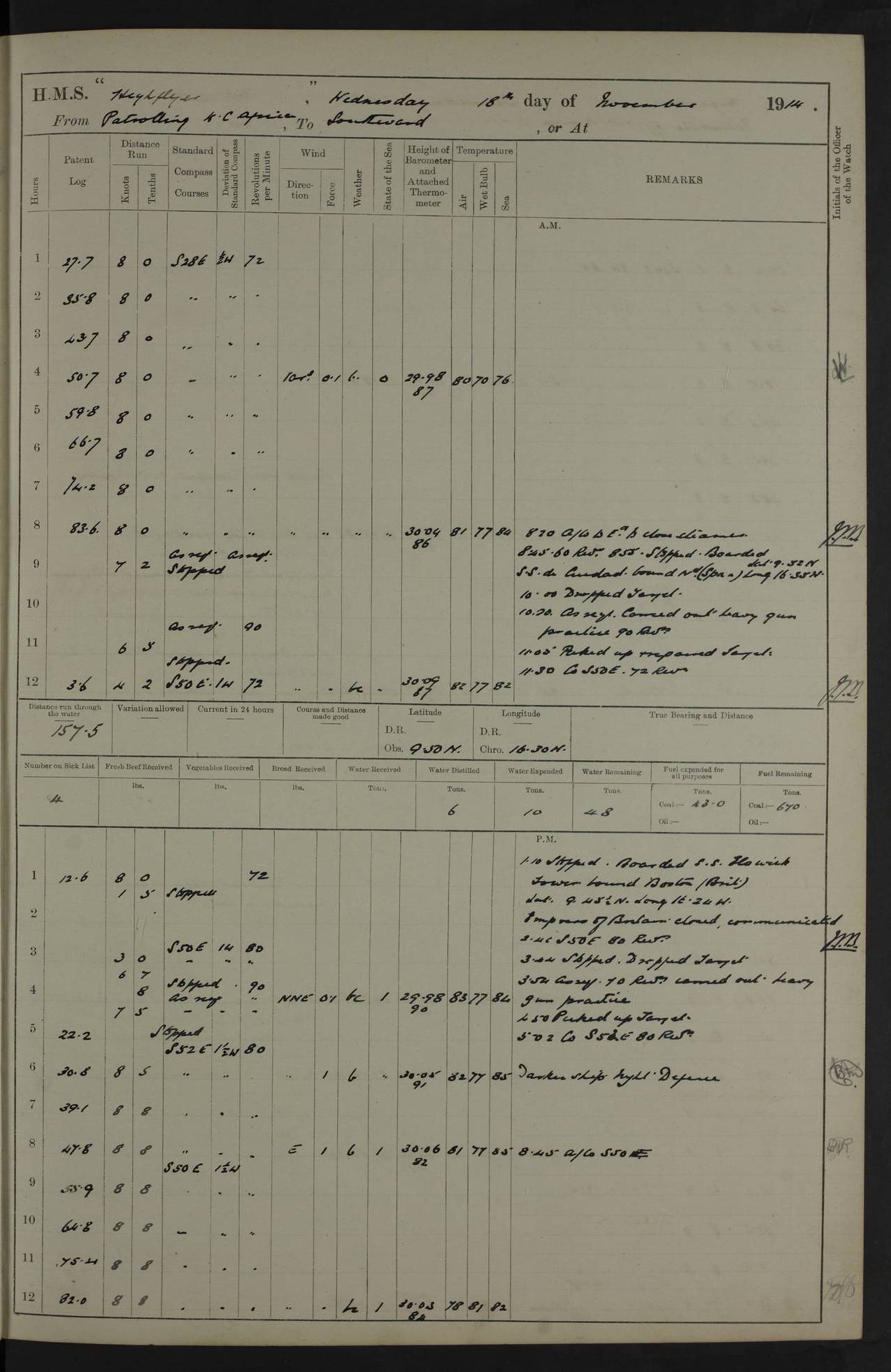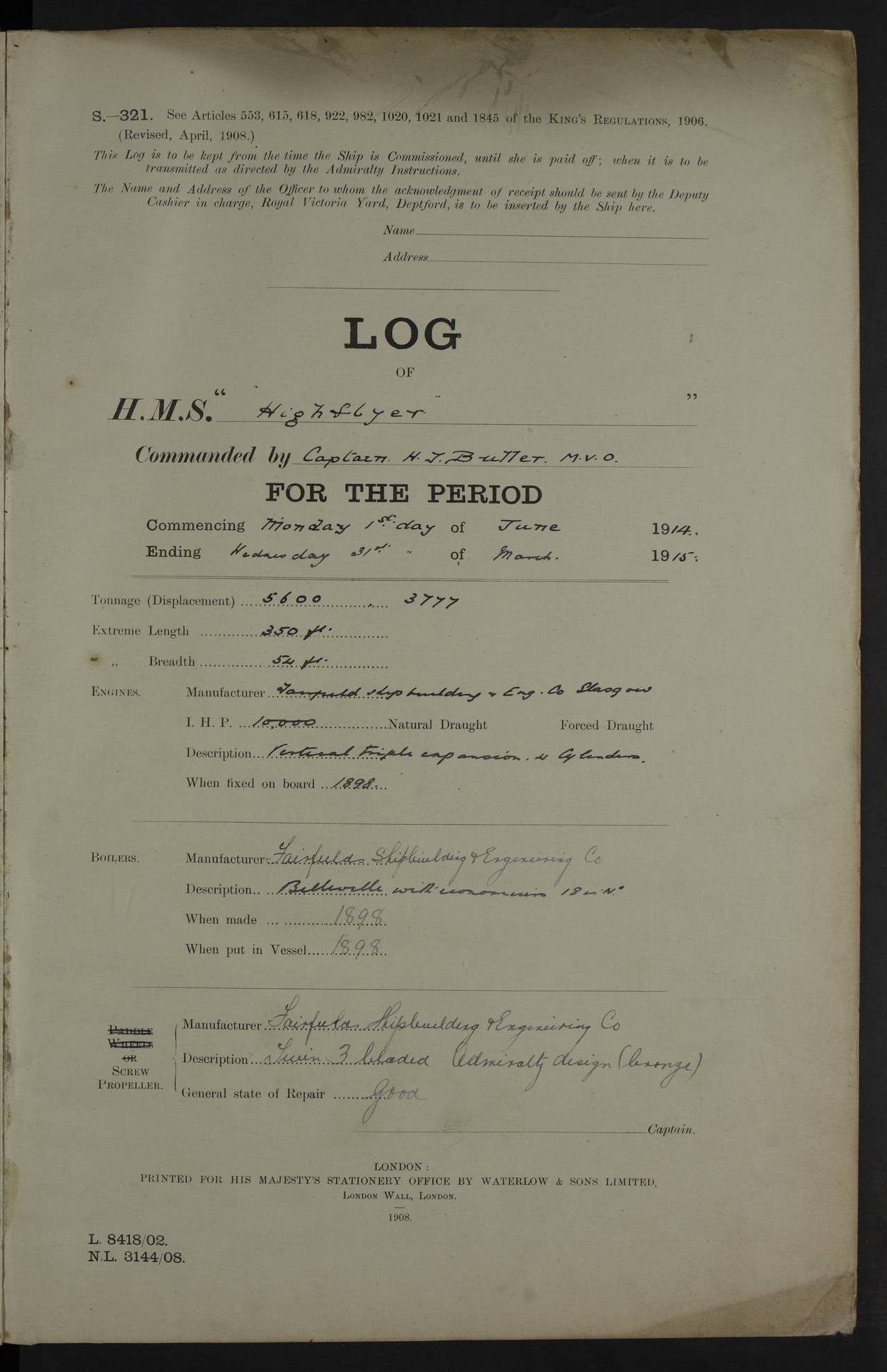 (Maps prepared using Journey Plotter, developed by Maikel. The Plots can only be approximate. They are made by joining-up positions on successive days, and sometimes positions are not given. There will therefore be occasions when the ship appears to have travelled overland) LOG BOOK – JUNE 14TH 1913 TO MAY 31ST 1914 4f960fe4a2fc8e2def00041b: (http://s3.amazonaws.com/oldweather/ADM53-44291/ADM 53-44291-001_0.jpg) 4f960fe5a2fc8e2def00041c: (http://s3.amazonaws.com/oldweather/ADM53-44291/ADM 53-44291-001_1.jpg) 4f960fe5a2fc8e2def00041d: (http://s3.amazonaws.com/oldweather/ADM53-44291/ADM 53-44291-002_0.jpg) 4f960fe5a2fc8e2def00041e: (http://s3.amazonaws.com/oldweather/ADM53-44291/ADM 53-44291-002_1.jpg) LOG of HMS Highflyer Commanded by Captain HT Buller MVO FOR THE PERIOD Commencing Saturday 14th June 1913 Ending Sunday 31st May 1914 Tonnage (displacement): 5600 Extreme length: 350 ft Extreme breadth: 54 ft ENGINES Manufacturer: Fairfield Shipbuilding & Engineering Co, Glasgow IHP: 10.000 Description: Vertical triple expansion 4 cylinders When fixed on board: 1898 BOILERS Manufacturer: Fairfield Shipbuilding & Engineering Co Description: Belleville with economisers 18 in No When made: 1898 When put in vessel: 1898 SCREW PROPELLER Manufacturer: Fairfield Shipbuilding & Engineering Co Description: Twin 3 bladed Admiralty design (bronze) General state of repair: Good 4f960fe6a2fc8e2def00041f: (http://s3.amazonaws.com/oldweather/ADM53-44291/ADM 53-44291-003_0.jpg) [Directions for using the log, figures to indicate the force of the wind and the state of the sea, and letters to denote the state of the weather.] 4f960fe6a2fc8e2def000420: (http://s3.amazonaws.com/oldweather/ADM53-44291/ADM 53-44291-003_1.jpg) Establishment of ship’s company Officers 32 Seamen 164 Boys 24 Marines 50 Engine-room establishment 134 Other non-executive ratings 466 BAROMETER Mercurial or aneroid: Mercurial Name of maker & number: Adie A 577 Height of cistern above sea: 9 feet Thermometers for air temperature Position in ship: Fore bridge Whether in screen: Yes Maker & number: Negretti & Zambra MO/A 9607 dry; from June 14, 1913 to June 1, 1914 MO/A 9603 wet; from June 14, 1913 to June 1, 1914 Thermometer for sea temperature Maker & number: J Hicks A 434; from June 14, 1913 to June 1, 1914 Position of standard compass Fore upper bridge DEVIATION OF STANDARD COMPASS Date obtained: August 29th 1913 Position: Sheerness, No 28 buoy ARMAMENT Fxle: one 6” QF PII S waist: four 6” QF PII P waist: four 6” QF PII OD: two 6” QF PII Battle deck: two 12-pounder 12-cwt SII S waist: three 12-pounder 12-cwt SII P waist: three 12-pounder 12-cwt SII AS deck: 3-pounder QF (Hotchkiss) P waist: 12-pounder 8-cwt field gun Torpedo armament 2 18” tubes BOATS 2 pinnaces, 36 ft sailing 2 cutters 1 gig, 30 ft 1 whaler 1 steam cutter, 32 ft MISCELLANEOUS INFORMATION Draught of water with bunkers full, and complete with provisions, stores and water: forward 22 ft 0 in, aft 23 ft 2 in Load draught, 600 tons coal: forward 19 ft 6 in, aft 21 ft 6 in Number of tons necessary to increase draught 1 inch: 31.5 Number of tons of coal carried (43 cubic feet per ton): a) At load draught, 600 b) With bunkers full, 1132 c) In places other than bunkers, nil Quantity of water carried: a) For boilers, 207 tons b) For drinking 60 tons THE VOYAGES OF HMS HIGHFLYER 1913-1914