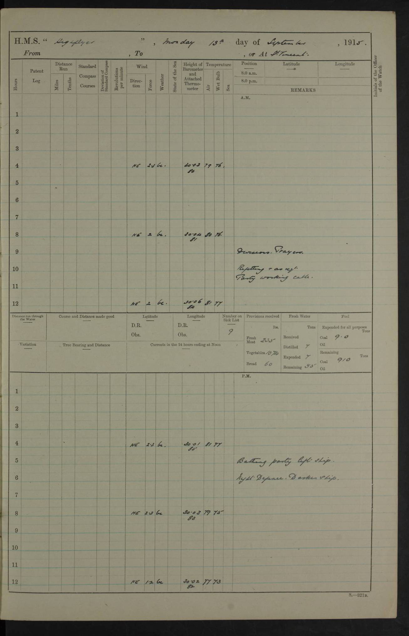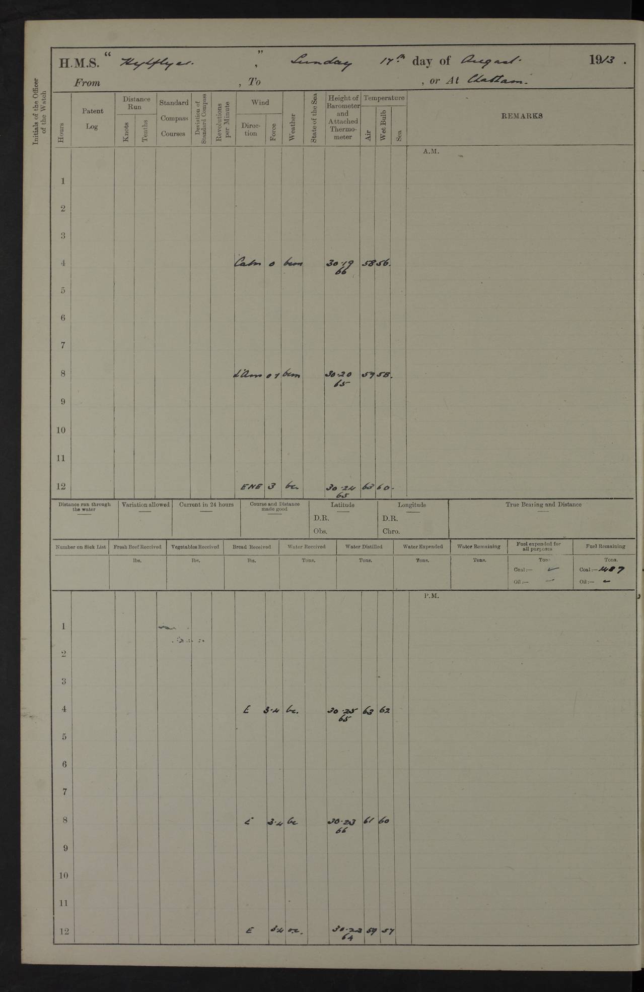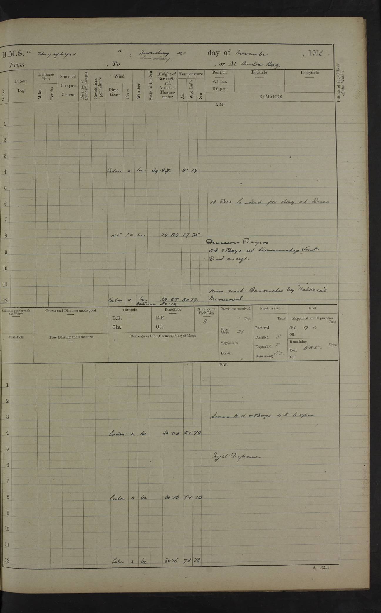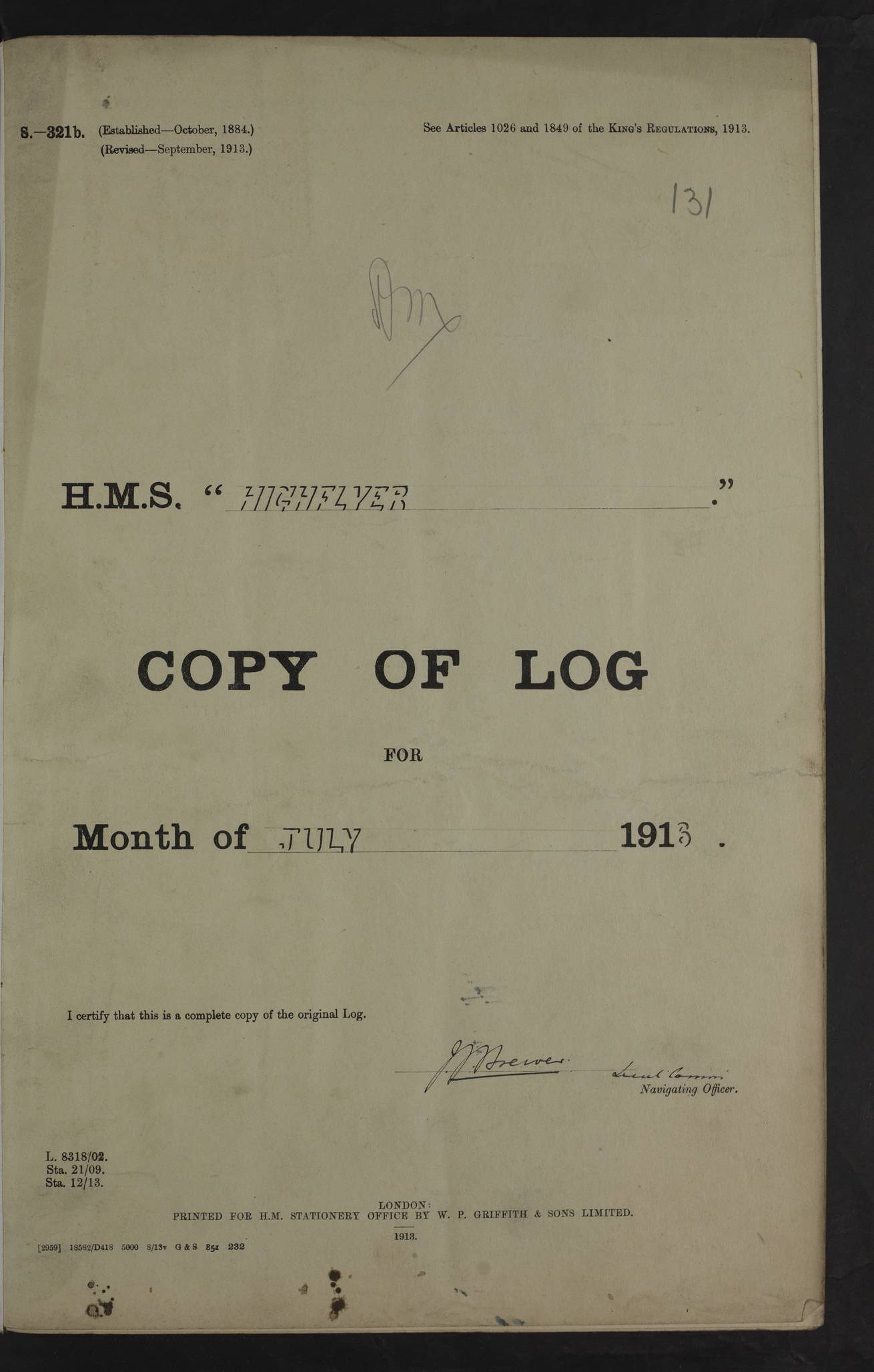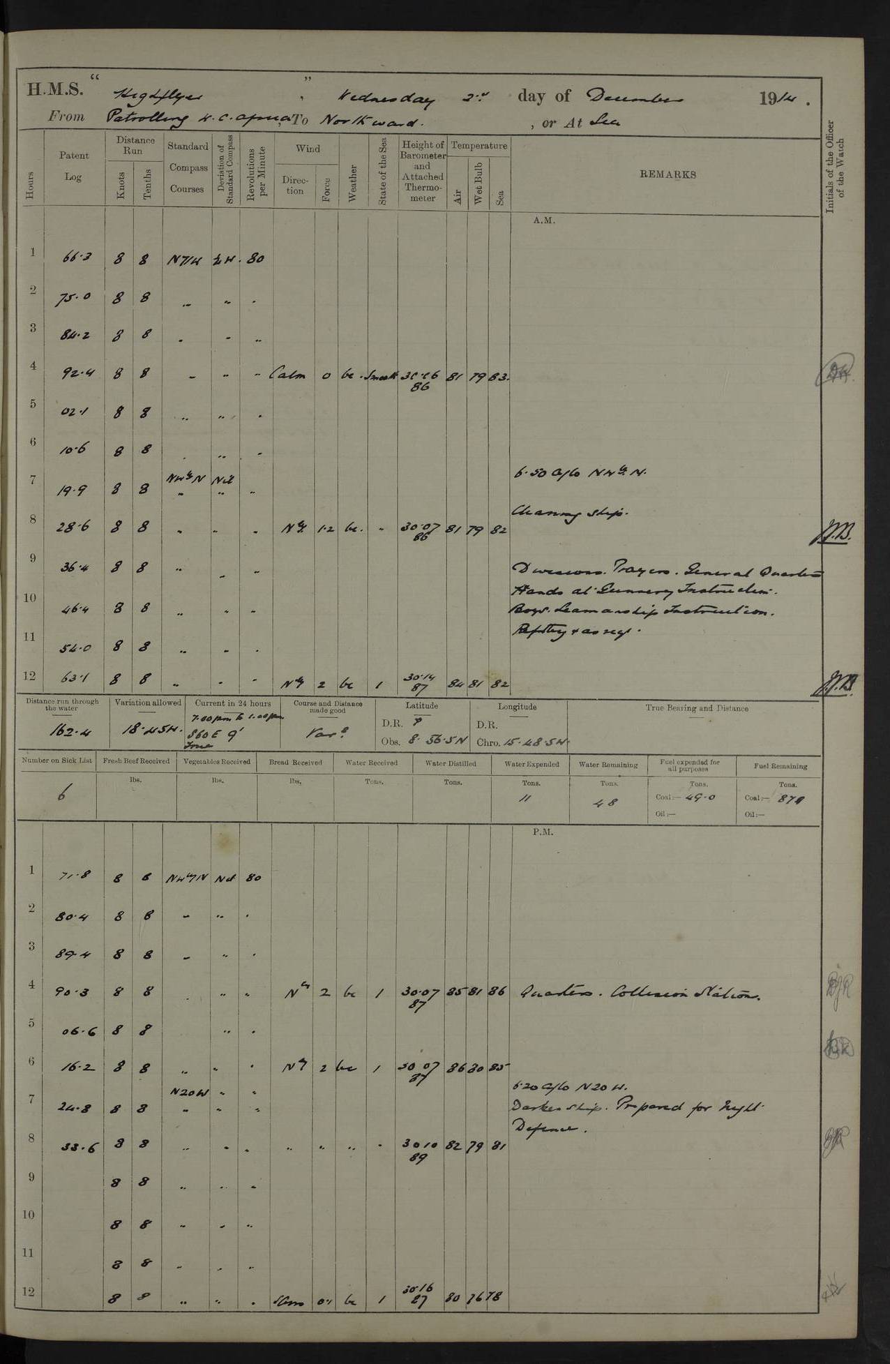 (Maps prepared using Journey Plotter, developed by Maikel. The Plots can only be approximate. They are made by joining-up positions on successive days, and sometimes positions are not given. There will therefore be occasions when the ship appears to have travelled overland) LOG BOOK – JUNE 14TH 1913 TO MAY 31ST 1914 4f960fe4a2fc8e2def00041b: (http://s3.amazonaws.com/oldweather/ADM53-44291/ADM 53-44291-001_0.jpg) 4f960fe5a2fc8e2def00041c: (http://s3.amazonaws.com/oldweather/ADM53-44291/ADM 53-44291-001_1.jpg) 4f960fe5a2fc8e2def00041d: (http://s3.amazonaws.com/oldweather/ADM53-44291/ADM 53-44291-002_0.jpg) 4f960fe5a2fc8e2def00041e: (http://s3.amazonaws.com/oldweather/ADM53-44291/ADM 53-44291-002_1.jpg) LOG of HMS Highflyer Commanded by Captain HT Buller MVO FOR THE PERIOD Commencing Saturday 14th June 1913 Ending Sunday 31st May 1914 Tonnage (displacement): 5600 Extreme length: 350 ft Extreme breadth: 54 ft ENGINES Manufacturer: Fairfield Shipbuilding & Engineering Co, Glasgow IHP: 10.000 Description: Vertical triple expansion 4 cylinders When fixed on board: 1898 BOILERS Manufacturer: Fairfield Shipbuilding & Engineering Co Description: Belleville with economisers 18 in No When made: 1898 When put in vessel: 1898 SCREW PROPELLER Manufacturer: Fairfield Shipbuilding & Engineering Co Description: Twin 3 bladed Admiralty design (bronze) General state of repair: Good 4f960fe6a2fc8e2def00041f: (http://s3.amazonaws.com/oldweather/ADM53-44291/ADM 53-44291-003_0.jpg) [Directions for using the log, figures to indicate the force of the wind and the state of the sea, and letters to denote the state of the weather.] 4f960fe6a2fc8e2def000420: (http://s3.amazonaws.com/oldweather/ADM53-44291/ADM 53-44291-003_1.jpg) Establishment of ship’s company Officers 32 Seamen 164 Boys 24 Marines 50 Engine-room establishment 134 Other non-executive ratings 466 BAROMETER Mercurial or aneroid: Mercurial Name of maker & number: Adie A 577 Height of cistern above sea: 9 feet Thermometers for air temperature Position in ship: Fore bridge Whether in screen: Yes Maker & number: Negretti & Zambra MO/A 9607 dry; from June 14, 1913 to June 1, 1914 MO/A 9603 wet; from June 14, 1913 to June 1, 1914 Thermometer for sea temperature Maker & number: J Hicks A 434; from June 14, 1913 to June 1, 1914 Position of standard compass Fore upper bridge DEVIATION OF STANDARD COMPASS Date obtained: August 29th 1913 Position: Sheerness, No 28 buoy ARMAMENT Fxle: one 6” QF PII S waist: four 6” QF PII P waist: four 6” QF PII OD: two 6” QF PII Battle deck: two 12-pounder 12-cwt SII S waist: three 12-pounder 12-cwt SII P waist: three 12-pounder 12-cwt SII AS deck: 3-pounder QF (Hotchkiss) P waist: 12-pounder 8-cwt field gun Torpedo armament 2 18” tubes BOATS 2 pinnaces, 36 ft sailing 2 cutters 1 gig, 30 ft 1 whaler 1 steam cutter, 32 ft MISCELLANEOUS INFORMATION Draught of water with bunkers full, and complete with provisions, stores and water: forward 22 ft 0 in, aft 23 ft 2 in Load draught, 600 tons coal: forward 19 ft 6 in, aft 21 ft 6 in Number of tons necessary to increase draught 1 inch: 31.5 Number of tons of coal carried (43 cubic feet per ton): a) At load draught, 600 b) With bunkers full, 1132 c) In places other than bunkers, nil Quantity of water carried: a) For boilers, 207 tons b) For drinking 60 tons THE VOYAGES OF HMS HIGHFLYER 1913-1914