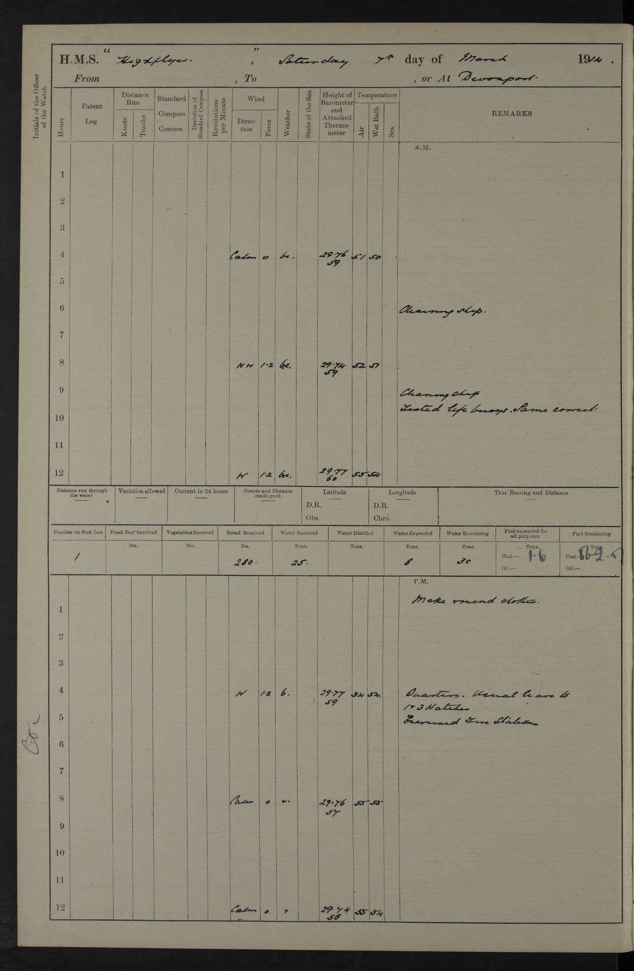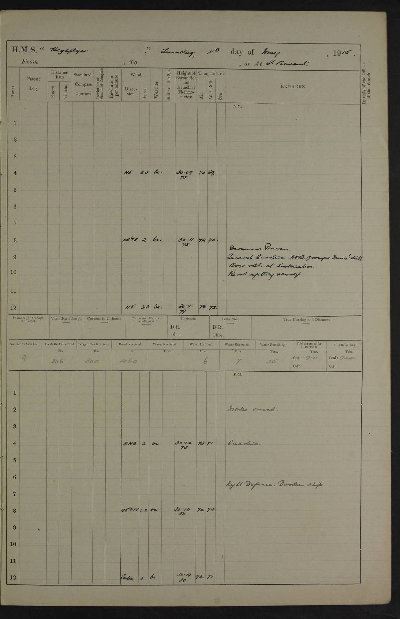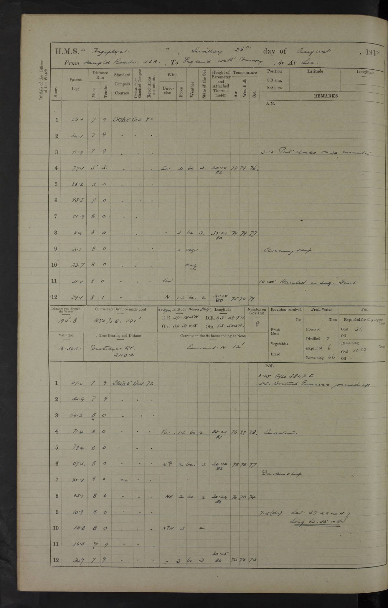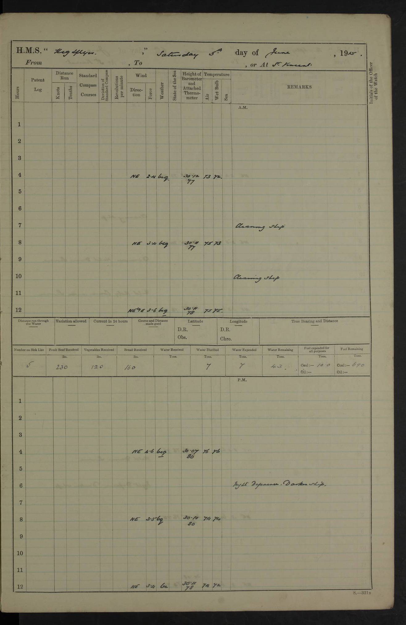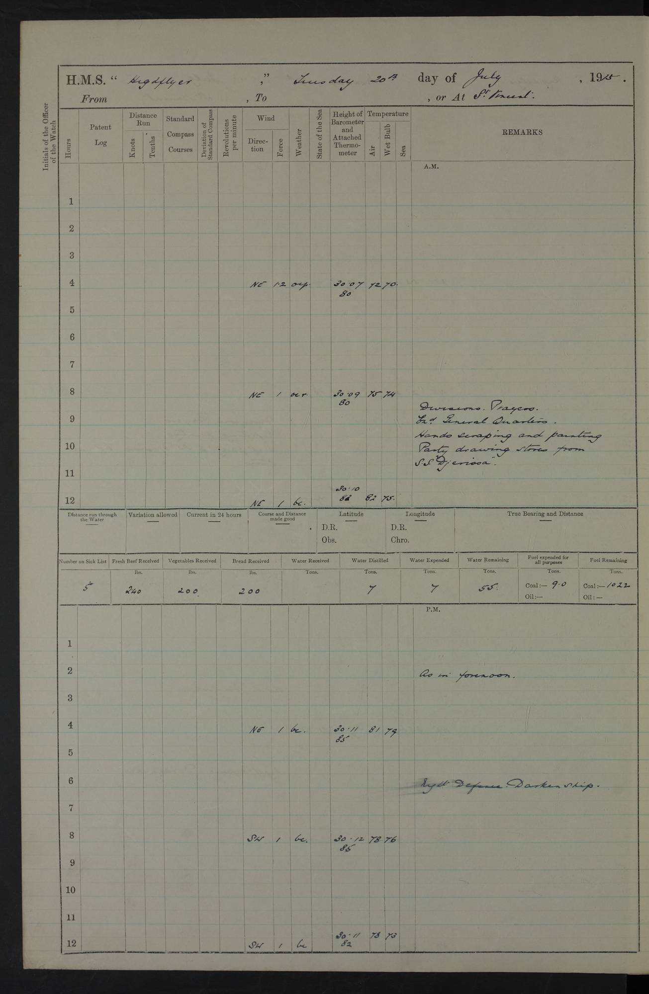 (Maps prepared using Journey Plotter, developed by Maikel. The Plots can only be approximate. They are made by joining-up positions on successive days, and sometimes positions are not given. There will therefore be occasions when the ship appears to have travelled overland) LOG BOOK – JUNE 14TH 1913 TO MAY 31ST 1914 4f960fe4a2fc8e2def00041b: (http://s3.amazonaws.com/oldweather/ADM53-44291/ADM 53-44291-001_0.jpg) 4f960fe5a2fc8e2def00041c: (http://s3.amazonaws.com/oldweather/ADM53-44291/ADM 53-44291-001_1.jpg) 4f960fe5a2fc8e2def00041d: (http://s3.amazonaws.com/oldweather/ADM53-44291/ADM 53-44291-002_0.jpg) 4f960fe5a2fc8e2def00041e: (http://s3.amazonaws.com/oldweather/ADM53-44291/ADM 53-44291-002_1.jpg) LOG of HMS Highflyer Commanded by Captain HT Buller MVO FOR THE PERIOD Commencing Saturday 14th June 1913 Ending Sunday 31st May 1914 Tonnage (displacement): 5600 Extreme length: 350 ft Extreme breadth: 54 ft ENGINES Manufacturer: Fairfield Shipbuilding & Engineering Co, Glasgow IHP: 10.000 Description: Vertical triple expansion 4 cylinders When fixed on board: 1898 BOILERS Manufacturer: Fairfield Shipbuilding & Engineering Co Description: Belleville with economisers 18 in No When made: 1898 When put in vessel: 1898 SCREW PROPELLER Manufacturer: Fairfield Shipbuilding & Engineering Co Description: Twin 3 bladed Admiralty design (bronze) General state of repair: Good 4f960fe6a2fc8e2def00041f: (http://s3.amazonaws.com/oldweather/ADM53-44291/ADM 53-44291-003_0.jpg) [Directions for using the log, figures to indicate the force of the wind and the state of the sea, and letters to denote the state of the weather.] 4f960fe6a2fc8e2def000420: (http://s3.amazonaws.com/oldweather/ADM53-44291/ADM 53-44291-003_1.jpg) Establishment of ship’s company Officers 32 Seamen 164 Boys 24 Marines 50 Engine-room establishment 134 Other non-executive ratings 466 BAROMETER Mercurial or aneroid: Mercurial Name of maker & number: Adie A 577 Height of cistern above sea: 9 feet Thermometers for air temperature Position in ship: Fore bridge Whether in screen: Yes Maker & number: Negretti & Zambra MO/A 9607 dry; from June 14, 1913 to June 1, 1914 MO/A 9603 wet; from June 14, 1913 to June 1, 1914 Thermometer for sea temperature Maker & number: J Hicks A 434; from June 14, 1913 to June 1, 1914 Position of standard compass Fore upper bridge DEVIATION OF STANDARD COMPASS Date obtained: August 29th 1913 Position: Sheerness, No 28 buoy ARMAMENT Fxle: one 6” QF PII S waist: four 6” QF PII P waist: four 6” QF PII OD: two 6” QF PII Battle deck: two 12-pounder 12-cwt SII S waist: three 12-pounder 12-cwt SII P waist: three 12-pounder 12-cwt SII AS deck: 3-pounder QF (Hotchkiss) P waist: 12-pounder 8-cwt field gun Torpedo armament 2 18” tubes BOATS 2 pinnaces, 36 ft sailing 2 cutters 1 gig, 30 ft 1 whaler 1 steam cutter, 32 ft MISCELLANEOUS INFORMATION Draught of water with bunkers full, and complete with provisions, stores and water: forward 22 ft 0 in, aft 23 ft 2 in Load draught, 600 tons coal: forward 19 ft 6 in, aft 21 ft 6 in Number of tons necessary to increase draught 1 inch: 31.5 Number of tons of coal carried (43 cubic feet per ton): a) At load draught, 600 b) With bunkers full, 1132 c) In places other than bunkers, nil Quantity of water carried: a) For boilers, 207 tons b) For drinking 60 tons THE VOYAGES OF HMS HIGHFLYER 1913-1914