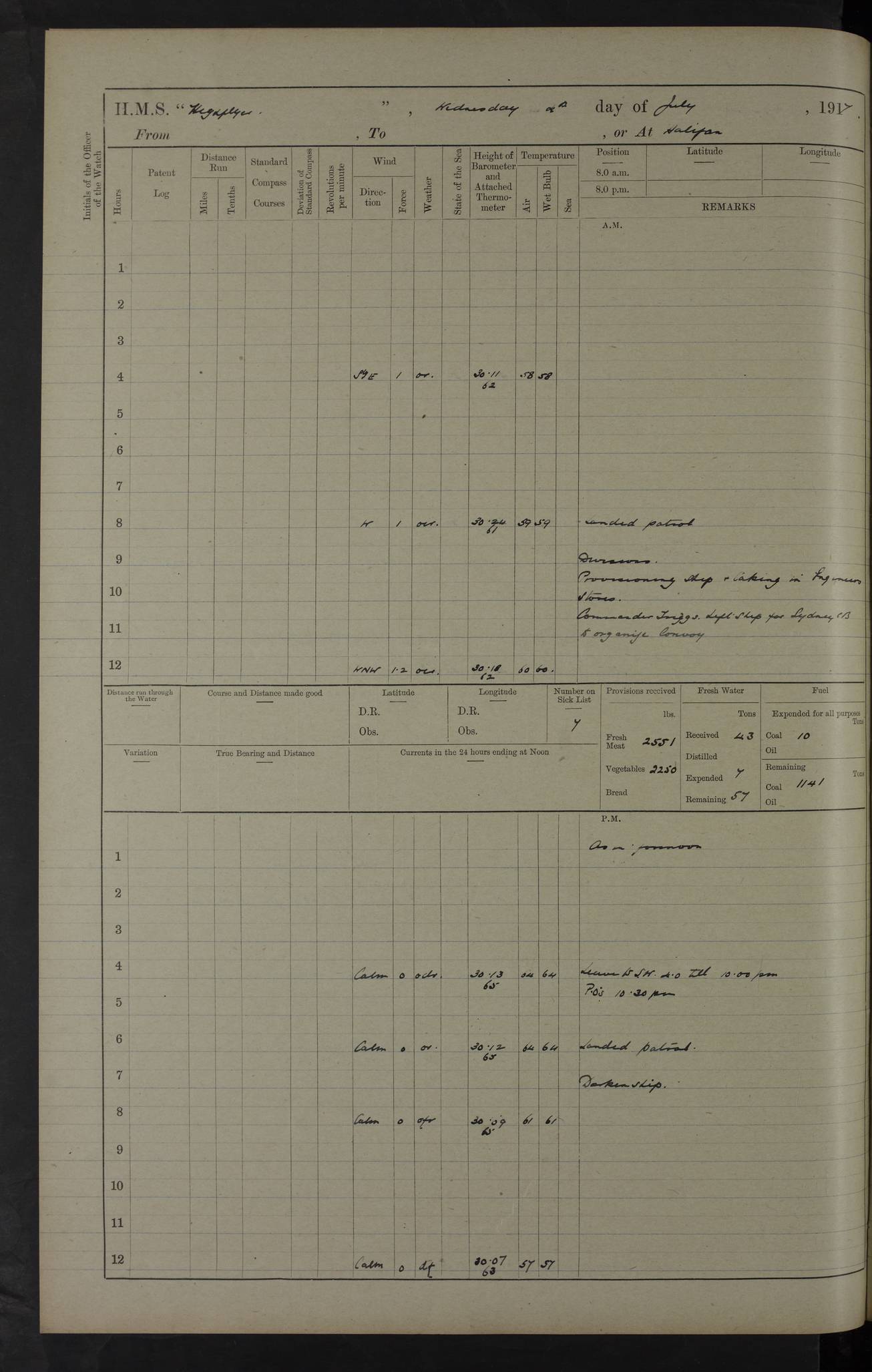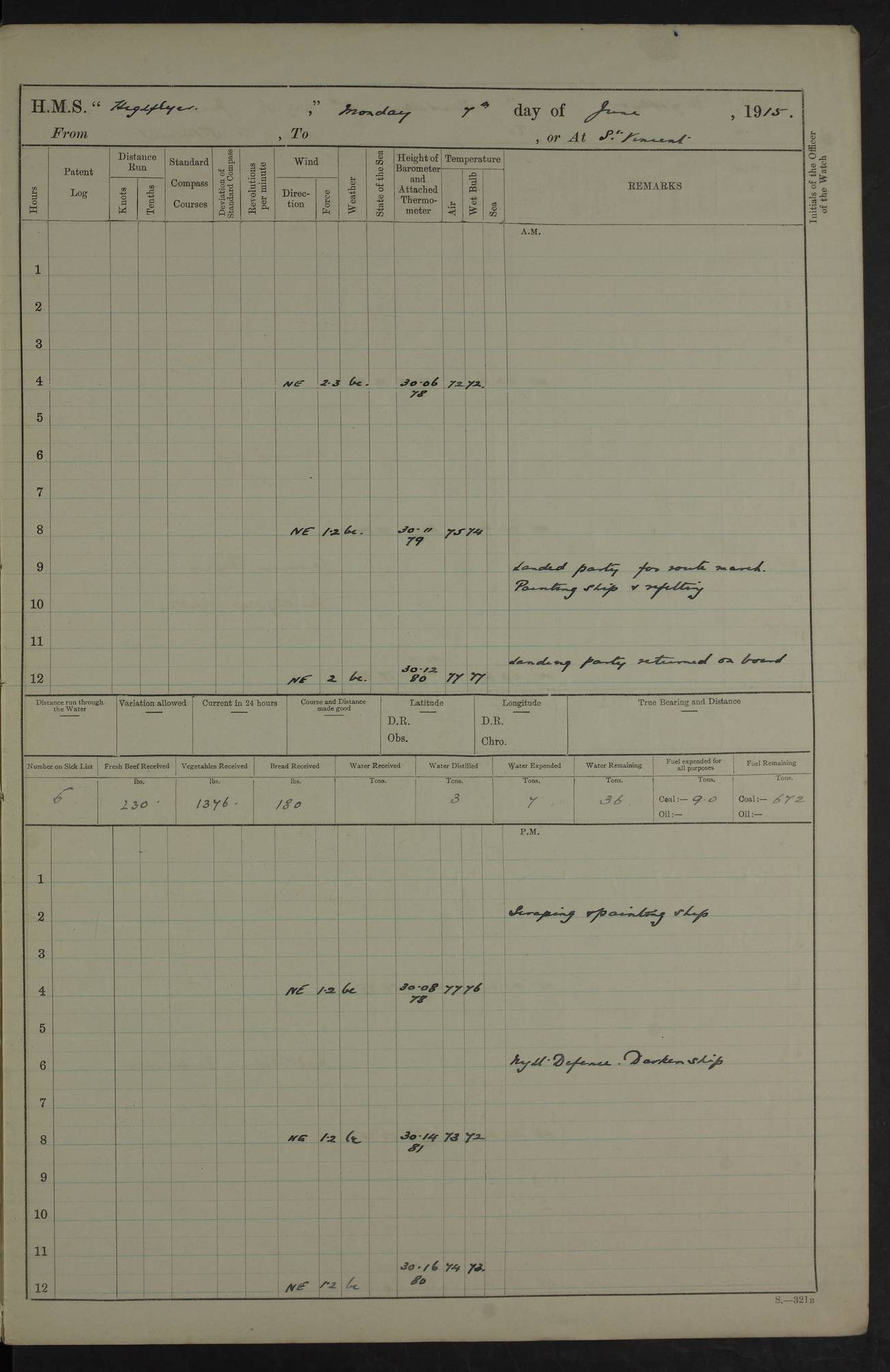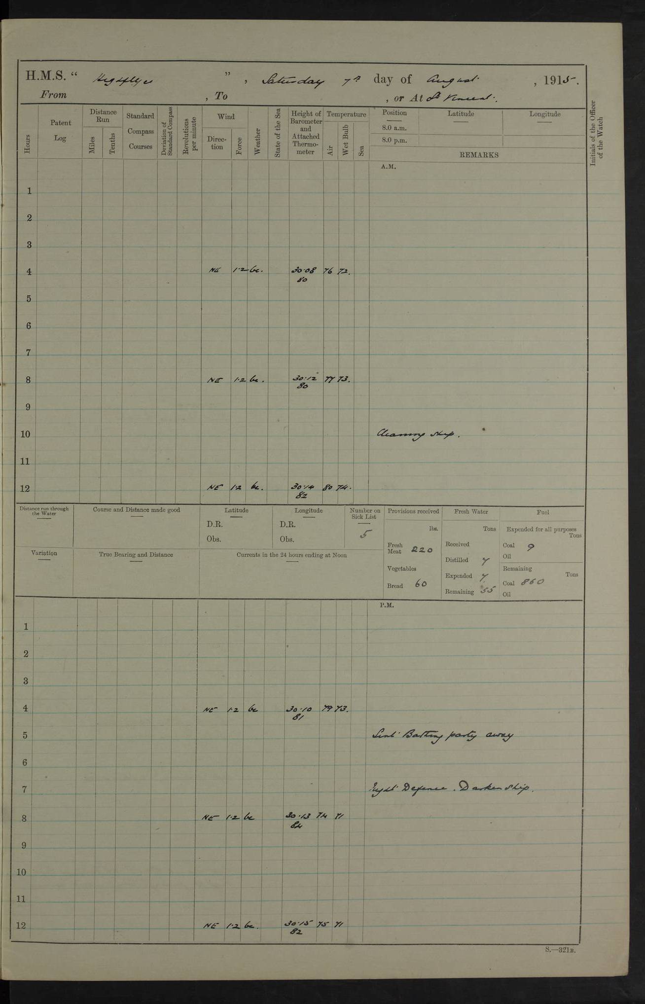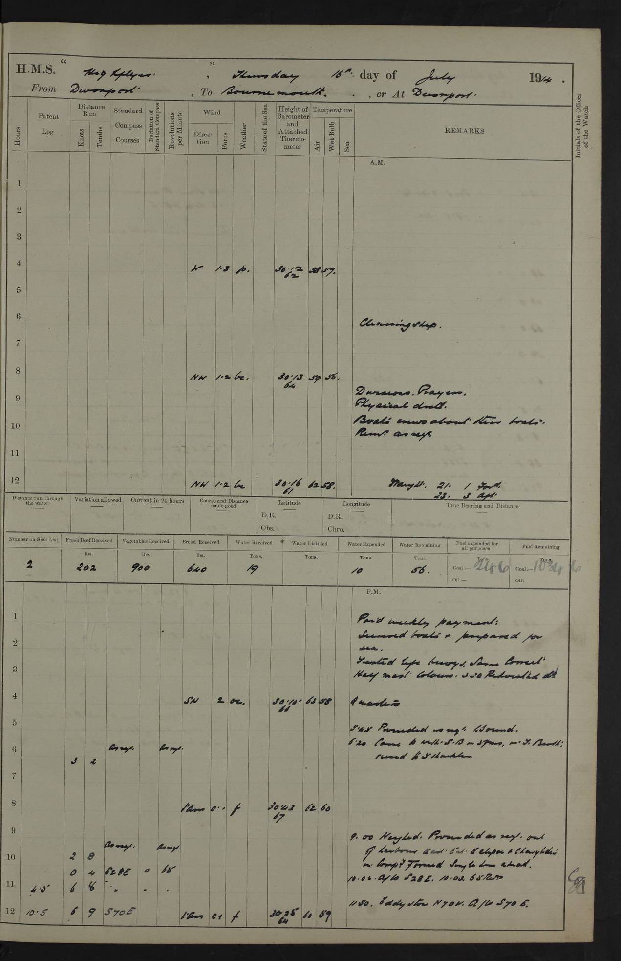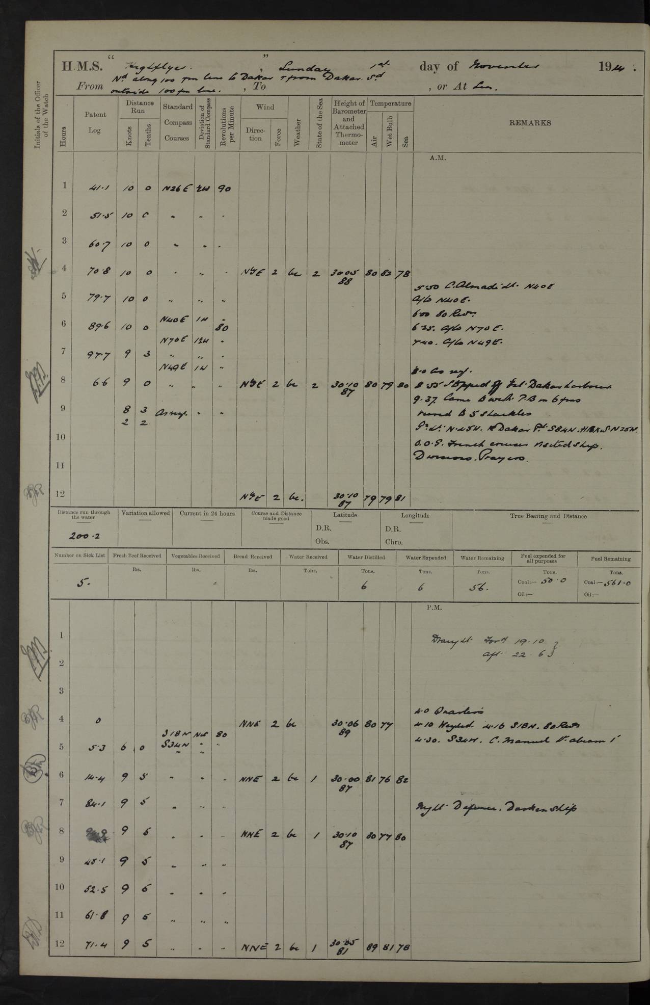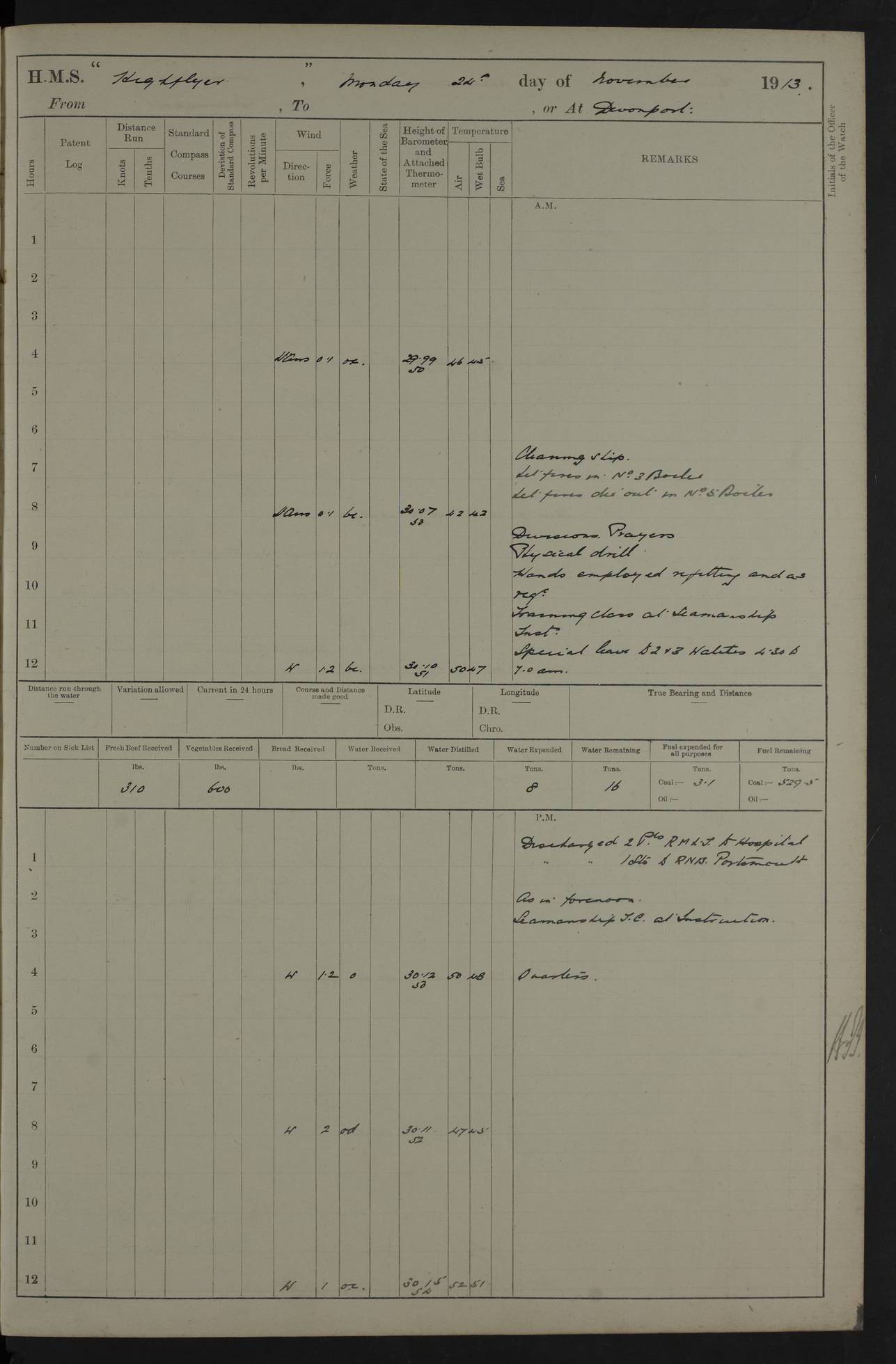 (Maps prepared using Journey Plotter, developed by Maikel. The Plots can only be approximate. They are made by joining-up positions on successive days, and sometimes positions are not given. There will therefore be occasions when the ship appears to have travelled overland) LOG BOOK – JUNE 14TH 1913 TO MAY 31ST 1914 4f960fe4a2fc8e2def00041b: (http://s3.amazonaws.com/oldweather/ADM53-44291/ADM 53-44291-001_0.jpg) 4f960fe5a2fc8e2def00041c: (http://s3.amazonaws.com/oldweather/ADM53-44291/ADM 53-44291-001_1.jpg) 4f960fe5a2fc8e2def00041d: (http://s3.amazonaws.com/oldweather/ADM53-44291/ADM 53-44291-002_0.jpg) 4f960fe5a2fc8e2def00041e: (http://s3.amazonaws.com/oldweather/ADM53-44291/ADM 53-44291-002_1.jpg) LOG of HMS Highflyer Commanded by Captain HT Buller MVO FOR THE PERIOD Commencing Saturday 14th June 1913 Ending Sunday 31st May 1914 Tonnage (displacement): 5600 Extreme length: 350 ft Extreme breadth: 54 ft ENGINES Manufacturer: Fairfield Shipbuilding & Engineering Co, Glasgow IHP: 10.000 Description: Vertical triple expansion 4 cylinders When fixed on board: 1898 BOILERS Manufacturer: Fairfield Shipbuilding & Engineering Co Description: Belleville with economisers 18 in No When made: 1898 When put in vessel: 1898 SCREW PROPELLER Manufacturer: Fairfield Shipbuilding & Engineering Co Description: Twin 3 bladed Admiralty design (bronze) General state of repair: Good 4f960fe6a2fc8e2def00041f: (http://s3.amazonaws.com/oldweather/ADM53-44291/ADM 53-44291-003_0.jpg) [Directions for using the log, figures to indicate the force of the wind and the state of the sea, and letters to denote the state of the weather.] 4f960fe6a2fc8e2def000420: (http://s3.amazonaws.com/oldweather/ADM53-44291/ADM 53-44291-003_1.jpg) Establishment of ship’s company Officers 32 Seamen 164 Boys 24 Marines 50 Engine-room establishment 134 Other non-executive ratings 466 BAROMETER Mercurial or aneroid: Mercurial Name of maker & number: Adie A 577 Height of cistern above sea: 9 feet Thermometers for air temperature Position in ship: Fore bridge Whether in screen: Yes Maker & number: Negretti & Zambra MO/A 9607 dry; from June 14, 1913 to June 1, 1914 MO/A 9603 wet; from June 14, 1913 to June 1, 1914 Thermometer for sea temperature Maker & number: J Hicks A 434; from June 14, 1913 to June 1, 1914 Position of standard compass Fore upper bridge DEVIATION OF STANDARD COMPASS Date obtained: August 29th 1913 Position: Sheerness, No 28 buoy ARMAMENT Fxle: one 6” QF PII S waist: four 6” QF PII P waist: four 6” QF PII OD: two 6” QF PII Battle deck: two 12-pounder 12-cwt SII S waist: three 12-pounder 12-cwt SII P waist: three 12-pounder 12-cwt SII AS deck: 3-pounder QF (Hotchkiss) P waist: 12-pounder 8-cwt field gun Torpedo armament 2 18” tubes BOATS 2 pinnaces, 36 ft sailing 2 cutters 1 gig, 30 ft 1 whaler 1 steam cutter, 32 ft MISCELLANEOUS INFORMATION Draught of water with bunkers full, and complete with provisions, stores and water: forward 22 ft 0 in, aft 23 ft 2 in Load draught, 600 tons coal: forward 19 ft 6 in, aft 21 ft 6 in Number of tons necessary to increase draught 1 inch: 31.5 Number of tons of coal carried (43 cubic feet per ton): a) At load draught, 600 b) With bunkers full, 1132 c) In places other than bunkers, nil Quantity of water carried: a) For boilers, 207 tons b) For drinking 60 tons THE VOYAGES OF HMS HIGHFLYER 1913-1914