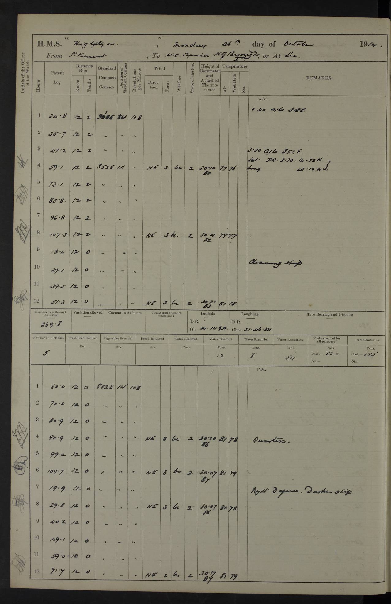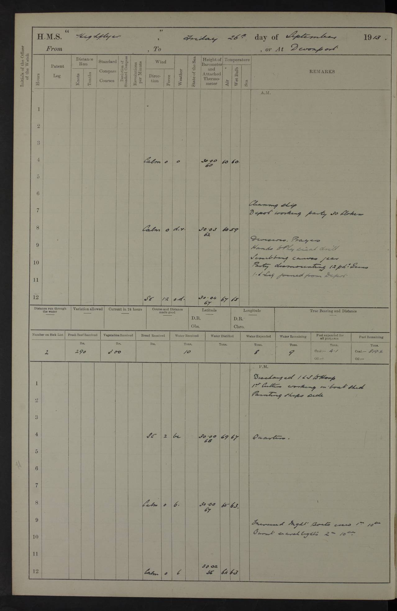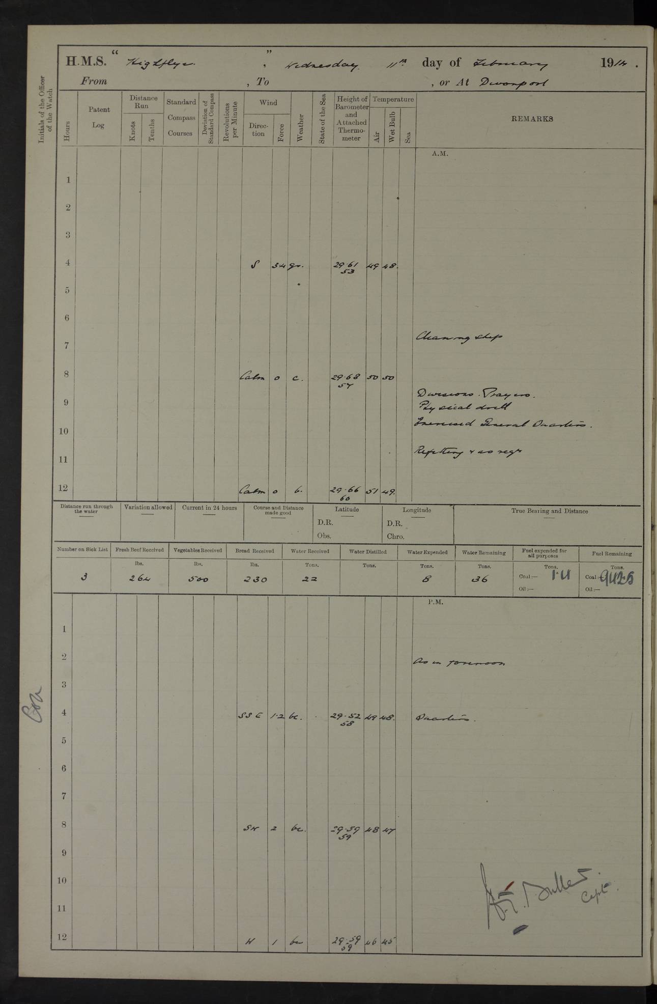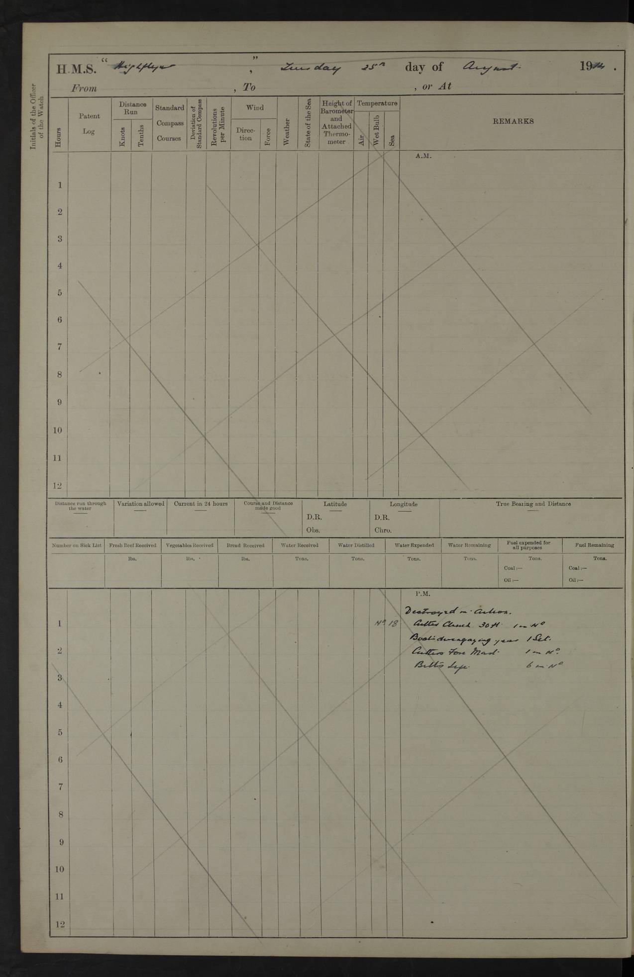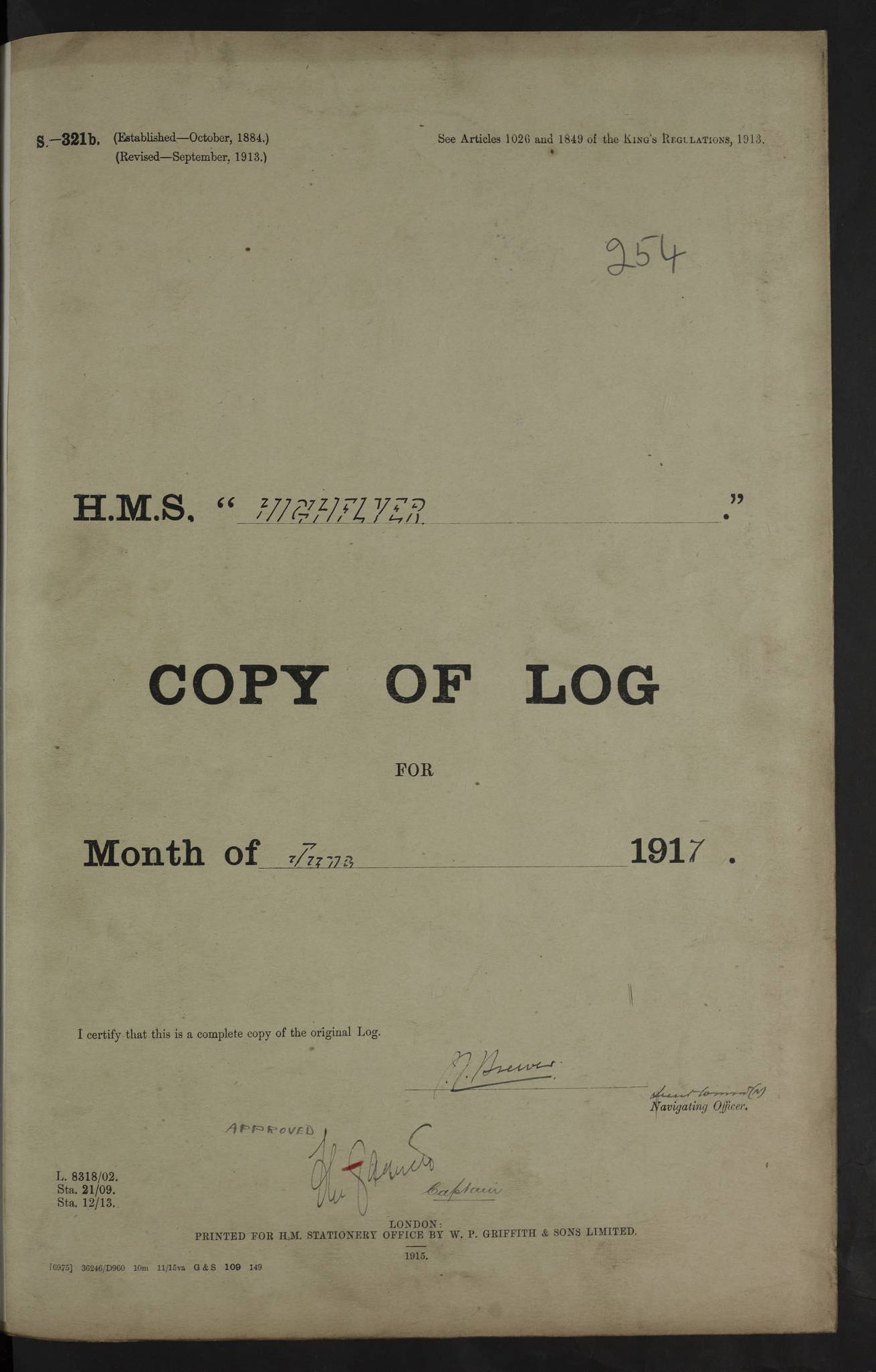 (Maps prepared using Journey Plotter, developed by Maikel. The Plots can only be approximate. They are made by joining-up positions on successive days, and sometimes positions are not given. There will therefore be occasions when the ship appears to have travelled overland) LOG BOOK – JUNE 14TH 1913 TO MAY 31ST 1914 4f960fe4a2fc8e2def00041b: (http://s3.amazonaws.com/oldweather/ADM53-44291/ADM 53-44291-001_0.jpg) 4f960fe5a2fc8e2def00041c: (http://s3.amazonaws.com/oldweather/ADM53-44291/ADM 53-44291-001_1.jpg) 4f960fe5a2fc8e2def00041d: (http://s3.amazonaws.com/oldweather/ADM53-44291/ADM 53-44291-002_0.jpg) 4f960fe5a2fc8e2def00041e: (http://s3.amazonaws.com/oldweather/ADM53-44291/ADM 53-44291-002_1.jpg) LOG of HMS Highflyer Commanded by Captain HT Buller MVO FOR THE PERIOD Commencing Saturday 14th June 1913 Ending Sunday 31st May 1914 Tonnage (displacement): 5600 Extreme length: 350 ft Extreme breadth: 54 ft ENGINES Manufacturer: Fairfield Shipbuilding & Engineering Co, Glasgow IHP: 10.000 Description: Vertical triple expansion 4 cylinders When fixed on board: 1898 BOILERS Manufacturer: Fairfield Shipbuilding & Engineering Co Description: Belleville with economisers 18 in No When made: 1898 When put in vessel: 1898 SCREW PROPELLER Manufacturer: Fairfield Shipbuilding & Engineering Co Description: Twin 3 bladed Admiralty design (bronze) General state of repair: Good 4f960fe6a2fc8e2def00041f: (http://s3.amazonaws.com/oldweather/ADM53-44291/ADM 53-44291-003_0.jpg) [Directions for using the log, figures to indicate the force of the wind and the state of the sea, and letters to denote the state of the weather.] 4f960fe6a2fc8e2def000420: (http://s3.amazonaws.com/oldweather/ADM53-44291/ADM 53-44291-003_1.jpg) Establishment of ship’s company Officers 32 Seamen 164 Boys 24 Marines 50 Engine-room establishment 134 Other non-executive ratings 466 BAROMETER Mercurial or aneroid: Mercurial Name of maker & number: Adie A 577 Height of cistern above sea: 9 feet Thermometers for air temperature Position in ship: Fore bridge Whether in screen: Yes Maker & number: Negretti & Zambra MO/A 9607 dry; from June 14, 1913 to June 1, 1914 MO/A 9603 wet; from June 14, 1913 to June 1, 1914 Thermometer for sea temperature Maker & number: J Hicks A 434; from June 14, 1913 to June 1, 1914 Position of standard compass Fore upper bridge DEVIATION OF STANDARD COMPASS Date obtained: August 29th 1913 Position: Sheerness, No 28 buoy ARMAMENT Fxle: one 6” QF PII S waist: four 6” QF PII P waist: four 6” QF PII OD: two 6” QF PII Battle deck: two 12-pounder 12-cwt SII S waist: three 12-pounder 12-cwt SII P waist: three 12-pounder 12-cwt SII AS deck: 3-pounder QF (Hotchkiss) P waist: 12-pounder 8-cwt field gun Torpedo armament 2 18” tubes BOATS 2 pinnaces, 36 ft sailing 2 cutters 1 gig, 30 ft 1 whaler 1 steam cutter, 32 ft MISCELLANEOUS INFORMATION Draught of water with bunkers full, and complete with provisions, stores and water: forward 22 ft 0 in, aft 23 ft 2 in Load draught, 600 tons coal: forward 19 ft 6 in, aft 21 ft 6 in Number of tons necessary to increase draught 1 inch: 31.5 Number of tons of coal carried (43 cubic feet per ton): a) At load draught, 600 b) With bunkers full, 1132 c) In places other than bunkers, nil Quantity of water carried: a) For boilers, 207 tons b) For drinking 60 tons THE VOYAGES OF HMS HIGHFLYER 1913-1914