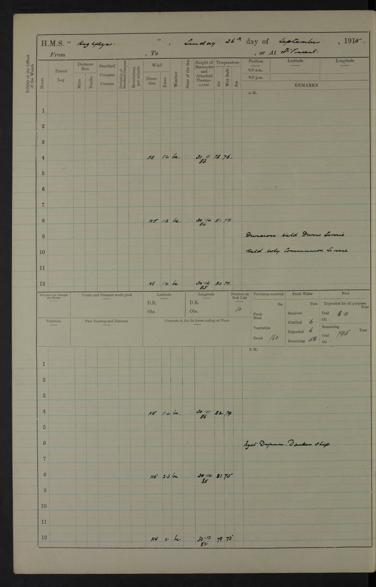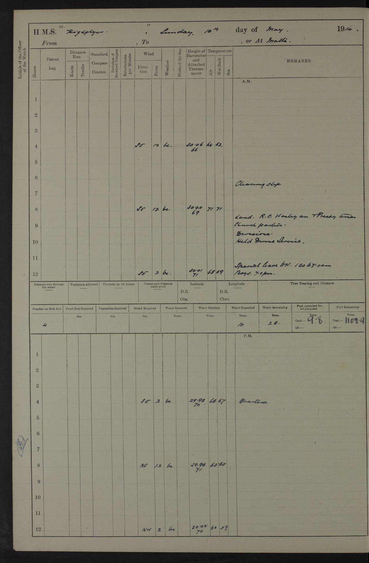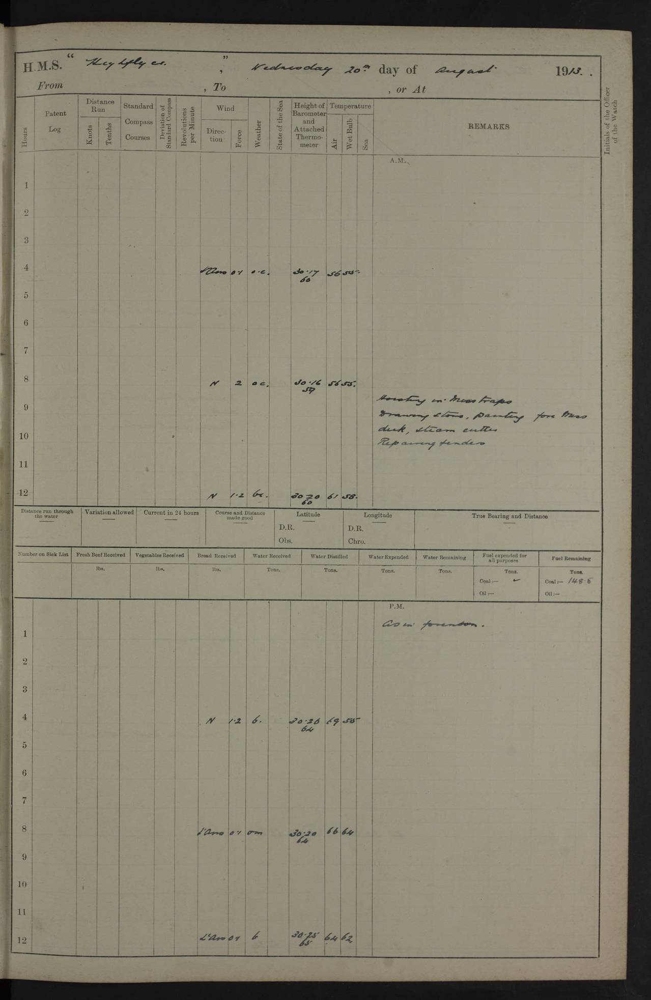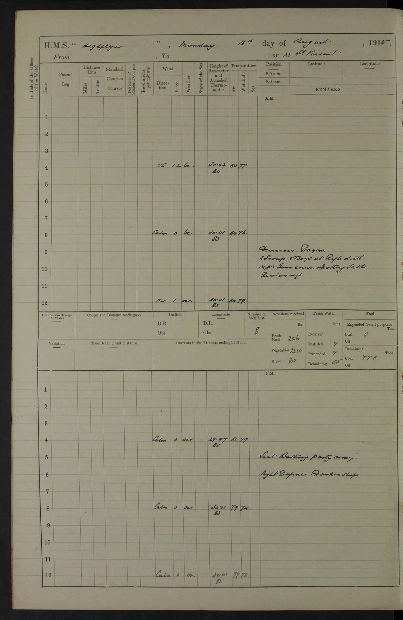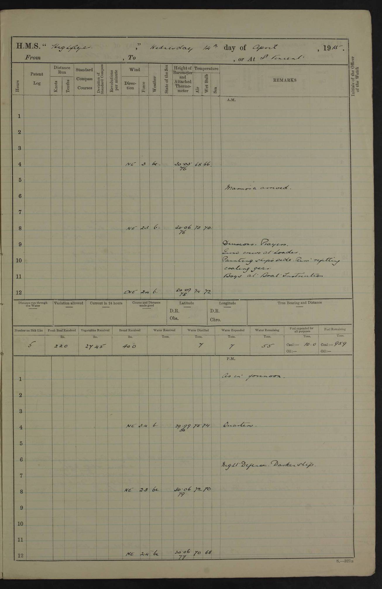 (Maps prepared using Journey Plotter, developed by Maikel. The Plots can only be approximate. They are made by joining-up positions on successive days, and sometimes positions are not given. There will therefore be occasions when the ship appears to have travelled overland) LOG BOOK – JUNE 14TH 1913 TO MAY 31ST 1914 4f960fe4a2fc8e2def00041b: (http://s3.amazonaws.com/oldweather/ADM53-44291/ADM 53-44291-001_0.jpg) 4f960fe5a2fc8e2def00041c: (http://s3.amazonaws.com/oldweather/ADM53-44291/ADM 53-44291-001_1.jpg) 4f960fe5a2fc8e2def00041d: (http://s3.amazonaws.com/oldweather/ADM53-44291/ADM 53-44291-002_0.jpg) 4f960fe5a2fc8e2def00041e: (http://s3.amazonaws.com/oldweather/ADM53-44291/ADM 53-44291-002_1.jpg) LOG of HMS Highflyer Commanded by Captain HT Buller MVO FOR THE PERIOD Commencing Saturday 14th June 1913 Ending Sunday 31st May 1914 Tonnage (displacement): 5600 Extreme length: 350 ft Extreme breadth: 54 ft ENGINES Manufacturer: Fairfield Shipbuilding & Engineering Co, Glasgow IHP: 10.000 Description: Vertical triple expansion 4 cylinders When fixed on board: 1898 BOILERS Manufacturer: Fairfield Shipbuilding & Engineering Co Description: Belleville with economisers 18 in No When made: 1898 When put in vessel: 1898 SCREW PROPELLER Manufacturer: Fairfield Shipbuilding & Engineering Co Description: Twin 3 bladed Admiralty design (bronze) General state of repair: Good 4f960fe6a2fc8e2def00041f: (http://s3.amazonaws.com/oldweather/ADM53-44291/ADM 53-44291-003_0.jpg) [Directions for using the log, figures to indicate the force of the wind and the state of the sea, and letters to denote the state of the weather.] 4f960fe6a2fc8e2def000420: (http://s3.amazonaws.com/oldweather/ADM53-44291/ADM 53-44291-003_1.jpg) Establishment of ship’s company Officers 32 Seamen 164 Boys 24 Marines 50 Engine-room establishment 134 Other non-executive ratings 466 BAROMETER Mercurial or aneroid: Mercurial Name of maker & number: Adie A 577 Height of cistern above sea: 9 feet Thermometers for air temperature Position in ship: Fore bridge Whether in screen: Yes Maker & number: Negretti & Zambra MO/A 9607 dry; from June 14, 1913 to June 1, 1914 MO/A 9603 wet; from June 14, 1913 to June 1, 1914 Thermometer for sea temperature Maker & number: J Hicks A 434; from June 14, 1913 to June 1, 1914 Position of standard compass Fore upper bridge DEVIATION OF STANDARD COMPASS Date obtained: August 29th 1913 Position: Sheerness, No 28 buoy ARMAMENT Fxle: one 6” QF PII S waist: four 6” QF PII P waist: four 6” QF PII OD: two 6” QF PII Battle deck: two 12-pounder 12-cwt SII S waist: three 12-pounder 12-cwt SII P waist: three 12-pounder 12-cwt SII AS deck: 3-pounder QF (Hotchkiss) P waist: 12-pounder 8-cwt field gun Torpedo armament 2 18” tubes BOATS 2 pinnaces, 36 ft sailing 2 cutters 1 gig, 30 ft 1 whaler 1 steam cutter, 32 ft MISCELLANEOUS INFORMATION Draught of water with bunkers full, and complete with provisions, stores and water: forward 22 ft 0 in, aft 23 ft 2 in Load draught, 600 tons coal: forward 19 ft 6 in, aft 21 ft 6 in Number of tons necessary to increase draught 1 inch: 31.5 Number of tons of coal carried (43 cubic feet per ton): a) At load draught, 600 b) With bunkers full, 1132 c) In places other than bunkers, nil Quantity of water carried: a) For boilers, 207 tons b) For drinking 60 tons THE VOYAGES OF HMS HIGHFLYER 1913-1914