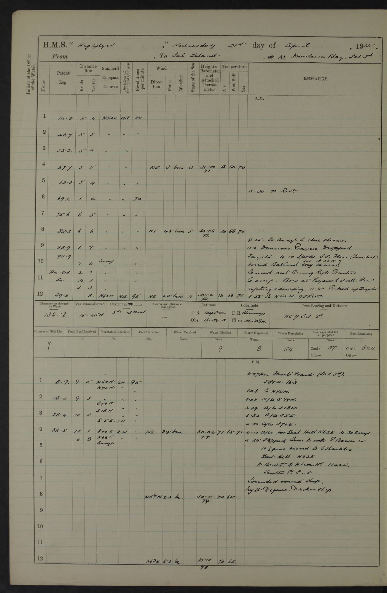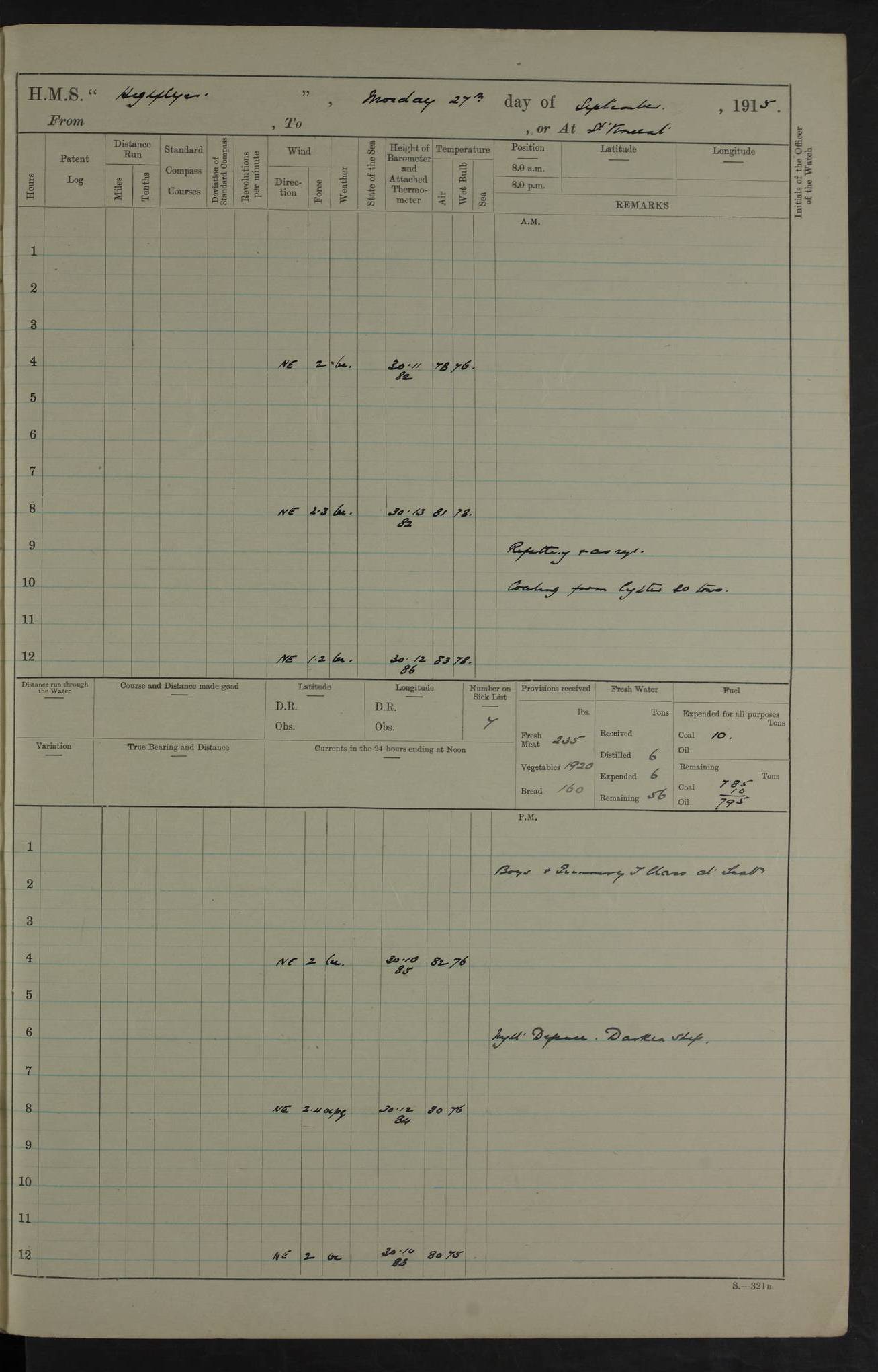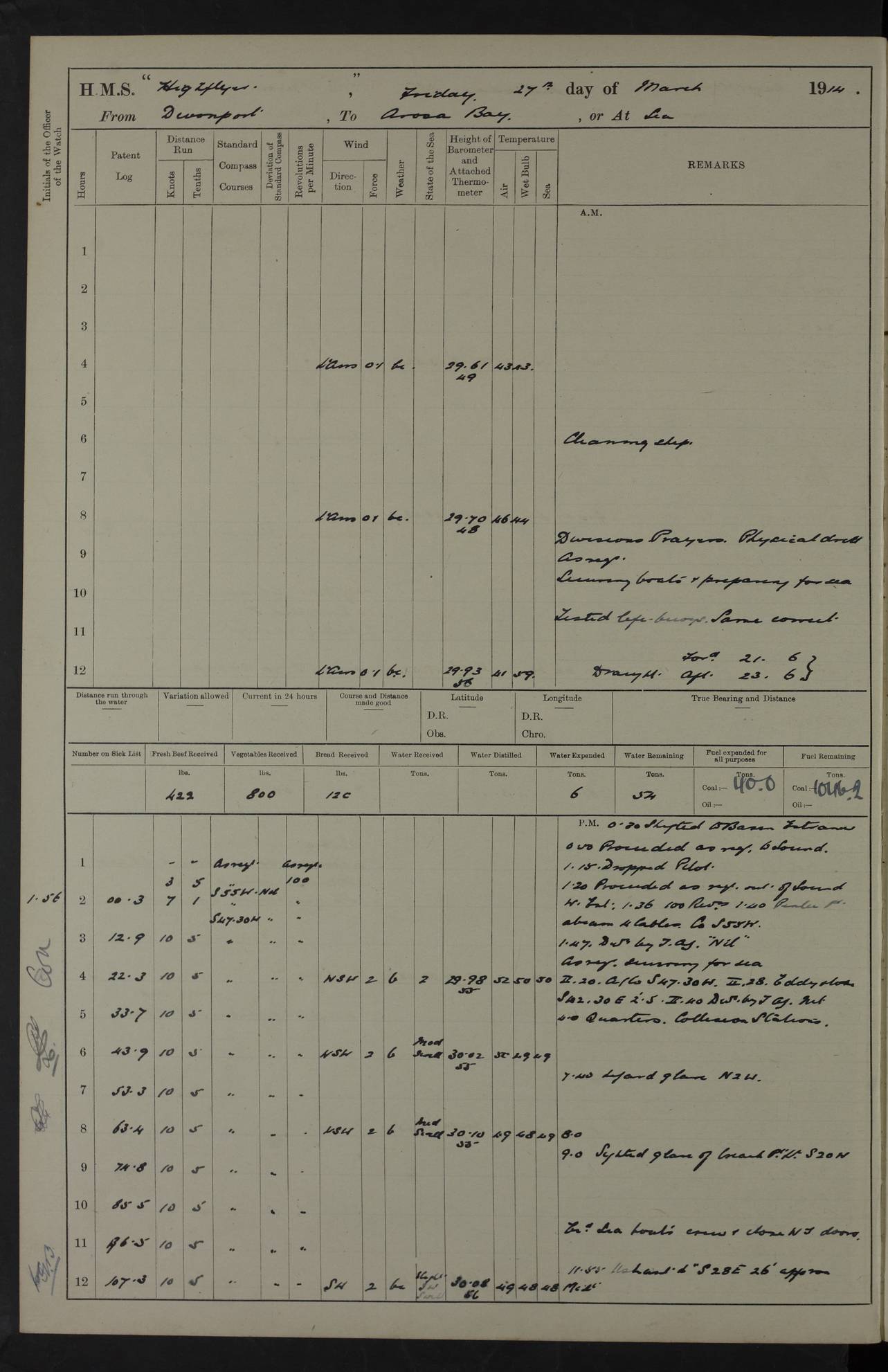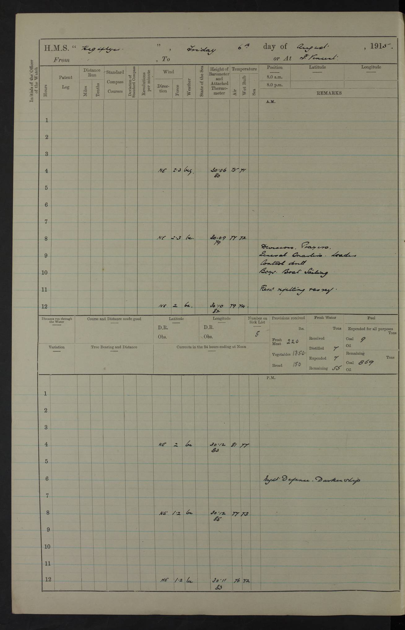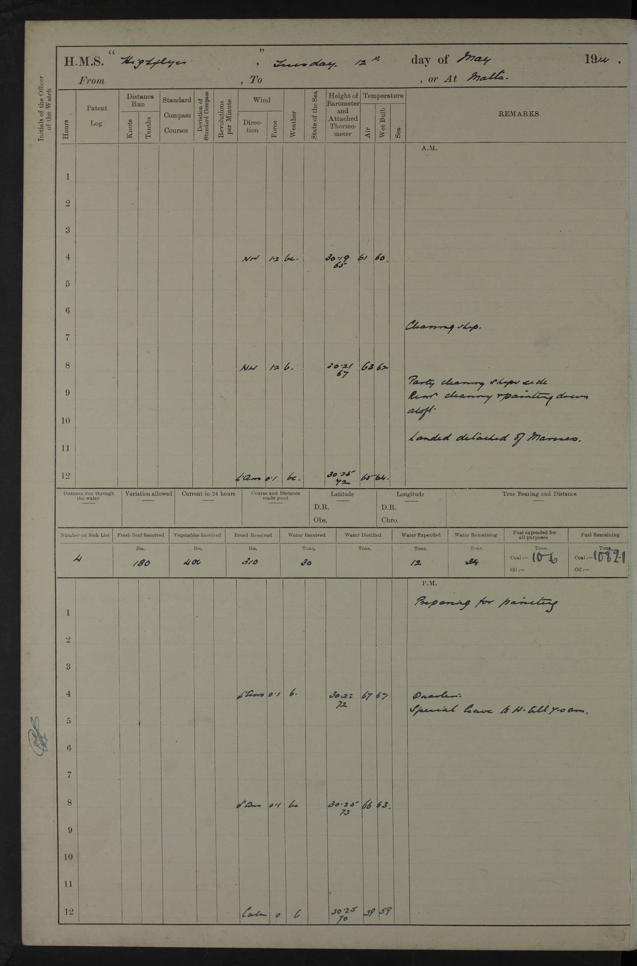 (Maps prepared using Journey Plotter, developed by Maikel. The Plots can only be approximate. They are made by joining-up positions on successive days, and sometimes positions are not given. There will therefore be occasions when the ship appears to have travelled overland) LOG BOOK – JUNE 14TH 1913 TO MAY 31ST 1914 4f960fe4a2fc8e2def00041b: (http://s3.amazonaws.com/oldweather/ADM53-44291/ADM 53-44291-001_0.jpg) 4f960fe5a2fc8e2def00041c: (http://s3.amazonaws.com/oldweather/ADM53-44291/ADM 53-44291-001_1.jpg) 4f960fe5a2fc8e2def00041d: (http://s3.amazonaws.com/oldweather/ADM53-44291/ADM 53-44291-002_0.jpg) 4f960fe5a2fc8e2def00041e: (http://s3.amazonaws.com/oldweather/ADM53-44291/ADM 53-44291-002_1.jpg) LOG of HMS Highflyer Commanded by Captain HT Buller MVO FOR THE PERIOD Commencing Saturday 14th June 1913 Ending Sunday 31st May 1914 Tonnage (displacement): 5600 Extreme length: 350 ft Extreme breadth: 54 ft ENGINES Manufacturer: Fairfield Shipbuilding & Engineering Co, Glasgow IHP: 10.000 Description: Vertical triple expansion 4 cylinders When fixed on board: 1898 BOILERS Manufacturer: Fairfield Shipbuilding & Engineering Co Description: Belleville with economisers 18 in No When made: 1898 When put in vessel: 1898 SCREW PROPELLER Manufacturer: Fairfield Shipbuilding & Engineering Co Description: Twin 3 bladed Admiralty design (bronze) General state of repair: Good 4f960fe6a2fc8e2def00041f: (http://s3.amazonaws.com/oldweather/ADM53-44291/ADM 53-44291-003_0.jpg) [Directions for using the log, figures to indicate the force of the wind and the state of the sea, and letters to denote the state of the weather.] 4f960fe6a2fc8e2def000420: (http://s3.amazonaws.com/oldweather/ADM53-44291/ADM 53-44291-003_1.jpg) Establishment of ship’s company Officers 32 Seamen 164 Boys 24 Marines 50 Engine-room establishment 134 Other non-executive ratings 466 BAROMETER Mercurial or aneroid: Mercurial Name of maker & number: Adie A 577 Height of cistern above sea: 9 feet Thermometers for air temperature Position in ship: Fore bridge Whether in screen: Yes Maker & number: Negretti & Zambra MO/A 9607 dry; from June 14, 1913 to June 1, 1914 MO/A 9603 wet; from June 14, 1913 to June 1, 1914 Thermometer for sea temperature Maker & number: J Hicks A 434; from June 14, 1913 to June 1, 1914 Position of standard compass Fore upper bridge DEVIATION OF STANDARD COMPASS Date obtained: August 29th 1913 Position: Sheerness, No 28 buoy ARMAMENT Fxle: one 6” QF PII S waist: four 6” QF PII P waist: four 6” QF PII OD: two 6” QF PII Battle deck: two 12-pounder 12-cwt SII S waist: three 12-pounder 12-cwt SII P waist: three 12-pounder 12-cwt SII AS deck: 3-pounder QF (Hotchkiss) P waist: 12-pounder 8-cwt field gun Torpedo armament 2 18” tubes BOATS 2 pinnaces, 36 ft sailing 2 cutters 1 gig, 30 ft 1 whaler 1 steam cutter, 32 ft MISCELLANEOUS INFORMATION Draught of water with bunkers full, and complete with provisions, stores and water: forward 22 ft 0 in, aft 23 ft 2 in Load draught, 600 tons coal: forward 19 ft 6 in, aft 21 ft 6 in Number of tons necessary to increase draught 1 inch: 31.5 Number of tons of coal carried (43 cubic feet per ton): a) At load draught, 600 b) With bunkers full, 1132 c) In places other than bunkers, nil Quantity of water carried: a) For boilers, 207 tons b) For drinking 60 tons THE VOYAGES OF HMS HIGHFLYER 1913-1914