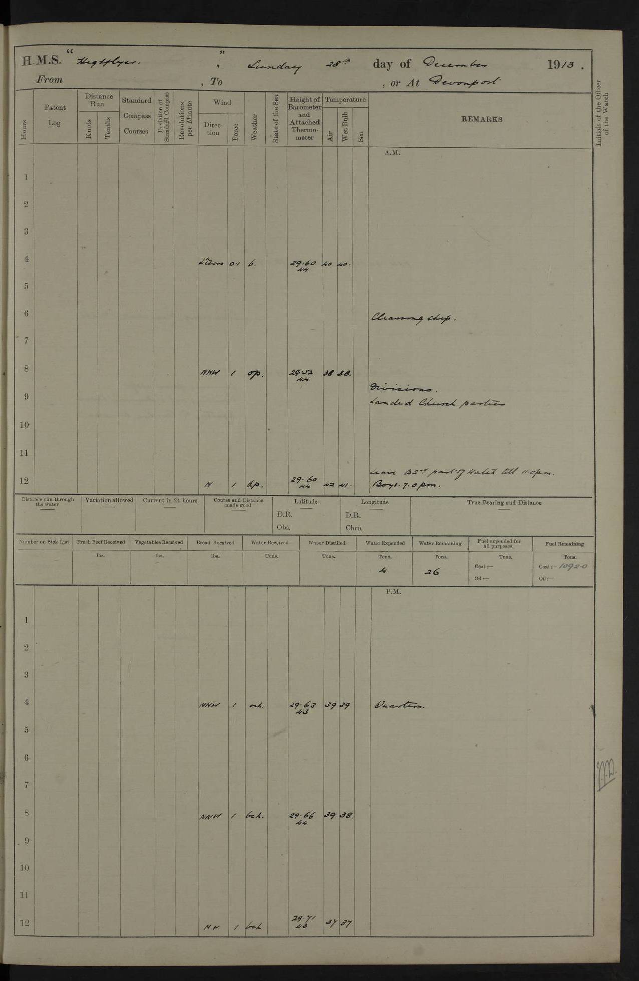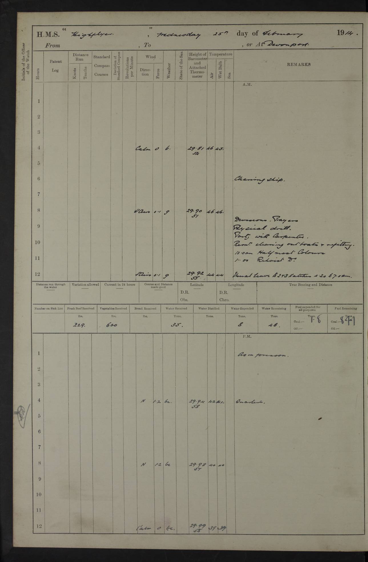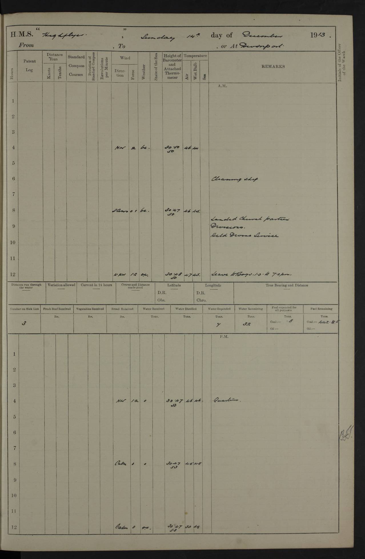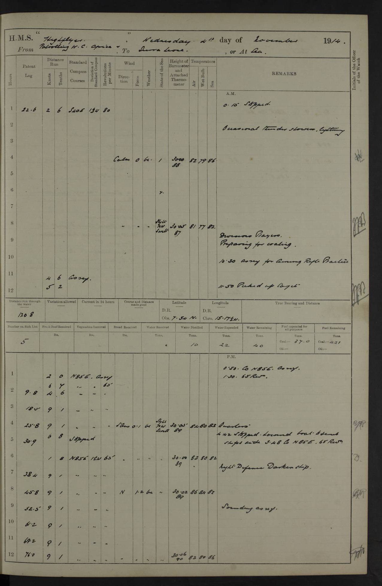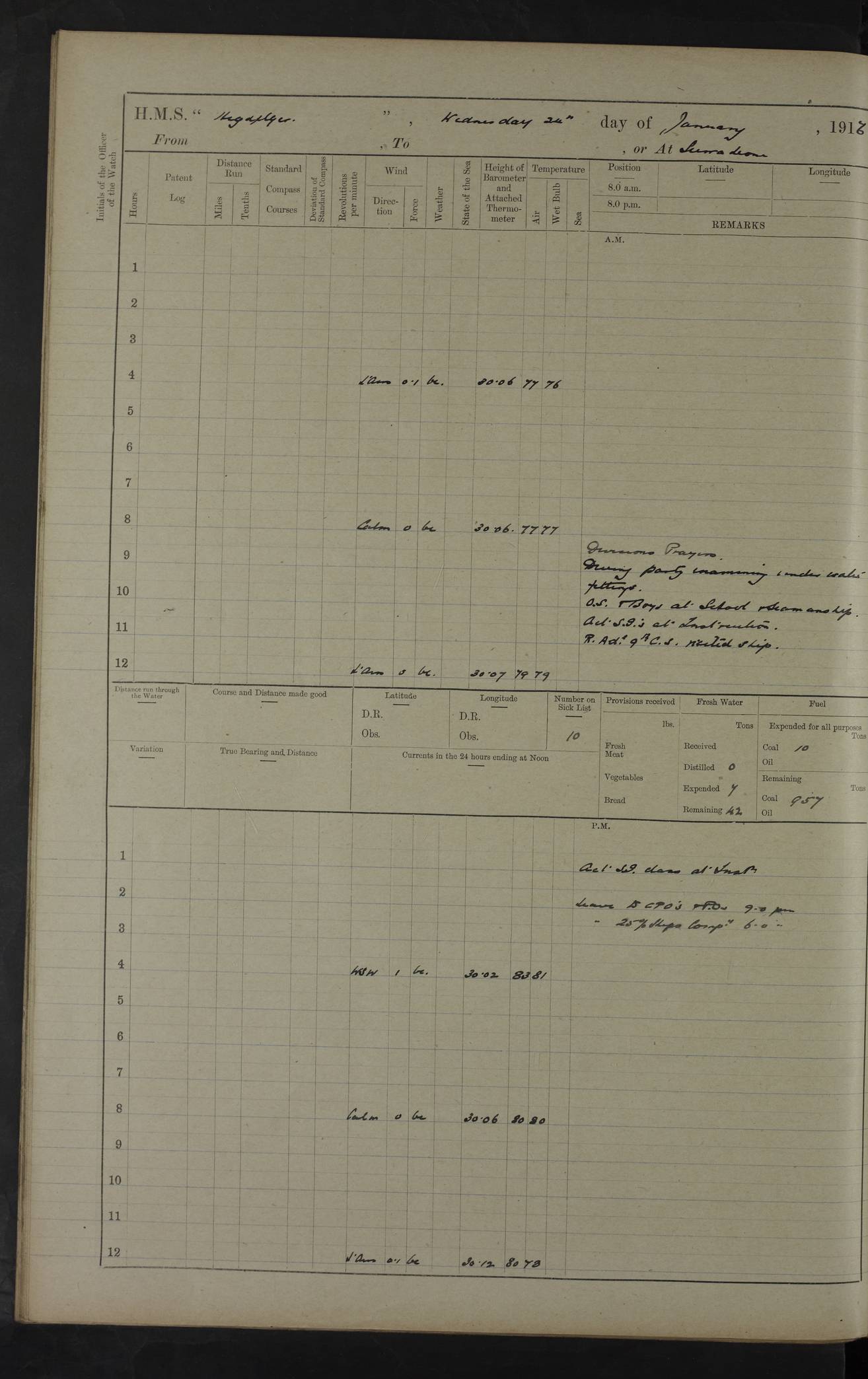 (Maps prepared using Journey Plotter, developed by Maikel. The Plots can only be approximate. They are made by joining-up positions on successive days, and sometimes positions are not given. There will therefore be occasions when the ship appears to have travelled overland) LOG BOOK – JUNE 14TH 1913 TO MAY 31ST 1914 4f960fe4a2fc8e2def00041b: (http://s3.amazonaws.com/oldweather/ADM53-44291/ADM 53-44291-001_0.jpg) 4f960fe5a2fc8e2def00041c: (http://s3.amazonaws.com/oldweather/ADM53-44291/ADM 53-44291-001_1.jpg) 4f960fe5a2fc8e2def00041d: (http://s3.amazonaws.com/oldweather/ADM53-44291/ADM 53-44291-002_0.jpg) 4f960fe5a2fc8e2def00041e: (http://s3.amazonaws.com/oldweather/ADM53-44291/ADM 53-44291-002_1.jpg) LOG of HMS Highflyer Commanded by Captain HT Buller MVO FOR THE PERIOD Commencing Saturday 14th June 1913 Ending Sunday 31st May 1914 Tonnage (displacement): 5600 Extreme length: 350 ft Extreme breadth: 54 ft ENGINES Manufacturer: Fairfield Shipbuilding & Engineering Co, Glasgow IHP: 10.000 Description: Vertical triple expansion 4 cylinders When fixed on board: 1898 BOILERS Manufacturer: Fairfield Shipbuilding & Engineering Co Description: Belleville with economisers 18 in No When made: 1898 When put in vessel: 1898 SCREW PROPELLER Manufacturer: Fairfield Shipbuilding & Engineering Co Description: Twin 3 bladed Admiralty design (bronze) General state of repair: Good 4f960fe6a2fc8e2def00041f: (http://s3.amazonaws.com/oldweather/ADM53-44291/ADM 53-44291-003_0.jpg) [Directions for using the log, figures to indicate the force of the wind and the state of the sea, and letters to denote the state of the weather.] 4f960fe6a2fc8e2def000420: (http://s3.amazonaws.com/oldweather/ADM53-44291/ADM 53-44291-003_1.jpg) Establishment of ship’s company Officers 32 Seamen 164 Boys 24 Marines 50 Engine-room establishment 134 Other non-executive ratings 466 BAROMETER Mercurial or aneroid: Mercurial Name of maker & number: Adie A 577 Height of cistern above sea: 9 feet Thermometers for air temperature Position in ship: Fore bridge Whether in screen: Yes Maker & number: Negretti & Zambra MO/A 9607 dry; from June 14, 1913 to June 1, 1914 MO/A 9603 wet; from June 14, 1913 to June 1, 1914 Thermometer for sea temperature Maker & number: J Hicks A 434; from June 14, 1913 to June 1, 1914 Position of standard compass Fore upper bridge DEVIATION OF STANDARD COMPASS Date obtained: August 29th 1913 Position: Sheerness, No 28 buoy ARMAMENT Fxle: one 6” QF PII S waist: four 6” QF PII P waist: four 6” QF PII OD: two 6” QF PII Battle deck: two 12-pounder 12-cwt SII S waist: three 12-pounder 12-cwt SII P waist: three 12-pounder 12-cwt SII AS deck: 3-pounder QF (Hotchkiss) P waist: 12-pounder 8-cwt field gun Torpedo armament 2 18” tubes BOATS 2 pinnaces, 36 ft sailing 2 cutters 1 gig, 30 ft 1 whaler 1 steam cutter, 32 ft MISCELLANEOUS INFORMATION Draught of water with bunkers full, and complete with provisions, stores and water: forward 22 ft 0 in, aft 23 ft 2 in Load draught, 600 tons coal: forward 19 ft 6 in, aft 21 ft 6 in Number of tons necessary to increase draught 1 inch: 31.5 Number of tons of coal carried (43 cubic feet per ton): a) At load draught, 600 b) With bunkers full, 1132 c) In places other than bunkers, nil Quantity of water carried: a) For boilers, 207 tons b) For drinking 60 tons THE VOYAGES OF HMS HIGHFLYER 1913-1914