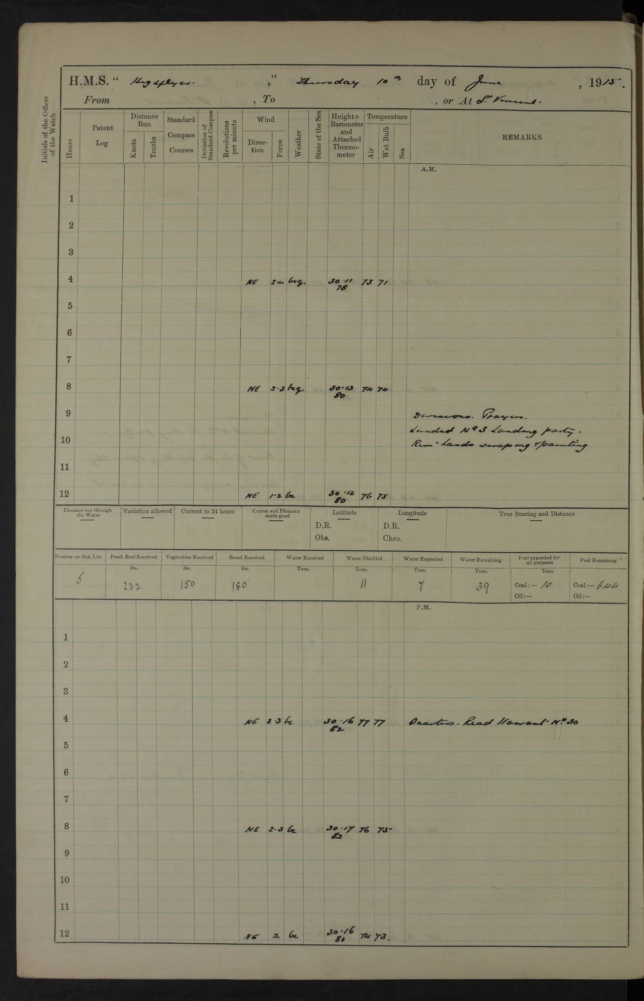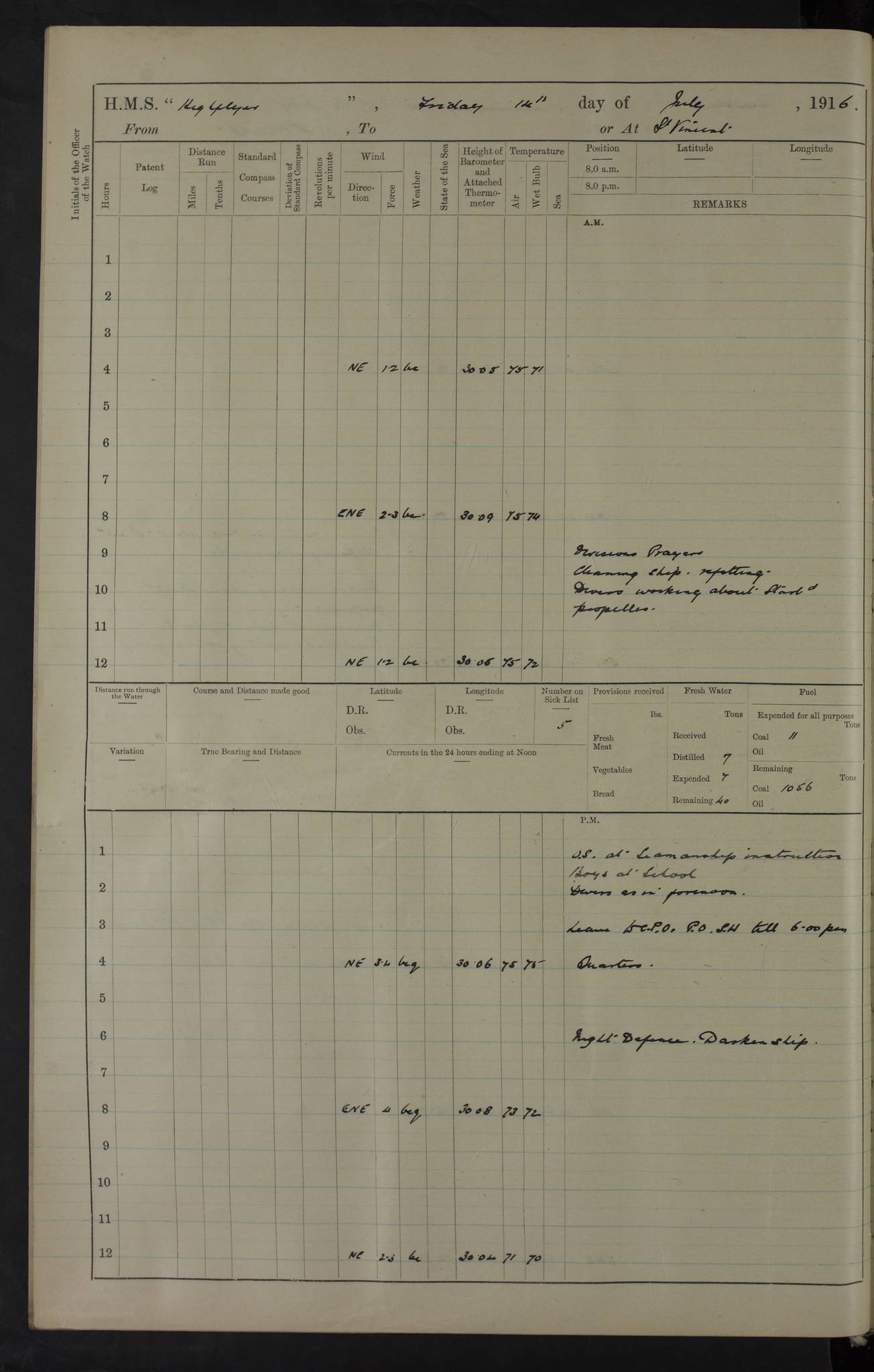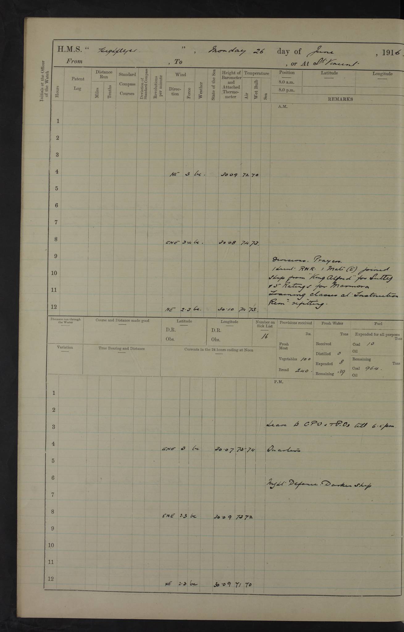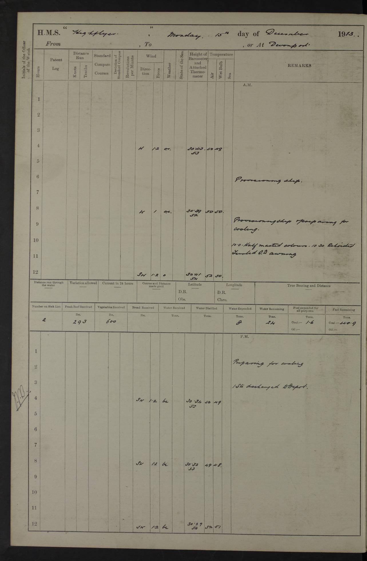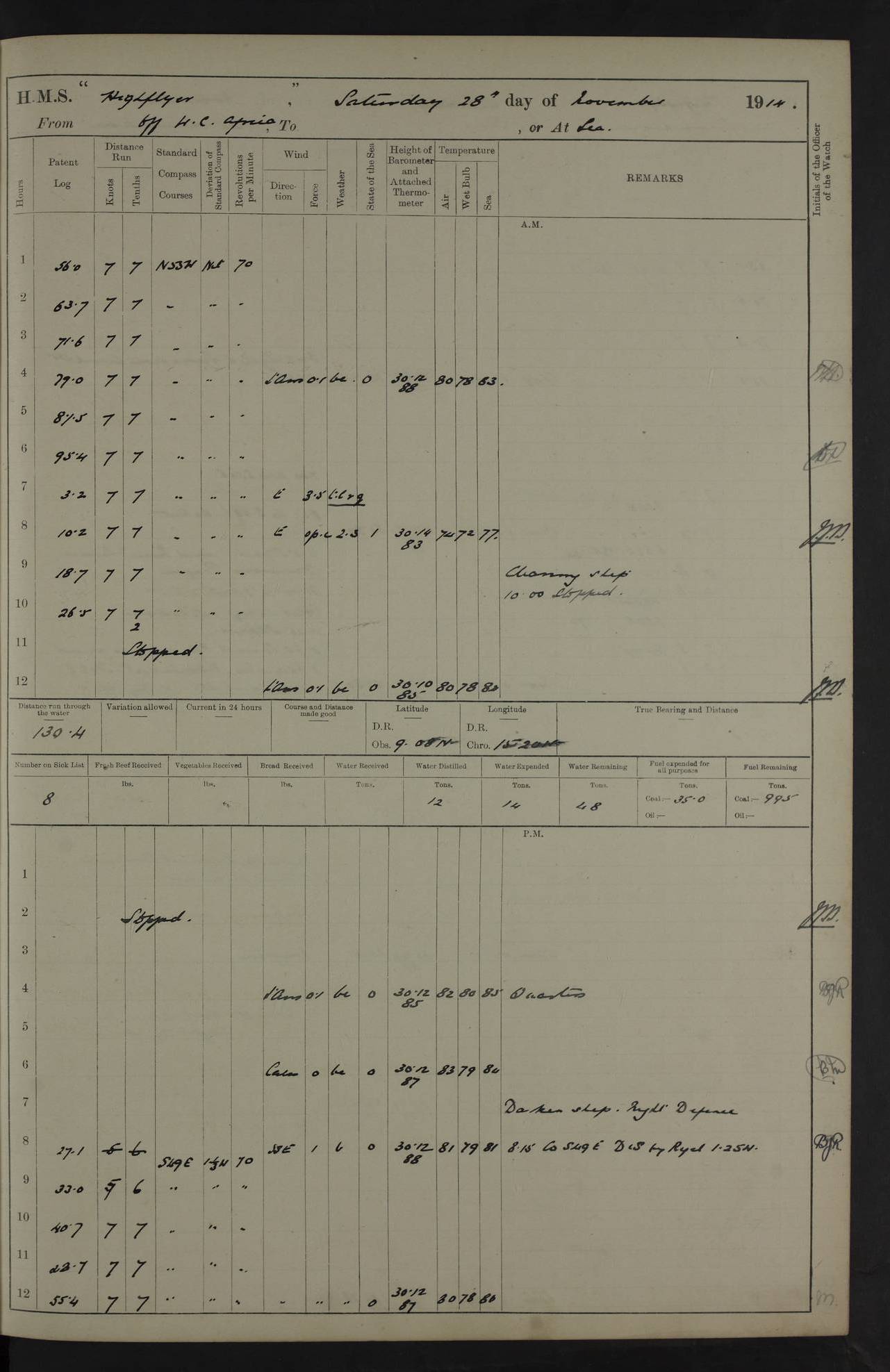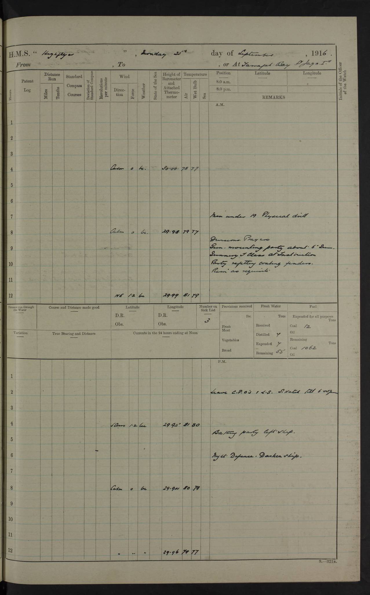 (Maps prepared using Journey Plotter, developed by Maikel. The Plots can only be approximate. They are made by joining-up positions on successive days, and sometimes positions are not given. There will therefore be occasions when the ship appears to have travelled overland) LOG BOOK – JUNE 14TH 1913 TO MAY 31ST 1914 4f960fe4a2fc8e2def00041b: (http://s3.amazonaws.com/oldweather/ADM53-44291/ADM 53-44291-001_0.jpg) 4f960fe5a2fc8e2def00041c: (http://s3.amazonaws.com/oldweather/ADM53-44291/ADM 53-44291-001_1.jpg) 4f960fe5a2fc8e2def00041d: (http://s3.amazonaws.com/oldweather/ADM53-44291/ADM 53-44291-002_0.jpg) 4f960fe5a2fc8e2def00041e: (http://s3.amazonaws.com/oldweather/ADM53-44291/ADM 53-44291-002_1.jpg) LOG of HMS Highflyer Commanded by Captain HT Buller MVO FOR THE PERIOD Commencing Saturday 14th June 1913 Ending Sunday 31st May 1914 Tonnage (displacement): 5600 Extreme length: 350 ft Extreme breadth: 54 ft ENGINES Manufacturer: Fairfield Shipbuilding & Engineering Co, Glasgow IHP: 10.000 Description: Vertical triple expansion 4 cylinders When fixed on board: 1898 BOILERS Manufacturer: Fairfield Shipbuilding & Engineering Co Description: Belleville with economisers 18 in No When made: 1898 When put in vessel: 1898 SCREW PROPELLER Manufacturer: Fairfield Shipbuilding & Engineering Co Description: Twin 3 bladed Admiralty design (bronze) General state of repair: Good 4f960fe6a2fc8e2def00041f: (http://s3.amazonaws.com/oldweather/ADM53-44291/ADM 53-44291-003_0.jpg) [Directions for using the log, figures to indicate the force of the wind and the state of the sea, and letters to denote the state of the weather.] 4f960fe6a2fc8e2def000420: (http://s3.amazonaws.com/oldweather/ADM53-44291/ADM 53-44291-003_1.jpg) Establishment of ship’s company Officers 32 Seamen 164 Boys 24 Marines 50 Engine-room establishment 134 Other non-executive ratings 466 BAROMETER Mercurial or aneroid: Mercurial Name of maker & number: Adie A 577 Height of cistern above sea: 9 feet Thermometers for air temperature Position in ship: Fore bridge Whether in screen: Yes Maker & number: Negretti & Zambra MO/A 9607 dry; from June 14, 1913 to June 1, 1914 MO/A 9603 wet; from June 14, 1913 to June 1, 1914 Thermometer for sea temperature Maker & number: J Hicks A 434; from June 14, 1913 to June 1, 1914 Position of standard compass Fore upper bridge DEVIATION OF STANDARD COMPASS Date obtained: August 29th 1913 Position: Sheerness, No 28 buoy ARMAMENT Fxle: one 6” QF PII S waist: four 6” QF PII P waist: four 6” QF PII OD: two 6” QF PII Battle deck: two 12-pounder 12-cwt SII S waist: three 12-pounder 12-cwt SII P waist: three 12-pounder 12-cwt SII AS deck: 3-pounder QF (Hotchkiss) P waist: 12-pounder 8-cwt field gun Torpedo armament 2 18” tubes BOATS 2 pinnaces, 36 ft sailing 2 cutters 1 gig, 30 ft 1 whaler 1 steam cutter, 32 ft MISCELLANEOUS INFORMATION Draught of water with bunkers full, and complete with provisions, stores and water: forward 22 ft 0 in, aft 23 ft 2 in Load draught, 600 tons coal: forward 19 ft 6 in, aft 21 ft 6 in Number of tons necessary to increase draught 1 inch: 31.5 Number of tons of coal carried (43 cubic feet per ton): a) At load draught, 600 b) With bunkers full, 1132 c) In places other than bunkers, nil Quantity of water carried: a) For boilers, 207 tons b) For drinking 60 tons THE VOYAGES OF HMS HIGHFLYER 1913-1914