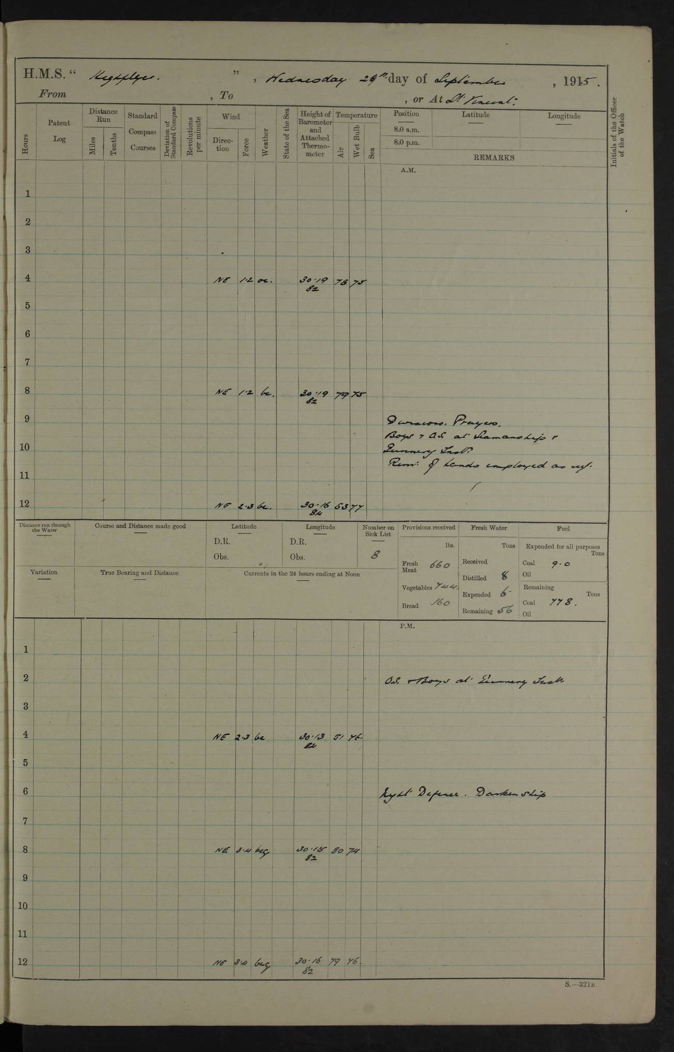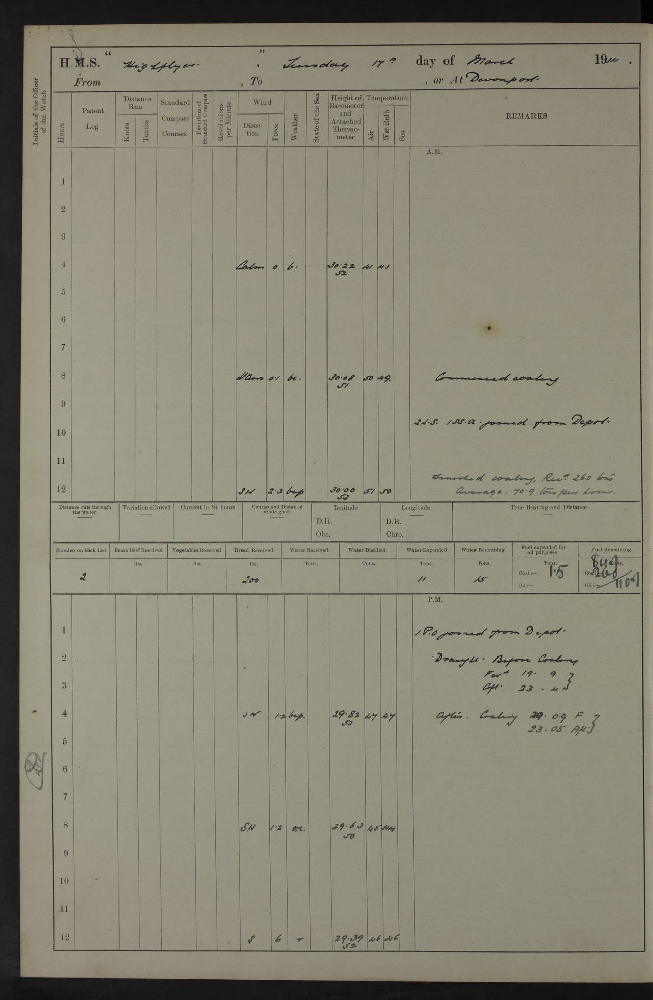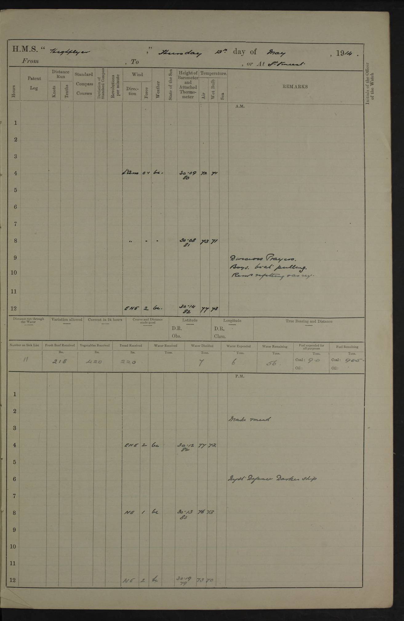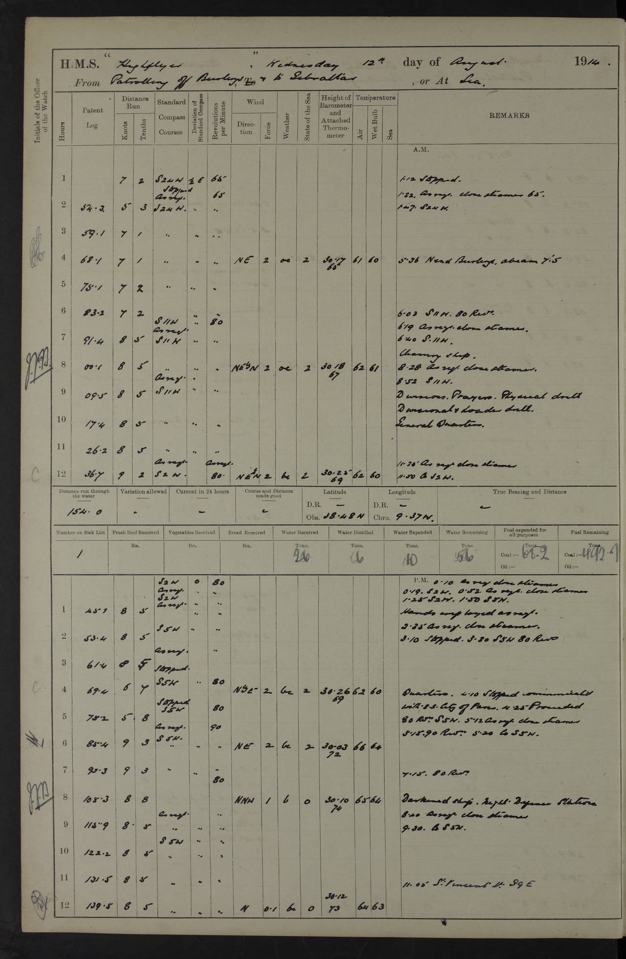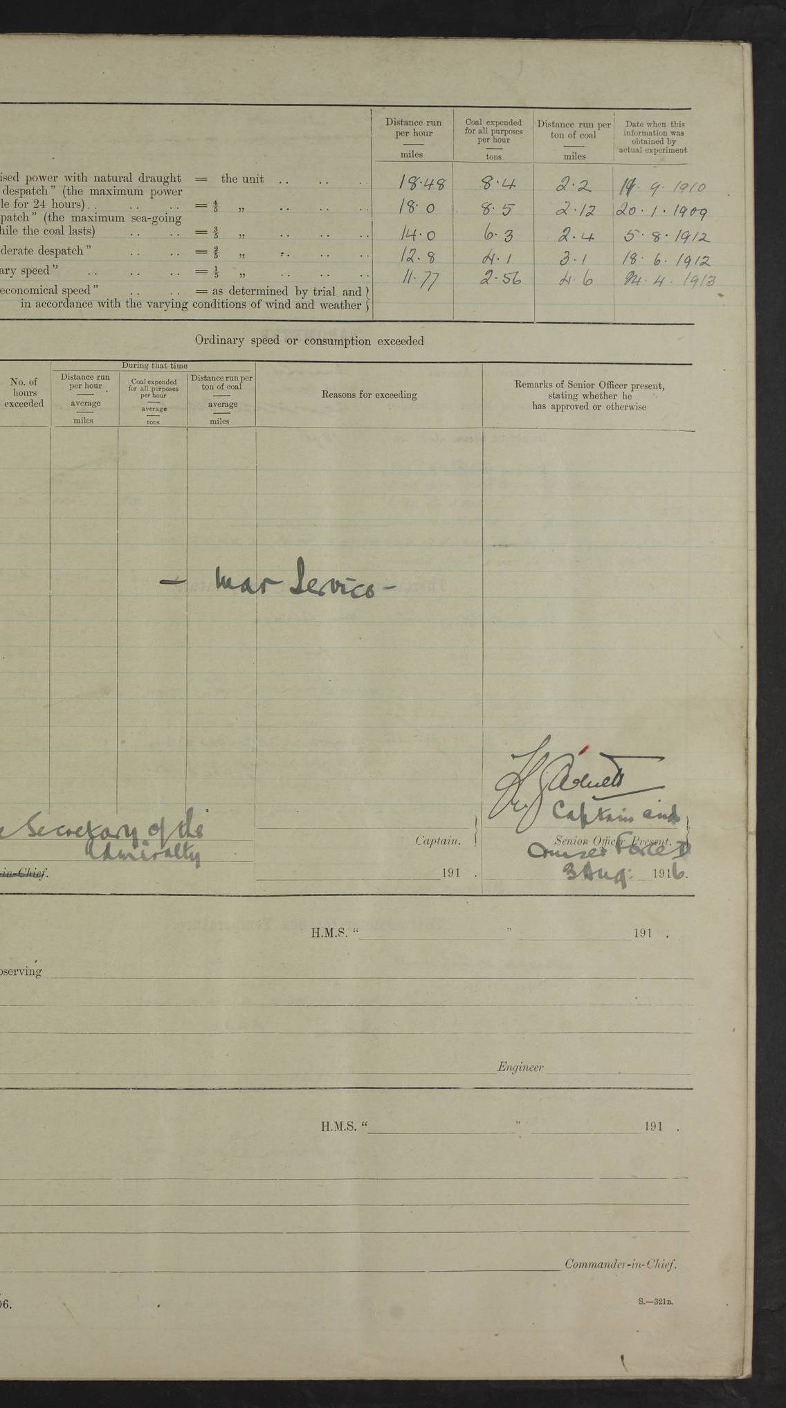 (Maps prepared using Journey Plotter, developed by Maikel. The Plots can only be approximate. They are made by joining-up positions on successive days, and sometimes positions are not given. There will therefore be occasions when the ship appears to have travelled overland) LOG BOOK – JUNE 14TH 1913 TO MAY 31ST 1914 4f960fe4a2fc8e2def00041b: (http://s3.amazonaws.com/oldweather/ADM53-44291/ADM 53-44291-001_0.jpg) 4f960fe5a2fc8e2def00041c: (http://s3.amazonaws.com/oldweather/ADM53-44291/ADM 53-44291-001_1.jpg) 4f960fe5a2fc8e2def00041d: (http://s3.amazonaws.com/oldweather/ADM53-44291/ADM 53-44291-002_0.jpg) 4f960fe5a2fc8e2def00041e: (http://s3.amazonaws.com/oldweather/ADM53-44291/ADM 53-44291-002_1.jpg) LOG of HMS Highflyer Commanded by Captain HT Buller MVO FOR THE PERIOD Commencing Saturday 14th June 1913 Ending Sunday 31st May 1914 Tonnage (displacement): 5600 Extreme length: 350 ft Extreme breadth: 54 ft ENGINES Manufacturer: Fairfield Shipbuilding & Engineering Co, Glasgow IHP: 10.000 Description: Vertical triple expansion 4 cylinders When fixed on board: 1898 BOILERS Manufacturer: Fairfield Shipbuilding & Engineering Co Description: Belleville with economisers 18 in No When made: 1898 When put in vessel: 1898 SCREW PROPELLER Manufacturer: Fairfield Shipbuilding & Engineering Co Description: Twin 3 bladed Admiralty design (bronze) General state of repair: Good 4f960fe6a2fc8e2def00041f: (http://s3.amazonaws.com/oldweather/ADM53-44291/ADM 53-44291-003_0.jpg) [Directions for using the log, figures to indicate the force of the wind and the state of the sea, and letters to denote the state of the weather.] 4f960fe6a2fc8e2def000420: (http://s3.amazonaws.com/oldweather/ADM53-44291/ADM 53-44291-003_1.jpg) Establishment of ship’s company Officers 32 Seamen 164 Boys 24 Marines 50 Engine-room establishment 134 Other non-executive ratings 466 BAROMETER Mercurial or aneroid: Mercurial Name of maker & number: Adie A 577 Height of cistern above sea: 9 feet Thermometers for air temperature Position in ship: Fore bridge Whether in screen: Yes Maker & number: Negretti & Zambra MO/A 9607 dry; from June 14, 1913 to June 1, 1914 MO/A 9603 wet; from June 14, 1913 to June 1, 1914 Thermometer for sea temperature Maker & number: J Hicks A 434; from June 14, 1913 to June 1, 1914 Position of standard compass Fore upper bridge DEVIATION OF STANDARD COMPASS Date obtained: August 29th 1913 Position: Sheerness, No 28 buoy ARMAMENT Fxle: one 6” QF PII S waist: four 6” QF PII P waist: four 6” QF PII OD: two 6” QF PII Battle deck: two 12-pounder 12-cwt SII S waist: three 12-pounder 12-cwt SII P waist: three 12-pounder 12-cwt SII AS deck: 3-pounder QF (Hotchkiss) P waist: 12-pounder 8-cwt field gun Torpedo armament 2 18” tubes BOATS 2 pinnaces, 36 ft sailing 2 cutters 1 gig, 30 ft 1 whaler 1 steam cutter, 32 ft MISCELLANEOUS INFORMATION Draught of water with bunkers full, and complete with provisions, stores and water: forward 22 ft 0 in, aft 23 ft 2 in Load draught, 600 tons coal: forward 19 ft 6 in, aft 21 ft 6 in Number of tons necessary to increase draught 1 inch: 31.5 Number of tons of coal carried (43 cubic feet per ton): a) At load draught, 600 b) With bunkers full, 1132 c) In places other than bunkers, nil Quantity of water carried: a) For boilers, 207 tons b) For drinking 60 tons THE VOYAGES OF HMS HIGHFLYER 1913-1914