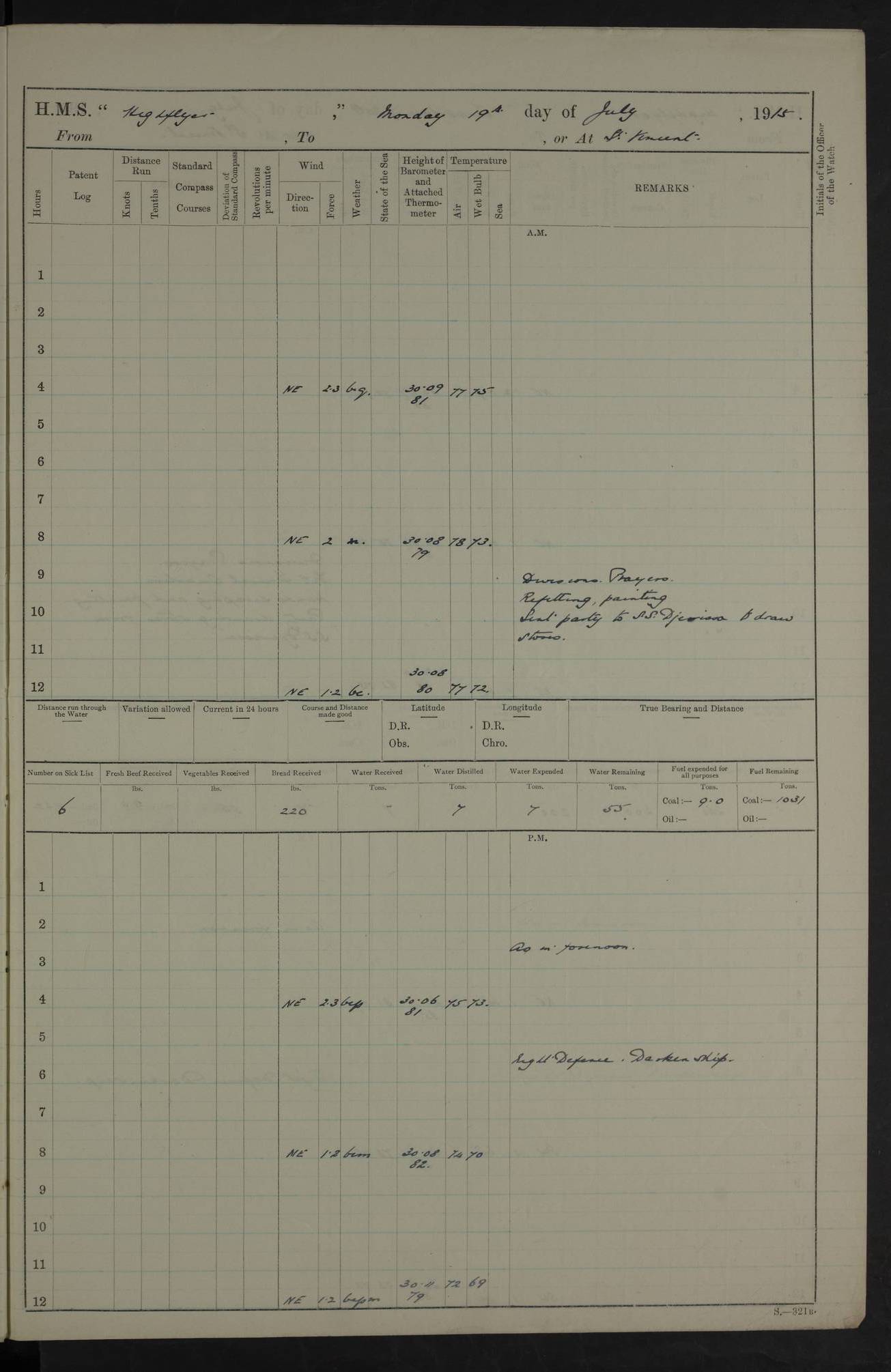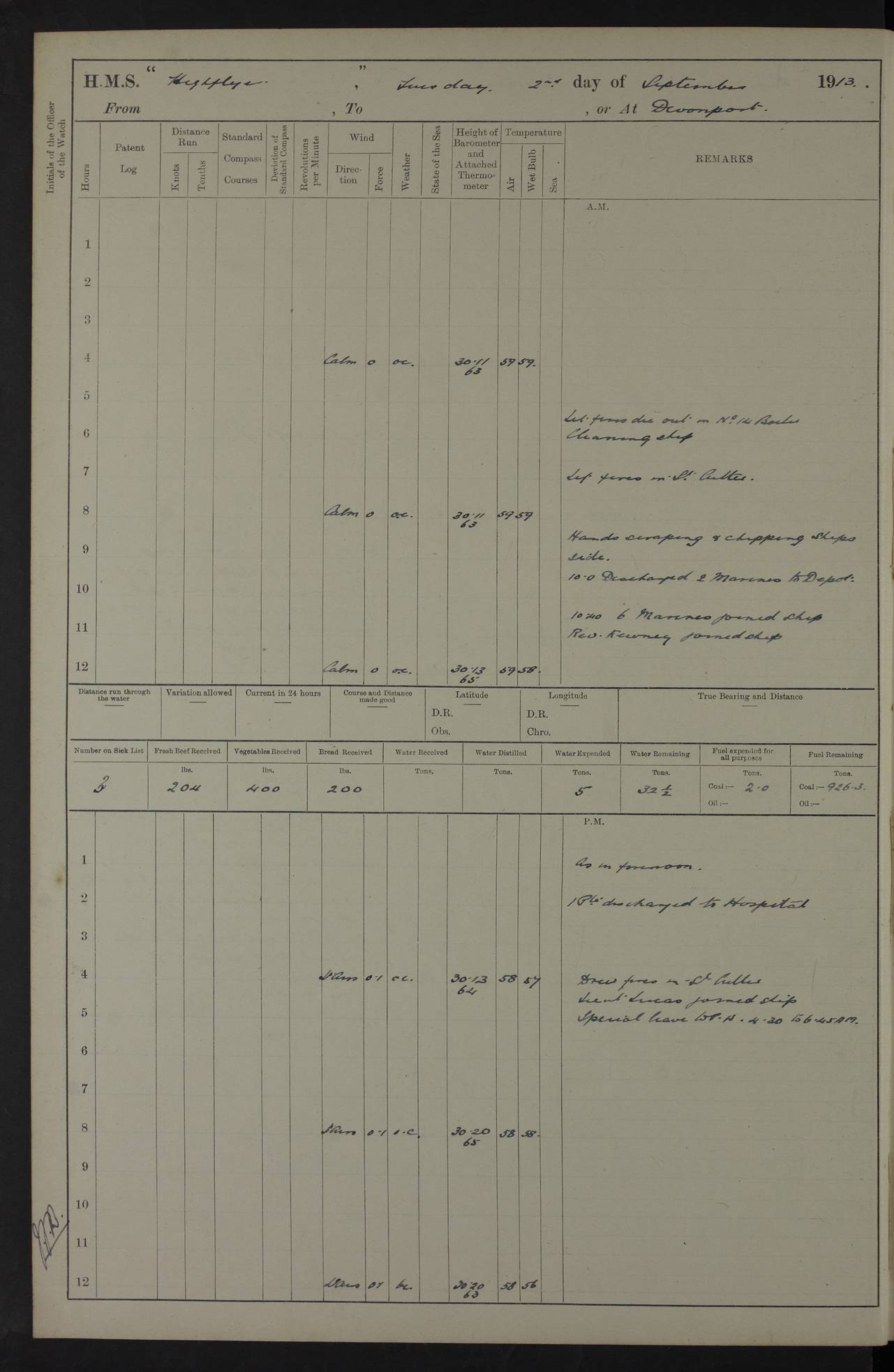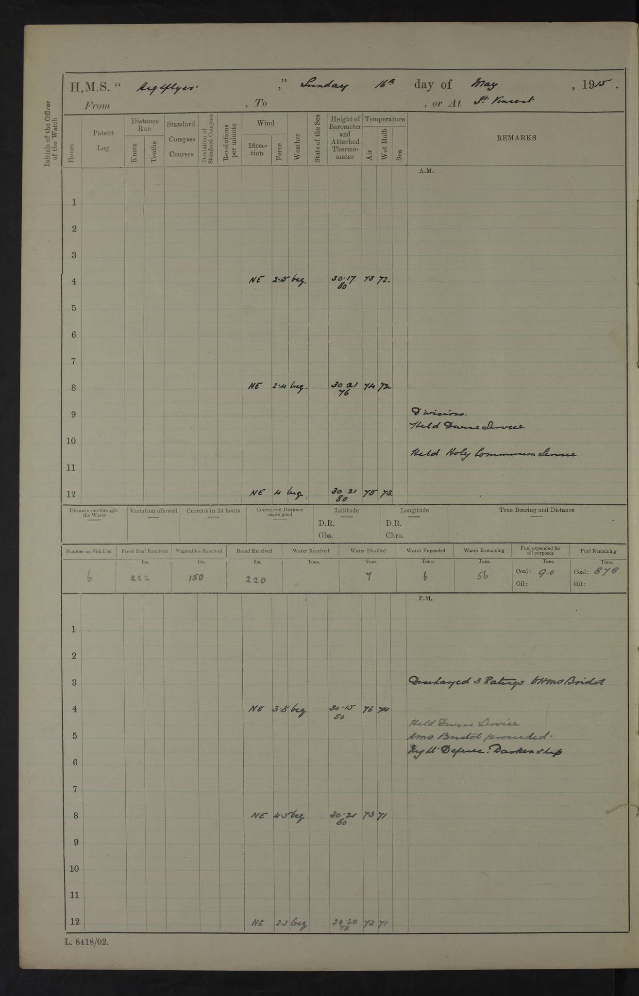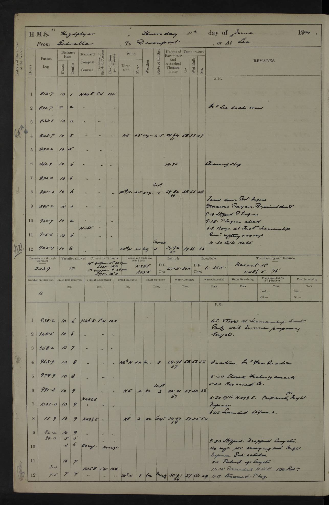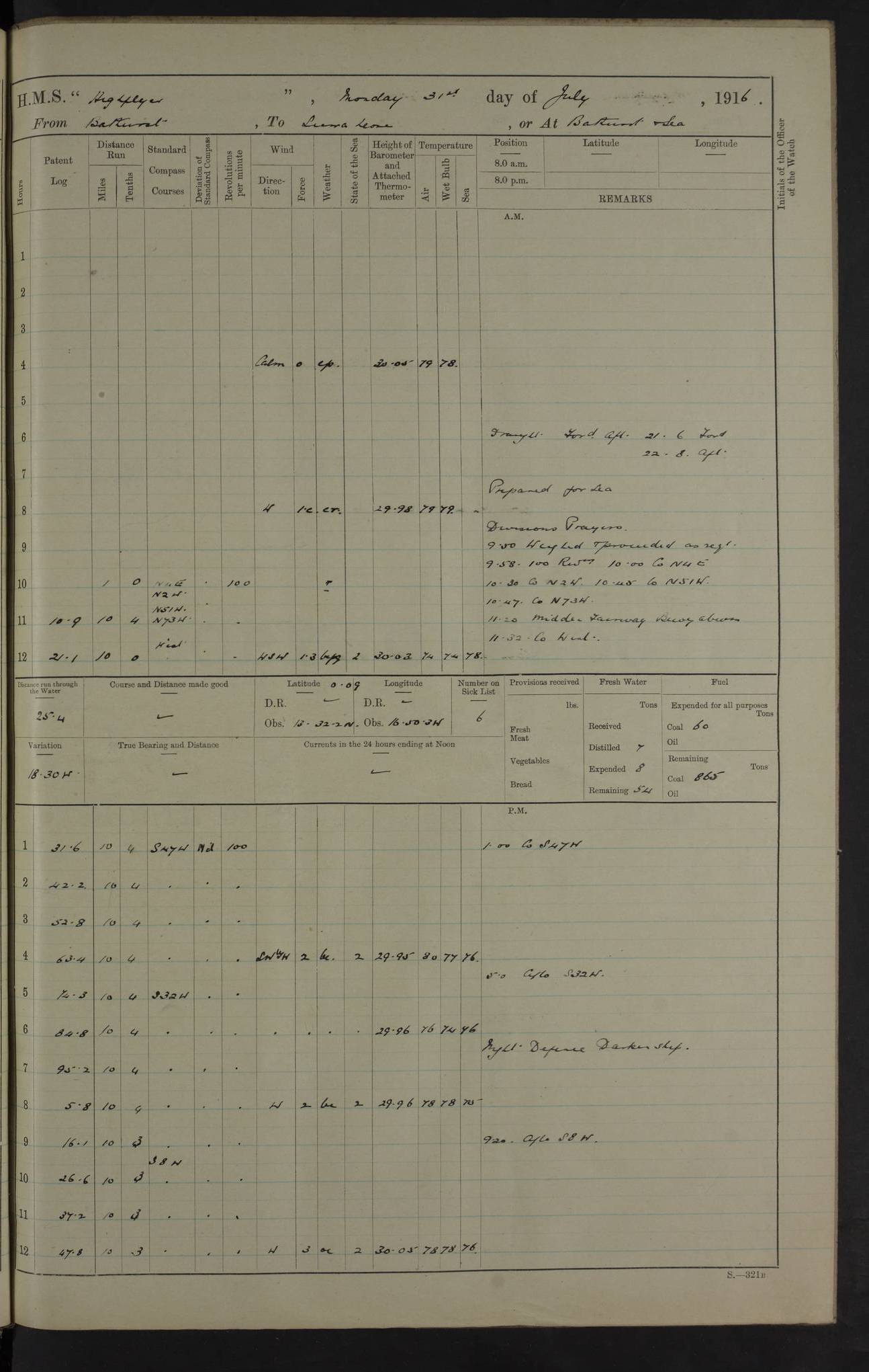 (Maps prepared using Journey Plotter, developed by Maikel. The Plots can only be approximate. They are made by joining-up positions on successive days, and sometimes positions are not given. There will therefore be occasions when the ship appears to have travelled overland) LOG BOOK – JUNE 14TH 1913 TO MAY 31ST 1914 4f960fe4a2fc8e2def00041b: (http://s3.amazonaws.com/oldweather/ADM53-44291/ADM 53-44291-001_0.jpg) 4f960fe5a2fc8e2def00041c: (http://s3.amazonaws.com/oldweather/ADM53-44291/ADM 53-44291-001_1.jpg) 4f960fe5a2fc8e2def00041d: (http://s3.amazonaws.com/oldweather/ADM53-44291/ADM 53-44291-002_0.jpg) 4f960fe5a2fc8e2def00041e: (http://s3.amazonaws.com/oldweather/ADM53-44291/ADM 53-44291-002_1.jpg) LOG of HMS Highflyer Commanded by Captain HT Buller MVO FOR THE PERIOD Commencing Saturday 14th June 1913 Ending Sunday 31st May 1914 Tonnage (displacement): 5600 Extreme length: 350 ft Extreme breadth: 54 ft ENGINES Manufacturer: Fairfield Shipbuilding & Engineering Co, Glasgow IHP: 10.000 Description: Vertical triple expansion 4 cylinders When fixed on board: 1898 BOILERS Manufacturer: Fairfield Shipbuilding & Engineering Co Description: Belleville with economisers 18 in No When made: 1898 When put in vessel: 1898 SCREW PROPELLER Manufacturer: Fairfield Shipbuilding & Engineering Co Description: Twin 3 bladed Admiralty design (bronze) General state of repair: Good 4f960fe6a2fc8e2def00041f: (http://s3.amazonaws.com/oldweather/ADM53-44291/ADM 53-44291-003_0.jpg) [Directions for using the log, figures to indicate the force of the wind and the state of the sea, and letters to denote the state of the weather.] 4f960fe6a2fc8e2def000420: (http://s3.amazonaws.com/oldweather/ADM53-44291/ADM 53-44291-003_1.jpg) Establishment of ship’s company Officers 32 Seamen 164 Boys 24 Marines 50 Engine-room establishment 134 Other non-executive ratings 466 BAROMETER Mercurial or aneroid: Mercurial Name of maker & number: Adie A 577 Height of cistern above sea: 9 feet Thermometers for air temperature Position in ship: Fore bridge Whether in screen: Yes Maker & number: Negretti & Zambra MO/A 9607 dry; from June 14, 1913 to June 1, 1914 MO/A 9603 wet; from June 14, 1913 to June 1, 1914 Thermometer for sea temperature Maker & number: J Hicks A 434; from June 14, 1913 to June 1, 1914 Position of standard compass Fore upper bridge DEVIATION OF STANDARD COMPASS Date obtained: August 29th 1913 Position: Sheerness, No 28 buoy ARMAMENT Fxle: one 6” QF PII S waist: four 6” QF PII P waist: four 6” QF PII OD: two 6” QF PII Battle deck: two 12-pounder 12-cwt SII S waist: three 12-pounder 12-cwt SII P waist: three 12-pounder 12-cwt SII AS deck: 3-pounder QF (Hotchkiss) P waist: 12-pounder 8-cwt field gun Torpedo armament 2 18” tubes BOATS 2 pinnaces, 36 ft sailing 2 cutters 1 gig, 30 ft 1 whaler 1 steam cutter, 32 ft MISCELLANEOUS INFORMATION Draught of water with bunkers full, and complete with provisions, stores and water: forward 22 ft 0 in, aft 23 ft 2 in Load draught, 600 tons coal: forward 19 ft 6 in, aft 21 ft 6 in Number of tons necessary to increase draught 1 inch: 31.5 Number of tons of coal carried (43 cubic feet per ton): a) At load draught, 600 b) With bunkers full, 1132 c) In places other than bunkers, nil Quantity of water carried: a) For boilers, 207 tons b) For drinking 60 tons THE VOYAGES OF HMS HIGHFLYER 1913-1914