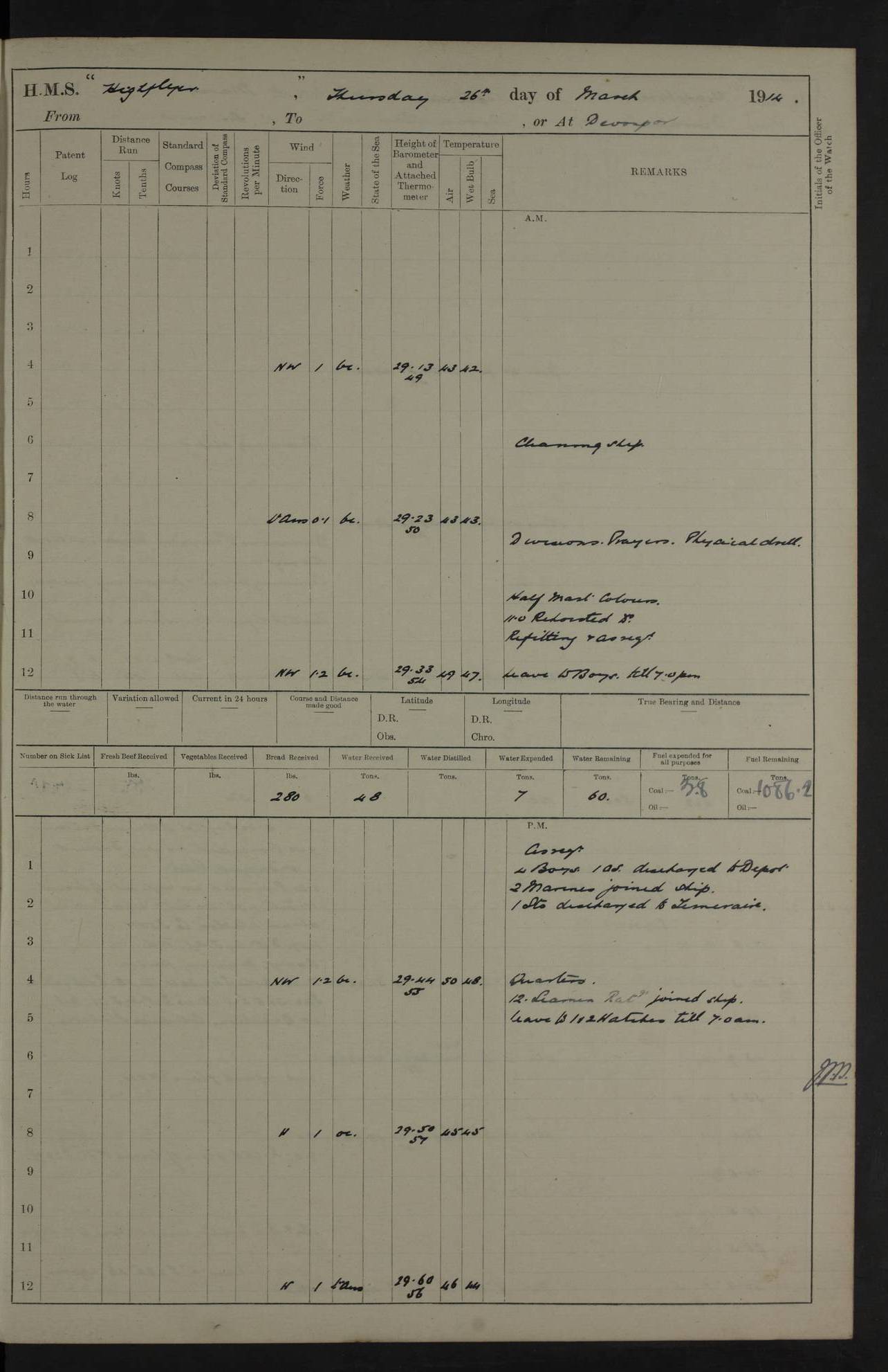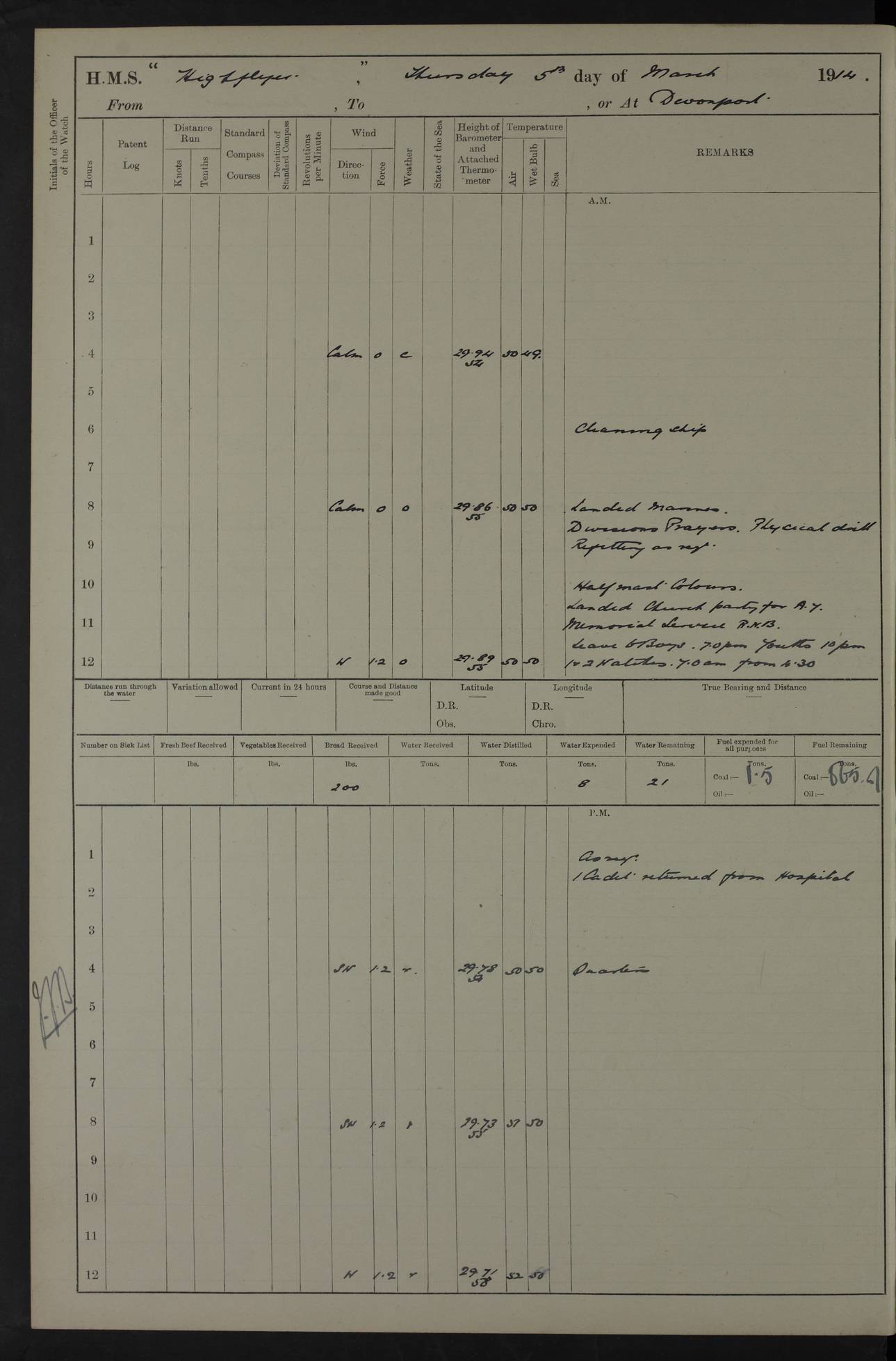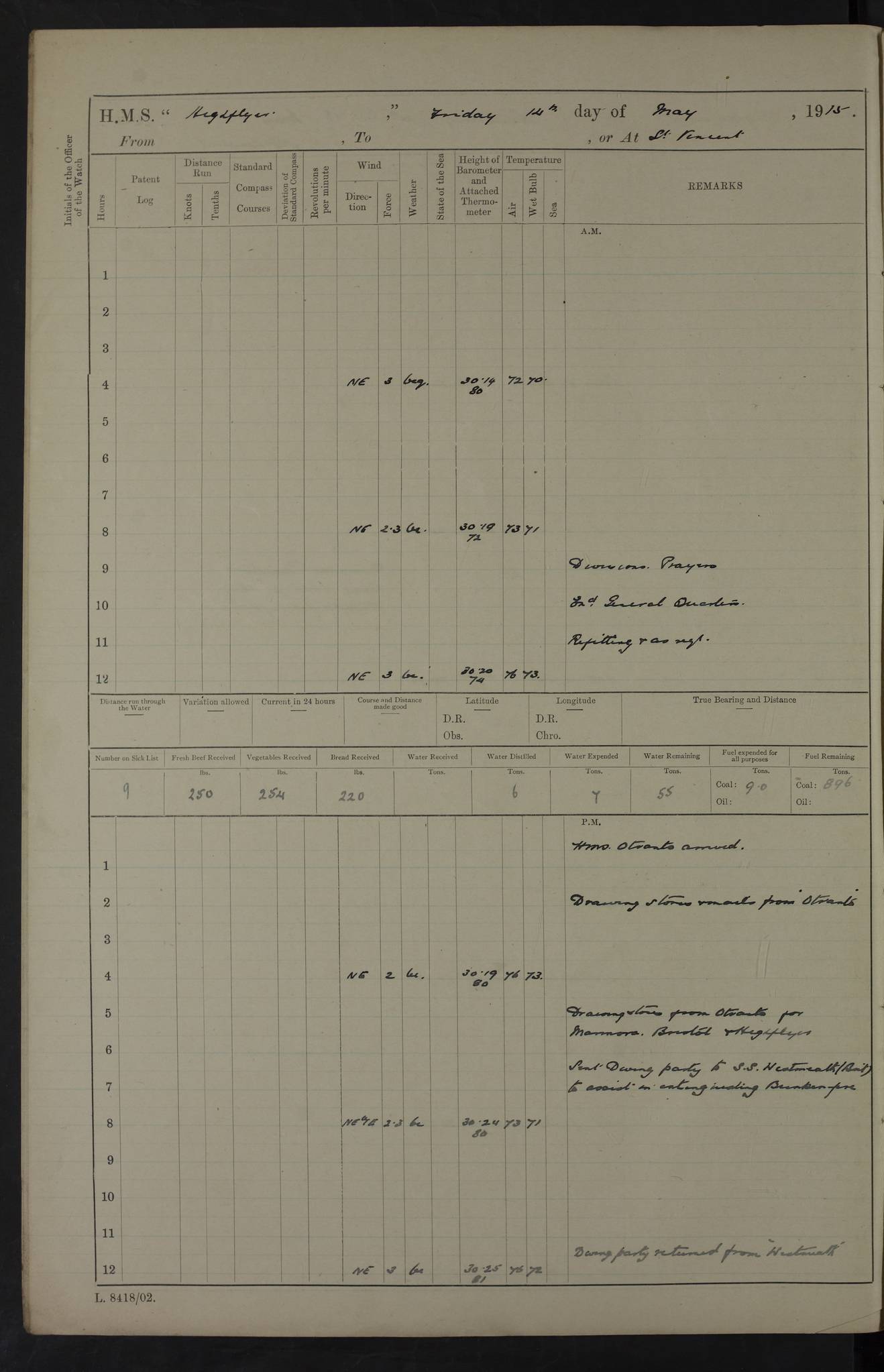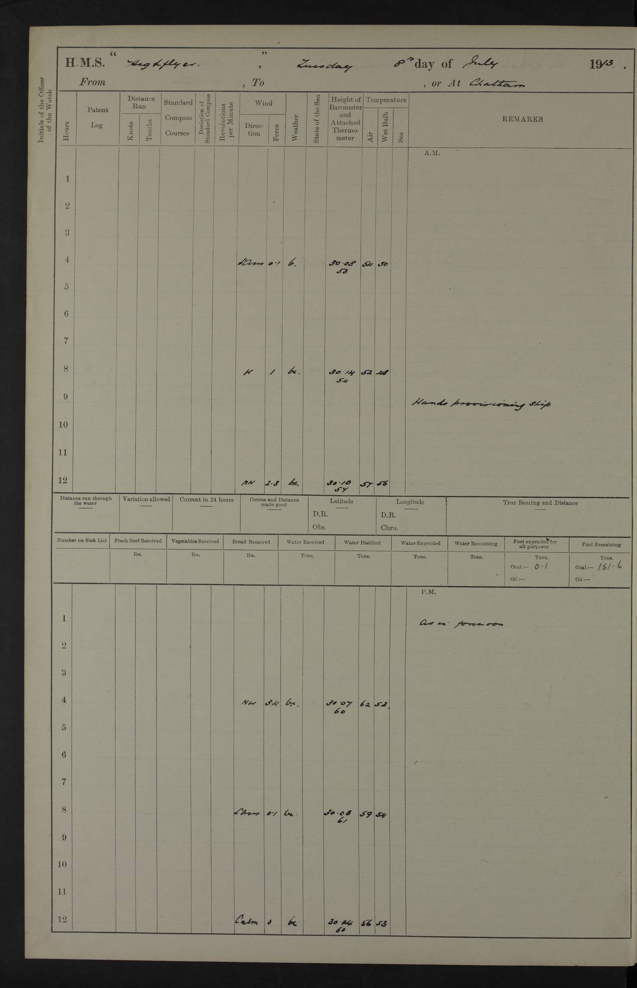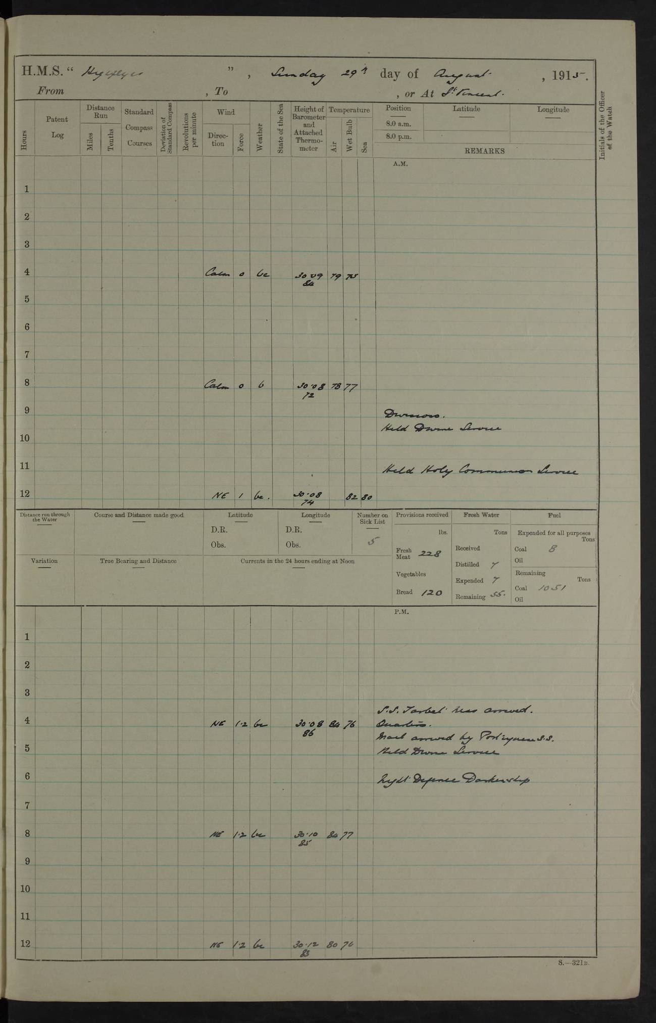 (Maps prepared using Journey Plotter, developed by Maikel. The Plots can only be approximate. They are made by joining-up positions on successive days, and sometimes positions are not given. There will therefore be occasions when the ship appears to have travelled overland) LOG BOOK – JUNE 14TH 1913 TO MAY 31ST 1914 4f960fe4a2fc8e2def00041b: (http://s3.amazonaws.com/oldweather/ADM53-44291/ADM 53-44291-001_0.jpg) 4f960fe5a2fc8e2def00041c: (http://s3.amazonaws.com/oldweather/ADM53-44291/ADM 53-44291-001_1.jpg) 4f960fe5a2fc8e2def00041d: (http://s3.amazonaws.com/oldweather/ADM53-44291/ADM 53-44291-002_0.jpg) 4f960fe5a2fc8e2def00041e: (http://s3.amazonaws.com/oldweather/ADM53-44291/ADM 53-44291-002_1.jpg) LOG of HMS Highflyer Commanded by Captain HT Buller MVO FOR THE PERIOD Commencing Saturday 14th June 1913 Ending Sunday 31st May 1914 Tonnage (displacement): 5600 Extreme length: 350 ft Extreme breadth: 54 ft ENGINES Manufacturer: Fairfield Shipbuilding & Engineering Co, Glasgow IHP: 10.000 Description: Vertical triple expansion 4 cylinders When fixed on board: 1898 BOILERS Manufacturer: Fairfield Shipbuilding & Engineering Co Description: Belleville with economisers 18 in No When made: 1898 When put in vessel: 1898 SCREW PROPELLER Manufacturer: Fairfield Shipbuilding & Engineering Co Description: Twin 3 bladed Admiralty design (bronze) General state of repair: Good 4f960fe6a2fc8e2def00041f: (http://s3.amazonaws.com/oldweather/ADM53-44291/ADM 53-44291-003_0.jpg) [Directions for using the log, figures to indicate the force of the wind and the state of the sea, and letters to denote the state of the weather.] 4f960fe6a2fc8e2def000420: (http://s3.amazonaws.com/oldweather/ADM53-44291/ADM 53-44291-003_1.jpg) Establishment of ship’s company Officers 32 Seamen 164 Boys 24 Marines 50 Engine-room establishment 134 Other non-executive ratings 466 BAROMETER Mercurial or aneroid: Mercurial Name of maker & number: Adie A 577 Height of cistern above sea: 9 feet Thermometers for air temperature Position in ship: Fore bridge Whether in screen: Yes Maker & number: Negretti & Zambra MO/A 9607 dry; from June 14, 1913 to June 1, 1914 MO/A 9603 wet; from June 14, 1913 to June 1, 1914 Thermometer for sea temperature Maker & number: J Hicks A 434; from June 14, 1913 to June 1, 1914 Position of standard compass Fore upper bridge DEVIATION OF STANDARD COMPASS Date obtained: August 29th 1913 Position: Sheerness, No 28 buoy ARMAMENT Fxle: one 6” QF PII S waist: four 6” QF PII P waist: four 6” QF PII OD: two 6” QF PII Battle deck: two 12-pounder 12-cwt SII S waist: three 12-pounder 12-cwt SII P waist: three 12-pounder 12-cwt SII AS deck: 3-pounder QF (Hotchkiss) P waist: 12-pounder 8-cwt field gun Torpedo armament 2 18” tubes BOATS 2 pinnaces, 36 ft sailing 2 cutters 1 gig, 30 ft 1 whaler 1 steam cutter, 32 ft MISCELLANEOUS INFORMATION Draught of water with bunkers full, and complete with provisions, stores and water: forward 22 ft 0 in, aft 23 ft 2 in Load draught, 600 tons coal: forward 19 ft 6 in, aft 21 ft 6 in Number of tons necessary to increase draught 1 inch: 31.5 Number of tons of coal carried (43 cubic feet per ton): a) At load draught, 600 b) With bunkers full, 1132 c) In places other than bunkers, nil Quantity of water carried: a) For boilers, 207 tons b) For drinking 60 tons THE VOYAGES OF HMS HIGHFLYER 1913-1914