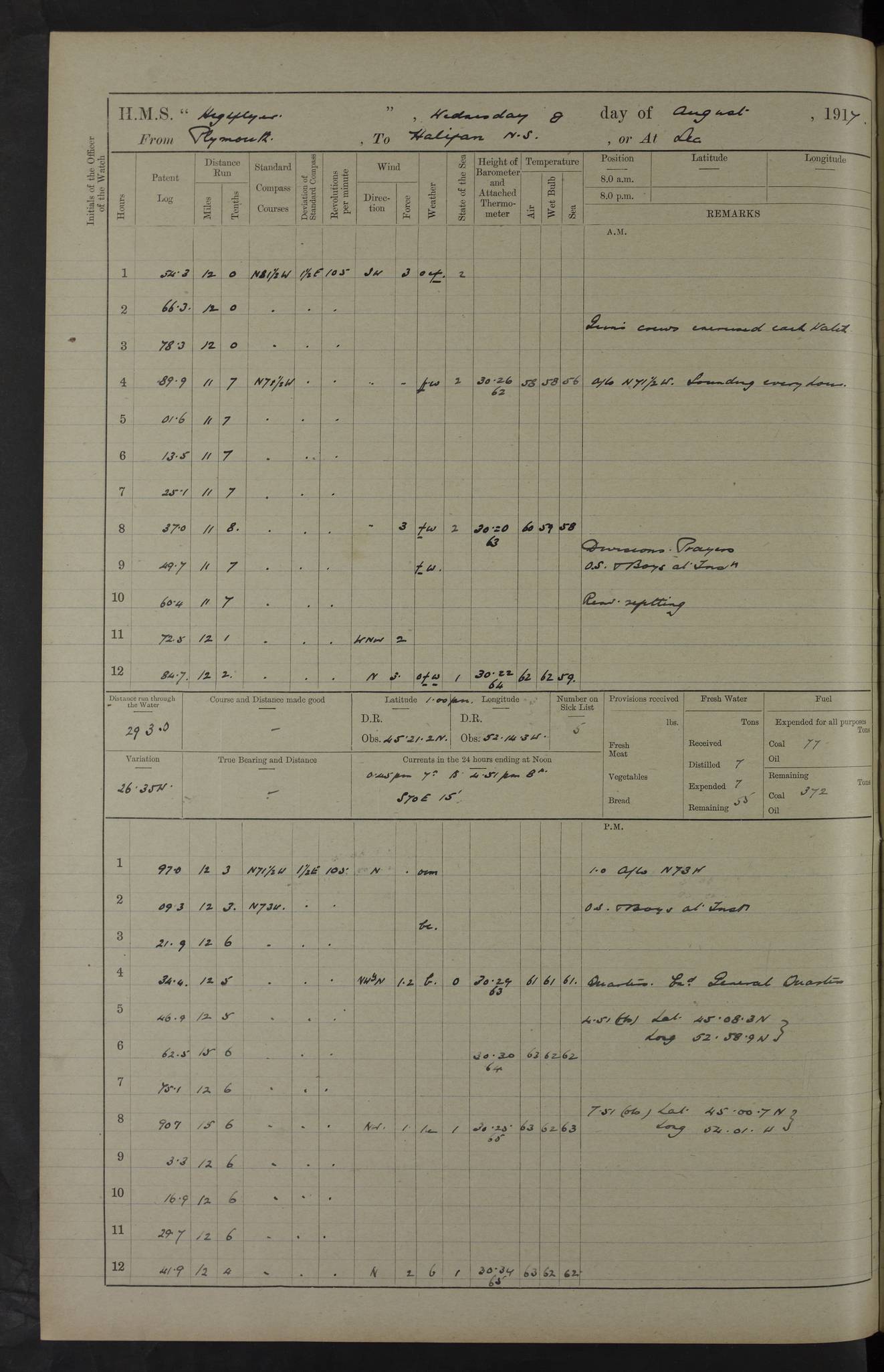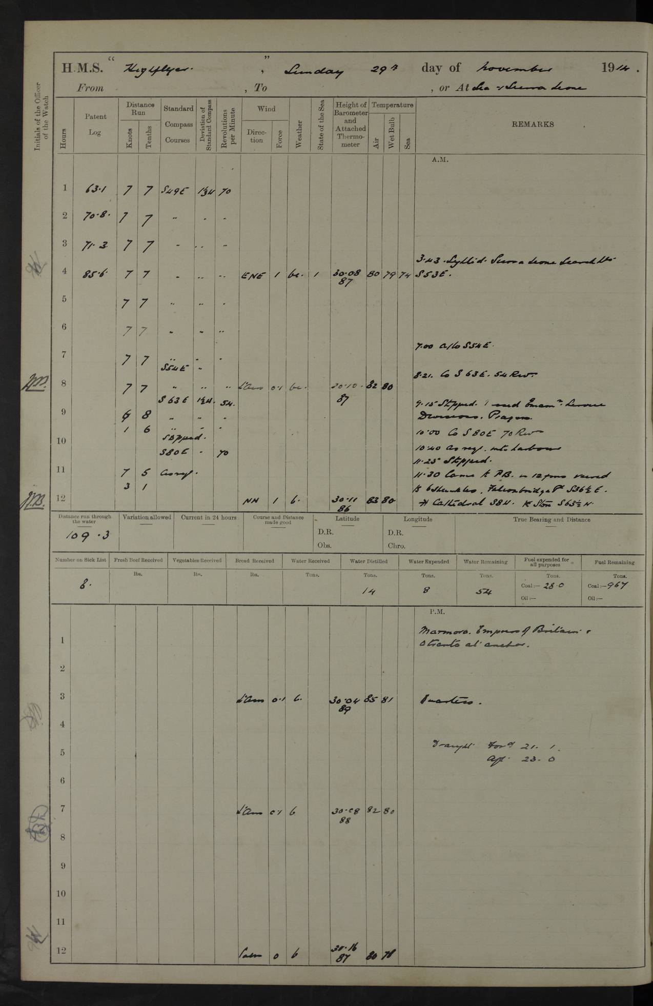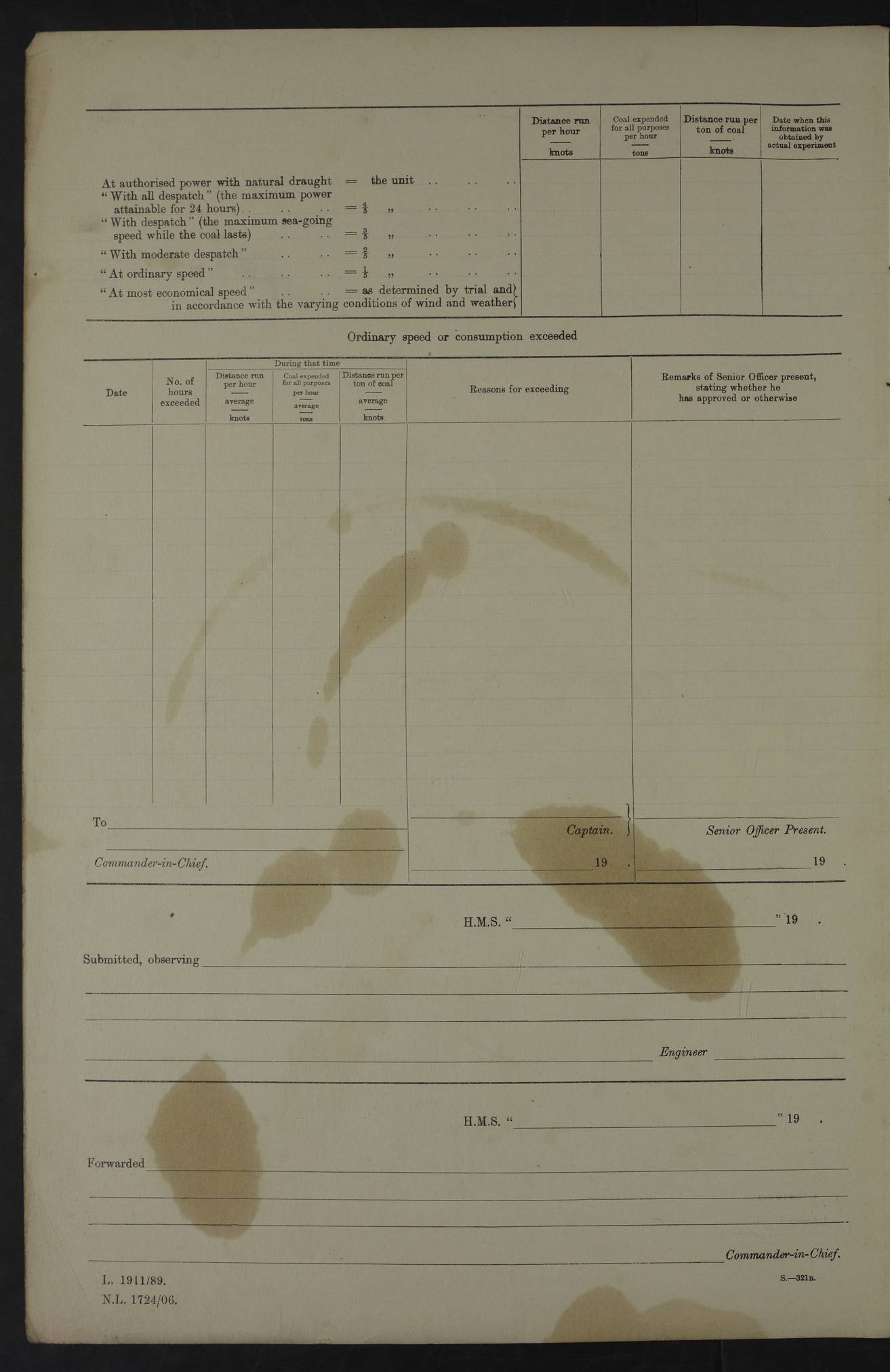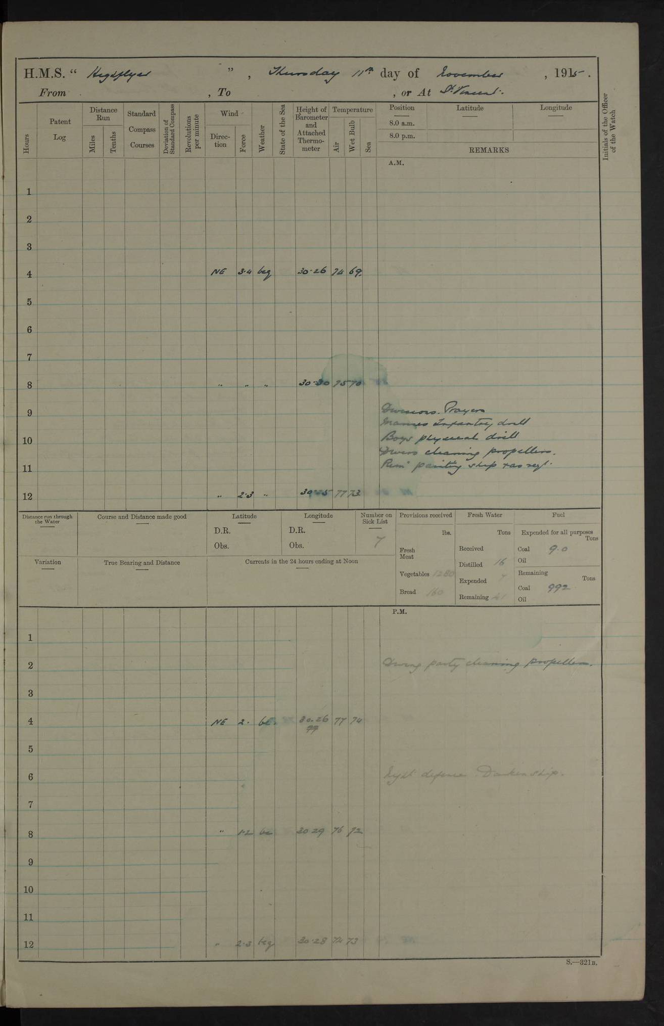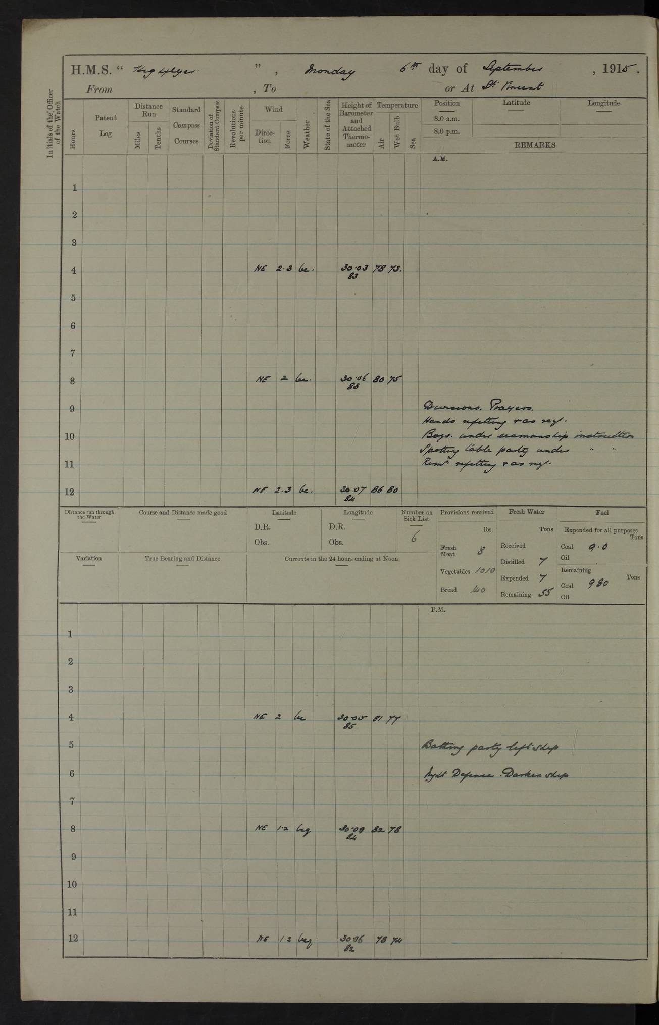 (Maps prepared using Journey Plotter, developed by Maikel. The Plots can only be approximate. They are made by joining-up positions on successive days, and sometimes positions are not given. There will therefore be occasions when the ship appears to have travelled overland) LOG BOOK – JUNE 14TH 1913 TO MAY 31ST 1914 4f960fe4a2fc8e2def00041b: (http://s3.amazonaws.com/oldweather/ADM53-44291/ADM 53-44291-001_0.jpg) 4f960fe5a2fc8e2def00041c: (http://s3.amazonaws.com/oldweather/ADM53-44291/ADM 53-44291-001_1.jpg) 4f960fe5a2fc8e2def00041d: (http://s3.amazonaws.com/oldweather/ADM53-44291/ADM 53-44291-002_0.jpg) 4f960fe5a2fc8e2def00041e: (http://s3.amazonaws.com/oldweather/ADM53-44291/ADM 53-44291-002_1.jpg) LOG of HMS Highflyer Commanded by Captain HT Buller MVO FOR THE PERIOD Commencing Saturday 14th June 1913 Ending Sunday 31st May 1914 Tonnage (displacement): 5600 Extreme length: 350 ft Extreme breadth: 54 ft ENGINES Manufacturer: Fairfield Shipbuilding & Engineering Co, Glasgow IHP: 10.000 Description: Vertical triple expansion 4 cylinders When fixed on board: 1898 BOILERS Manufacturer: Fairfield Shipbuilding & Engineering Co Description: Belleville with economisers 18 in No When made: 1898 When put in vessel: 1898 SCREW PROPELLER Manufacturer: Fairfield Shipbuilding & Engineering Co Description: Twin 3 bladed Admiralty design (bronze) General state of repair: Good 4f960fe6a2fc8e2def00041f: (http://s3.amazonaws.com/oldweather/ADM53-44291/ADM 53-44291-003_0.jpg) [Directions for using the log, figures to indicate the force of the wind and the state of the sea, and letters to denote the state of the weather.] 4f960fe6a2fc8e2def000420: (http://s3.amazonaws.com/oldweather/ADM53-44291/ADM 53-44291-003_1.jpg) Establishment of ship’s company Officers 32 Seamen 164 Boys 24 Marines 50 Engine-room establishment 134 Other non-executive ratings 466 BAROMETER Mercurial or aneroid: Mercurial Name of maker & number: Adie A 577 Height of cistern above sea: 9 feet Thermometers for air temperature Position in ship: Fore bridge Whether in screen: Yes Maker & number: Negretti & Zambra MO/A 9607 dry; from June 14, 1913 to June 1, 1914 MO/A 9603 wet; from June 14, 1913 to June 1, 1914 Thermometer for sea temperature Maker & number: J Hicks A 434; from June 14, 1913 to June 1, 1914 Position of standard compass Fore upper bridge DEVIATION OF STANDARD COMPASS Date obtained: August 29th 1913 Position: Sheerness, No 28 buoy ARMAMENT Fxle: one 6” QF PII S waist: four 6” QF PII P waist: four 6” QF PII OD: two 6” QF PII Battle deck: two 12-pounder 12-cwt SII S waist: three 12-pounder 12-cwt SII P waist: three 12-pounder 12-cwt SII AS deck: 3-pounder QF (Hotchkiss) P waist: 12-pounder 8-cwt field gun Torpedo armament 2 18” tubes BOATS 2 pinnaces, 36 ft sailing 2 cutters 1 gig, 30 ft 1 whaler 1 steam cutter, 32 ft MISCELLANEOUS INFORMATION Draught of water with bunkers full, and complete with provisions, stores and water: forward 22 ft 0 in, aft 23 ft 2 in Load draught, 600 tons coal: forward 19 ft 6 in, aft 21 ft 6 in Number of tons necessary to increase draught 1 inch: 31.5 Number of tons of coal carried (43 cubic feet per ton): a) At load draught, 600 b) With bunkers full, 1132 c) In places other than bunkers, nil Quantity of water carried: a) For boilers, 207 tons b) For drinking 60 tons THE VOYAGES OF HMS HIGHFLYER 1913-1914