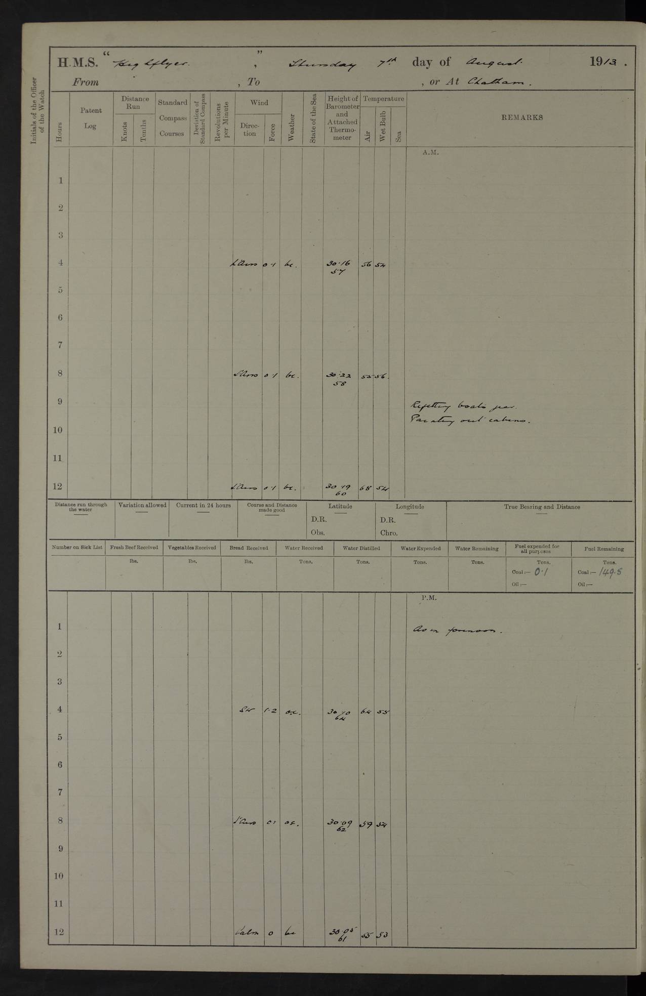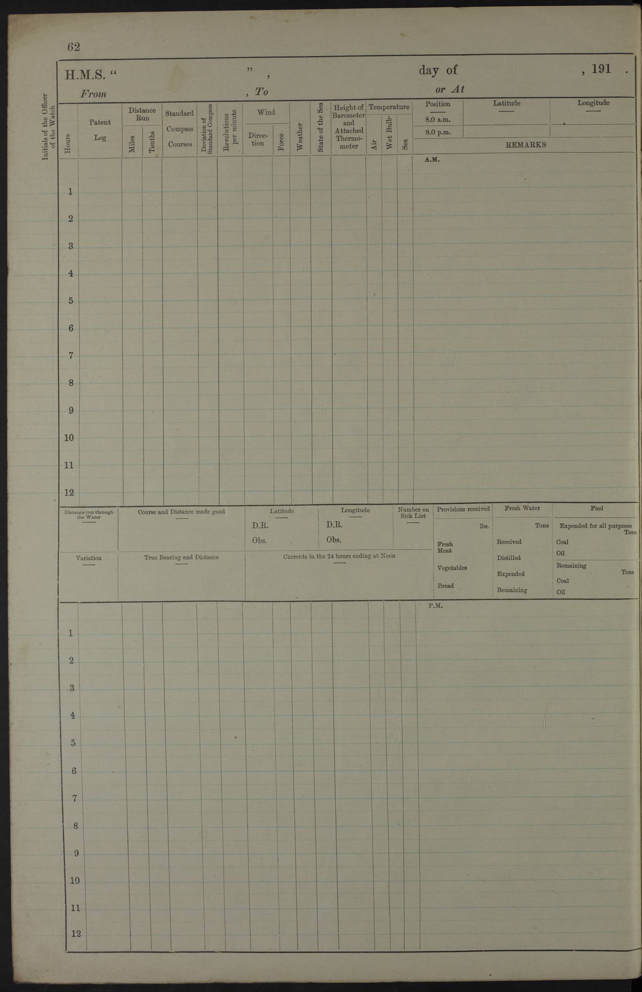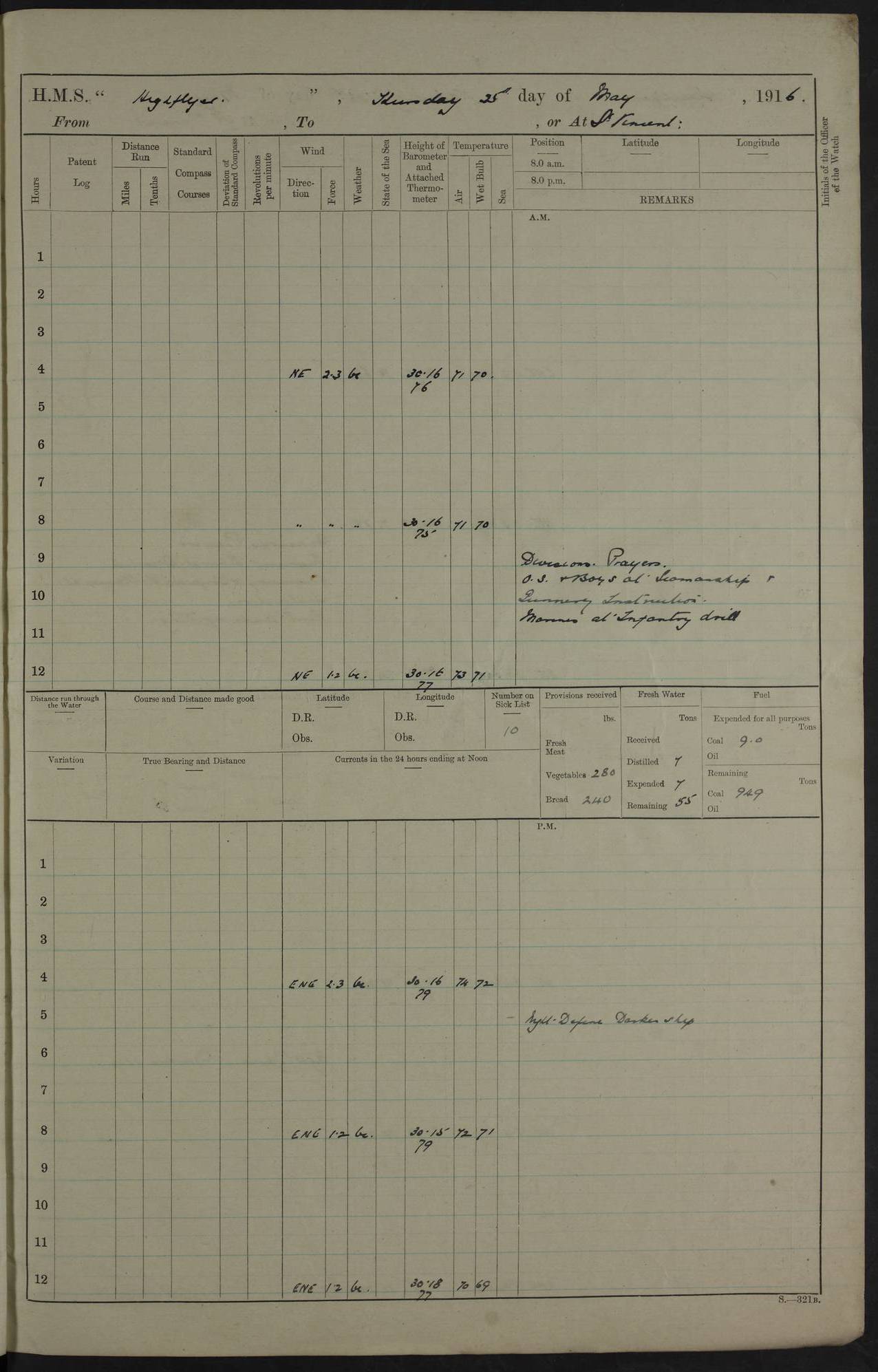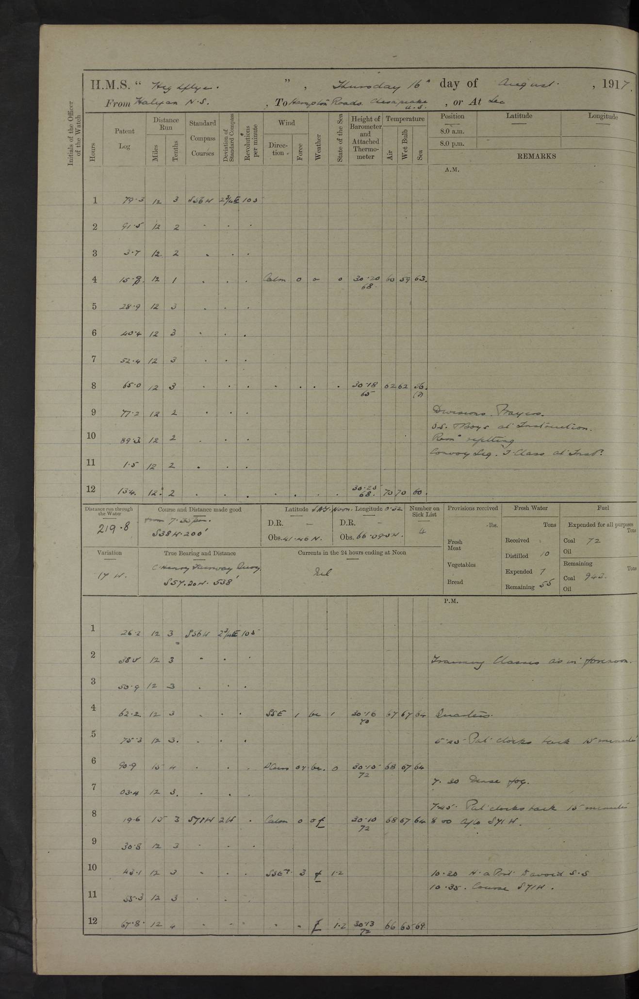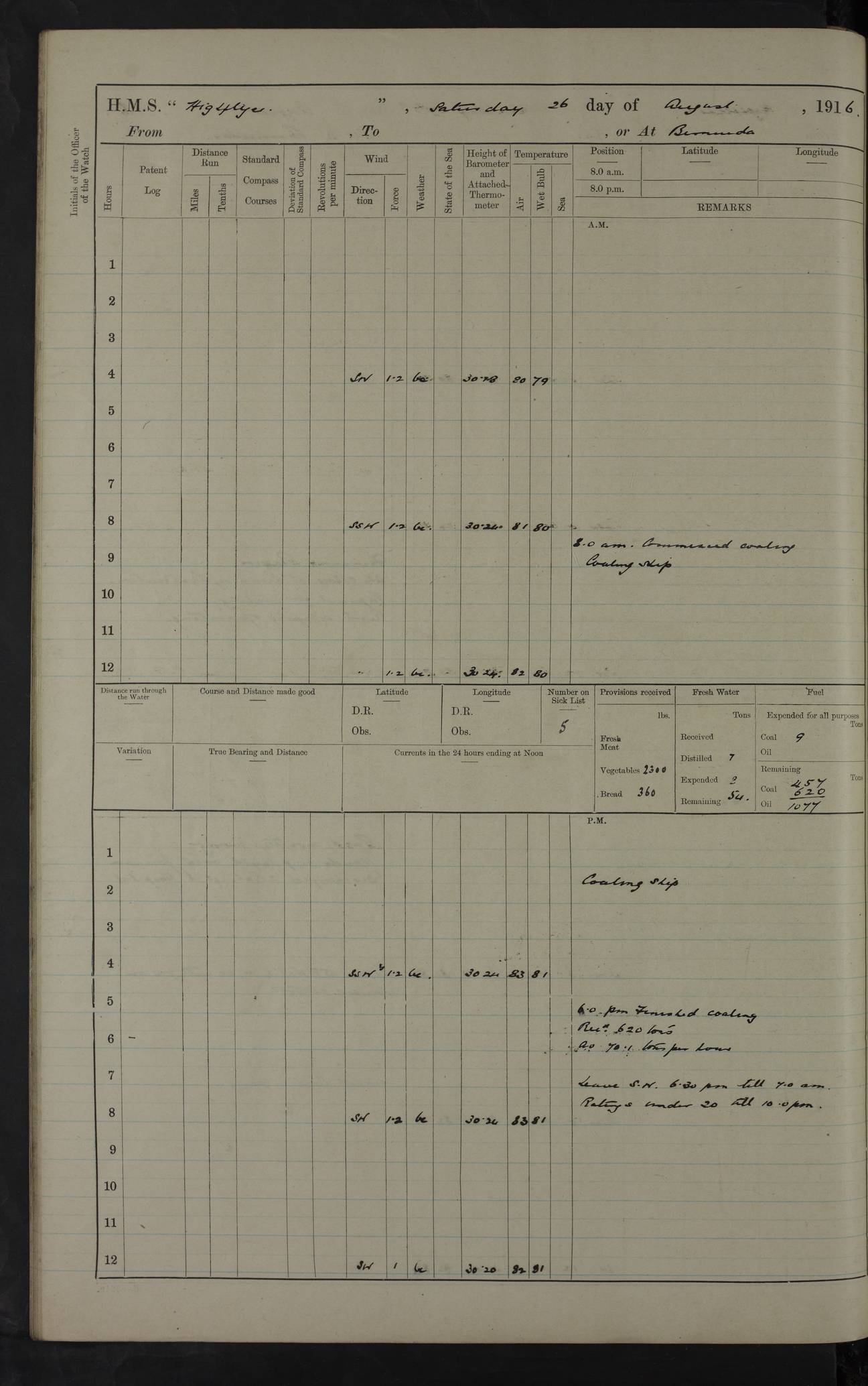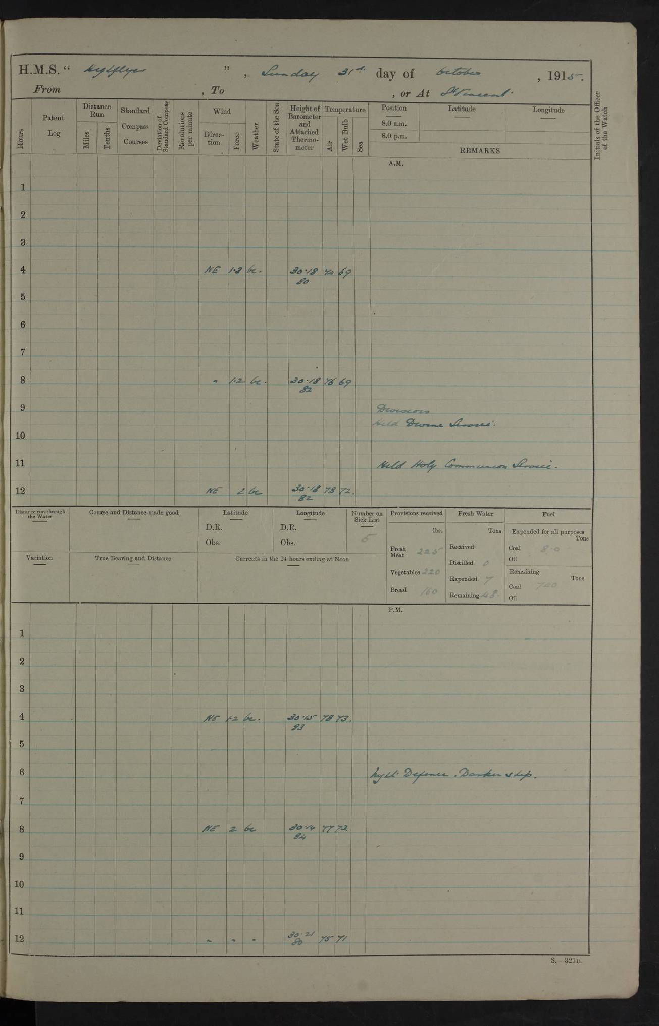 (Maps prepared using Journey Plotter, developed by Maikel. The Plots can only be approximate. They are made by joining-up positions on successive days, and sometimes positions are not given. There will therefore be occasions when the ship appears to have travelled overland) LOG BOOK – JUNE 14TH 1913 TO MAY 31ST 1914 4f960fe4a2fc8e2def00041b: (http://s3.amazonaws.com/oldweather/ADM53-44291/ADM 53-44291-001_0.jpg) 4f960fe5a2fc8e2def00041c: (http://s3.amazonaws.com/oldweather/ADM53-44291/ADM 53-44291-001_1.jpg) 4f960fe5a2fc8e2def00041d: (http://s3.amazonaws.com/oldweather/ADM53-44291/ADM 53-44291-002_0.jpg) 4f960fe5a2fc8e2def00041e: (http://s3.amazonaws.com/oldweather/ADM53-44291/ADM 53-44291-002_1.jpg) LOG of HMS Highflyer Commanded by Captain HT Buller MVO FOR THE PERIOD Commencing Saturday 14th June 1913 Ending Sunday 31st May 1914 Tonnage (displacement): 5600 Extreme length: 350 ft Extreme breadth: 54 ft ENGINES Manufacturer: Fairfield Shipbuilding & Engineering Co, Glasgow IHP: 10.000 Description: Vertical triple expansion 4 cylinders When fixed on board: 1898 BOILERS Manufacturer: Fairfield Shipbuilding & Engineering Co Description: Belleville with economisers 18 in No When made: 1898 When put in vessel: 1898 SCREW PROPELLER Manufacturer: Fairfield Shipbuilding & Engineering Co Description: Twin 3 bladed Admiralty design (bronze) General state of repair: Good 4f960fe6a2fc8e2def00041f: (http://s3.amazonaws.com/oldweather/ADM53-44291/ADM 53-44291-003_0.jpg) [Directions for using the log, figures to indicate the force of the wind and the state of the sea, and letters to denote the state of the weather.] 4f960fe6a2fc8e2def000420: (http://s3.amazonaws.com/oldweather/ADM53-44291/ADM 53-44291-003_1.jpg) Establishment of ship’s company Officers 32 Seamen 164 Boys 24 Marines 50 Engine-room establishment 134 Other non-executive ratings 466 BAROMETER Mercurial or aneroid: Mercurial Name of maker & number: Adie A 577 Height of cistern above sea: 9 feet Thermometers for air temperature Position in ship: Fore bridge Whether in screen: Yes Maker & number: Negretti & Zambra MO/A 9607 dry; from June 14, 1913 to June 1, 1914 MO/A 9603 wet; from June 14, 1913 to June 1, 1914 Thermometer for sea temperature Maker & number: J Hicks A 434; from June 14, 1913 to June 1, 1914 Position of standard compass Fore upper bridge DEVIATION OF STANDARD COMPASS Date obtained: August 29th 1913 Position: Sheerness, No 28 buoy ARMAMENT Fxle: one 6” QF PII S waist: four 6” QF PII P waist: four 6” QF PII OD: two 6” QF PII Battle deck: two 12-pounder 12-cwt SII S waist: three 12-pounder 12-cwt SII P waist: three 12-pounder 12-cwt SII AS deck: 3-pounder QF (Hotchkiss) P waist: 12-pounder 8-cwt field gun Torpedo armament 2 18” tubes BOATS 2 pinnaces, 36 ft sailing 2 cutters 1 gig, 30 ft 1 whaler 1 steam cutter, 32 ft MISCELLANEOUS INFORMATION Draught of water with bunkers full, and complete with provisions, stores and water: forward 22 ft 0 in, aft 23 ft 2 in Load draught, 600 tons coal: forward 19 ft 6 in, aft 21 ft 6 in Number of tons necessary to increase draught 1 inch: 31.5 Number of tons of coal carried (43 cubic feet per ton): a) At load draught, 600 b) With bunkers full, 1132 c) In places other than bunkers, nil Quantity of water carried: a) For boilers, 207 tons b) For drinking 60 tons THE VOYAGES OF HMS HIGHFLYER 1913-1914
