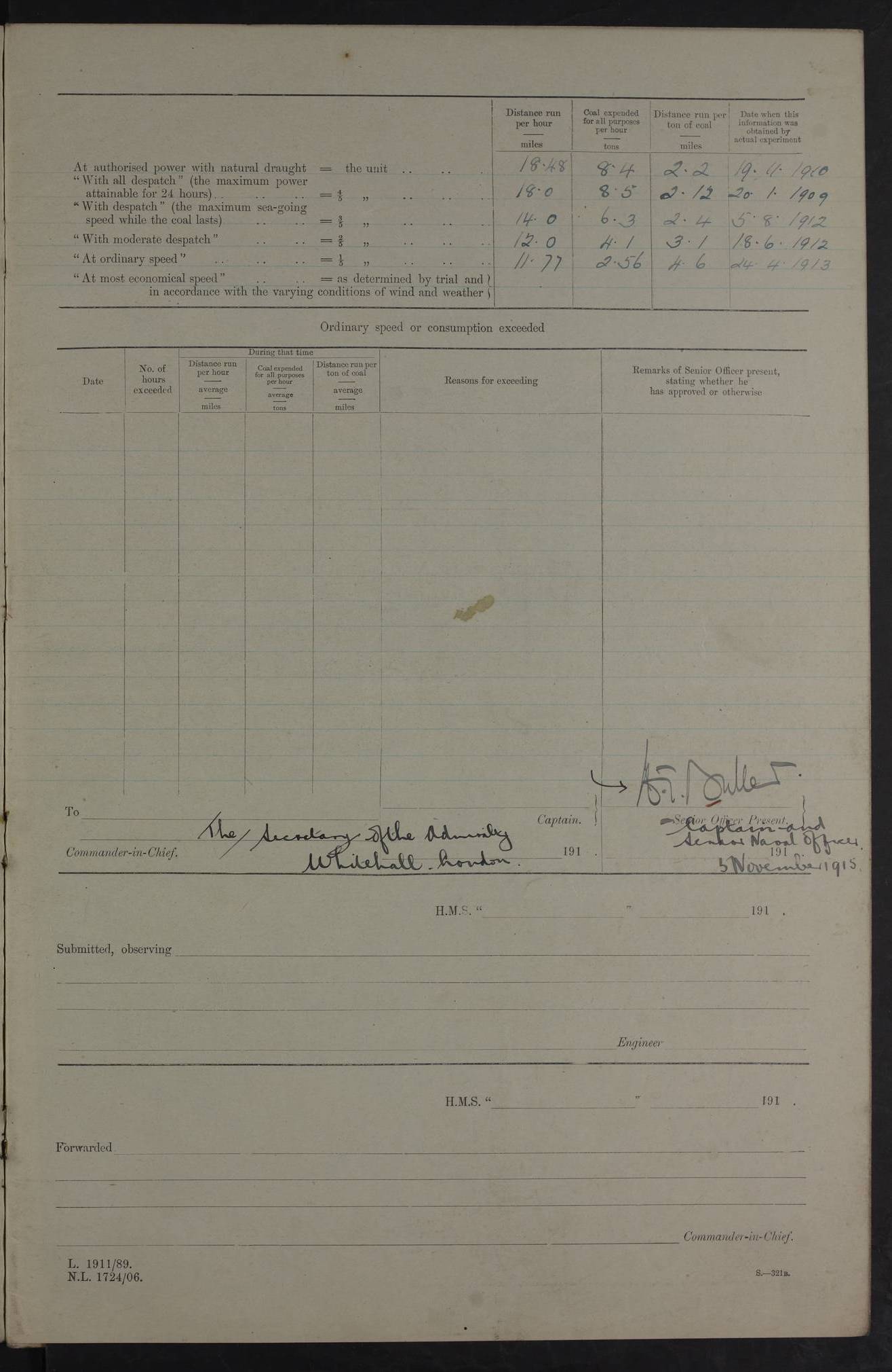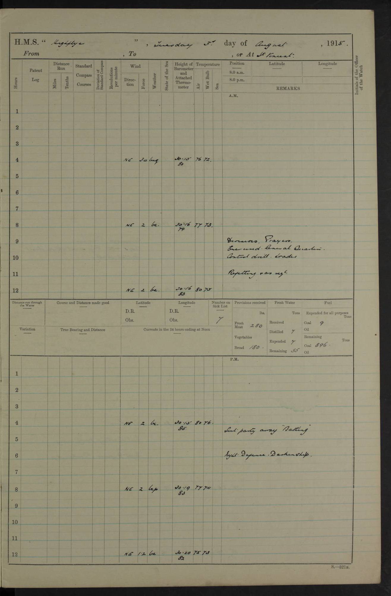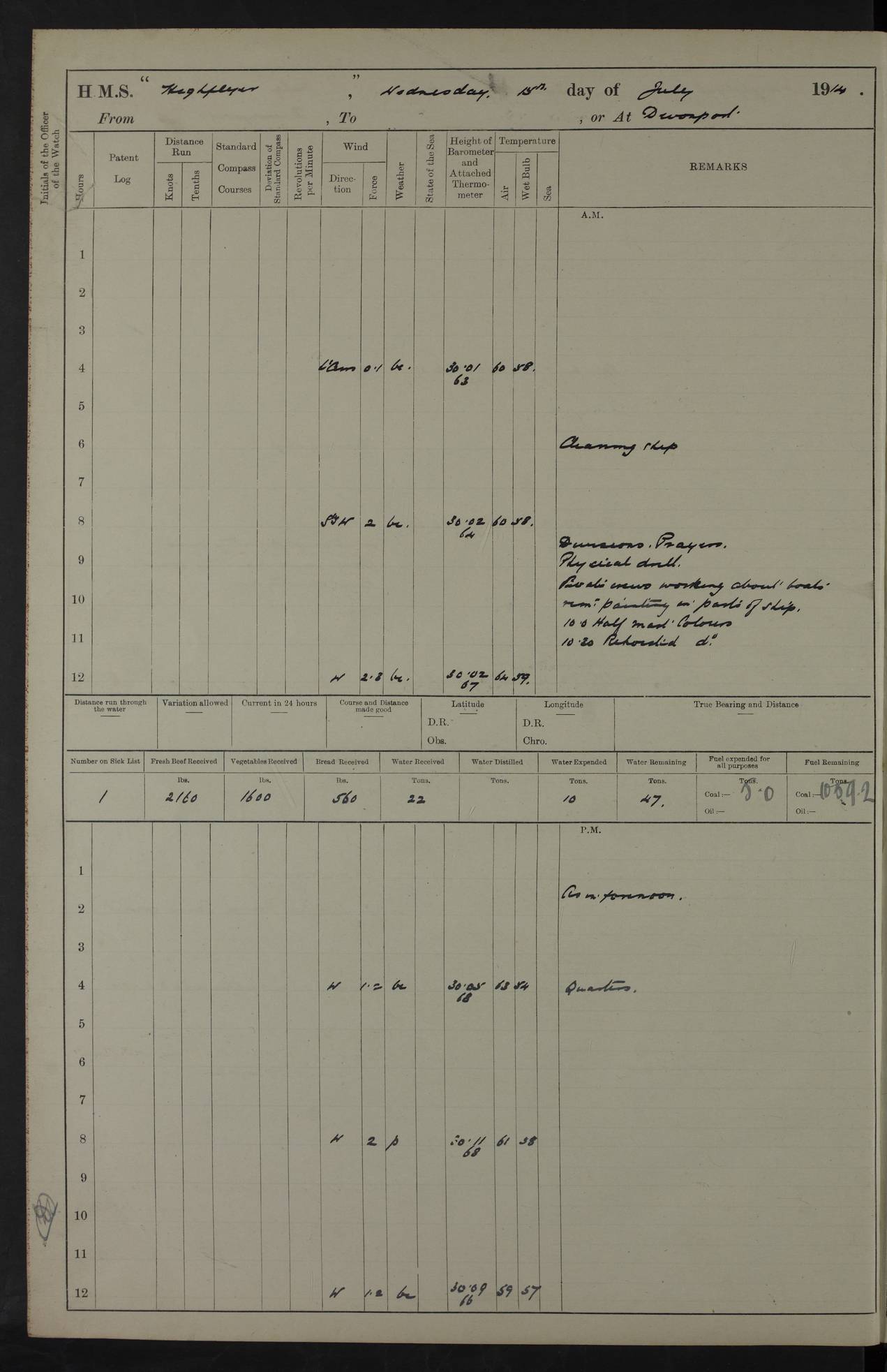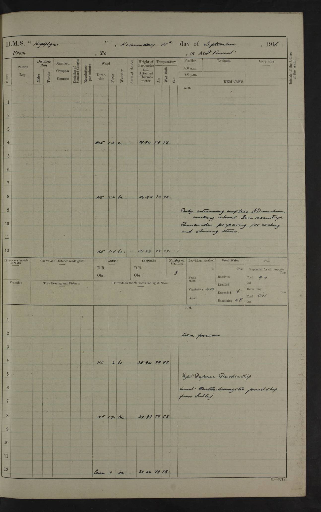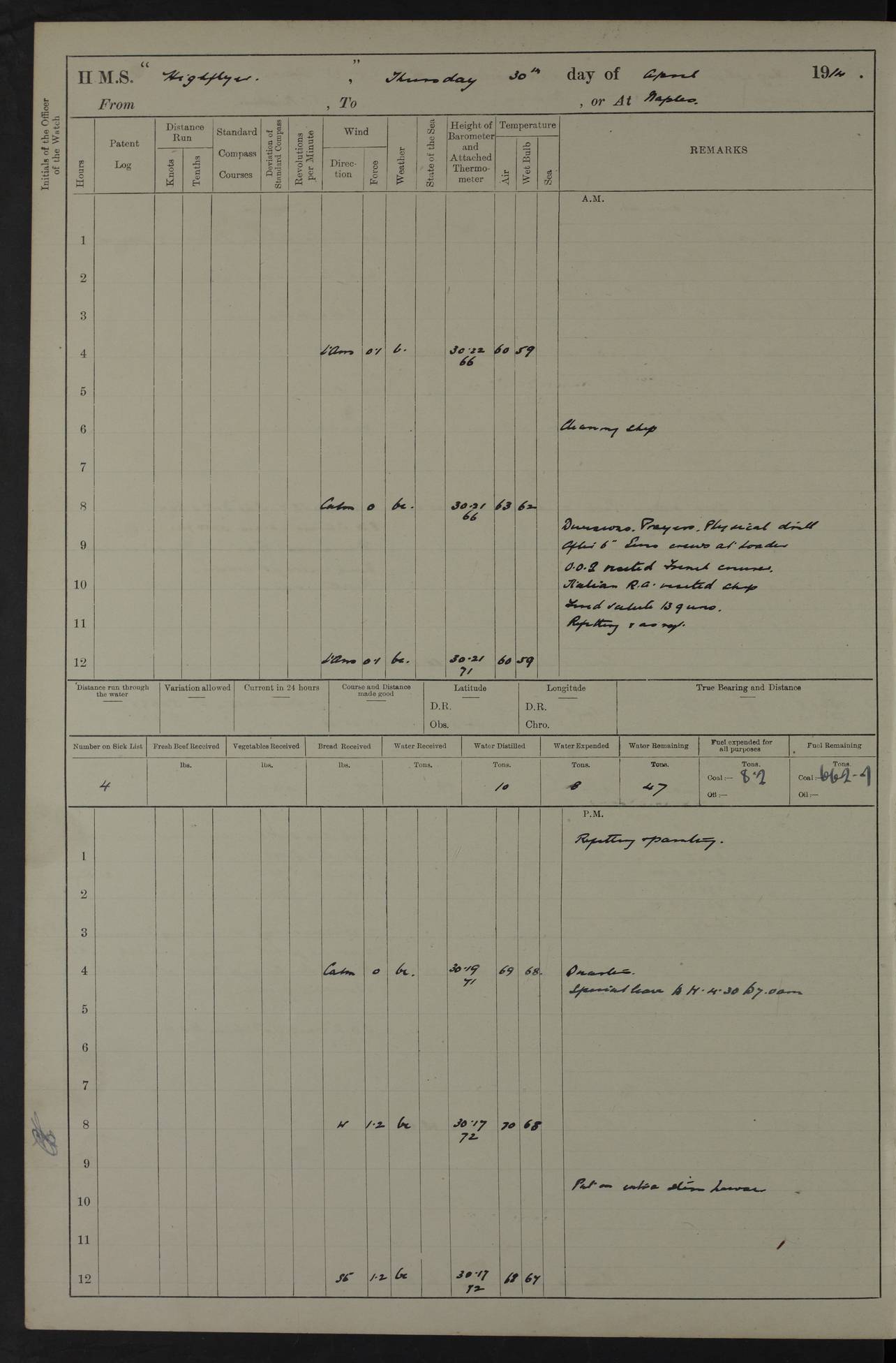 (Maps prepared using Journey Plotter, developed by Maikel. The Plots can only be approximate. They are made by joining-up positions on successive days, and sometimes positions are not given. There will therefore be occasions when the ship appears to have travelled overland) LOG BOOK – JUNE 14TH 1913 TO MAY 31ST 1914 4f960fe4a2fc8e2def00041b: (http://s3.amazonaws.com/oldweather/ADM53-44291/ADM 53-44291-001_0.jpg) 4f960fe5a2fc8e2def00041c: (http://s3.amazonaws.com/oldweather/ADM53-44291/ADM 53-44291-001_1.jpg) 4f960fe5a2fc8e2def00041d: (http://s3.amazonaws.com/oldweather/ADM53-44291/ADM 53-44291-002_0.jpg) 4f960fe5a2fc8e2def00041e: (http://s3.amazonaws.com/oldweather/ADM53-44291/ADM 53-44291-002_1.jpg) LOG of HMS Highflyer Commanded by Captain HT Buller MVO FOR THE PERIOD Commencing Saturday 14th June 1913 Ending Sunday 31st May 1914 Tonnage (displacement): 5600 Extreme length: 350 ft Extreme breadth: 54 ft ENGINES Manufacturer: Fairfield Shipbuilding & Engineering Co, Glasgow IHP: 10.000 Description: Vertical triple expansion 4 cylinders When fixed on board: 1898 BOILERS Manufacturer: Fairfield Shipbuilding & Engineering Co Description: Belleville with economisers 18 in No When made: 1898 When put in vessel: 1898 SCREW PROPELLER Manufacturer: Fairfield Shipbuilding & Engineering Co Description: Twin 3 bladed Admiralty design (bronze) General state of repair: Good 4f960fe6a2fc8e2def00041f: (http://s3.amazonaws.com/oldweather/ADM53-44291/ADM 53-44291-003_0.jpg) [Directions for using the log, figures to indicate the force of the wind and the state of the sea, and letters to denote the state of the weather.] 4f960fe6a2fc8e2def000420: (http://s3.amazonaws.com/oldweather/ADM53-44291/ADM 53-44291-003_1.jpg) Establishment of ship’s company Officers 32 Seamen 164 Boys 24 Marines 50 Engine-room establishment 134 Other non-executive ratings 466 BAROMETER Mercurial or aneroid: Mercurial Name of maker & number: Adie A 577 Height of cistern above sea: 9 feet Thermometers for air temperature Position in ship: Fore bridge Whether in screen: Yes Maker & number: Negretti & Zambra MO/A 9607 dry; from June 14, 1913 to June 1, 1914 MO/A 9603 wet; from June 14, 1913 to June 1, 1914 Thermometer for sea temperature Maker & number: J Hicks A 434; from June 14, 1913 to June 1, 1914 Position of standard compass Fore upper bridge DEVIATION OF STANDARD COMPASS Date obtained: August 29th 1913 Position: Sheerness, No 28 buoy ARMAMENT Fxle: one 6” QF PII S waist: four 6” QF PII P waist: four 6” QF PII OD: two 6” QF PII Battle deck: two 12-pounder 12-cwt SII S waist: three 12-pounder 12-cwt SII P waist: three 12-pounder 12-cwt SII AS deck: 3-pounder QF (Hotchkiss) P waist: 12-pounder 8-cwt field gun Torpedo armament 2 18” tubes BOATS 2 pinnaces, 36 ft sailing 2 cutters 1 gig, 30 ft 1 whaler 1 steam cutter, 32 ft MISCELLANEOUS INFORMATION Draught of water with bunkers full, and complete with provisions, stores and water: forward 22 ft 0 in, aft 23 ft 2 in Load draught, 600 tons coal: forward 19 ft 6 in, aft 21 ft 6 in Number of tons necessary to increase draught 1 inch: 31.5 Number of tons of coal carried (43 cubic feet per ton): a) At load draught, 600 b) With bunkers full, 1132 c) In places other than bunkers, nil Quantity of water carried: a) For boilers, 207 tons b) For drinking 60 tons THE VOYAGES OF HMS HIGHFLYER 1913-1914