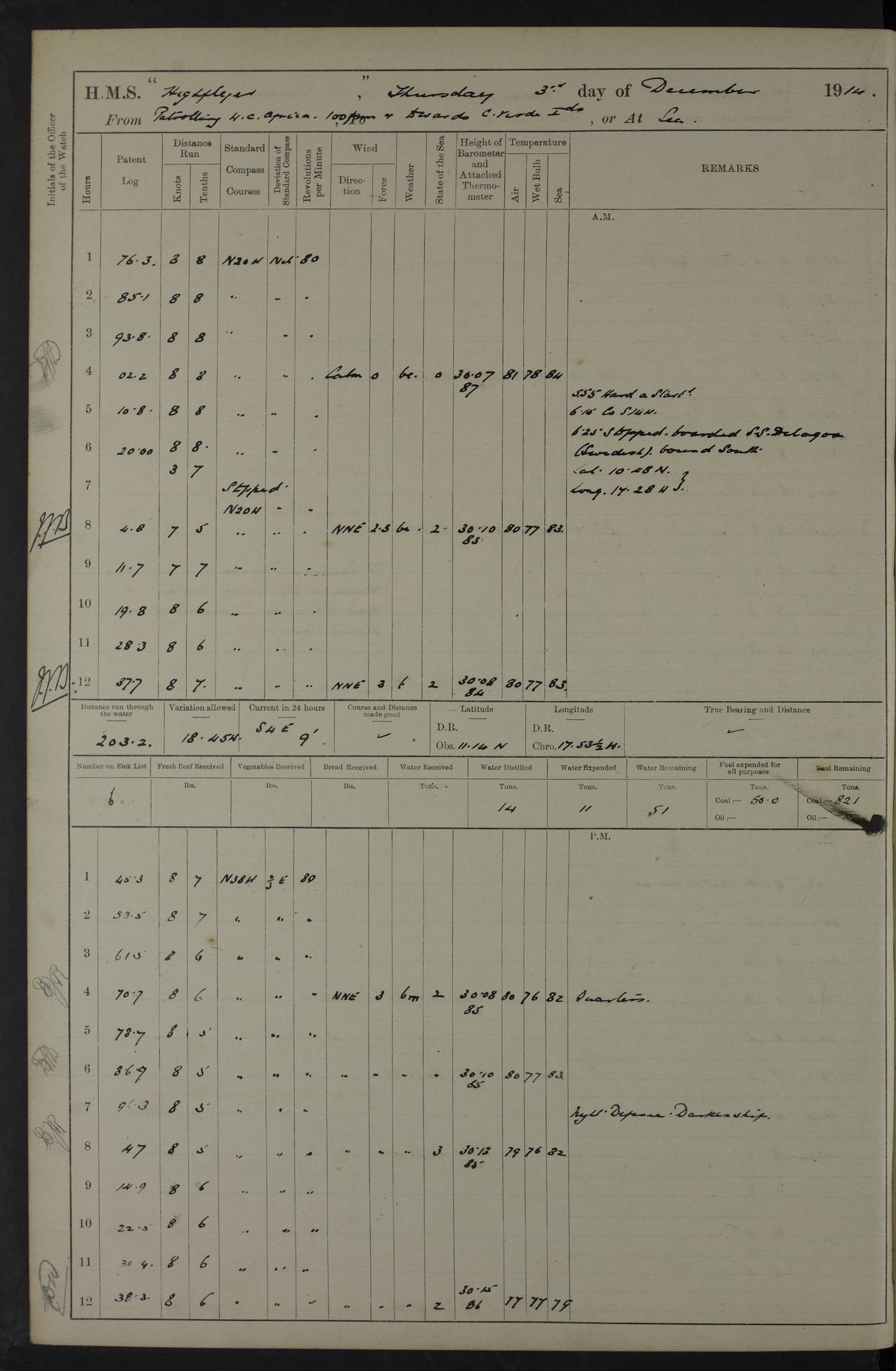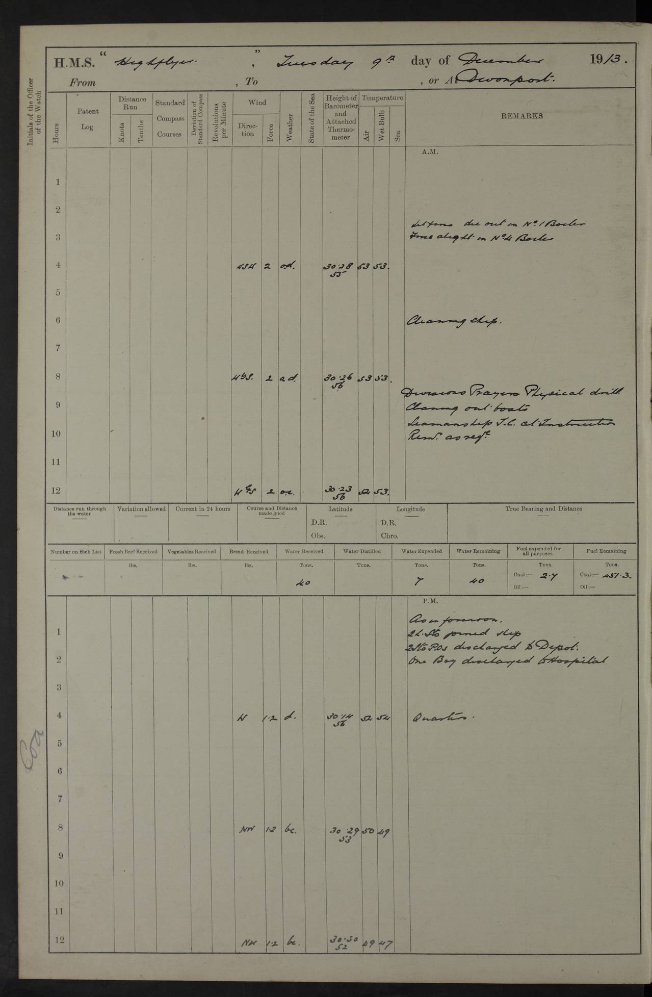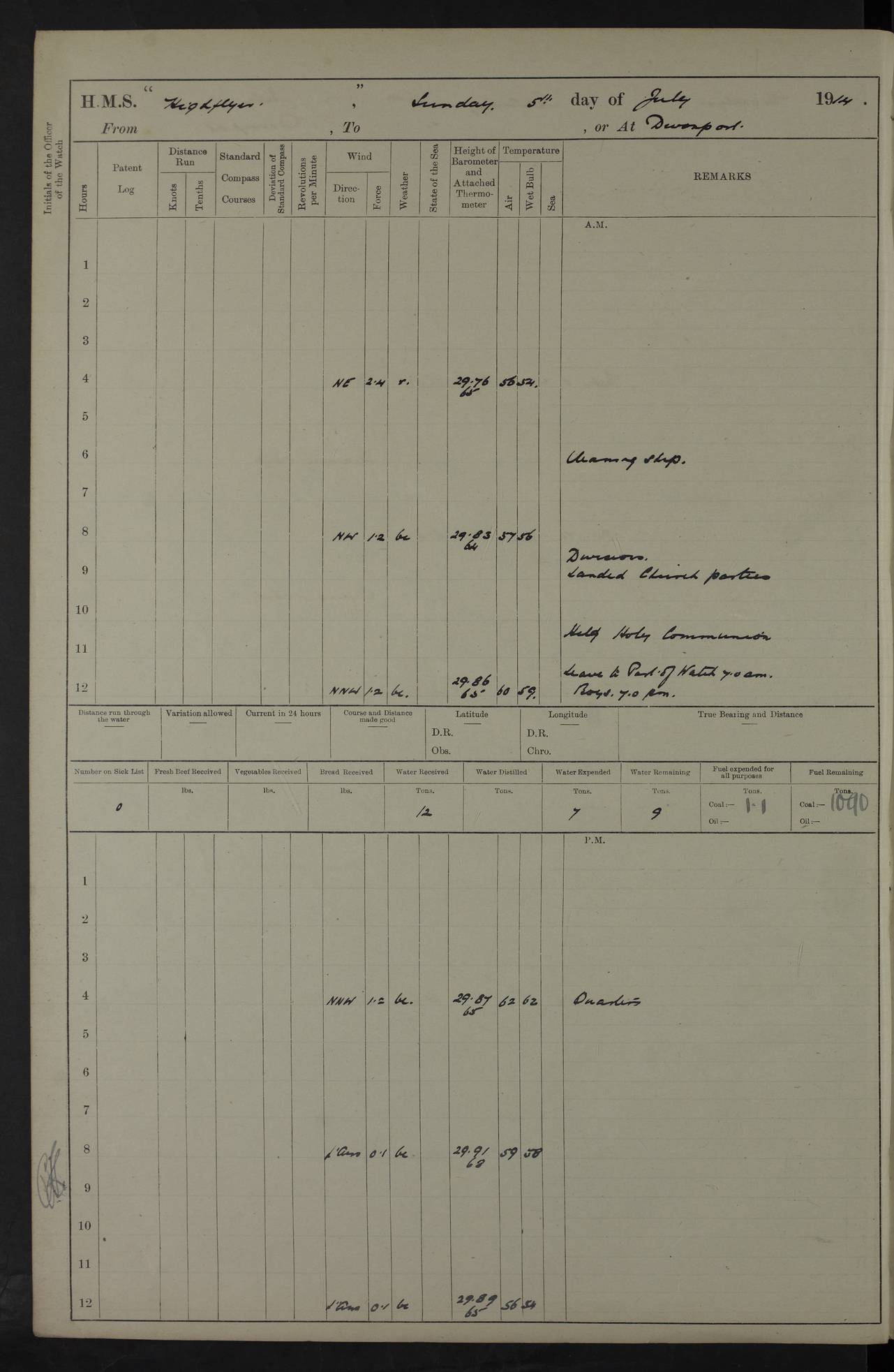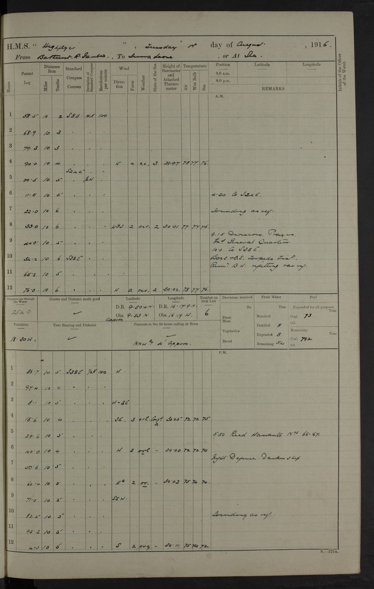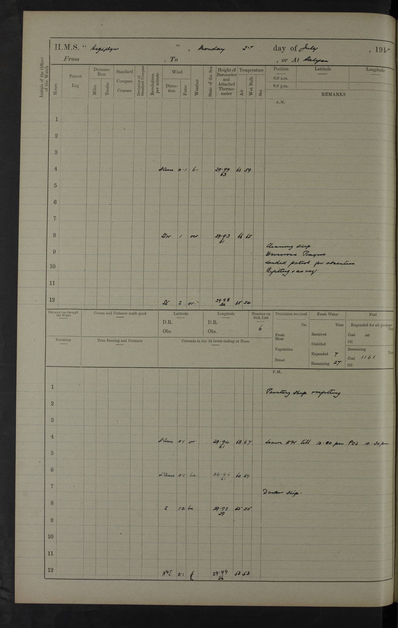 (Maps prepared using Journey Plotter, developed by Maikel. The Plots can only be approximate. They are made by joining-up positions on successive days, and sometimes positions are not given. There will therefore be occasions when the ship appears to have travelled overland) LOG BOOK – JUNE 14TH 1913 TO MAY 31ST 1914 4f960fe4a2fc8e2def00041b: (http://s3.amazonaws.com/oldweather/ADM53-44291/ADM 53-44291-001_0.jpg) 4f960fe5a2fc8e2def00041c: (http://s3.amazonaws.com/oldweather/ADM53-44291/ADM 53-44291-001_1.jpg) 4f960fe5a2fc8e2def00041d: (http://s3.amazonaws.com/oldweather/ADM53-44291/ADM 53-44291-002_0.jpg) 4f960fe5a2fc8e2def00041e: (http://s3.amazonaws.com/oldweather/ADM53-44291/ADM 53-44291-002_1.jpg) LOG of HMS Highflyer Commanded by Captain HT Buller MVO FOR THE PERIOD Commencing Saturday 14th June 1913 Ending Sunday 31st May 1914 Tonnage (displacement): 5600 Extreme length: 350 ft Extreme breadth: 54 ft ENGINES Manufacturer: Fairfield Shipbuilding & Engineering Co, Glasgow IHP: 10.000 Description: Vertical triple expansion 4 cylinders When fixed on board: 1898 BOILERS Manufacturer: Fairfield Shipbuilding & Engineering Co Description: Belleville with economisers 18 in No When made: 1898 When put in vessel: 1898 SCREW PROPELLER Manufacturer: Fairfield Shipbuilding & Engineering Co Description: Twin 3 bladed Admiralty design (bronze) General state of repair: Good 4f960fe6a2fc8e2def00041f: (http://s3.amazonaws.com/oldweather/ADM53-44291/ADM 53-44291-003_0.jpg) [Directions for using the log, figures to indicate the force of the wind and the state of the sea, and letters to denote the state of the weather.] 4f960fe6a2fc8e2def000420: (http://s3.amazonaws.com/oldweather/ADM53-44291/ADM 53-44291-003_1.jpg) Establishment of ship’s company Officers 32 Seamen 164 Boys 24 Marines 50 Engine-room establishment 134 Other non-executive ratings 466 BAROMETER Mercurial or aneroid: Mercurial Name of maker & number: Adie A 577 Height of cistern above sea: 9 feet Thermometers for air temperature Position in ship: Fore bridge Whether in screen: Yes Maker & number: Negretti & Zambra MO/A 9607 dry; from June 14, 1913 to June 1, 1914 MO/A 9603 wet; from June 14, 1913 to June 1, 1914 Thermometer for sea temperature Maker & number: J Hicks A 434; from June 14, 1913 to June 1, 1914 Position of standard compass Fore upper bridge DEVIATION OF STANDARD COMPASS Date obtained: August 29th 1913 Position: Sheerness, No 28 buoy ARMAMENT Fxle: one 6” QF PII S waist: four 6” QF PII P waist: four 6” QF PII OD: two 6” QF PII Battle deck: two 12-pounder 12-cwt SII S waist: three 12-pounder 12-cwt SII P waist: three 12-pounder 12-cwt SII AS deck: 3-pounder QF (Hotchkiss) P waist: 12-pounder 8-cwt field gun Torpedo armament 2 18” tubes BOATS 2 pinnaces, 36 ft sailing 2 cutters 1 gig, 30 ft 1 whaler 1 steam cutter, 32 ft MISCELLANEOUS INFORMATION Draught of water with bunkers full, and complete with provisions, stores and water: forward 22 ft 0 in, aft 23 ft 2 in Load draught, 600 tons coal: forward 19 ft 6 in, aft 21 ft 6 in Number of tons necessary to increase draught 1 inch: 31.5 Number of tons of coal carried (43 cubic feet per ton): a) At load draught, 600 b) With bunkers full, 1132 c) In places other than bunkers, nil Quantity of water carried: a) For boilers, 207 tons b) For drinking 60 tons THE VOYAGES OF HMS HIGHFLYER 1913-1914