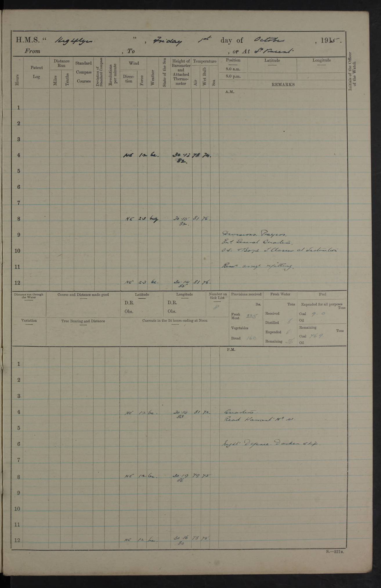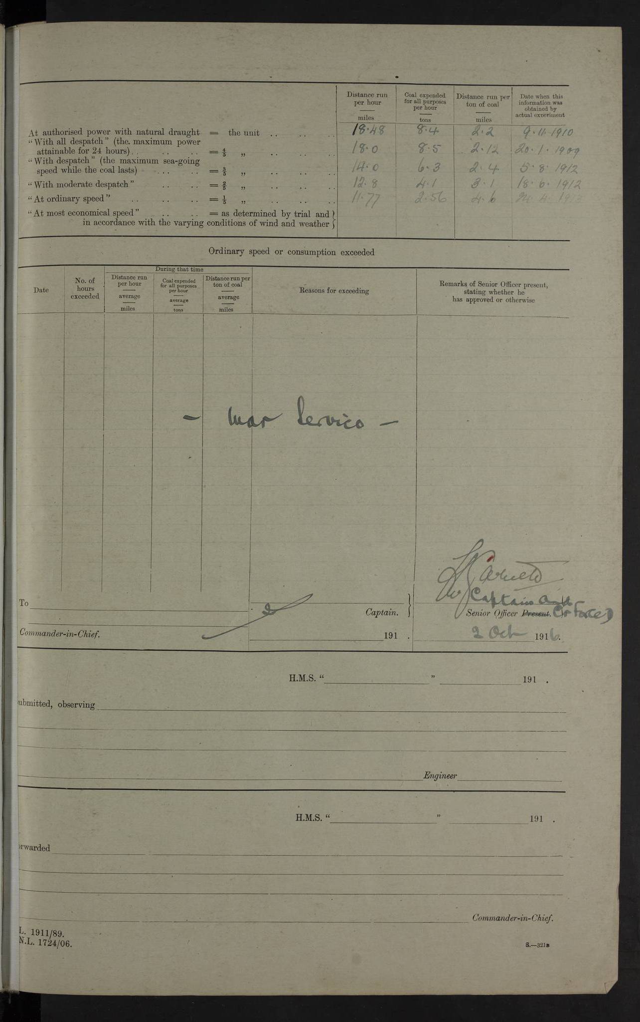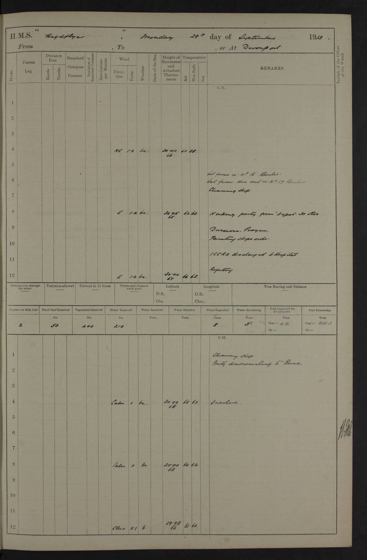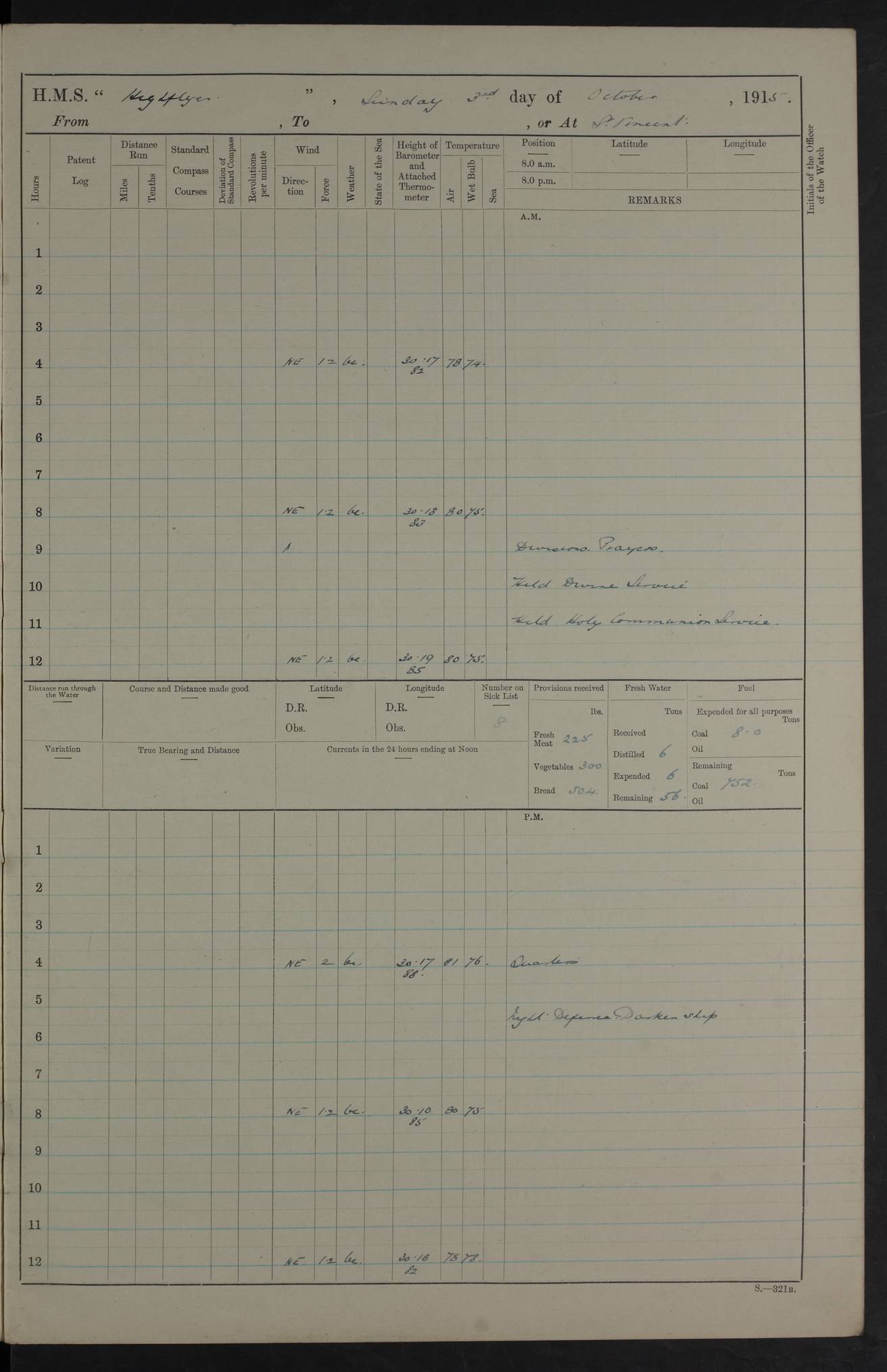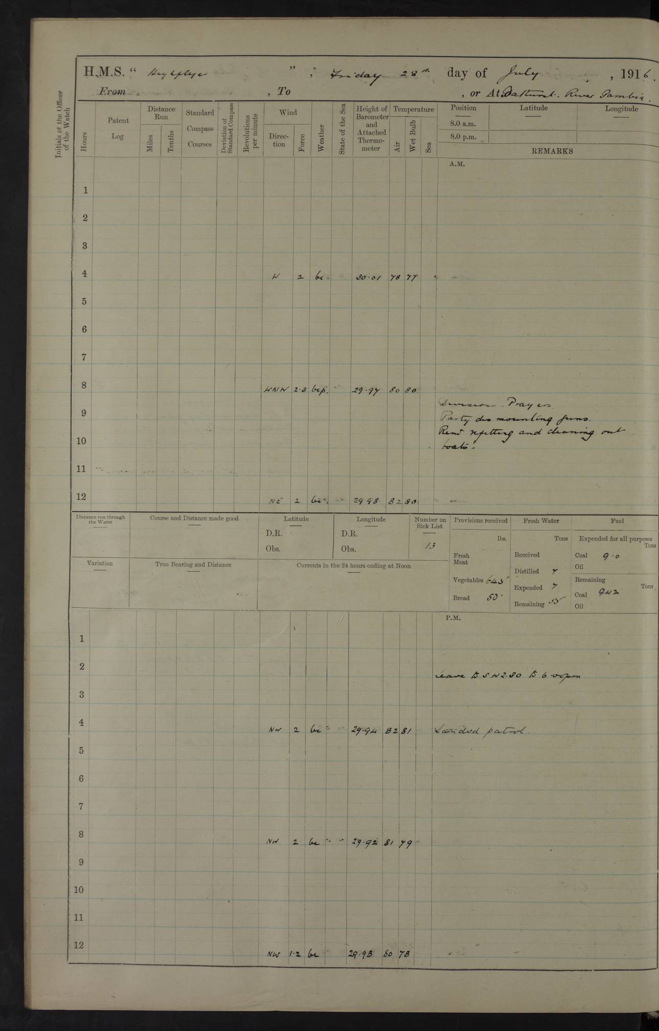 (Maps prepared using Journey Plotter, developed by Maikel. The Plots can only be approximate. They are made by joining-up positions on successive days, and sometimes positions are not given. There will therefore be occasions when the ship appears to have travelled overland) LOG BOOK – JUNE 14TH 1913 TO MAY 31ST 1914 4f960fe4a2fc8e2def00041b: (http://s3.amazonaws.com/oldweather/ADM53-44291/ADM 53-44291-001_0.jpg) 4f960fe5a2fc8e2def00041c: (http://s3.amazonaws.com/oldweather/ADM53-44291/ADM 53-44291-001_1.jpg) 4f960fe5a2fc8e2def00041d: (http://s3.amazonaws.com/oldweather/ADM53-44291/ADM 53-44291-002_0.jpg) 4f960fe5a2fc8e2def00041e: (http://s3.amazonaws.com/oldweather/ADM53-44291/ADM 53-44291-002_1.jpg) LOG of HMS Highflyer Commanded by Captain HT Buller MVO FOR THE PERIOD Commencing Saturday 14th June 1913 Ending Sunday 31st May 1914 Tonnage (displacement): 5600 Extreme length: 350 ft Extreme breadth: 54 ft ENGINES Manufacturer: Fairfield Shipbuilding & Engineering Co, Glasgow IHP: 10.000 Description: Vertical triple expansion 4 cylinders When fixed on board: 1898 BOILERS Manufacturer: Fairfield Shipbuilding & Engineering Co Description: Belleville with economisers 18 in No When made: 1898 When put in vessel: 1898 SCREW PROPELLER Manufacturer: Fairfield Shipbuilding & Engineering Co Description: Twin 3 bladed Admiralty design (bronze) General state of repair: Good 4f960fe6a2fc8e2def00041f: (http://s3.amazonaws.com/oldweather/ADM53-44291/ADM 53-44291-003_0.jpg) [Directions for using the log, figures to indicate the force of the wind and the state of the sea, and letters to denote the state of the weather.] 4f960fe6a2fc8e2def000420: (http://s3.amazonaws.com/oldweather/ADM53-44291/ADM 53-44291-003_1.jpg) Establishment of ship’s company Officers 32 Seamen 164 Boys 24 Marines 50 Engine-room establishment 134 Other non-executive ratings 466 BAROMETER Mercurial or aneroid: Mercurial Name of maker & number: Adie A 577 Height of cistern above sea: 9 feet Thermometers for air temperature Position in ship: Fore bridge Whether in screen: Yes Maker & number: Negretti & Zambra MO/A 9607 dry; from June 14, 1913 to June 1, 1914 MO/A 9603 wet; from June 14, 1913 to June 1, 1914 Thermometer for sea temperature Maker & number: J Hicks A 434; from June 14, 1913 to June 1, 1914 Position of standard compass Fore upper bridge DEVIATION OF STANDARD COMPASS Date obtained: August 29th 1913 Position: Sheerness, No 28 buoy ARMAMENT Fxle: one 6” QF PII S waist: four 6” QF PII P waist: four 6” QF PII OD: two 6” QF PII Battle deck: two 12-pounder 12-cwt SII S waist: three 12-pounder 12-cwt SII P waist: three 12-pounder 12-cwt SII AS deck: 3-pounder QF (Hotchkiss) P waist: 12-pounder 8-cwt field gun Torpedo armament 2 18” tubes BOATS 2 pinnaces, 36 ft sailing 2 cutters 1 gig, 30 ft 1 whaler 1 steam cutter, 32 ft MISCELLANEOUS INFORMATION Draught of water with bunkers full, and complete with provisions, stores and water: forward 22 ft 0 in, aft 23 ft 2 in Load draught, 600 tons coal: forward 19 ft 6 in, aft 21 ft 6 in Number of tons necessary to increase draught 1 inch: 31.5 Number of tons of coal carried (43 cubic feet per ton): a) At load draught, 600 b) With bunkers full, 1132 c) In places other than bunkers, nil Quantity of water carried: a) For boilers, 207 tons b) For drinking 60 tons THE VOYAGES OF HMS HIGHFLYER 1913-1914