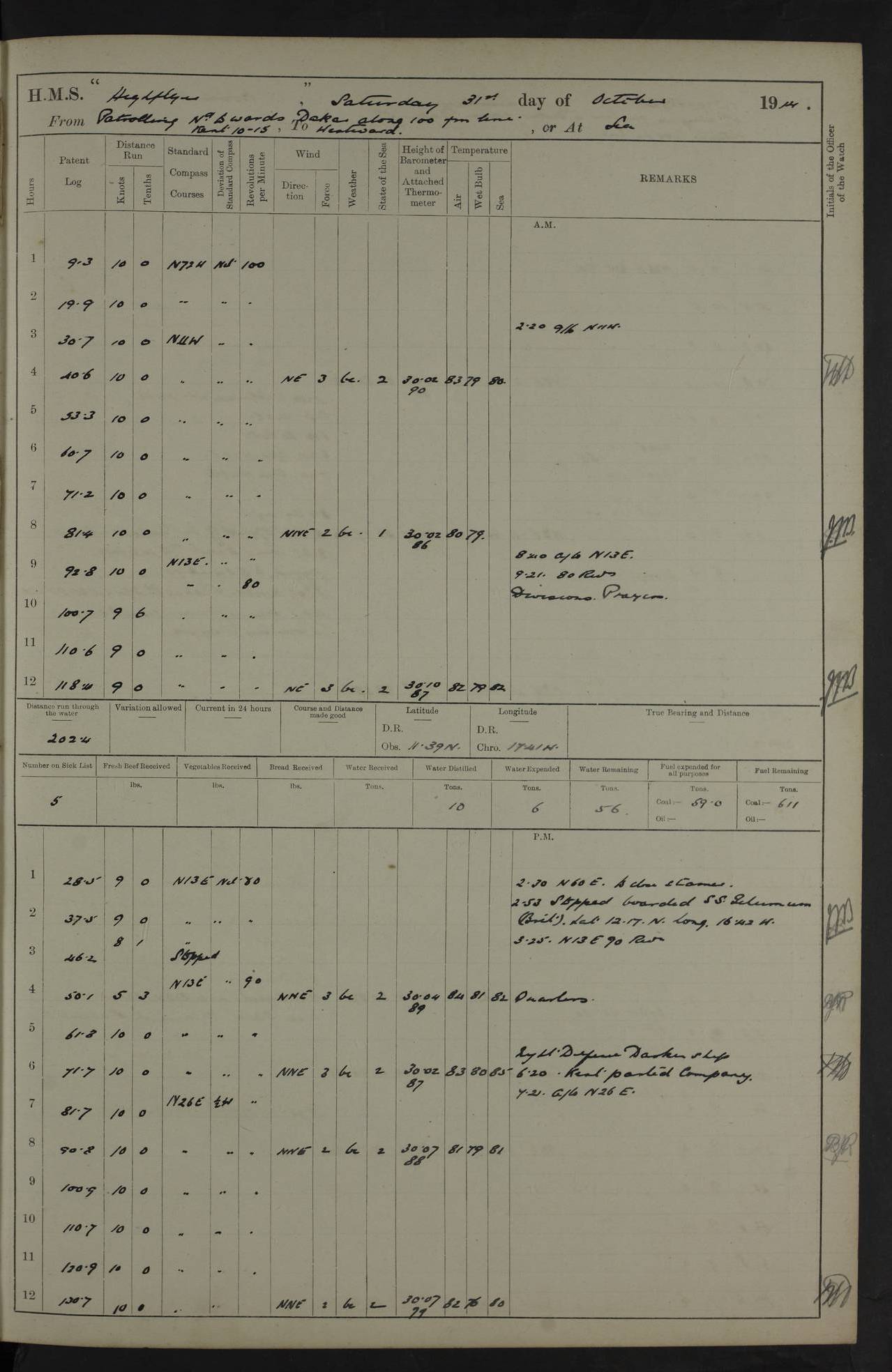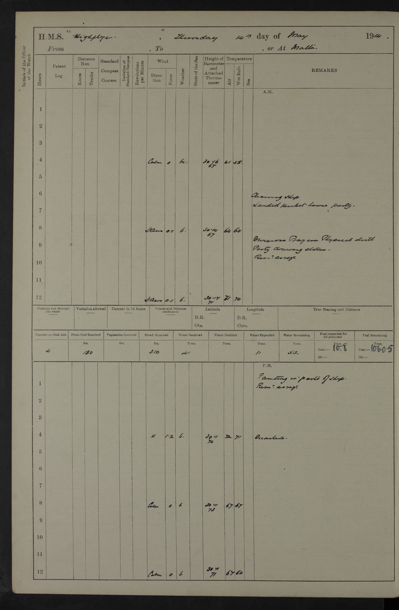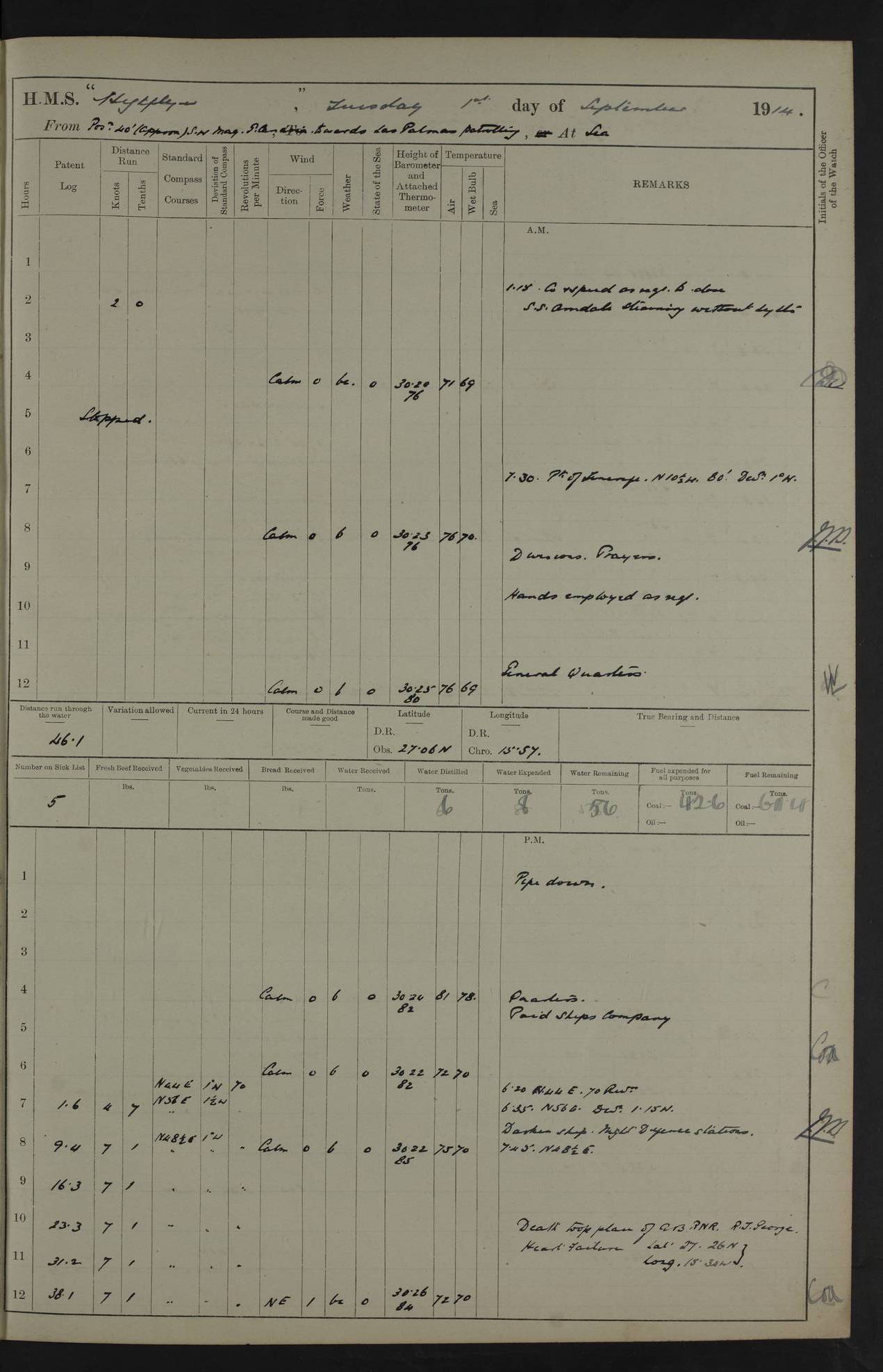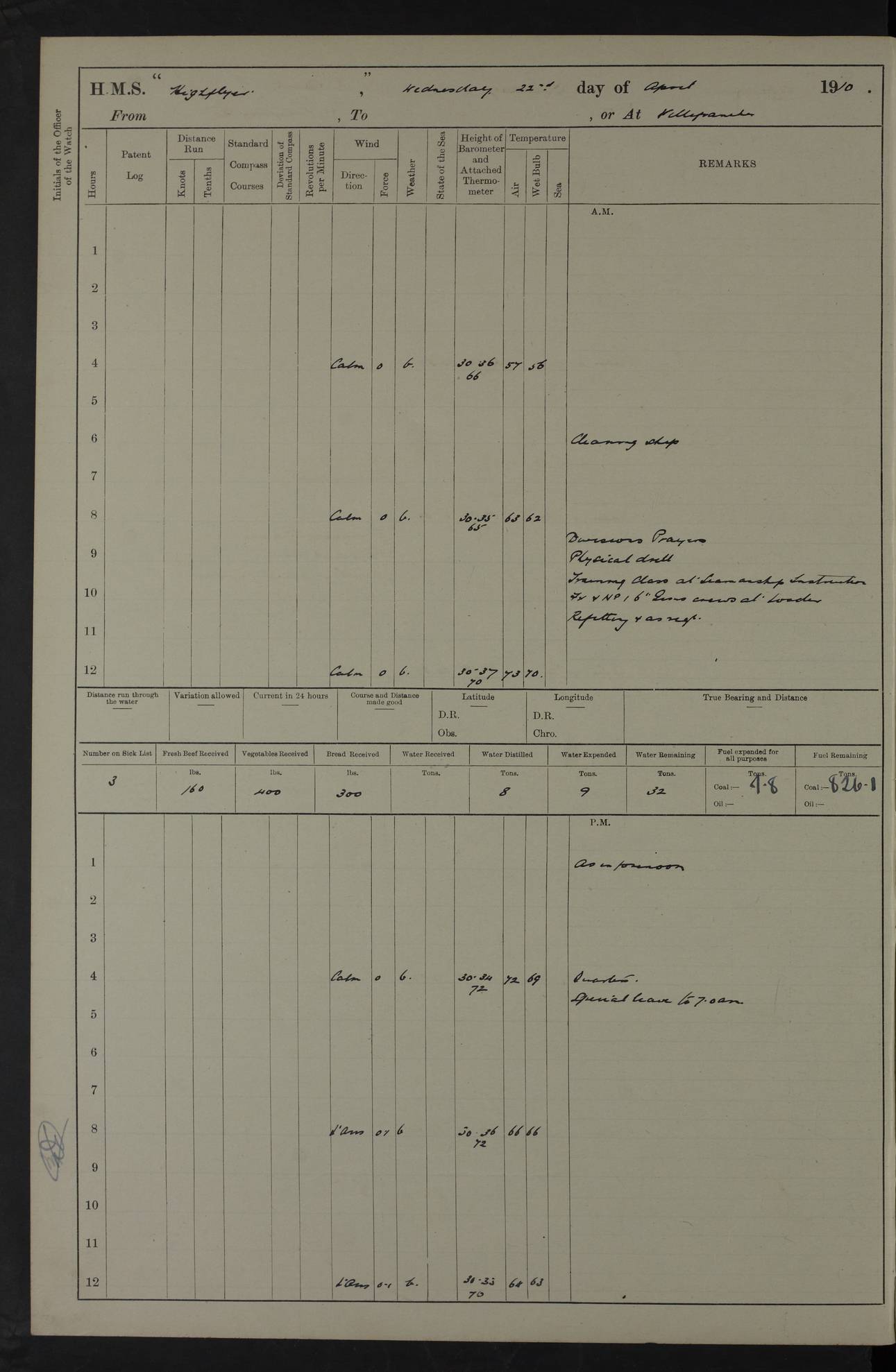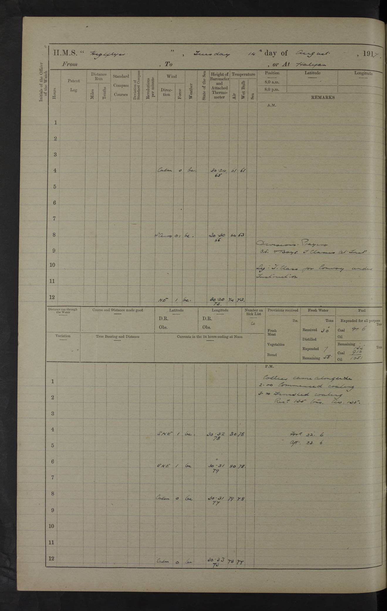 (Maps prepared using Journey Plotter, developed by Maikel. The Plots can only be approximate. They are made by joining-up positions on successive days, and sometimes positions are not given. There will therefore be occasions when the ship appears to have travelled overland) LOG BOOK – JUNE 14TH 1913 TO MAY 31ST 1914 4f960fe4a2fc8e2def00041b: (http://s3.amazonaws.com/oldweather/ADM53-44291/ADM 53-44291-001_0.jpg) 4f960fe5a2fc8e2def00041c: (http://s3.amazonaws.com/oldweather/ADM53-44291/ADM 53-44291-001_1.jpg) 4f960fe5a2fc8e2def00041d: (http://s3.amazonaws.com/oldweather/ADM53-44291/ADM 53-44291-002_0.jpg) 4f960fe5a2fc8e2def00041e: (http://s3.amazonaws.com/oldweather/ADM53-44291/ADM 53-44291-002_1.jpg) LOG of HMS Highflyer Commanded by Captain HT Buller MVO FOR THE PERIOD Commencing Saturday 14th June 1913 Ending Sunday 31st May 1914 Tonnage (displacement): 5600 Extreme length: 350 ft Extreme breadth: 54 ft ENGINES Manufacturer: Fairfield Shipbuilding & Engineering Co, Glasgow IHP: 10.000 Description: Vertical triple expansion 4 cylinders When fixed on board: 1898 BOILERS Manufacturer: Fairfield Shipbuilding & Engineering Co Description: Belleville with economisers 18 in No When made: 1898 When put in vessel: 1898 SCREW PROPELLER Manufacturer: Fairfield Shipbuilding & Engineering Co Description: Twin 3 bladed Admiralty design (bronze) General state of repair: Good 4f960fe6a2fc8e2def00041f: (http://s3.amazonaws.com/oldweather/ADM53-44291/ADM 53-44291-003_0.jpg) [Directions for using the log, figures to indicate the force of the wind and the state of the sea, and letters to denote the state of the weather.] 4f960fe6a2fc8e2def000420: (http://s3.amazonaws.com/oldweather/ADM53-44291/ADM 53-44291-003_1.jpg) Establishment of ship’s company Officers 32 Seamen 164 Boys 24 Marines 50 Engine-room establishment 134 Other non-executive ratings 466 BAROMETER Mercurial or aneroid: Mercurial Name of maker & number: Adie A 577 Height of cistern above sea: 9 feet Thermometers for air temperature Position in ship: Fore bridge Whether in screen: Yes Maker & number: Negretti & Zambra MO/A 9607 dry; from June 14, 1913 to June 1, 1914 MO/A 9603 wet; from June 14, 1913 to June 1, 1914 Thermometer for sea temperature Maker & number: J Hicks A 434; from June 14, 1913 to June 1, 1914 Position of standard compass Fore upper bridge DEVIATION OF STANDARD COMPASS Date obtained: August 29th 1913 Position: Sheerness, No 28 buoy ARMAMENT Fxle: one 6” QF PII S waist: four 6” QF PII P waist: four 6” QF PII OD: two 6” QF PII Battle deck: two 12-pounder 12-cwt SII S waist: three 12-pounder 12-cwt SII P waist: three 12-pounder 12-cwt SII AS deck: 3-pounder QF (Hotchkiss) P waist: 12-pounder 8-cwt field gun Torpedo armament 2 18” tubes BOATS 2 pinnaces, 36 ft sailing 2 cutters 1 gig, 30 ft 1 whaler 1 steam cutter, 32 ft MISCELLANEOUS INFORMATION Draught of water with bunkers full, and complete with provisions, stores and water: forward 22 ft 0 in, aft 23 ft 2 in Load draught, 600 tons coal: forward 19 ft 6 in, aft 21 ft 6 in Number of tons necessary to increase draught 1 inch: 31.5 Number of tons of coal carried (43 cubic feet per ton): a) At load draught, 600 b) With bunkers full, 1132 c) In places other than bunkers, nil Quantity of water carried: a) For boilers, 207 tons b) For drinking 60 tons THE VOYAGES OF HMS HIGHFLYER 1913-1914