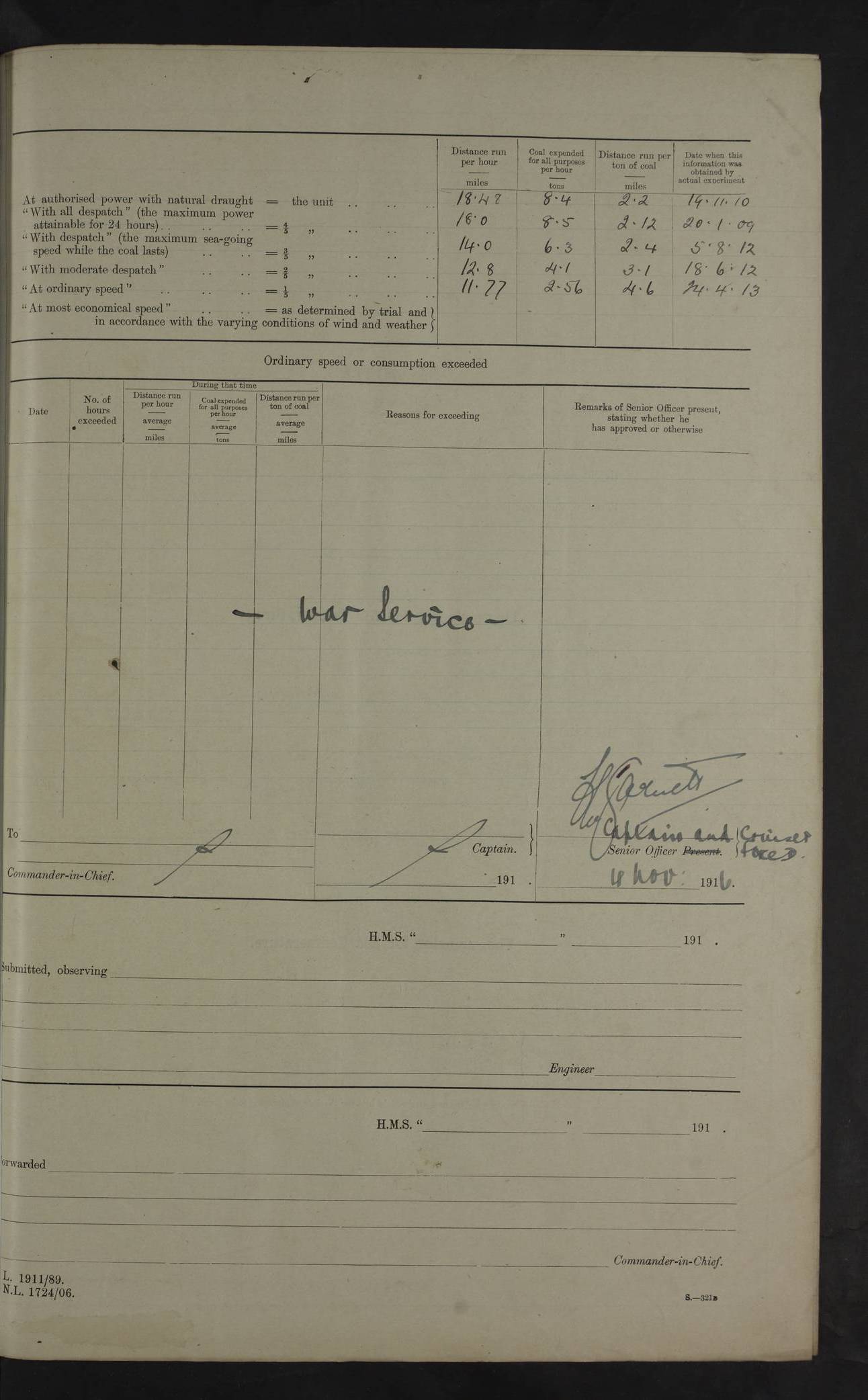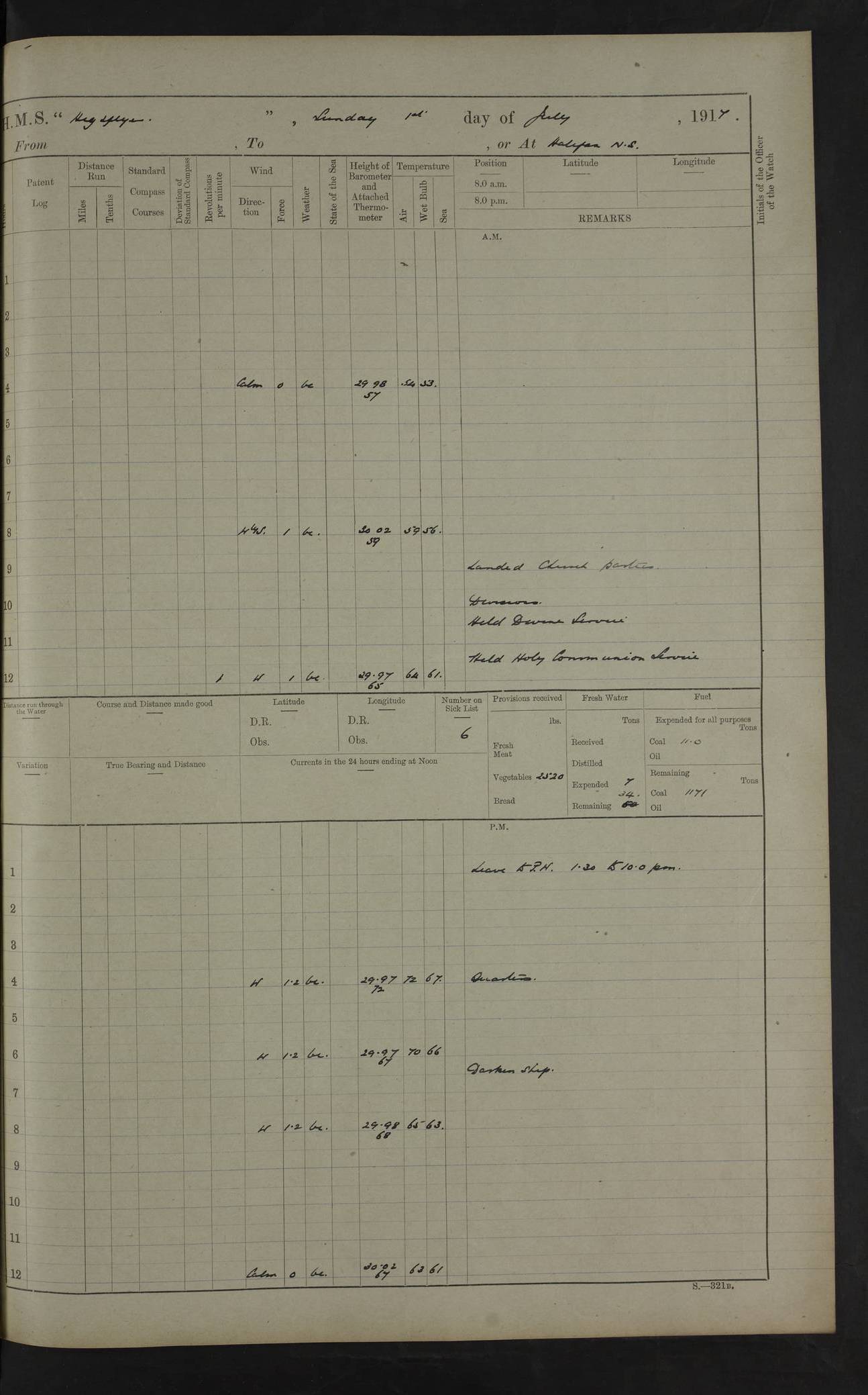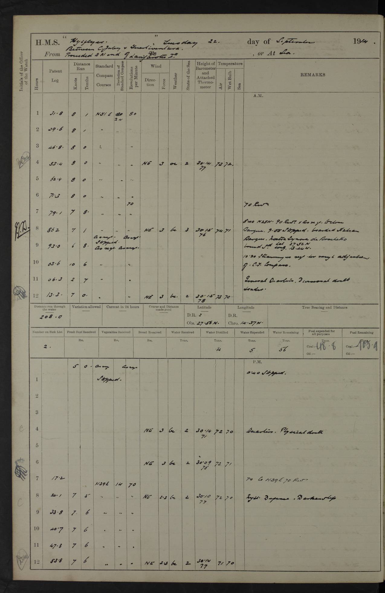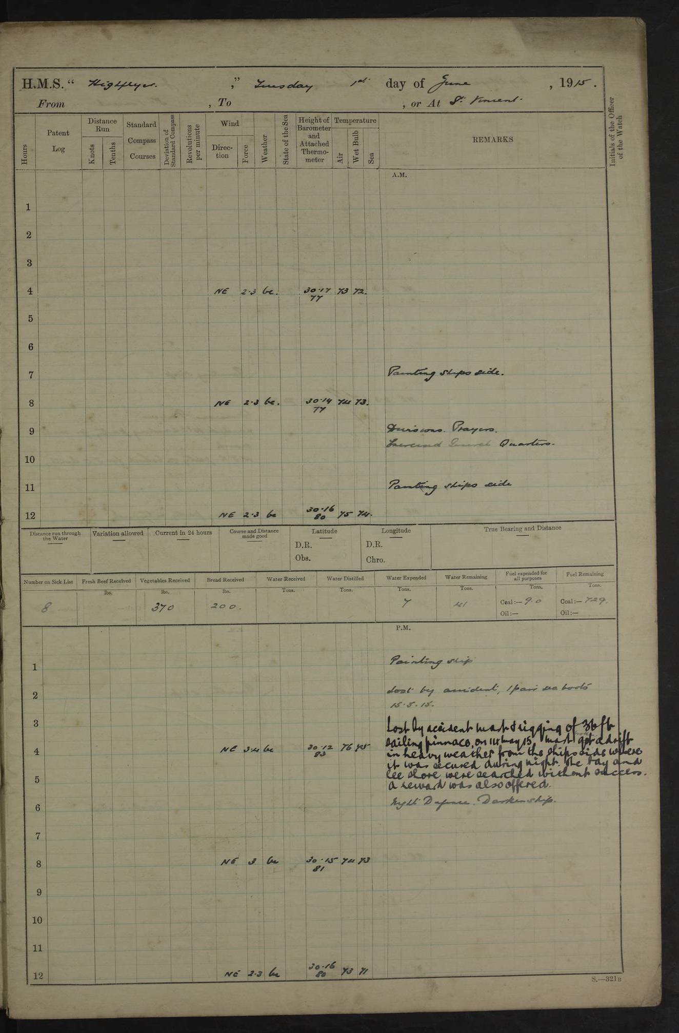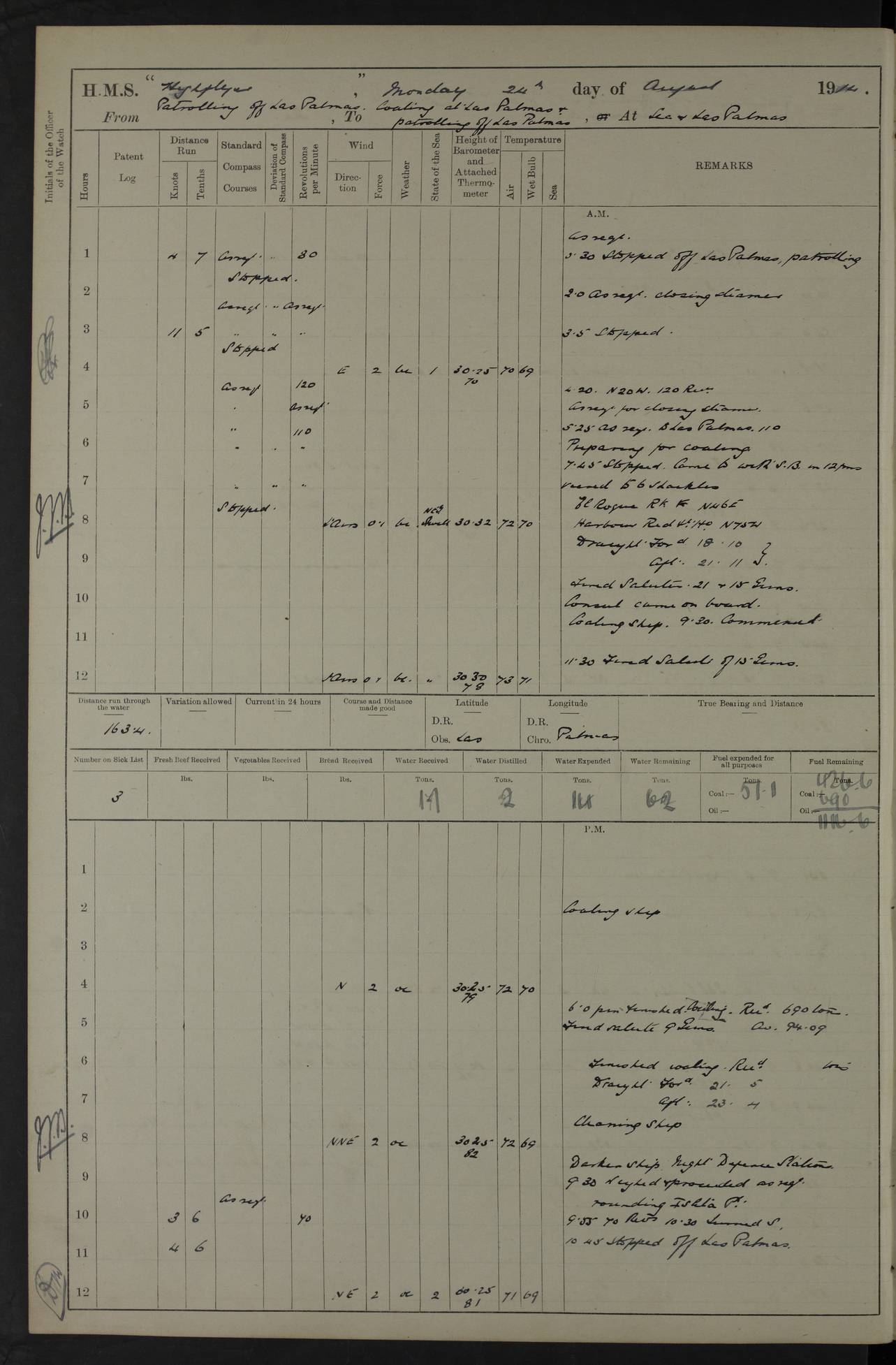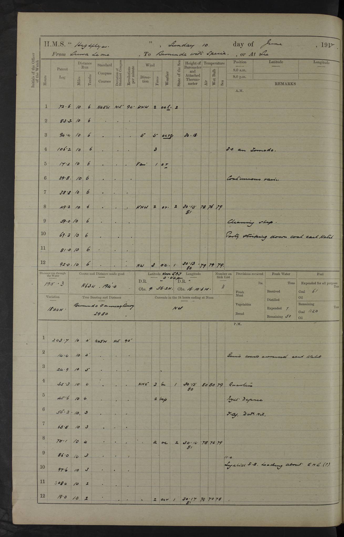 (Maps prepared using Journey Plotter, developed by Maikel. The Plots can only be approximate. They are made by joining-up positions on successive days, and sometimes positions are not given. There will therefore be occasions when the ship appears to have travelled overland) LOG BOOK – JUNE 14TH 1913 TO MAY 31ST 1914 4f960fe4a2fc8e2def00041b: (http://s3.amazonaws.com/oldweather/ADM53-44291/ADM 53-44291-001_0.jpg) 4f960fe5a2fc8e2def00041c: (http://s3.amazonaws.com/oldweather/ADM53-44291/ADM 53-44291-001_1.jpg) 4f960fe5a2fc8e2def00041d: (http://s3.amazonaws.com/oldweather/ADM53-44291/ADM 53-44291-002_0.jpg) 4f960fe5a2fc8e2def00041e: (http://s3.amazonaws.com/oldweather/ADM53-44291/ADM 53-44291-002_1.jpg) LOG of HMS Highflyer Commanded by Captain HT Buller MVO FOR THE PERIOD Commencing Saturday 14th June 1913 Ending Sunday 31st May 1914 Tonnage (displacement): 5600 Extreme length: 350 ft Extreme breadth: 54 ft ENGINES Manufacturer: Fairfield Shipbuilding & Engineering Co, Glasgow IHP: 10.000 Description: Vertical triple expansion 4 cylinders When fixed on board: 1898 BOILERS Manufacturer: Fairfield Shipbuilding & Engineering Co Description: Belleville with economisers 18 in No When made: 1898 When put in vessel: 1898 SCREW PROPELLER Manufacturer: Fairfield Shipbuilding & Engineering Co Description: Twin 3 bladed Admiralty design (bronze) General state of repair: Good 4f960fe6a2fc8e2def00041f: (http://s3.amazonaws.com/oldweather/ADM53-44291/ADM 53-44291-003_0.jpg) [Directions for using the log, figures to indicate the force of the wind and the state of the sea, and letters to denote the state of the weather.] 4f960fe6a2fc8e2def000420: (http://s3.amazonaws.com/oldweather/ADM53-44291/ADM 53-44291-003_1.jpg) Establishment of ship’s company Officers 32 Seamen 164 Boys 24 Marines 50 Engine-room establishment 134 Other non-executive ratings 466 BAROMETER Mercurial or aneroid: Mercurial Name of maker & number: Adie A 577 Height of cistern above sea: 9 feet Thermometers for air temperature Position in ship: Fore bridge Whether in screen: Yes Maker & number: Negretti & Zambra MO/A 9607 dry; from June 14, 1913 to June 1, 1914 MO/A 9603 wet; from June 14, 1913 to June 1, 1914 Thermometer for sea temperature Maker & number: J Hicks A 434; from June 14, 1913 to June 1, 1914 Position of standard compass Fore upper bridge DEVIATION OF STANDARD COMPASS Date obtained: August 29th 1913 Position: Sheerness, No 28 buoy ARMAMENT Fxle: one 6” QF PII S waist: four 6” QF PII P waist: four 6” QF PII OD: two 6” QF PII Battle deck: two 12-pounder 12-cwt SII S waist: three 12-pounder 12-cwt SII P waist: three 12-pounder 12-cwt SII AS deck: 3-pounder QF (Hotchkiss) P waist: 12-pounder 8-cwt field gun Torpedo armament 2 18” tubes BOATS 2 pinnaces, 36 ft sailing 2 cutters 1 gig, 30 ft 1 whaler 1 steam cutter, 32 ft MISCELLANEOUS INFORMATION Draught of water with bunkers full, and complete with provisions, stores and water: forward 22 ft 0 in, aft 23 ft 2 in Load draught, 600 tons coal: forward 19 ft 6 in, aft 21 ft 6 in Number of tons necessary to increase draught 1 inch: 31.5 Number of tons of coal carried (43 cubic feet per ton): a) At load draught, 600 b) With bunkers full, 1132 c) In places other than bunkers, nil Quantity of water carried: a) For boilers, 207 tons b) For drinking 60 tons THE VOYAGES OF HMS HIGHFLYER 1913-1914