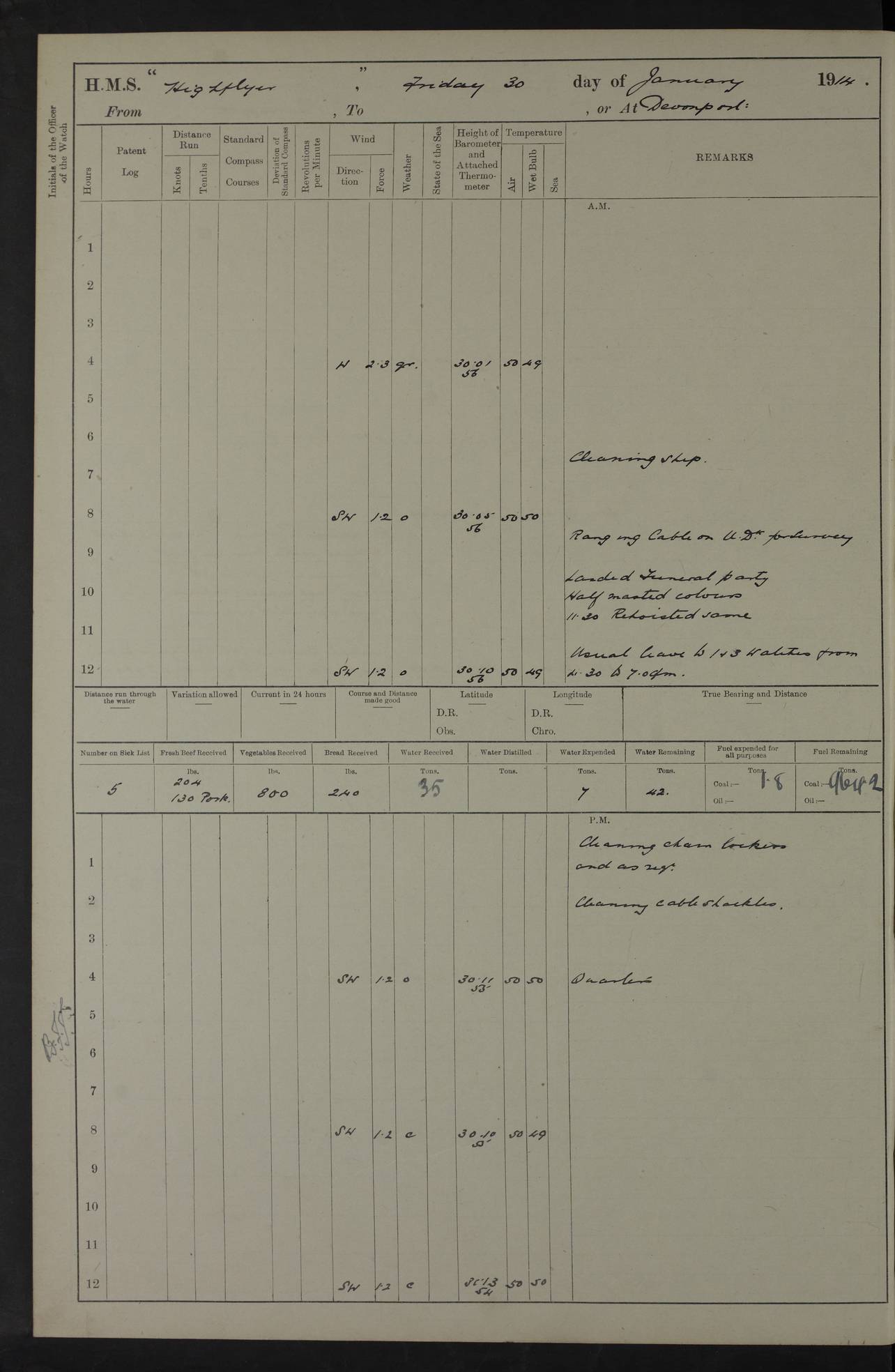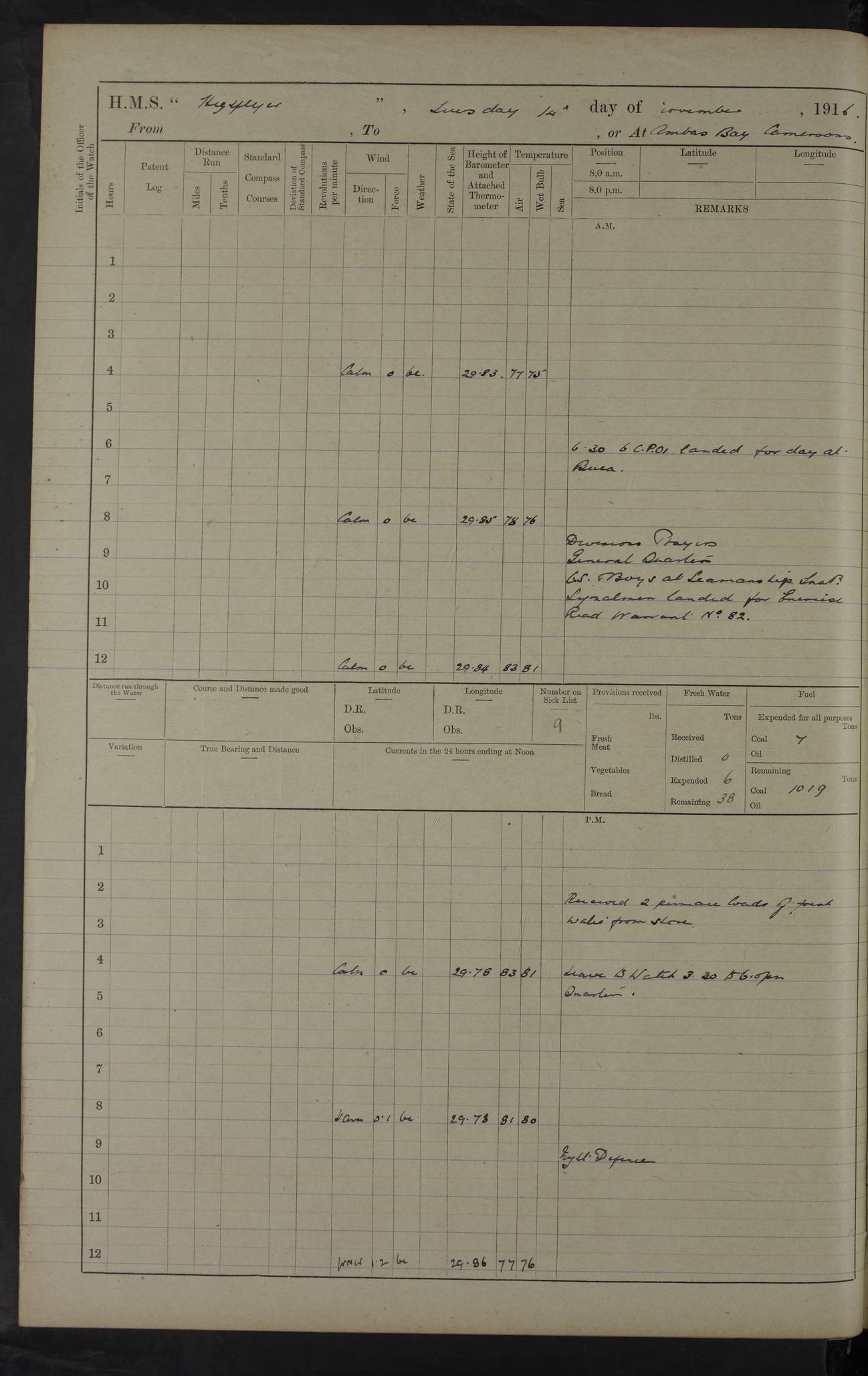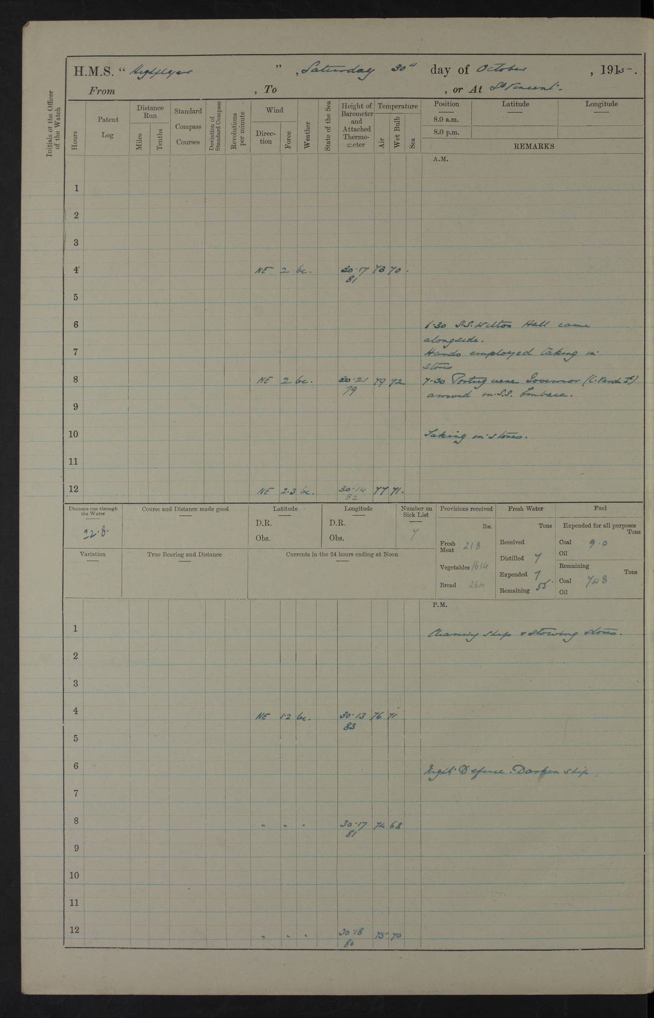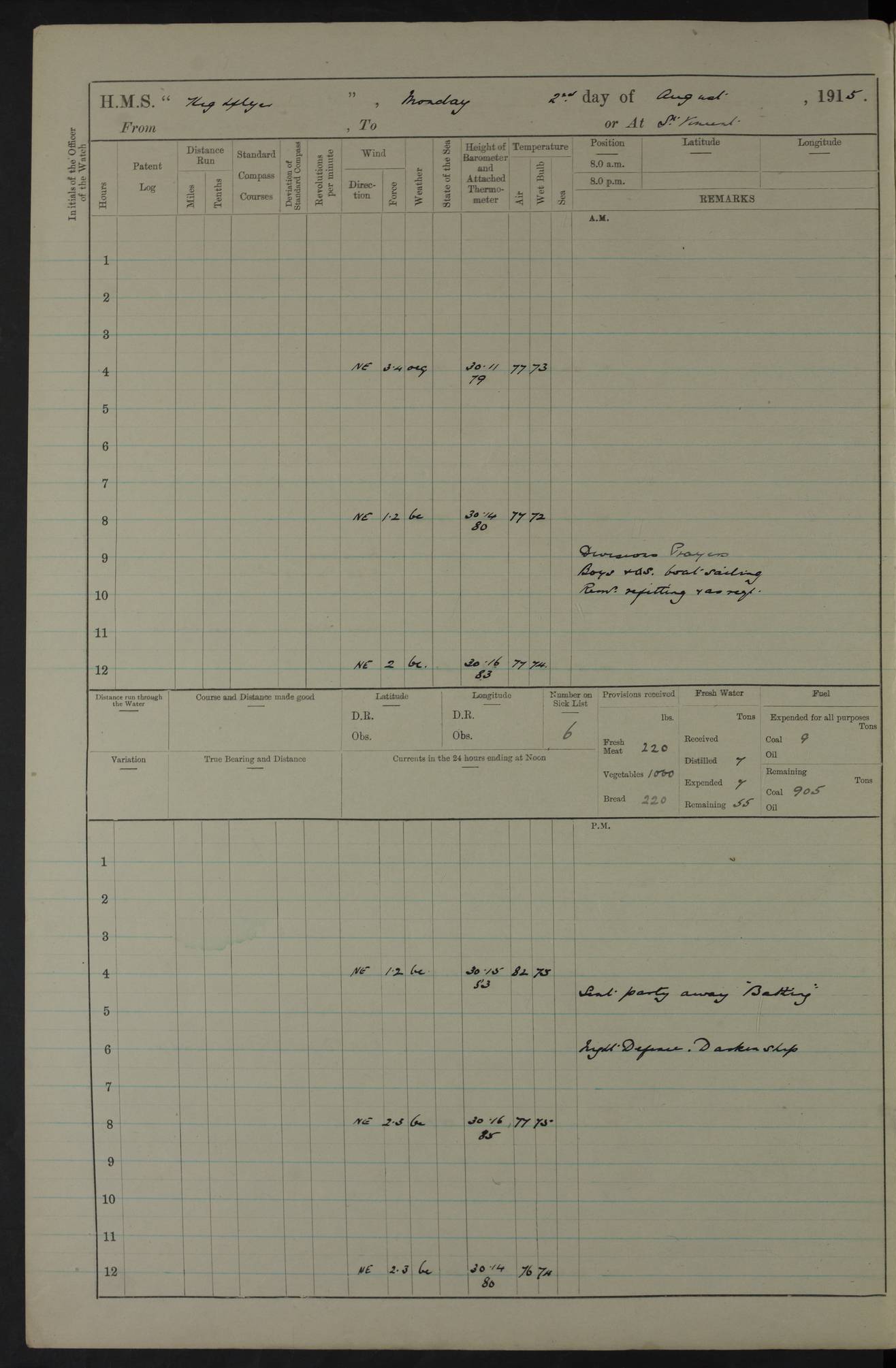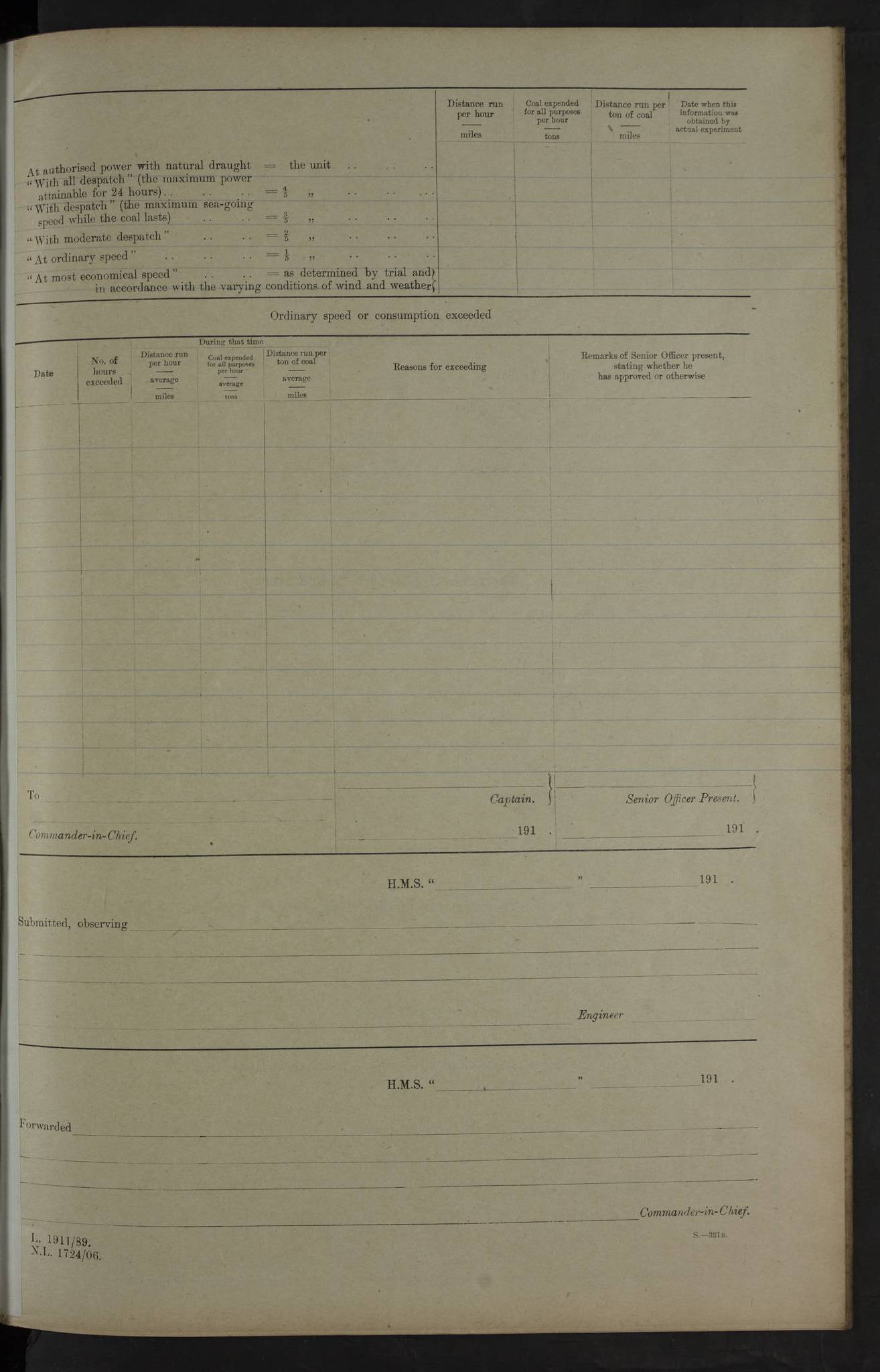 (Maps prepared using Journey Plotter, developed by Maikel. The Plots can only be approximate. They are made by joining-up positions on successive days, and sometimes positions are not given. There will therefore be occasions when the ship appears to have travelled overland) LOG BOOK – JUNE 14TH 1913 TO MAY 31ST 1914 4f960fe4a2fc8e2def00041b: (http://s3.amazonaws.com/oldweather/ADM53-44291/ADM 53-44291-001_0.jpg) 4f960fe5a2fc8e2def00041c: (http://s3.amazonaws.com/oldweather/ADM53-44291/ADM 53-44291-001_1.jpg) 4f960fe5a2fc8e2def00041d: (http://s3.amazonaws.com/oldweather/ADM53-44291/ADM 53-44291-002_0.jpg) 4f960fe5a2fc8e2def00041e: (http://s3.amazonaws.com/oldweather/ADM53-44291/ADM 53-44291-002_1.jpg) LOG of HMS Highflyer Commanded by Captain HT Buller MVO FOR THE PERIOD Commencing Saturday 14th June 1913 Ending Sunday 31st May 1914 Tonnage (displacement): 5600 Extreme length: 350 ft Extreme breadth: 54 ft ENGINES Manufacturer: Fairfield Shipbuilding & Engineering Co, Glasgow IHP: 10.000 Description: Vertical triple expansion 4 cylinders When fixed on board: 1898 BOILERS Manufacturer: Fairfield Shipbuilding & Engineering Co Description: Belleville with economisers 18 in No When made: 1898 When put in vessel: 1898 SCREW PROPELLER Manufacturer: Fairfield Shipbuilding & Engineering Co Description: Twin 3 bladed Admiralty design (bronze) General state of repair: Good 4f960fe6a2fc8e2def00041f: (http://s3.amazonaws.com/oldweather/ADM53-44291/ADM 53-44291-003_0.jpg) [Directions for using the log, figures to indicate the force of the wind and the state of the sea, and letters to denote the state of the weather.] 4f960fe6a2fc8e2def000420: (http://s3.amazonaws.com/oldweather/ADM53-44291/ADM 53-44291-003_1.jpg) Establishment of ship’s company Officers 32 Seamen 164 Boys 24 Marines 50 Engine-room establishment 134 Other non-executive ratings 466 BAROMETER Mercurial or aneroid: Mercurial Name of maker & number: Adie A 577 Height of cistern above sea: 9 feet Thermometers for air temperature Position in ship: Fore bridge Whether in screen: Yes Maker & number: Negretti & Zambra MO/A 9607 dry; from June 14, 1913 to June 1, 1914 MO/A 9603 wet; from June 14, 1913 to June 1, 1914 Thermometer for sea temperature Maker & number: J Hicks A 434; from June 14, 1913 to June 1, 1914 Position of standard compass Fore upper bridge DEVIATION OF STANDARD COMPASS Date obtained: August 29th 1913 Position: Sheerness, No 28 buoy ARMAMENT Fxle: one 6” QF PII S waist: four 6” QF PII P waist: four 6” QF PII OD: two 6” QF PII Battle deck: two 12-pounder 12-cwt SII S waist: three 12-pounder 12-cwt SII P waist: three 12-pounder 12-cwt SII AS deck: 3-pounder QF (Hotchkiss) P waist: 12-pounder 8-cwt field gun Torpedo armament 2 18” tubes BOATS 2 pinnaces, 36 ft sailing 2 cutters 1 gig, 30 ft 1 whaler 1 steam cutter, 32 ft MISCELLANEOUS INFORMATION Draught of water with bunkers full, and complete with provisions, stores and water: forward 22 ft 0 in, aft 23 ft 2 in Load draught, 600 tons coal: forward 19 ft 6 in, aft 21 ft 6 in Number of tons necessary to increase draught 1 inch: 31.5 Number of tons of coal carried (43 cubic feet per ton): a) At load draught, 600 b) With bunkers full, 1132 c) In places other than bunkers, nil Quantity of water carried: a) For boilers, 207 tons b) For drinking 60 tons THE VOYAGES OF HMS HIGHFLYER 1913-1914