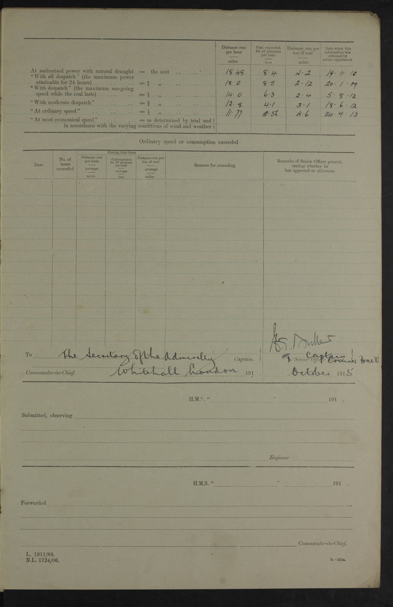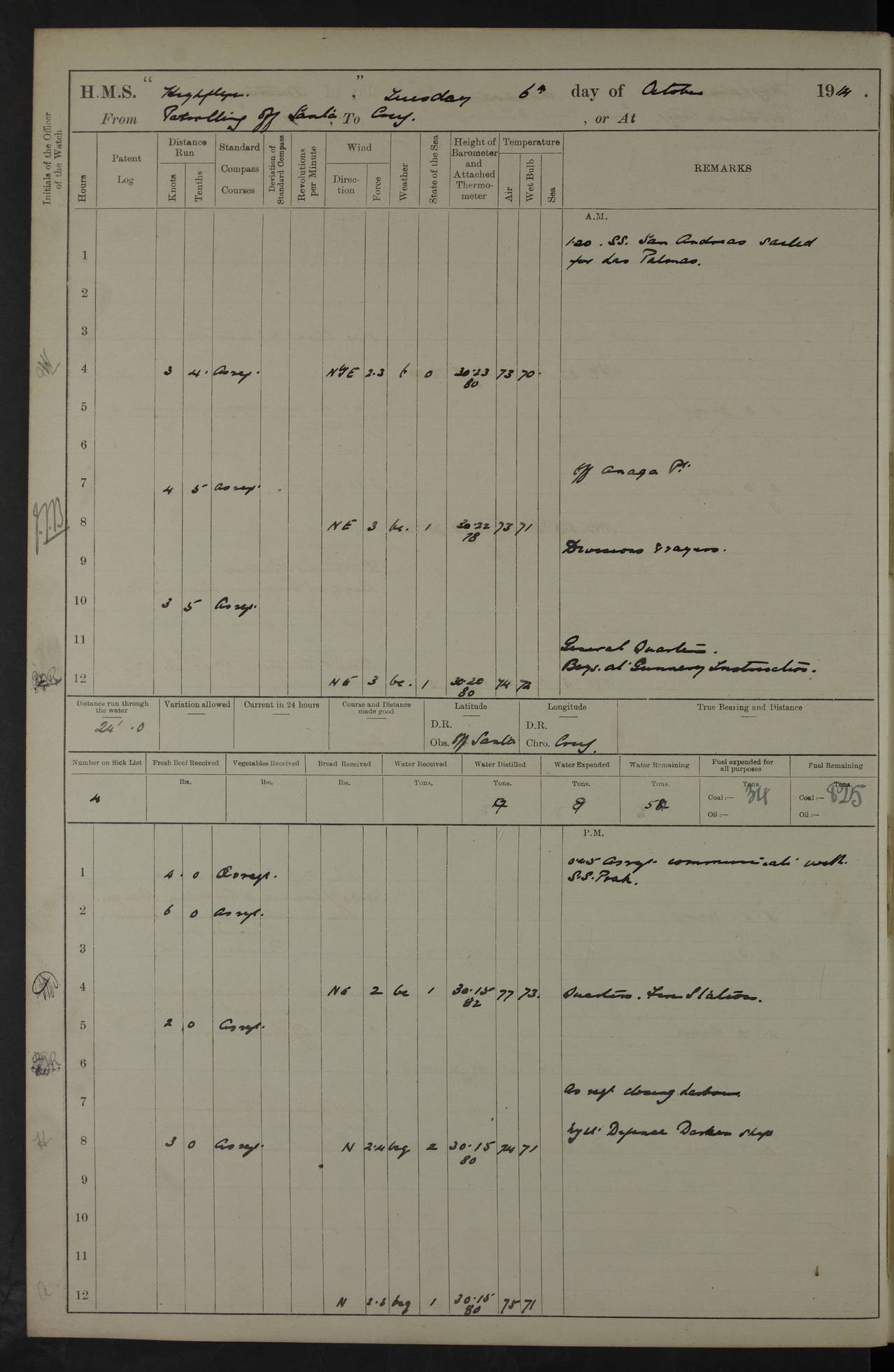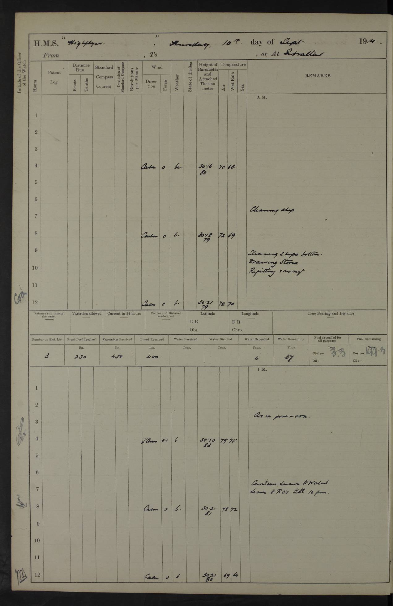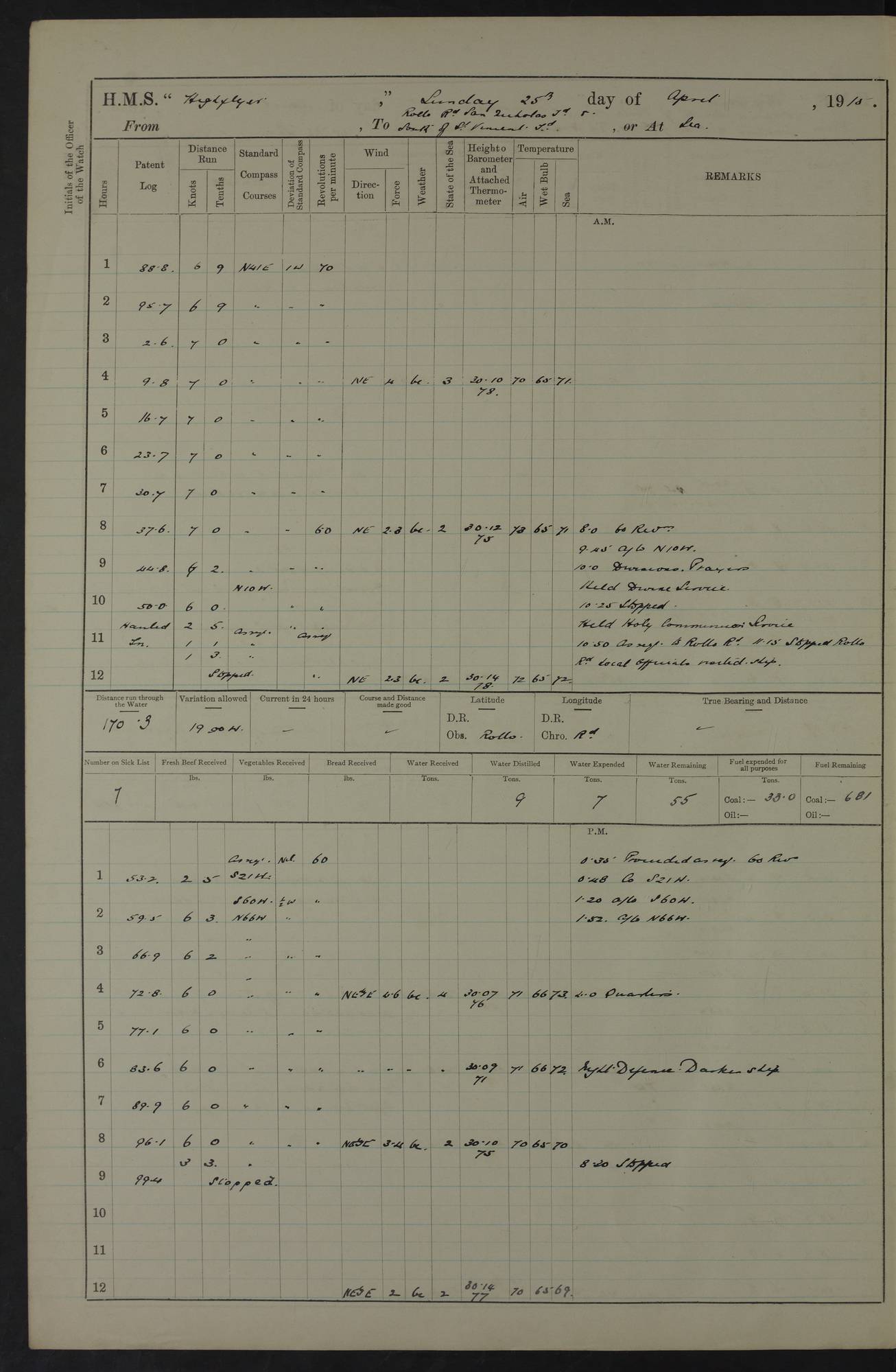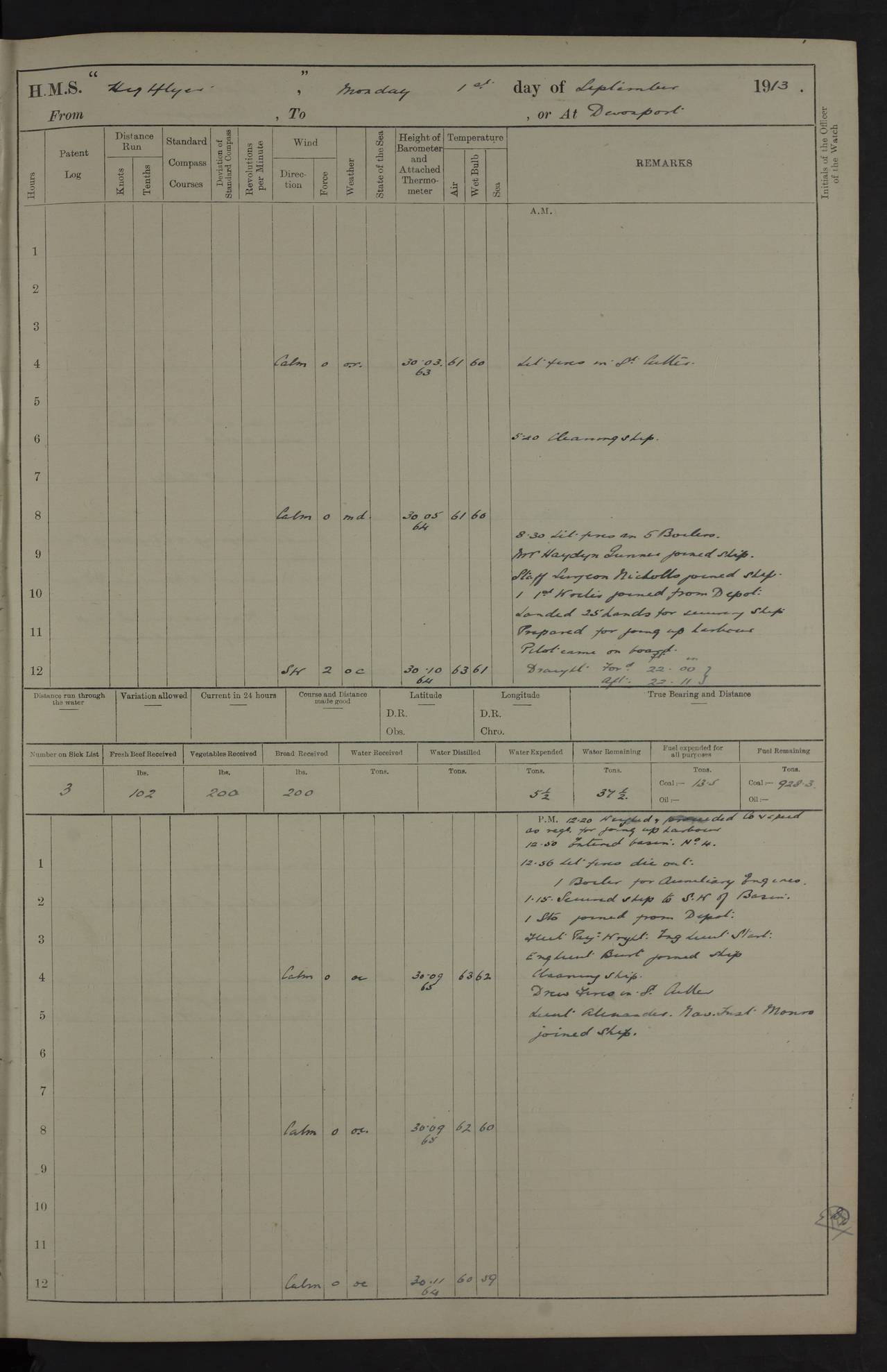 (Maps prepared using Journey Plotter, developed by Maikel. The Plots can only be approximate. They are made by joining-up positions on successive days, and sometimes positions are not given. There will therefore be occasions when the ship appears to have travelled overland) LOG BOOK – JUNE 14TH 1913 TO MAY 31ST 1914 4f960fe4a2fc8e2def00041b: (http://s3.amazonaws.com/oldweather/ADM53-44291/ADM 53-44291-001_0.jpg) 4f960fe5a2fc8e2def00041c: (http://s3.amazonaws.com/oldweather/ADM53-44291/ADM 53-44291-001_1.jpg) 4f960fe5a2fc8e2def00041d: (http://s3.amazonaws.com/oldweather/ADM53-44291/ADM 53-44291-002_0.jpg) 4f960fe5a2fc8e2def00041e: (http://s3.amazonaws.com/oldweather/ADM53-44291/ADM 53-44291-002_1.jpg) LOG of HMS Highflyer Commanded by Captain HT Buller MVO FOR THE PERIOD Commencing Saturday 14th June 1913 Ending Sunday 31st May 1914 Tonnage (displacement): 5600 Extreme length: 350 ft Extreme breadth: 54 ft ENGINES Manufacturer: Fairfield Shipbuilding & Engineering Co, Glasgow IHP: 10.000 Description: Vertical triple expansion 4 cylinders When fixed on board: 1898 BOILERS Manufacturer: Fairfield Shipbuilding & Engineering Co Description: Belleville with economisers 18 in No When made: 1898 When put in vessel: 1898 SCREW PROPELLER Manufacturer: Fairfield Shipbuilding & Engineering Co Description: Twin 3 bladed Admiralty design (bronze) General state of repair: Good 4f960fe6a2fc8e2def00041f: (http://s3.amazonaws.com/oldweather/ADM53-44291/ADM 53-44291-003_0.jpg) [Directions for using the log, figures to indicate the force of the wind and the state of the sea, and letters to denote the state of the weather.] 4f960fe6a2fc8e2def000420: (http://s3.amazonaws.com/oldweather/ADM53-44291/ADM 53-44291-003_1.jpg) Establishment of ship’s company Officers 32 Seamen 164 Boys 24 Marines 50 Engine-room establishment 134 Other non-executive ratings 466 BAROMETER Mercurial or aneroid: Mercurial Name of maker & number: Adie A 577 Height of cistern above sea: 9 feet Thermometers for air temperature Position in ship: Fore bridge Whether in screen: Yes Maker & number: Negretti & Zambra MO/A 9607 dry; from June 14, 1913 to June 1, 1914 MO/A 9603 wet; from June 14, 1913 to June 1, 1914 Thermometer for sea temperature Maker & number: J Hicks A 434; from June 14, 1913 to June 1, 1914 Position of standard compass Fore upper bridge DEVIATION OF STANDARD COMPASS Date obtained: August 29th 1913 Position: Sheerness, No 28 buoy ARMAMENT Fxle: one 6” QF PII S waist: four 6” QF PII P waist: four 6” QF PII OD: two 6” QF PII Battle deck: two 12-pounder 12-cwt SII S waist: three 12-pounder 12-cwt SII P waist: three 12-pounder 12-cwt SII AS deck: 3-pounder QF (Hotchkiss) P waist: 12-pounder 8-cwt field gun Torpedo armament 2 18” tubes BOATS 2 pinnaces, 36 ft sailing 2 cutters 1 gig, 30 ft 1 whaler 1 steam cutter, 32 ft MISCELLANEOUS INFORMATION Draught of water with bunkers full, and complete with provisions, stores and water: forward 22 ft 0 in, aft 23 ft 2 in Load draught, 600 tons coal: forward 19 ft 6 in, aft 21 ft 6 in Number of tons necessary to increase draught 1 inch: 31.5 Number of tons of coal carried (43 cubic feet per ton): a) At load draught, 600 b) With bunkers full, 1132 c) In places other than bunkers, nil Quantity of water carried: a) For boilers, 207 tons b) For drinking 60 tons THE VOYAGES OF HMS HIGHFLYER 1913-1914