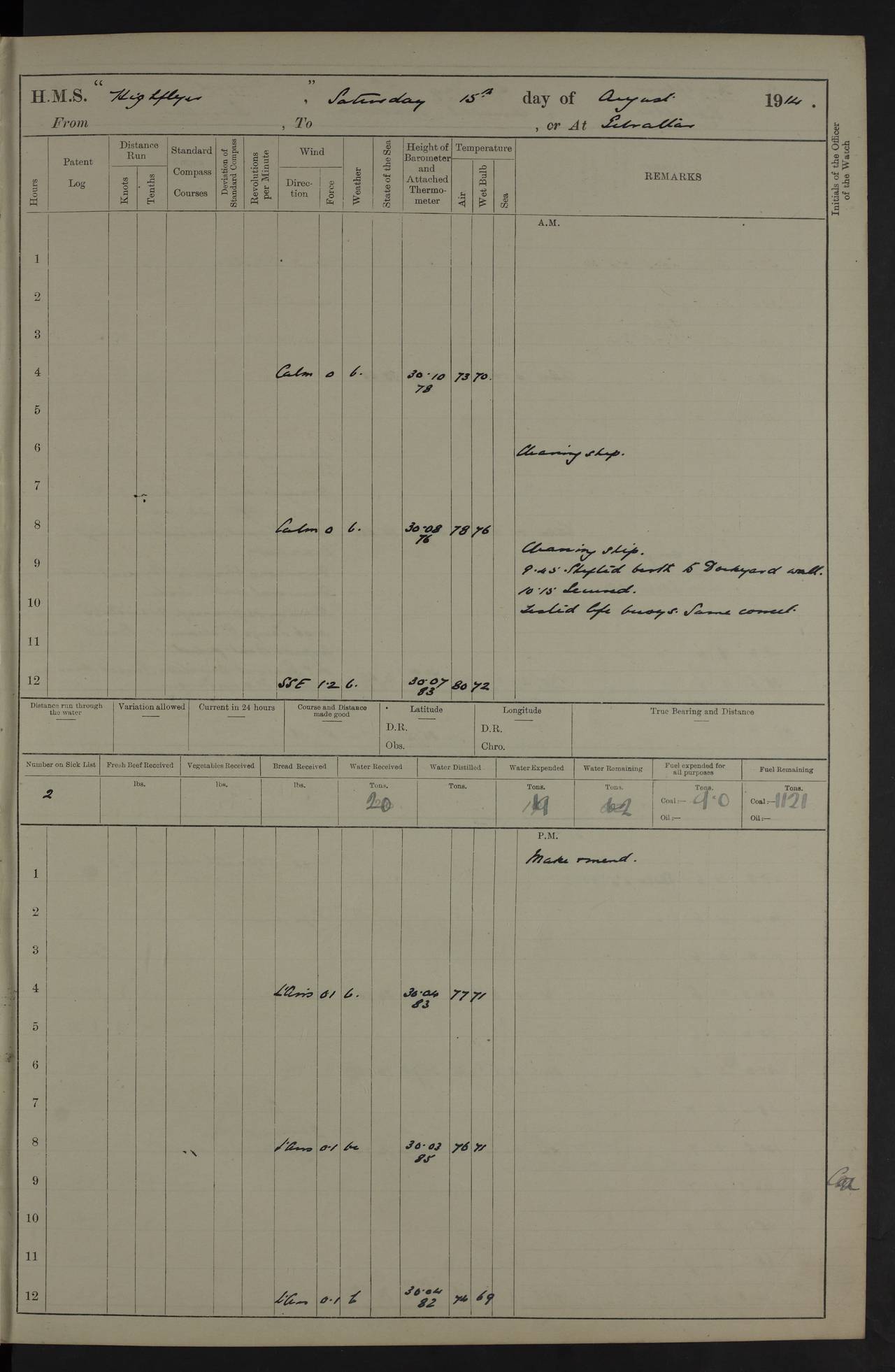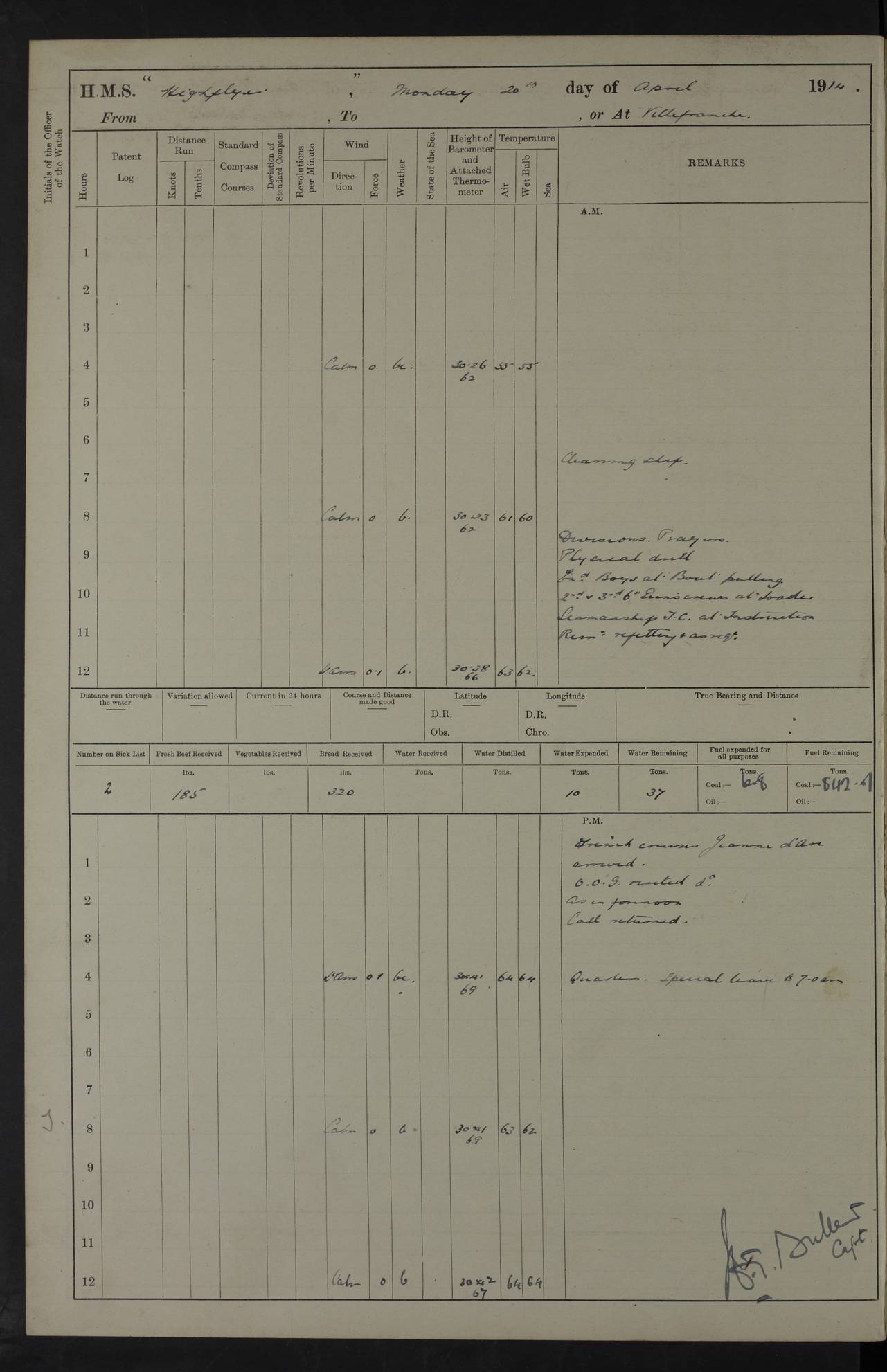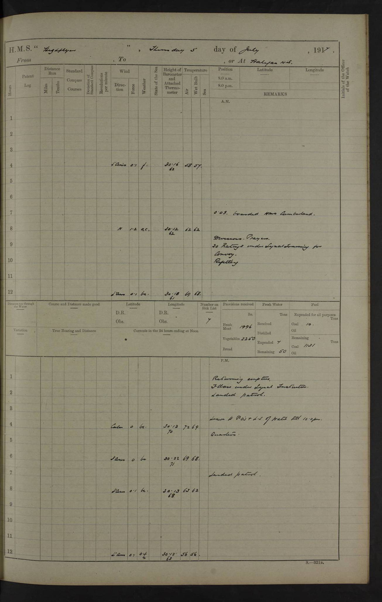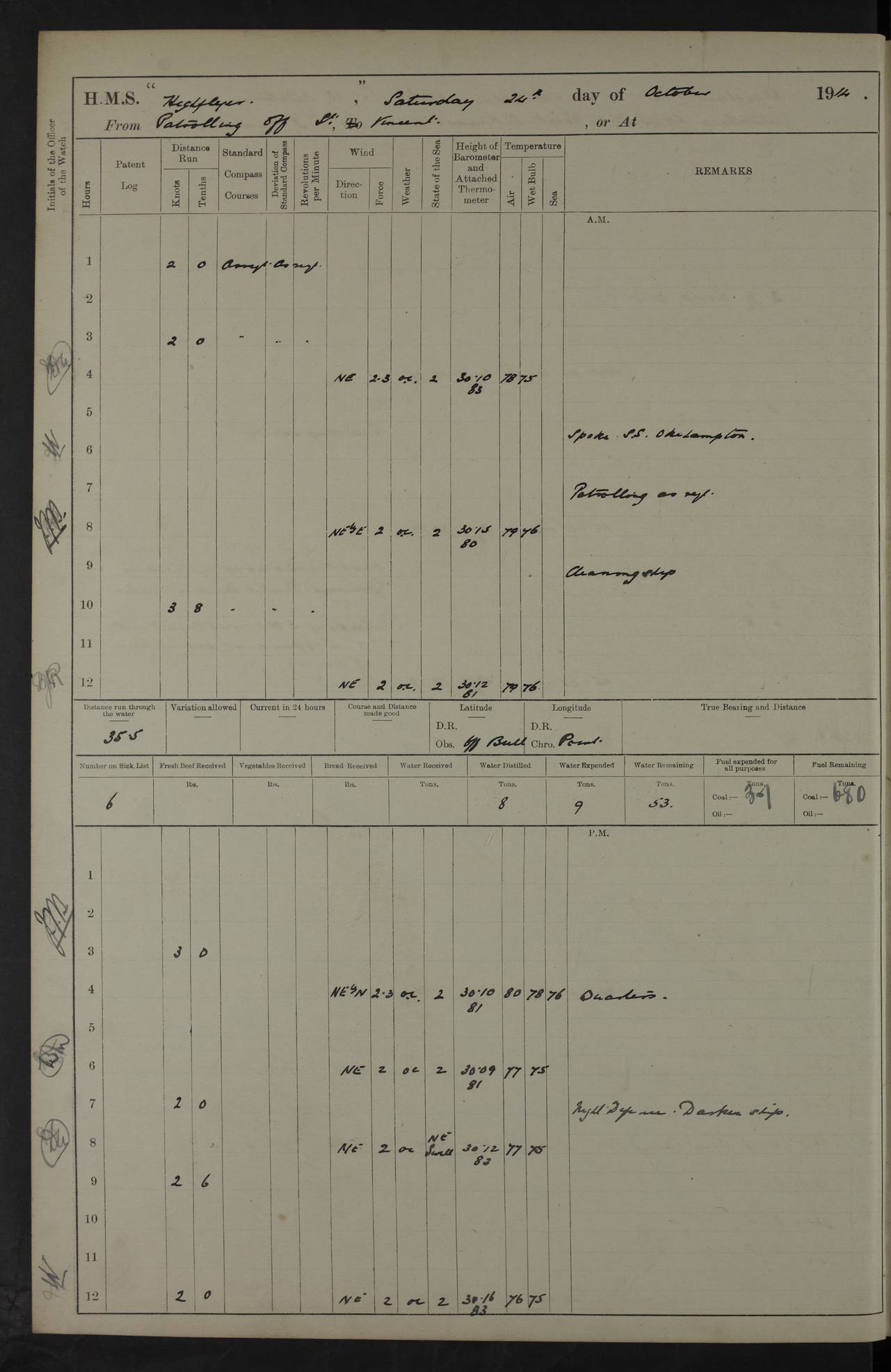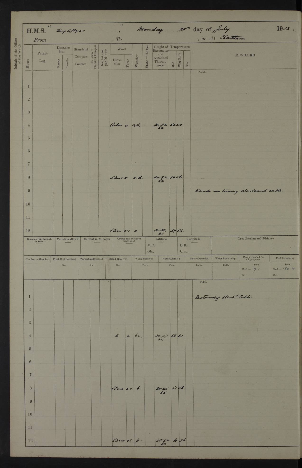 (Maps prepared using Journey Plotter, developed by Maikel. The Plots can only be approximate. They are made by joining-up positions on successive days, and sometimes positions are not given. There will therefore be occasions when the ship appears to have travelled overland) LOG BOOK – JUNE 14TH 1913 TO MAY 31ST 1914 4f960fe4a2fc8e2def00041b: (http://s3.amazonaws.com/oldweather/ADM53-44291/ADM 53-44291-001_0.jpg) 4f960fe5a2fc8e2def00041c: (http://s3.amazonaws.com/oldweather/ADM53-44291/ADM 53-44291-001_1.jpg) 4f960fe5a2fc8e2def00041d: (http://s3.amazonaws.com/oldweather/ADM53-44291/ADM 53-44291-002_0.jpg) 4f960fe5a2fc8e2def00041e: (http://s3.amazonaws.com/oldweather/ADM53-44291/ADM 53-44291-002_1.jpg) LOG of HMS Highflyer Commanded by Captain HT Buller MVO FOR THE PERIOD Commencing Saturday 14th June 1913 Ending Sunday 31st May 1914 Tonnage (displacement): 5600 Extreme length: 350 ft Extreme breadth: 54 ft ENGINES Manufacturer: Fairfield Shipbuilding & Engineering Co, Glasgow IHP: 10.000 Description: Vertical triple expansion 4 cylinders When fixed on board: 1898 BOILERS Manufacturer: Fairfield Shipbuilding & Engineering Co Description: Belleville with economisers 18 in No When made: 1898 When put in vessel: 1898 SCREW PROPELLER Manufacturer: Fairfield Shipbuilding & Engineering Co Description: Twin 3 bladed Admiralty design (bronze) General state of repair: Good 4f960fe6a2fc8e2def00041f: (http://s3.amazonaws.com/oldweather/ADM53-44291/ADM 53-44291-003_0.jpg) [Directions for using the log, figures to indicate the force of the wind and the state of the sea, and letters to denote the state of the weather.] 4f960fe6a2fc8e2def000420: (http://s3.amazonaws.com/oldweather/ADM53-44291/ADM 53-44291-003_1.jpg) Establishment of ship’s company Officers 32 Seamen 164 Boys 24 Marines 50 Engine-room establishment 134 Other non-executive ratings 466 BAROMETER Mercurial or aneroid: Mercurial Name of maker & number: Adie A 577 Height of cistern above sea: 9 feet Thermometers for air temperature Position in ship: Fore bridge Whether in screen: Yes Maker & number: Negretti & Zambra MO/A 9607 dry; from June 14, 1913 to June 1, 1914 MO/A 9603 wet; from June 14, 1913 to June 1, 1914 Thermometer for sea temperature Maker & number: J Hicks A 434; from June 14, 1913 to June 1, 1914 Position of standard compass Fore upper bridge DEVIATION OF STANDARD COMPASS Date obtained: August 29th 1913 Position: Sheerness, No 28 buoy ARMAMENT Fxle: one 6” QF PII S waist: four 6” QF PII P waist: four 6” QF PII OD: two 6” QF PII Battle deck: two 12-pounder 12-cwt SII S waist: three 12-pounder 12-cwt SII P waist: three 12-pounder 12-cwt SII AS deck: 3-pounder QF (Hotchkiss) P waist: 12-pounder 8-cwt field gun Torpedo armament 2 18” tubes BOATS 2 pinnaces, 36 ft sailing 2 cutters 1 gig, 30 ft 1 whaler 1 steam cutter, 32 ft MISCELLANEOUS INFORMATION Draught of water with bunkers full, and complete with provisions, stores and water: forward 22 ft 0 in, aft 23 ft 2 in Load draught, 600 tons coal: forward 19 ft 6 in, aft 21 ft 6 in Number of tons necessary to increase draught 1 inch: 31.5 Number of tons of coal carried (43 cubic feet per ton): a) At load draught, 600 b) With bunkers full, 1132 c) In places other than bunkers, nil Quantity of water carried: a) For boilers, 207 tons b) For drinking 60 tons THE VOYAGES OF HMS HIGHFLYER 1913-1914