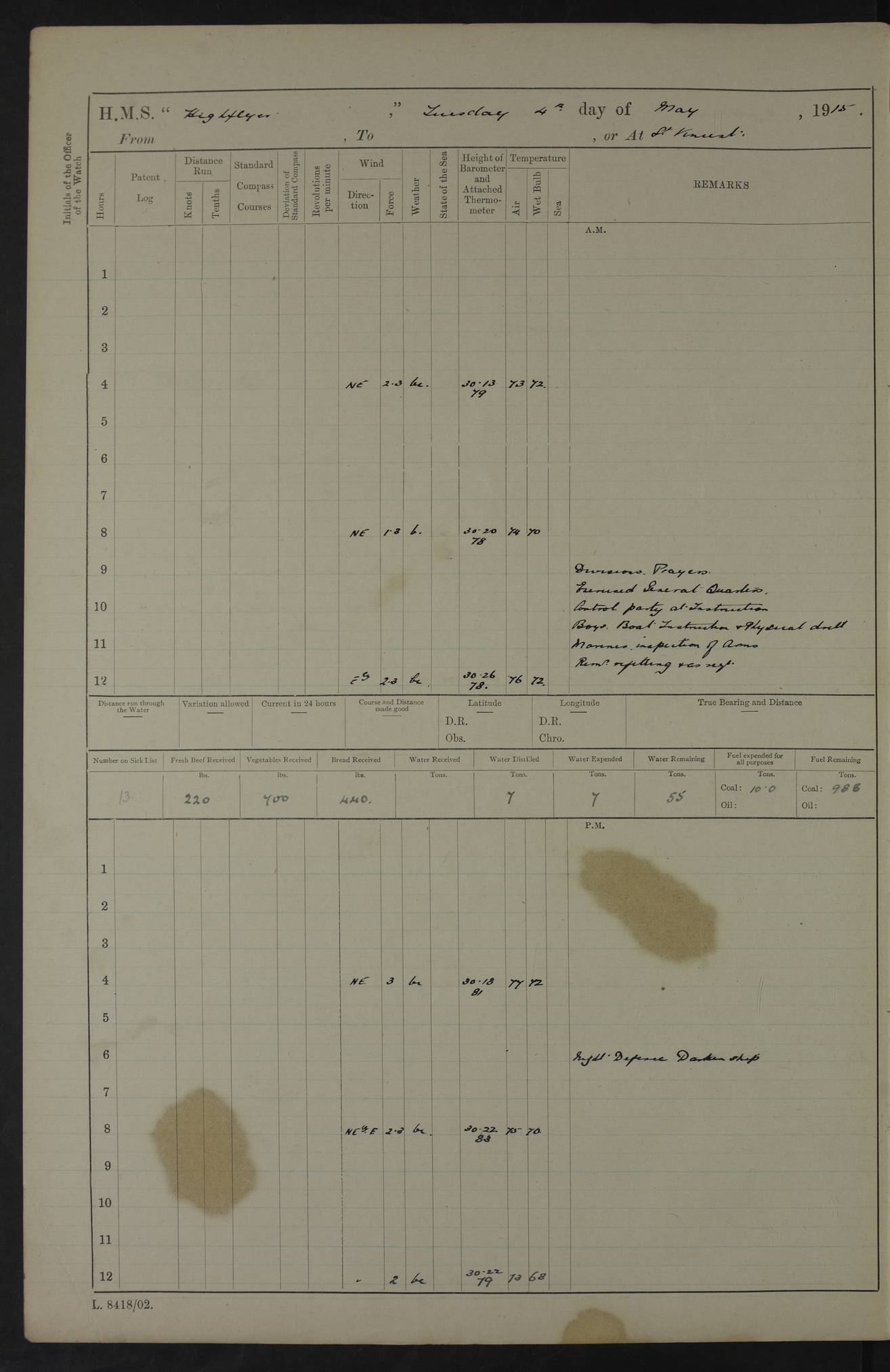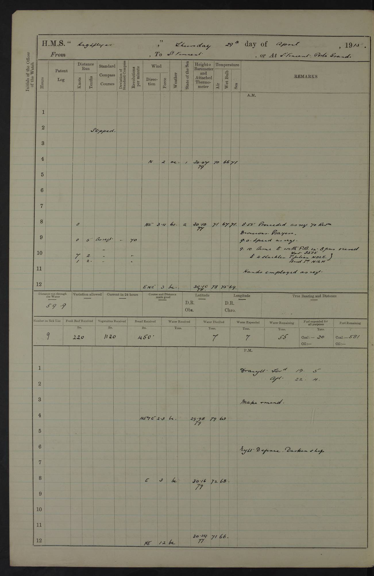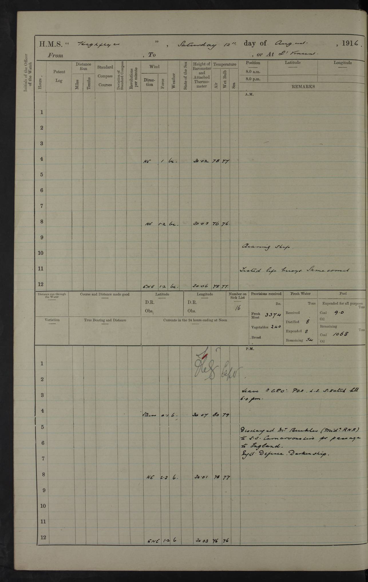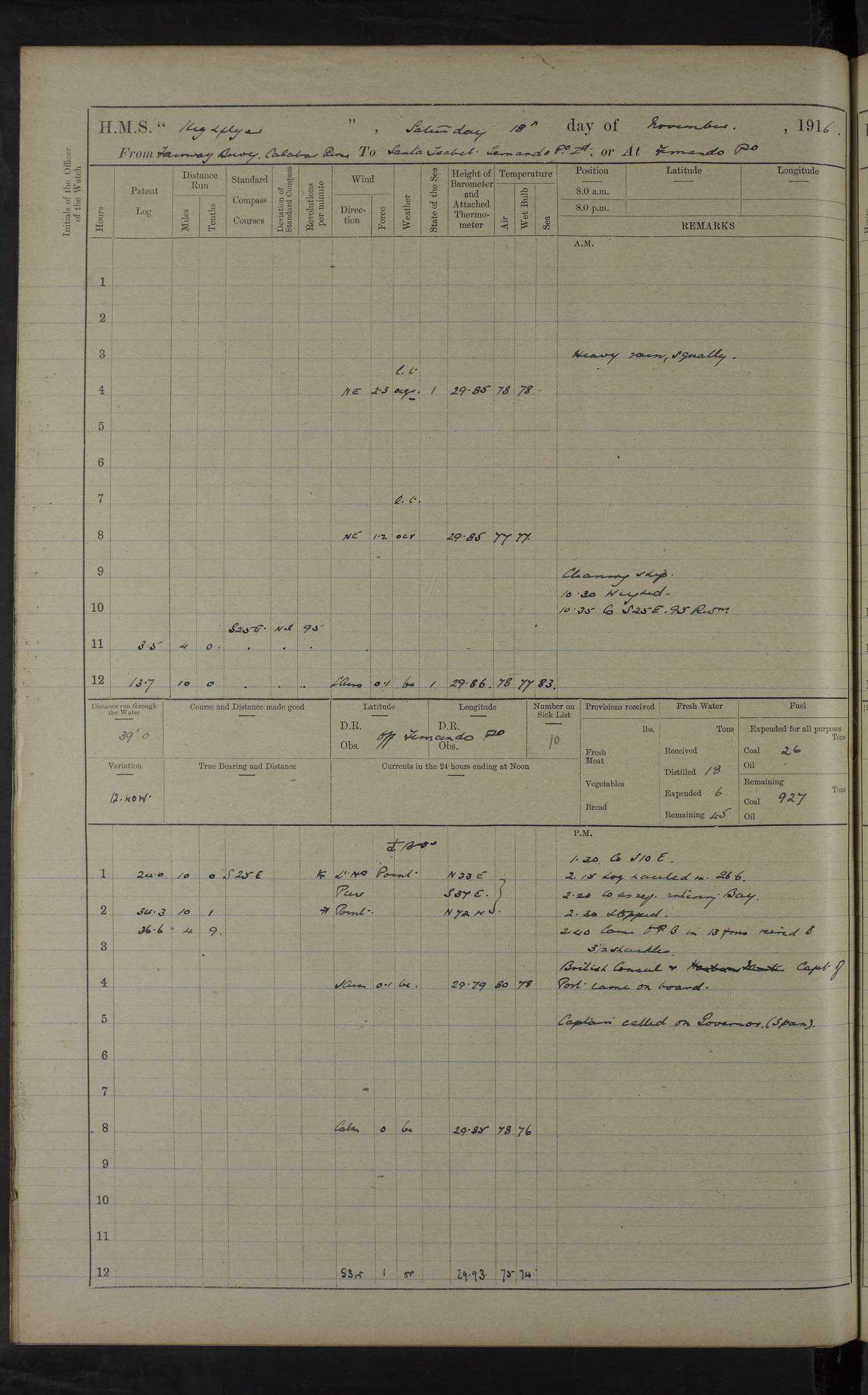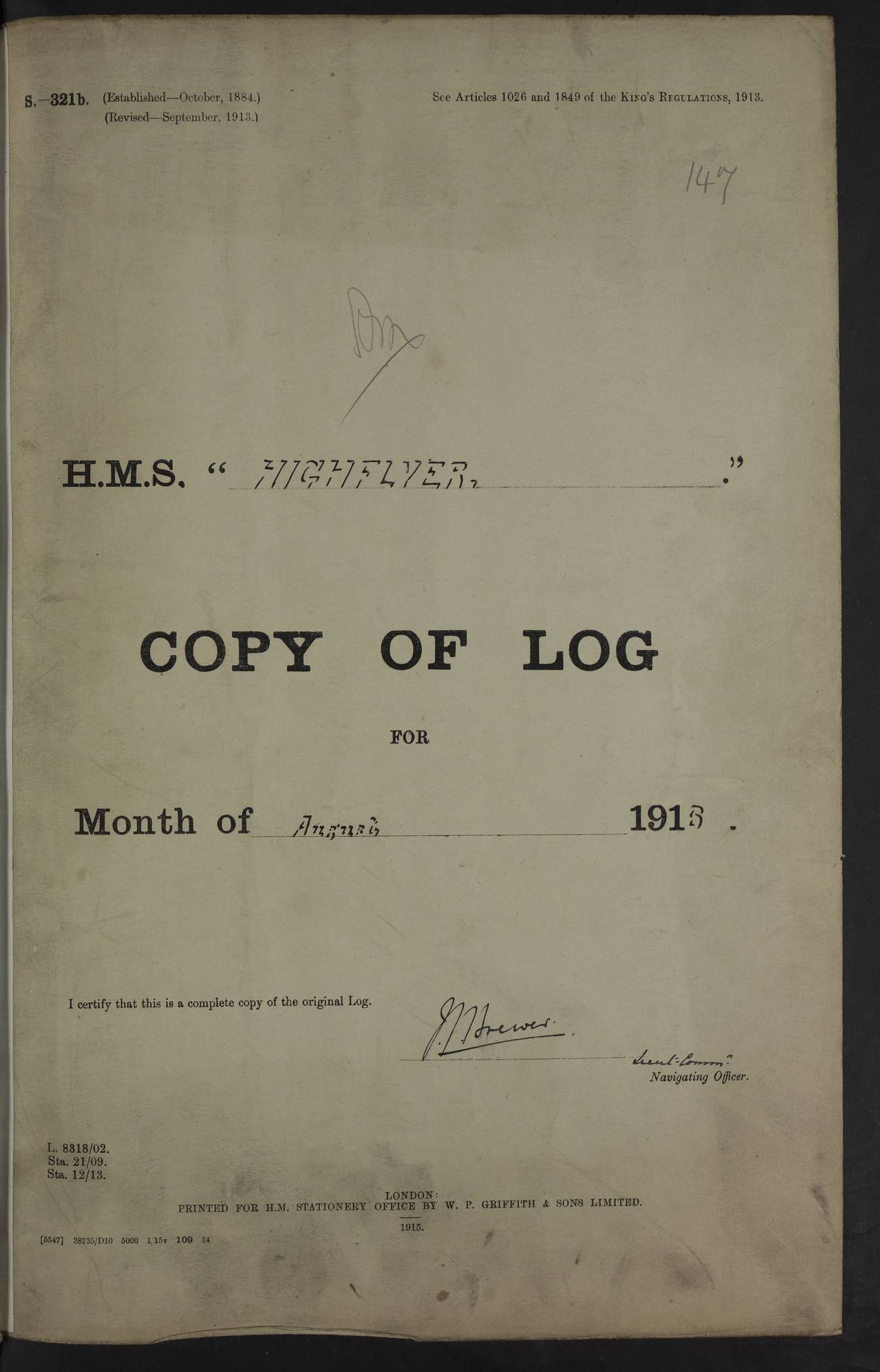 (Maps prepared using Journey Plotter, developed by Maikel. The Plots can only be approximate. They are made by joining-up positions on successive days, and sometimes positions are not given. There will therefore be occasions when the ship appears to have travelled overland) LOG BOOK – JUNE 14TH 1913 TO MAY 31ST 1914 4f960fe4a2fc8e2def00041b: (http://s3.amazonaws.com/oldweather/ADM53-44291/ADM 53-44291-001_0.jpg) 4f960fe5a2fc8e2def00041c: (http://s3.amazonaws.com/oldweather/ADM53-44291/ADM 53-44291-001_1.jpg) 4f960fe5a2fc8e2def00041d: (http://s3.amazonaws.com/oldweather/ADM53-44291/ADM 53-44291-002_0.jpg) 4f960fe5a2fc8e2def00041e: (http://s3.amazonaws.com/oldweather/ADM53-44291/ADM 53-44291-002_1.jpg) LOG of HMS Highflyer Commanded by Captain HT Buller MVO FOR THE PERIOD Commencing Saturday 14th June 1913 Ending Sunday 31st May 1914 Tonnage (displacement): 5600 Extreme length: 350 ft Extreme breadth: 54 ft ENGINES Manufacturer: Fairfield Shipbuilding & Engineering Co, Glasgow IHP: 10.000 Description: Vertical triple expansion 4 cylinders When fixed on board: 1898 BOILERS Manufacturer: Fairfield Shipbuilding & Engineering Co Description: Belleville with economisers 18 in No When made: 1898 When put in vessel: 1898 SCREW PROPELLER Manufacturer: Fairfield Shipbuilding & Engineering Co Description: Twin 3 bladed Admiralty design (bronze) General state of repair: Good 4f960fe6a2fc8e2def00041f: (http://s3.amazonaws.com/oldweather/ADM53-44291/ADM 53-44291-003_0.jpg) [Directions for using the log, figures to indicate the force of the wind and the state of the sea, and letters to denote the state of the weather.] 4f960fe6a2fc8e2def000420: (http://s3.amazonaws.com/oldweather/ADM53-44291/ADM 53-44291-003_1.jpg) Establishment of ship’s company Officers 32 Seamen 164 Boys 24 Marines 50 Engine-room establishment 134 Other non-executive ratings 466 BAROMETER Mercurial or aneroid: Mercurial Name of maker & number: Adie A 577 Height of cistern above sea: 9 feet Thermometers for air temperature Position in ship: Fore bridge Whether in screen: Yes Maker & number: Negretti & Zambra MO/A 9607 dry; from June 14, 1913 to June 1, 1914 MO/A 9603 wet; from June 14, 1913 to June 1, 1914 Thermometer for sea temperature Maker & number: J Hicks A 434; from June 14, 1913 to June 1, 1914 Position of standard compass Fore upper bridge DEVIATION OF STANDARD COMPASS Date obtained: August 29th 1913 Position: Sheerness, No 28 buoy ARMAMENT Fxle: one 6” QF PII S waist: four 6” QF PII P waist: four 6” QF PII OD: two 6” QF PII Battle deck: two 12-pounder 12-cwt SII S waist: three 12-pounder 12-cwt SII P waist: three 12-pounder 12-cwt SII AS deck: 3-pounder QF (Hotchkiss) P waist: 12-pounder 8-cwt field gun Torpedo armament 2 18” tubes BOATS 2 pinnaces, 36 ft sailing 2 cutters 1 gig, 30 ft 1 whaler 1 steam cutter, 32 ft MISCELLANEOUS INFORMATION Draught of water with bunkers full, and complete with provisions, stores and water: forward 22 ft 0 in, aft 23 ft 2 in Load draught, 600 tons coal: forward 19 ft 6 in, aft 21 ft 6 in Number of tons necessary to increase draught 1 inch: 31.5 Number of tons of coal carried (43 cubic feet per ton): a) At load draught, 600 b) With bunkers full, 1132 c) In places other than bunkers, nil Quantity of water carried: a) For boilers, 207 tons b) For drinking 60 tons THE VOYAGES OF HMS HIGHFLYER 1913-1914