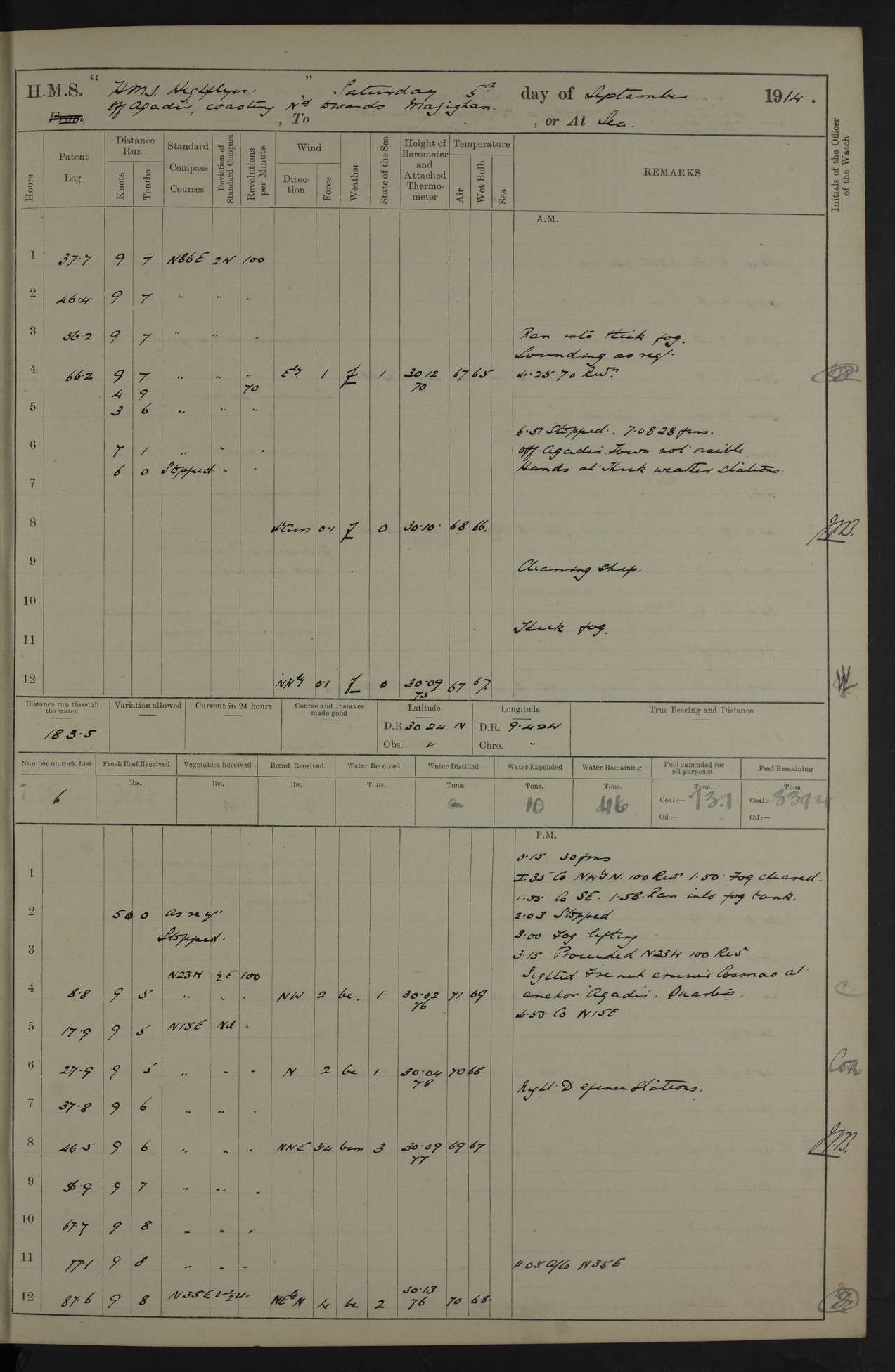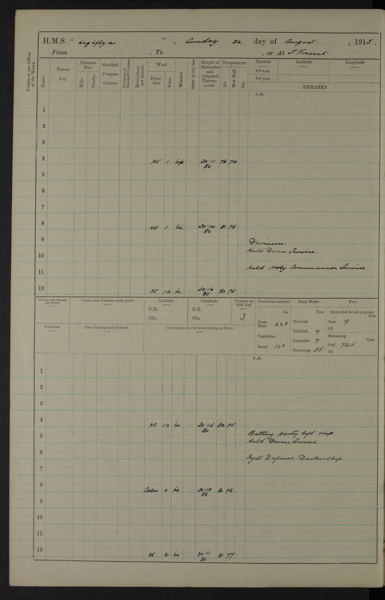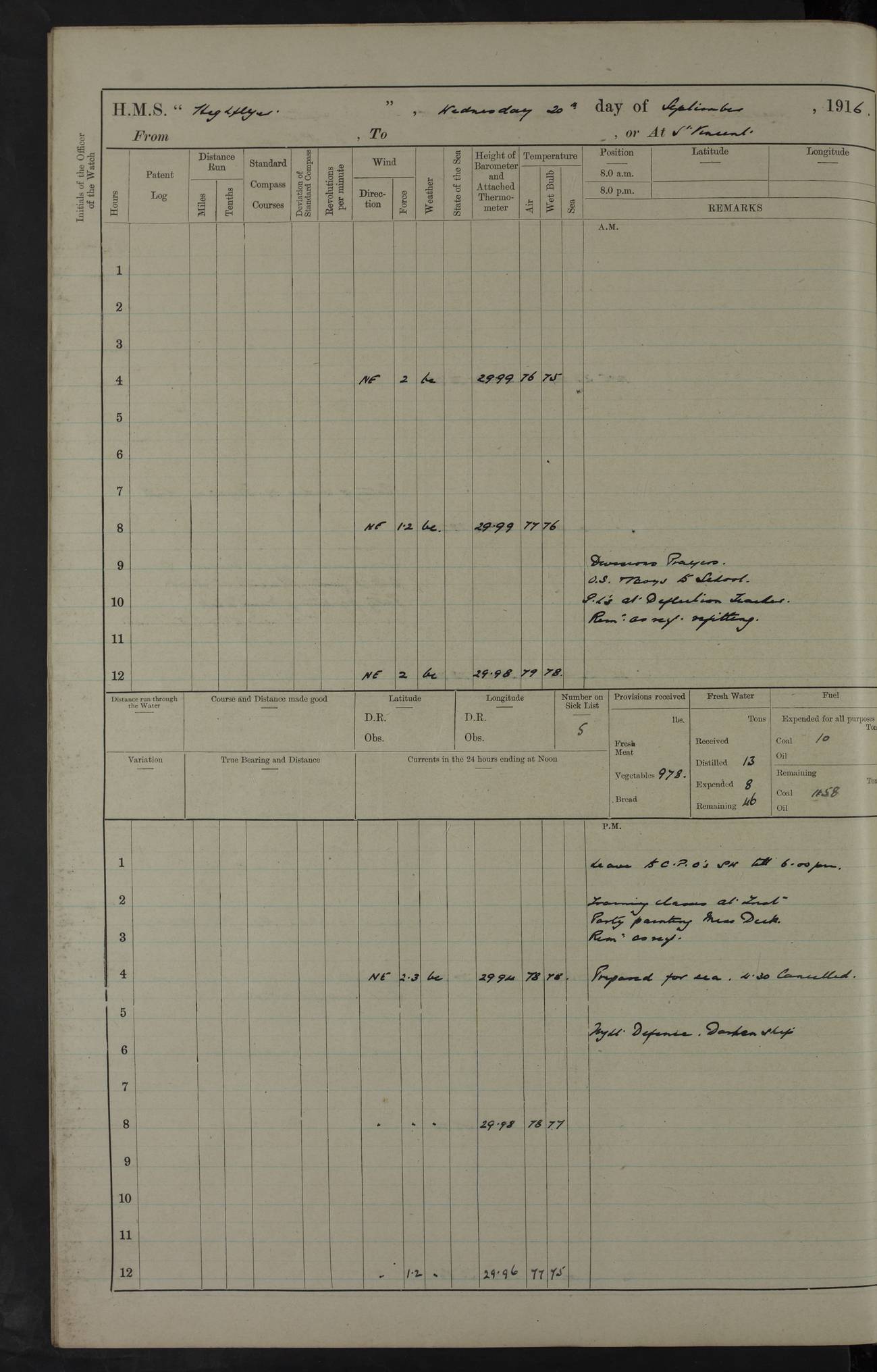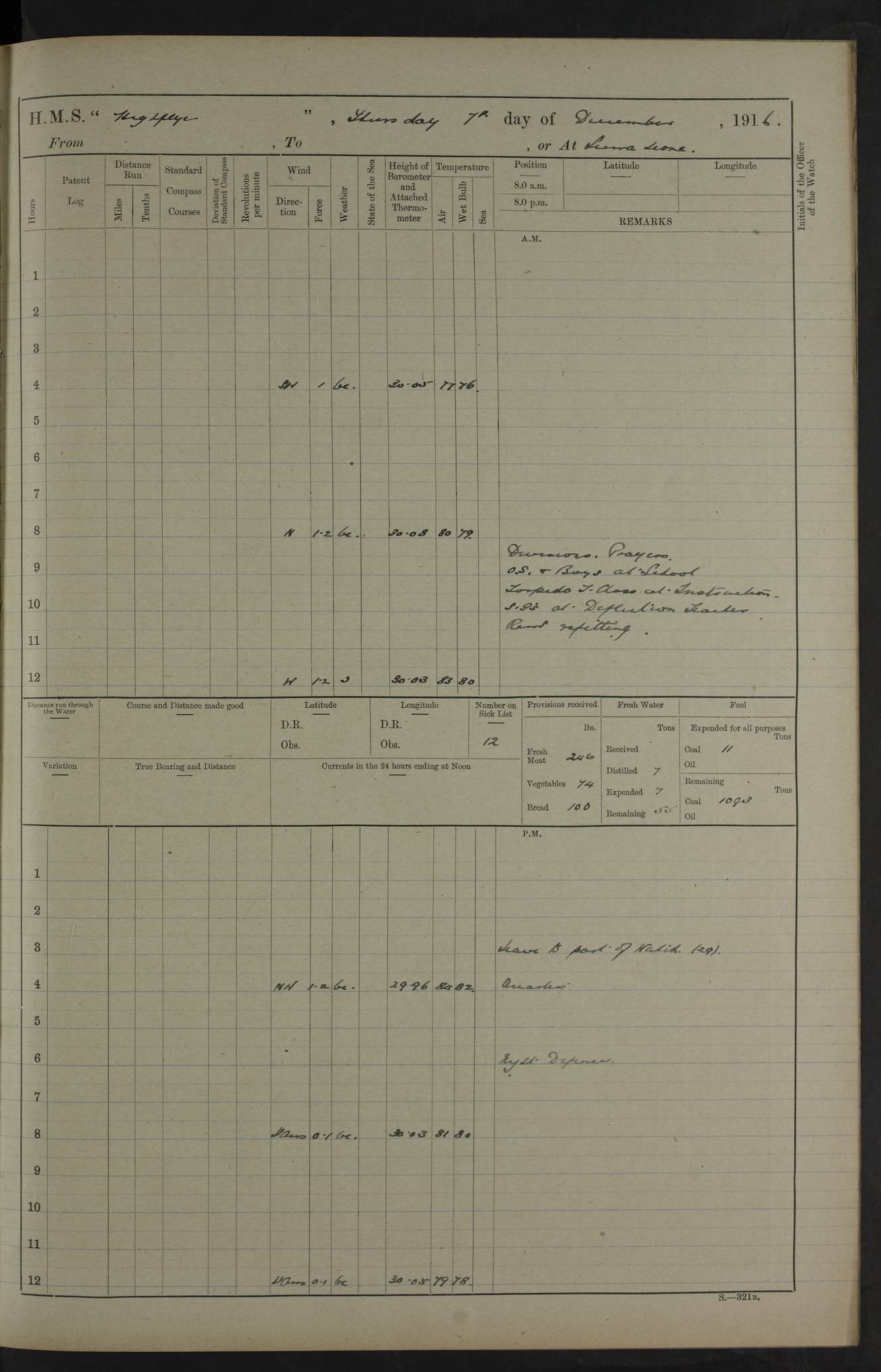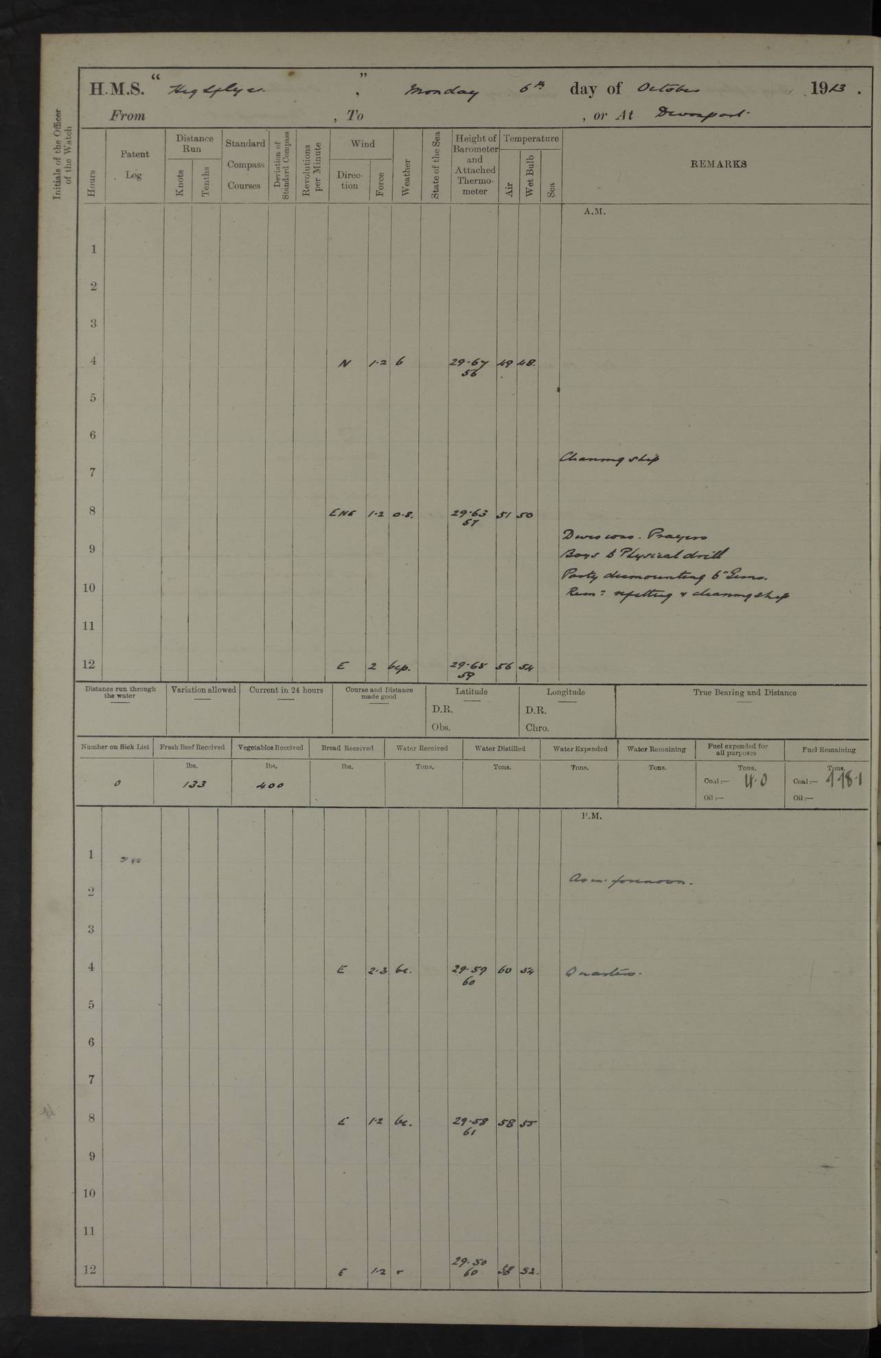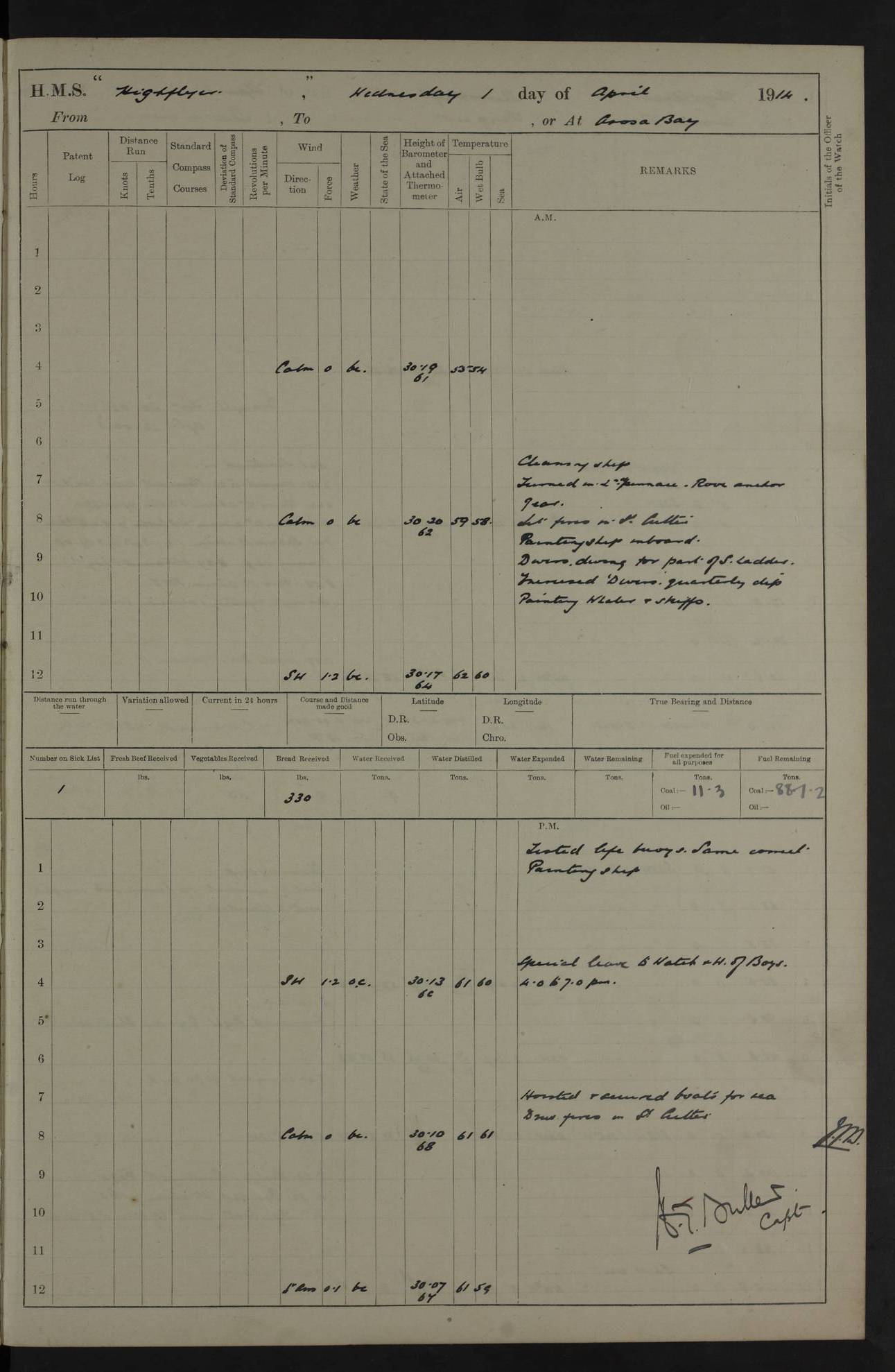 (Maps prepared using Journey Plotter, developed by Maikel. The Plots can only be approximate. They are made by joining-up positions on successive days, and sometimes positions are not given. There will therefore be occasions when the ship appears to have travelled overland) LOG BOOK – JUNE 14TH 1913 TO MAY 31ST 1914 4f960fe4a2fc8e2def00041b: (http://s3.amazonaws.com/oldweather/ADM53-44291/ADM 53-44291-001_0.jpg) 4f960fe5a2fc8e2def00041c: (http://s3.amazonaws.com/oldweather/ADM53-44291/ADM 53-44291-001_1.jpg) 4f960fe5a2fc8e2def00041d: (http://s3.amazonaws.com/oldweather/ADM53-44291/ADM 53-44291-002_0.jpg) 4f960fe5a2fc8e2def00041e: (http://s3.amazonaws.com/oldweather/ADM53-44291/ADM 53-44291-002_1.jpg) LOG of HMS Highflyer Commanded by Captain HT Buller MVO FOR THE PERIOD Commencing Saturday 14th June 1913 Ending Sunday 31st May 1914 Tonnage (displacement): 5600 Extreme length: 350 ft Extreme breadth: 54 ft ENGINES Manufacturer: Fairfield Shipbuilding & Engineering Co, Glasgow IHP: 10.000 Description: Vertical triple expansion 4 cylinders When fixed on board: 1898 BOILERS Manufacturer: Fairfield Shipbuilding & Engineering Co Description: Belleville with economisers 18 in No When made: 1898 When put in vessel: 1898 SCREW PROPELLER Manufacturer: Fairfield Shipbuilding & Engineering Co Description: Twin 3 bladed Admiralty design (bronze) General state of repair: Good 4f960fe6a2fc8e2def00041f: (http://s3.amazonaws.com/oldweather/ADM53-44291/ADM 53-44291-003_0.jpg) [Directions for using the log, figures to indicate the force of the wind and the state of the sea, and letters to denote the state of the weather.] 4f960fe6a2fc8e2def000420: (http://s3.amazonaws.com/oldweather/ADM53-44291/ADM 53-44291-003_1.jpg) Establishment of ship’s company Officers 32 Seamen 164 Boys 24 Marines 50 Engine-room establishment 134 Other non-executive ratings 466 BAROMETER Mercurial or aneroid: Mercurial Name of maker & number: Adie A 577 Height of cistern above sea: 9 feet Thermometers for air temperature Position in ship: Fore bridge Whether in screen: Yes Maker & number: Negretti & Zambra MO/A 9607 dry; from June 14, 1913 to June 1, 1914 MO/A 9603 wet; from June 14, 1913 to June 1, 1914 Thermometer for sea temperature Maker & number: J Hicks A 434; from June 14, 1913 to June 1, 1914 Position of standard compass Fore upper bridge DEVIATION OF STANDARD COMPASS Date obtained: August 29th 1913 Position: Sheerness, No 28 buoy ARMAMENT Fxle: one 6” QF PII S waist: four 6” QF PII P waist: four 6” QF PII OD: two 6” QF PII Battle deck: two 12-pounder 12-cwt SII S waist: three 12-pounder 12-cwt SII P waist: three 12-pounder 12-cwt SII AS deck: 3-pounder QF (Hotchkiss) P waist: 12-pounder 8-cwt field gun Torpedo armament 2 18” tubes BOATS 2 pinnaces, 36 ft sailing 2 cutters 1 gig, 30 ft 1 whaler 1 steam cutter, 32 ft MISCELLANEOUS INFORMATION Draught of water with bunkers full, and complete with provisions, stores and water: forward 22 ft 0 in, aft 23 ft 2 in Load draught, 600 tons coal: forward 19 ft 6 in, aft 21 ft 6 in Number of tons necessary to increase draught 1 inch: 31.5 Number of tons of coal carried (43 cubic feet per ton): a) At load draught, 600 b) With bunkers full, 1132 c) In places other than bunkers, nil Quantity of water carried: a) For boilers, 207 tons b) For drinking 60 tons THE VOYAGES OF HMS HIGHFLYER 1913-1914
