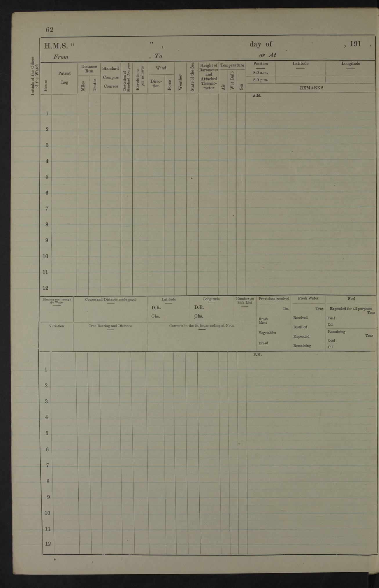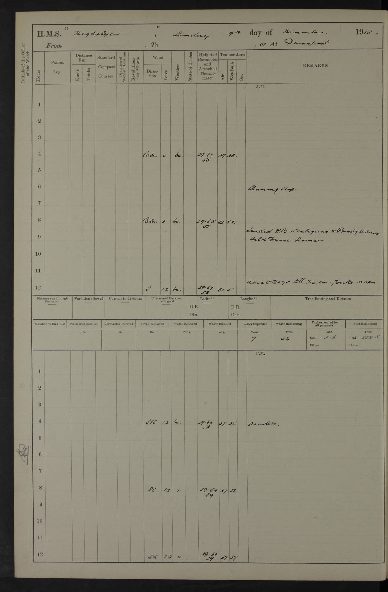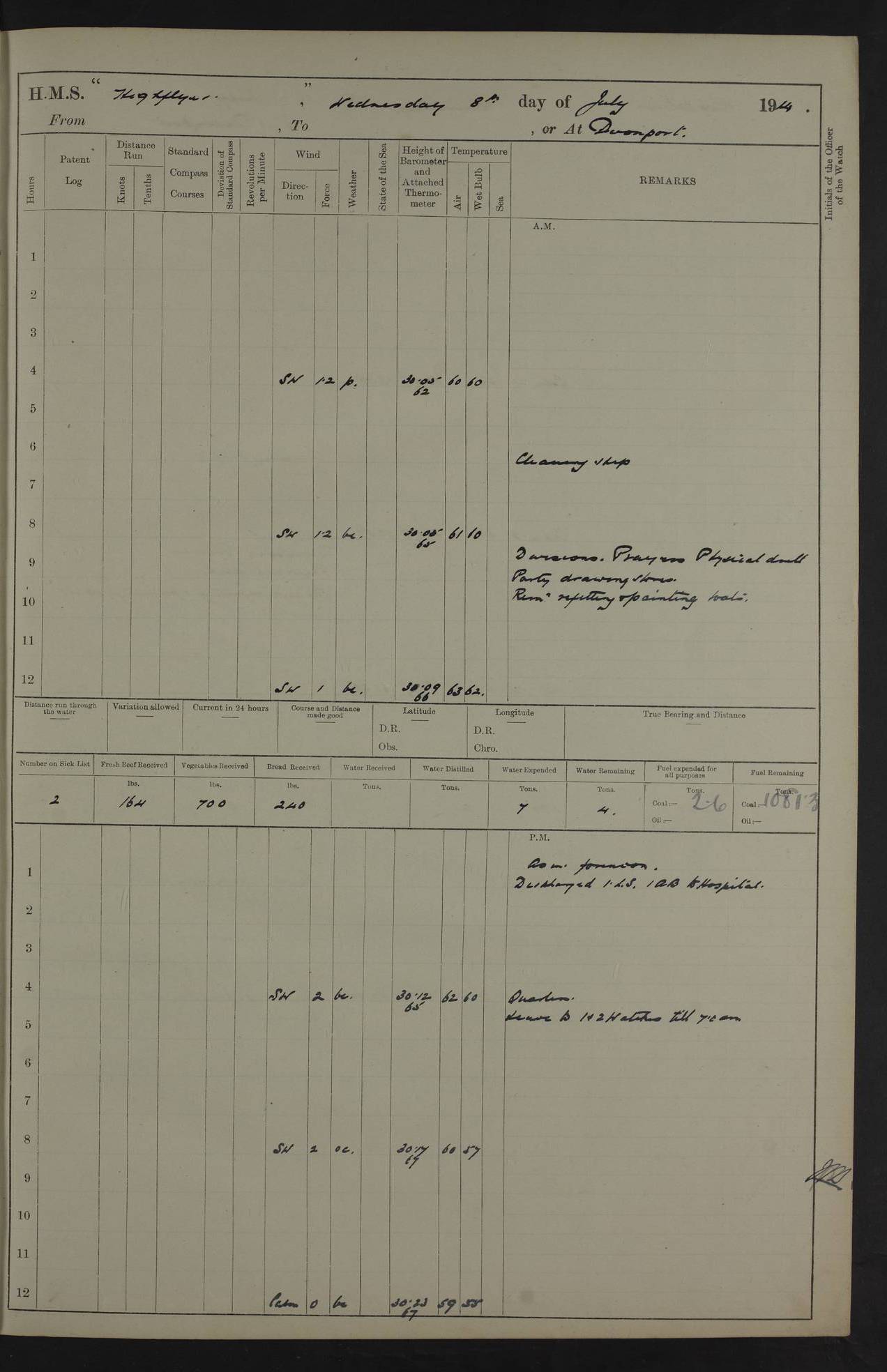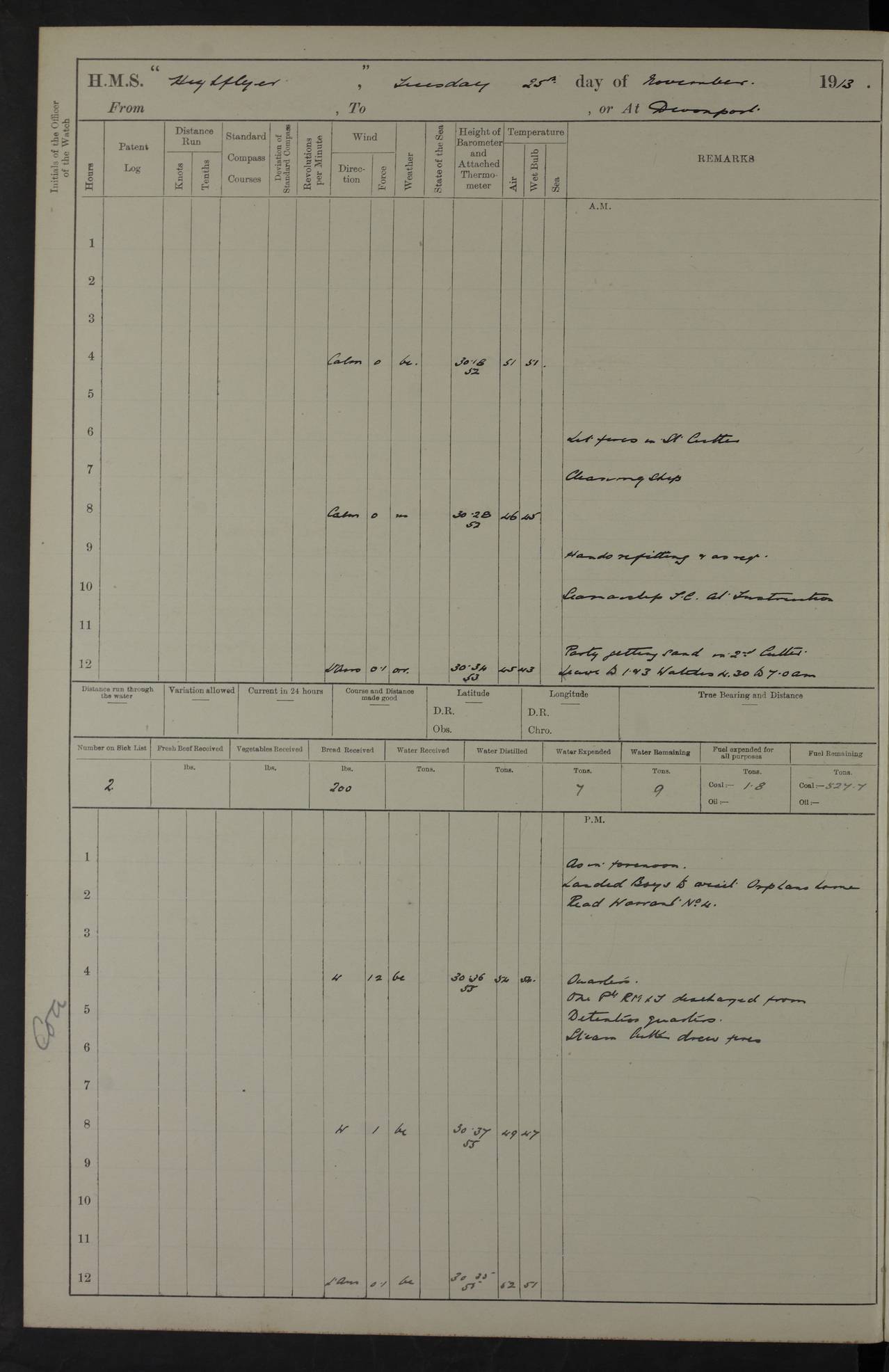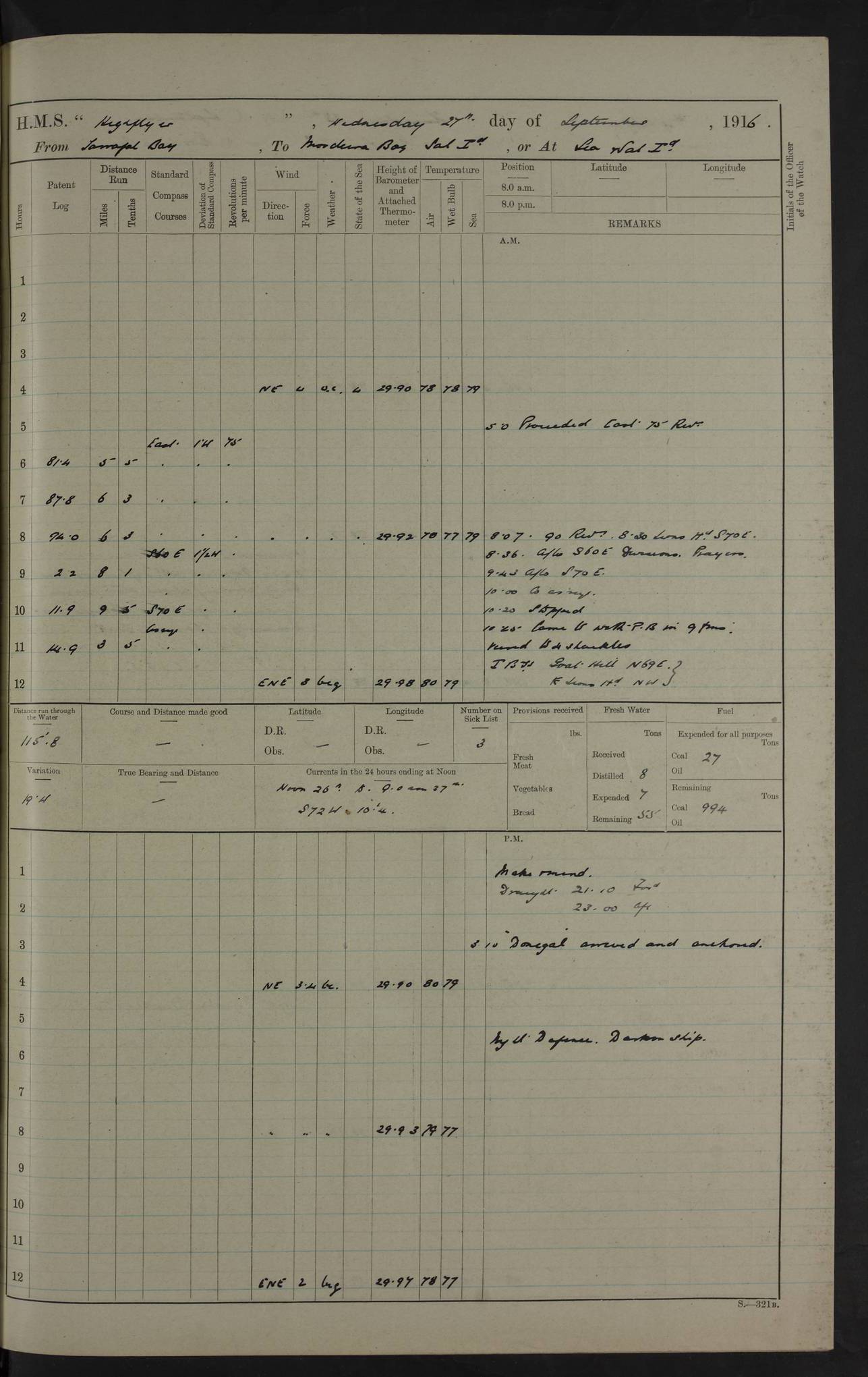(Maps prepared using Journey Plotter, developed by Maikel. The Plots can only be approximate. They are made by joining-up positions on successive days, and sometimes positions are not given. There will therefore be occasions when the ship appears to have travelled overland) LOG BOOK – JUNE 14TH 1913 TO MAY 31ST 1914 4f960fe4a2fc8e2def00041b: (http://s3.amazonaws.com/oldweather/ADM53-44291/ADM 53-44291-001_0.jpg) 4f960fe5a2fc8e2def00041c: (http://s3.amazonaws.com/oldweather/ADM53-44291/ADM 53-44291-001_1.jpg) 4f960fe5a2fc8e2def00041d: (http://s3.amazonaws.com/oldweather/ADM53-44291/ADM 53-44291-002_0.jpg) 4f960fe5a2fc8e2def00041e: (http://s3.amazonaws.com/oldweather/ADM53-44291/ADM 53-44291-002_1.jpg) LOG of HMS Highflyer Commanded by Captain HT Buller MVO FOR THE PERIOD Commencing Saturday 14th June 1913 Ending Sunday 31st May 1914 Tonnage (displacement): 5600 Extreme length: 350 ft Extreme breadth: 54 ft ENGINES Manufacturer: Fairfield Shipbuilding & Engineering Co, Glasgow IHP: 10.000 Description: Vertical triple expansion 4 cylinders When fixed on board: 1898 BOILERS Manufacturer: Fairfield Shipbuilding & Engineering Co Description: Belleville with economisers 18 in No When made: 1898 When put in vessel: 1898 SCREW PROPELLER Manufacturer: Fairfield Shipbuilding & Engineering Co Description: Twin 3 bladed Admiralty design (bronze) General state of repair: Good 4f960fe6a2fc8e2def00041f: (http://s3.amazonaws.com/oldweather/ADM53-44291/ADM 53-44291-003_0.jpg) [Directions for using the log, figures to indicate the force of the wind and the state of the sea, and letters to denote the state of the weather.] 4f960fe6a2fc8e2def000420: (http://s3.amazonaws.com/oldweather/ADM53-44291/ADM 53-44291-003_1.jpg) Establishment of ship’s company Officers 32 Seamen 164 Boys 24 Marines 50 Engine-room establishment 134 Other non-executive ratings 466 BAROMETER Mercurial or aneroid: Mercurial Name of maker & number: Adie A 577 Height of cistern above sea: 9 feet Thermometers for air temperature Position in ship: Fore bridge Whether in screen: Yes Maker & number: Negretti & Zambra MO/A 9607 dry; from June 14, 1913 to June 1, 1914 MO/A 9603 wet; from June 14, 1913 to June 1, 1914 Thermometer for sea temperature Maker & number: J Hicks A 434; from June 14, 1913 to June 1, 1914 Position of standard compass Fore upper bridge DEVIATION OF STANDARD COMPASS Date obtained: August 29th 1913 Position: Sheerness, No 28 buoy ARMAMENT Fxle: one 6” QF PII S waist: four 6” QF PII P waist: four 6” QF PII OD: two 6” QF PII Battle deck: two 12-pounder 12-cwt SII S waist: three 12-pounder 12-cwt SII P waist: three 12-pounder 12-cwt SII AS deck: 3-pounder QF (Hotchkiss) P waist: 12-pounder 8-cwt field gun Torpedo armament 2 18” tubes BOATS 2 pinnaces, 36 ft sailing 2 cutters 1 gig, 30 ft 1 whaler 1 steam cutter, 32 ft MISCELLANEOUS INFORMATION Draught of water with bunkers full, and complete with provisions, stores and water: forward 22 ft 0 in, aft 23 ft 2 in Load draught, 600 tons coal: forward 19 ft 6 in, aft 21 ft 6 in Number of tons necessary to increase draught 1 inch: 31.5 Number of tons of coal carried (43 cubic feet per ton): a) At load draught, 600 b) With bunkers full, 1132 c) In places other than bunkers, nil Quantity of water carried: a) For boilers, 207 tons b) For drinking 60 tons THE VOYAGES OF HMS HIGHFLYER 1913-1914