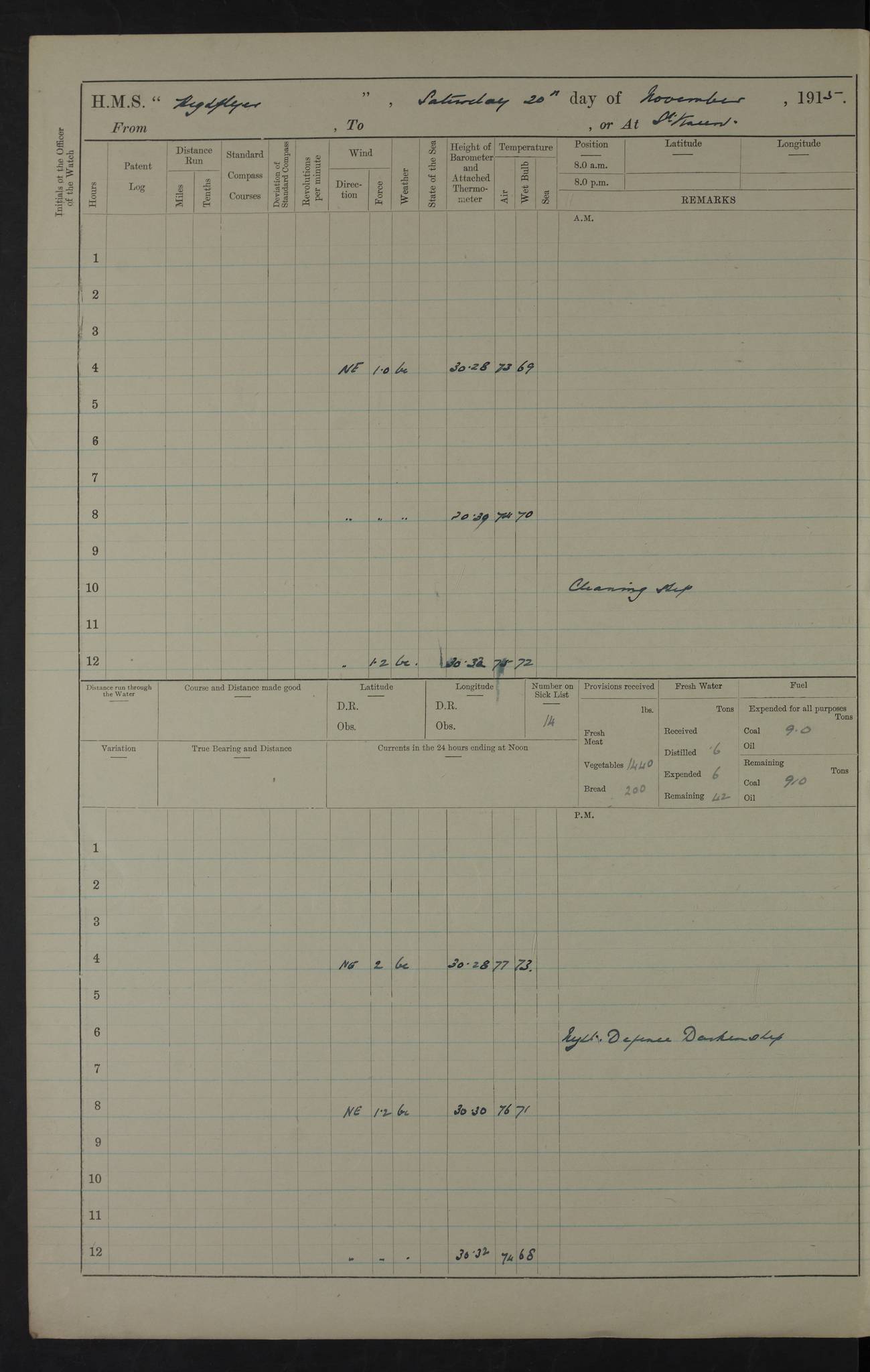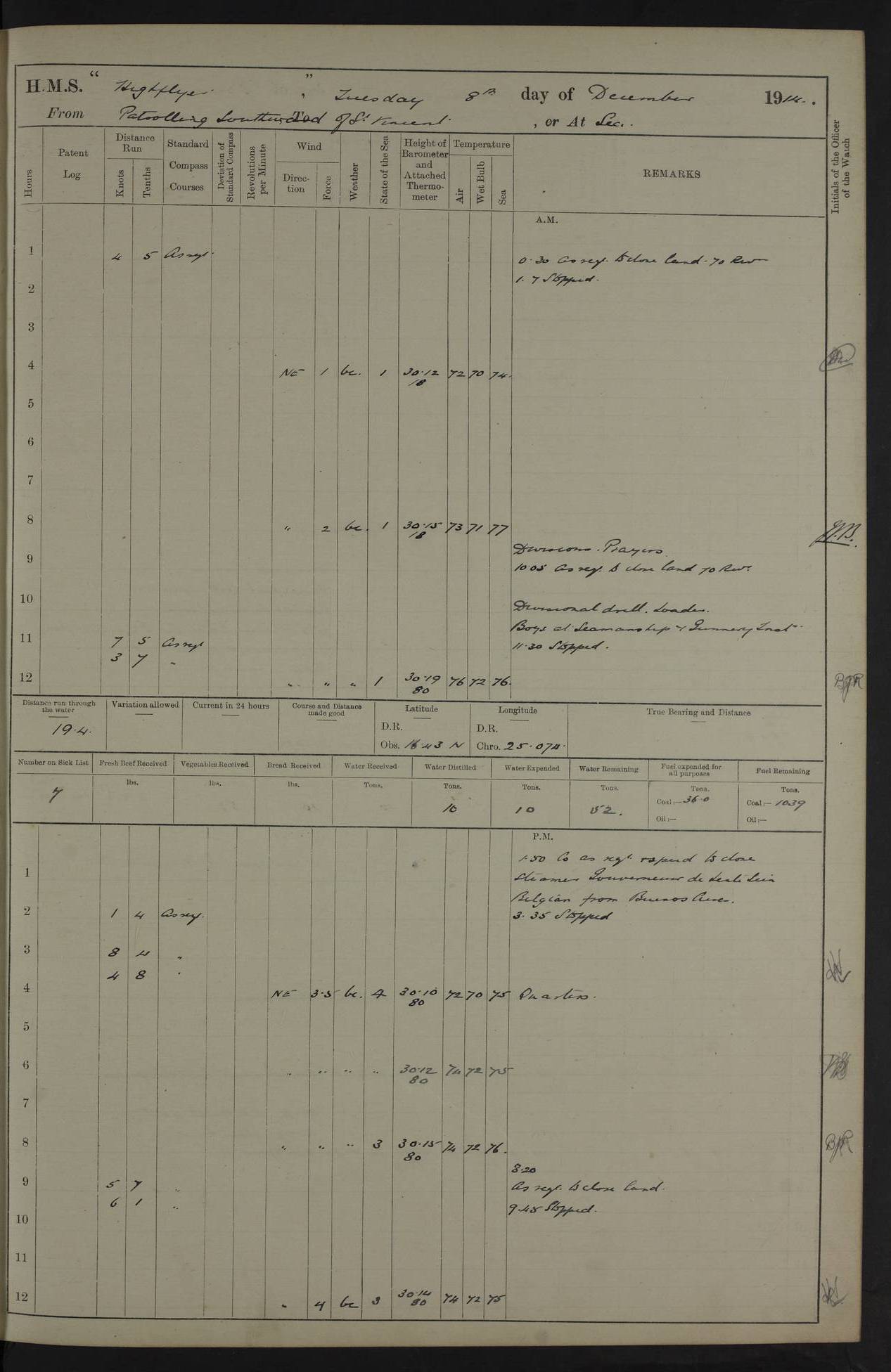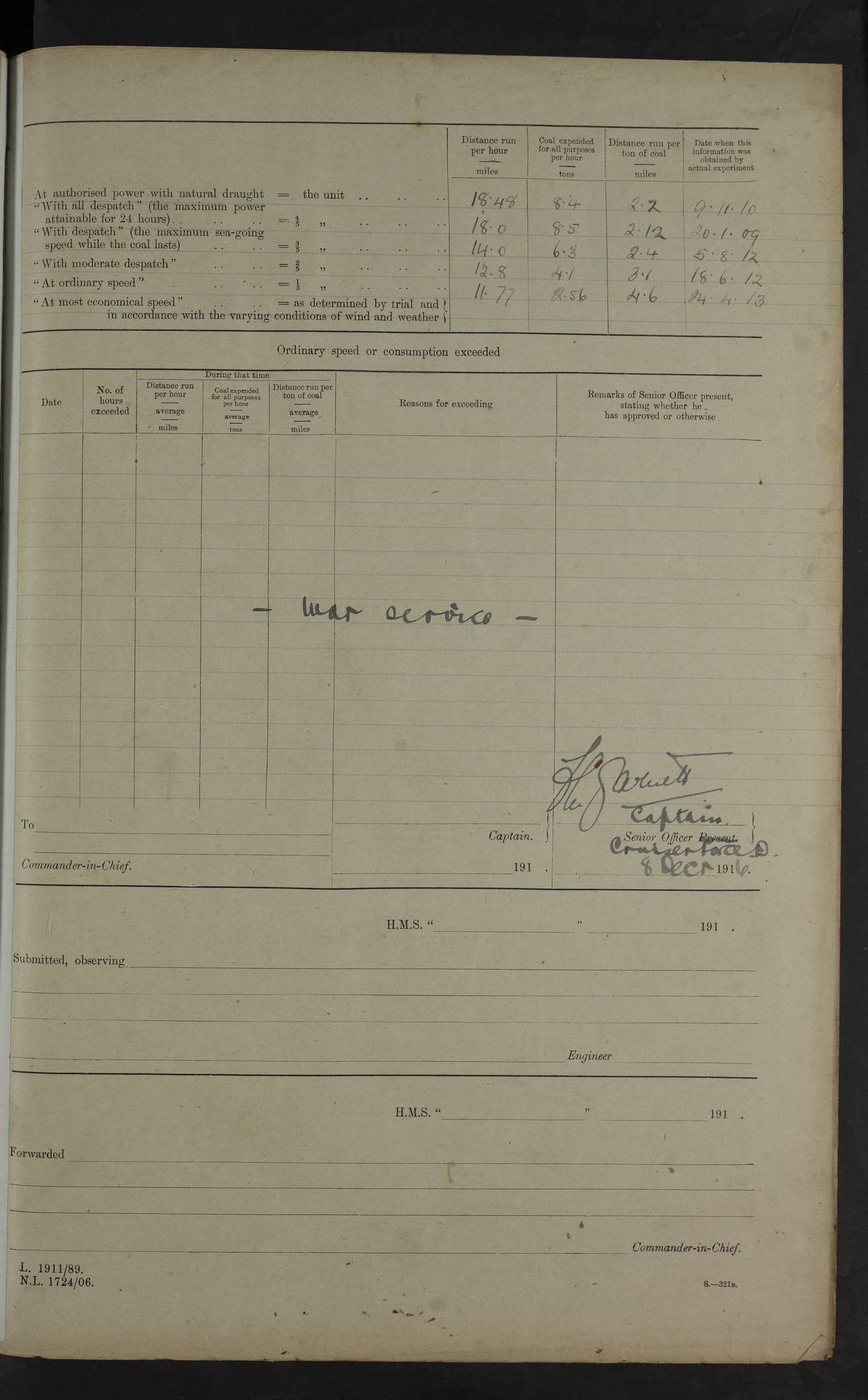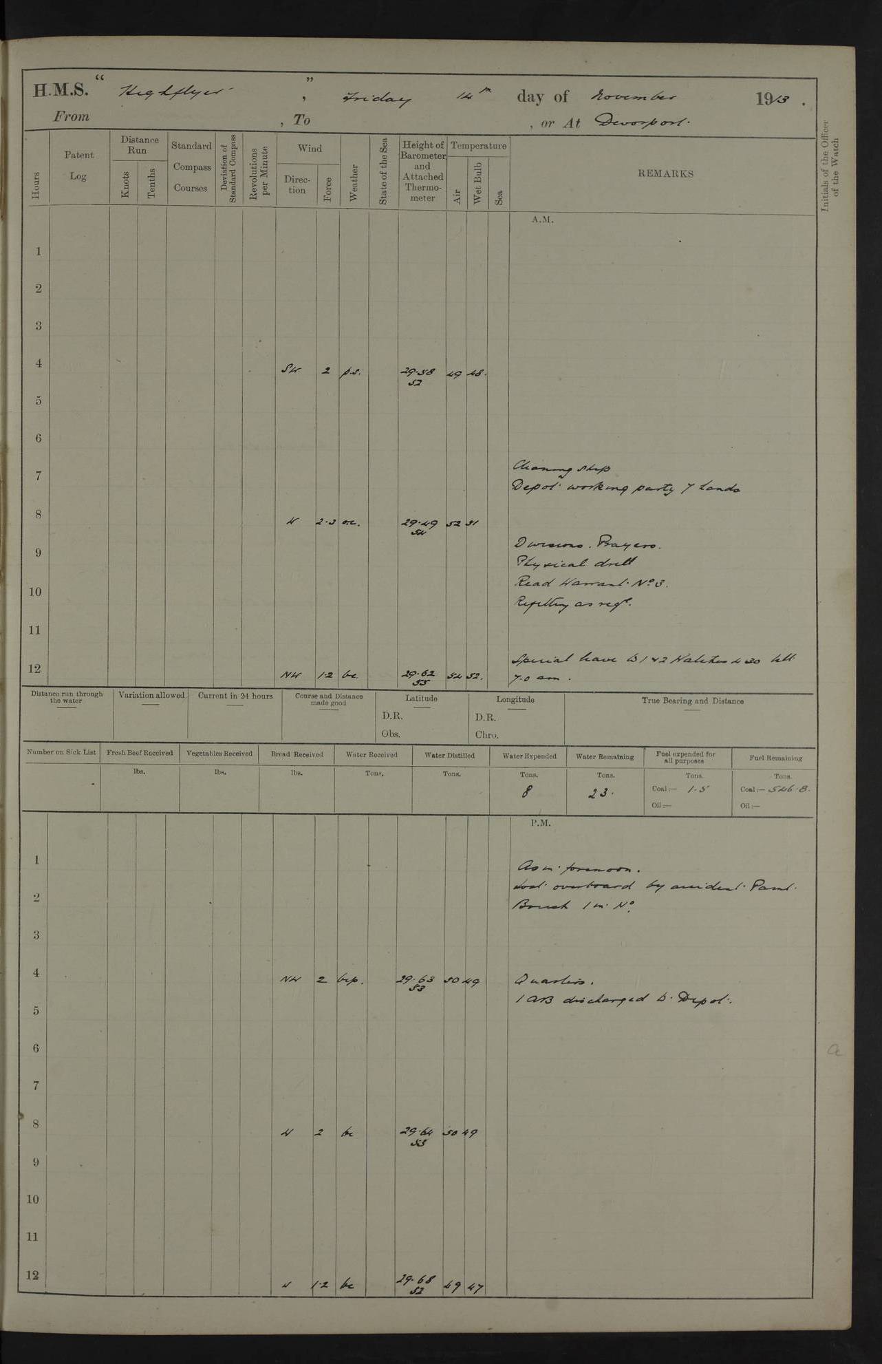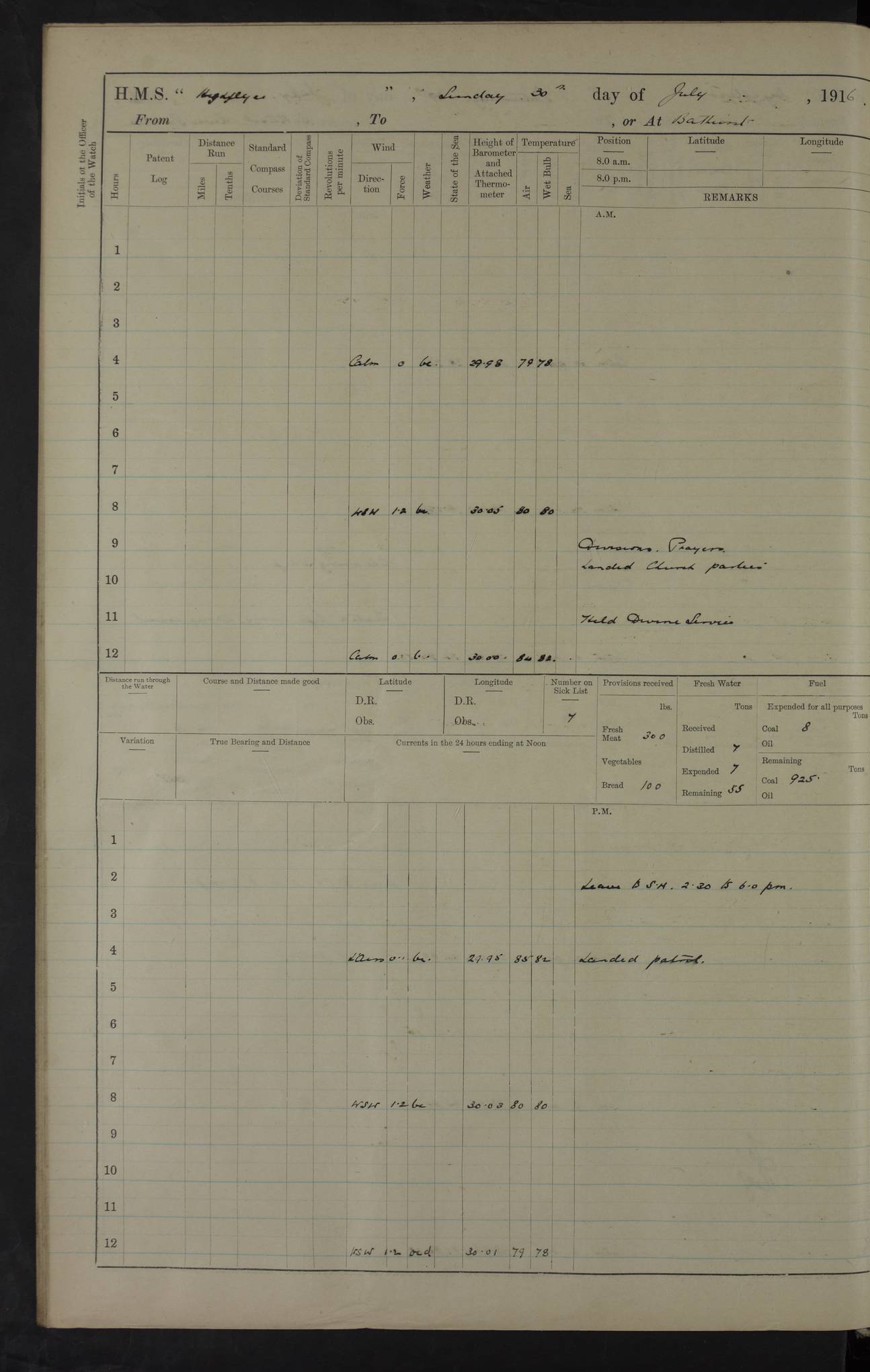 (Maps prepared using Journey Plotter, developed by Maikel. The Plots can only be approximate. They are made by joining-up positions on successive days, and sometimes positions are not given. There will therefore be occasions when the ship appears to have travelled overland) LOG BOOK – JUNE 14TH 1913 TO MAY 31ST 1914 4f960fe4a2fc8e2def00041b: (http://s3.amazonaws.com/oldweather/ADM53-44291/ADM 53-44291-001_0.jpg) 4f960fe5a2fc8e2def00041c: (http://s3.amazonaws.com/oldweather/ADM53-44291/ADM 53-44291-001_1.jpg) 4f960fe5a2fc8e2def00041d: (http://s3.amazonaws.com/oldweather/ADM53-44291/ADM 53-44291-002_0.jpg) 4f960fe5a2fc8e2def00041e: (http://s3.amazonaws.com/oldweather/ADM53-44291/ADM 53-44291-002_1.jpg) LOG of HMS Highflyer Commanded by Captain HT Buller MVO FOR THE PERIOD Commencing Saturday 14th June 1913 Ending Sunday 31st May 1914 Tonnage (displacement): 5600 Extreme length: 350 ft Extreme breadth: 54 ft ENGINES Manufacturer: Fairfield Shipbuilding & Engineering Co, Glasgow IHP: 10.000 Description: Vertical triple expansion 4 cylinders When fixed on board: 1898 BOILERS Manufacturer: Fairfield Shipbuilding & Engineering Co Description: Belleville with economisers 18 in No When made: 1898 When put in vessel: 1898 SCREW PROPELLER Manufacturer: Fairfield Shipbuilding & Engineering Co Description: Twin 3 bladed Admiralty design (bronze) General state of repair: Good 4f960fe6a2fc8e2def00041f: (http://s3.amazonaws.com/oldweather/ADM53-44291/ADM 53-44291-003_0.jpg) [Directions for using the log, figures to indicate the force of the wind and the state of the sea, and letters to denote the state of the weather.] 4f960fe6a2fc8e2def000420: (http://s3.amazonaws.com/oldweather/ADM53-44291/ADM 53-44291-003_1.jpg) Establishment of ship’s company Officers 32 Seamen 164 Boys 24 Marines 50 Engine-room establishment 134 Other non-executive ratings 466 BAROMETER Mercurial or aneroid: Mercurial Name of maker & number: Adie A 577 Height of cistern above sea: 9 feet Thermometers for air temperature Position in ship: Fore bridge Whether in screen: Yes Maker & number: Negretti & Zambra MO/A 9607 dry; from June 14, 1913 to June 1, 1914 MO/A 9603 wet; from June 14, 1913 to June 1, 1914 Thermometer for sea temperature Maker & number: J Hicks A 434; from June 14, 1913 to June 1, 1914 Position of standard compass Fore upper bridge DEVIATION OF STANDARD COMPASS Date obtained: August 29th 1913 Position: Sheerness, No 28 buoy ARMAMENT Fxle: one 6” QF PII S waist: four 6” QF PII P waist: four 6” QF PII OD: two 6” QF PII Battle deck: two 12-pounder 12-cwt SII S waist: three 12-pounder 12-cwt SII P waist: three 12-pounder 12-cwt SII AS deck: 3-pounder QF (Hotchkiss) P waist: 12-pounder 8-cwt field gun Torpedo armament 2 18” tubes BOATS 2 pinnaces, 36 ft sailing 2 cutters 1 gig, 30 ft 1 whaler 1 steam cutter, 32 ft MISCELLANEOUS INFORMATION Draught of water with bunkers full, and complete with provisions, stores and water: forward 22 ft 0 in, aft 23 ft 2 in Load draught, 600 tons coal: forward 19 ft 6 in, aft 21 ft 6 in Number of tons necessary to increase draught 1 inch: 31.5 Number of tons of coal carried (43 cubic feet per ton): a) At load draught, 600 b) With bunkers full, 1132 c) In places other than bunkers, nil Quantity of water carried: a) For boilers, 207 tons b) For drinking 60 tons THE VOYAGES OF HMS HIGHFLYER 1913-1914