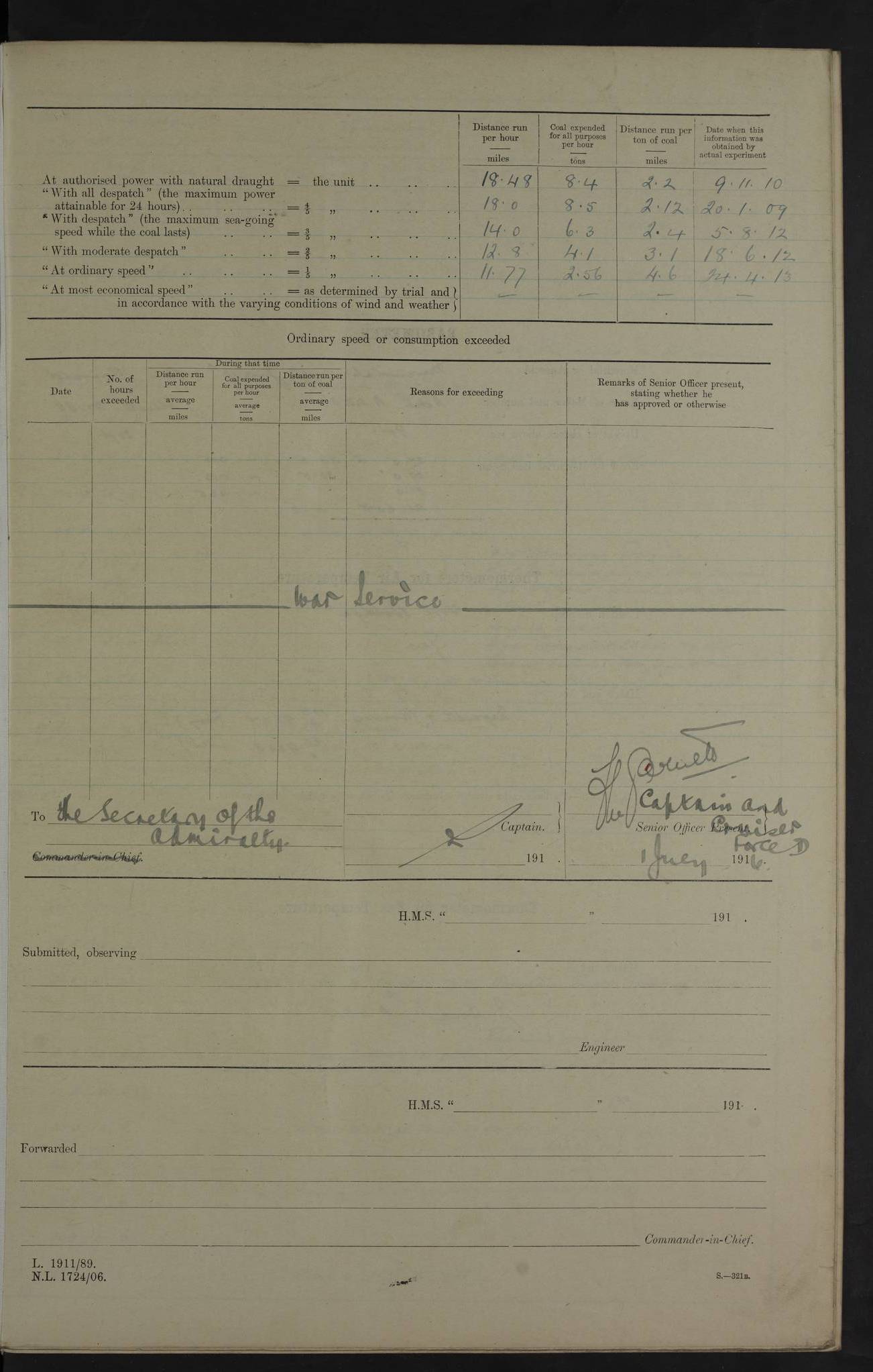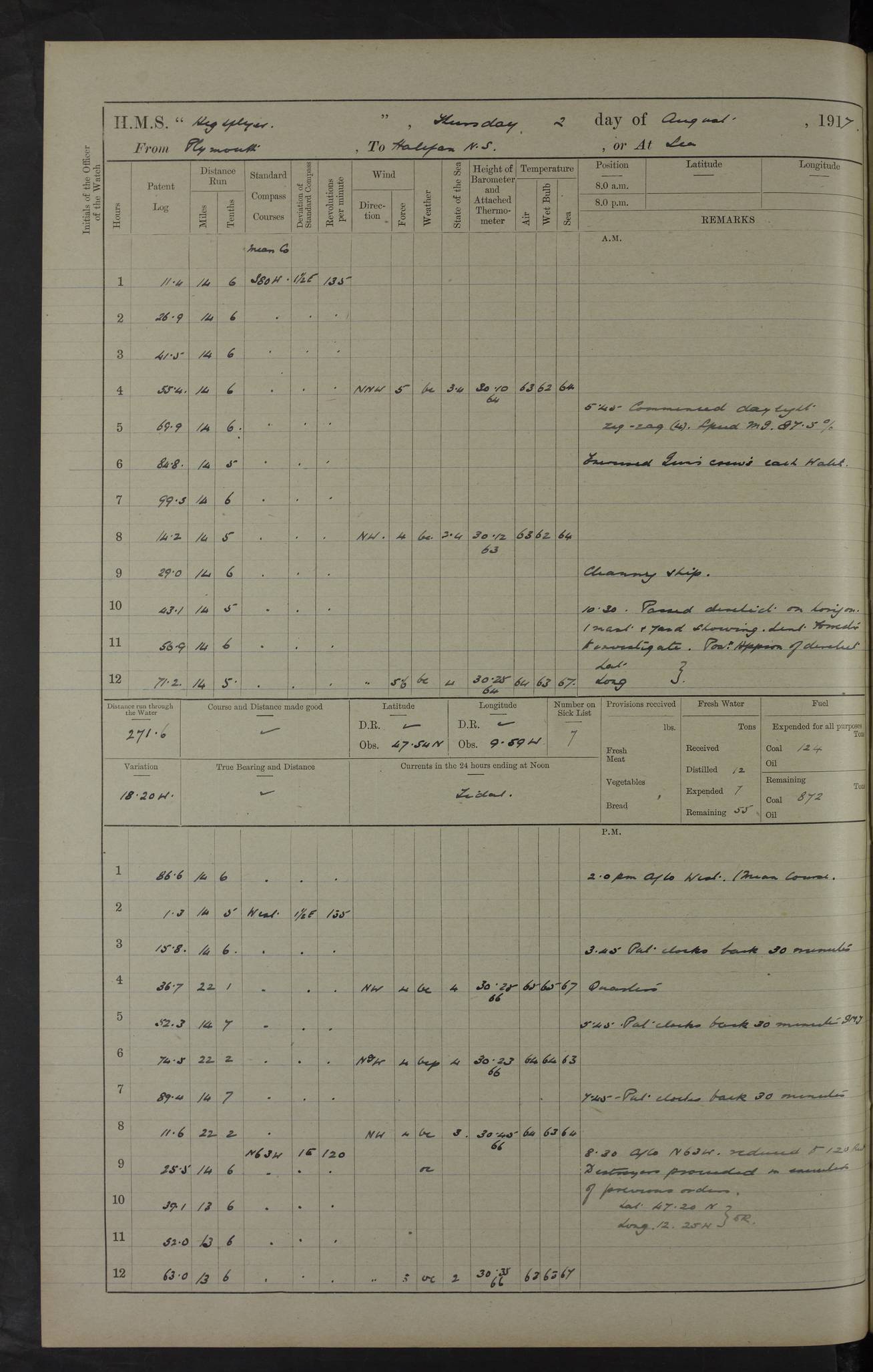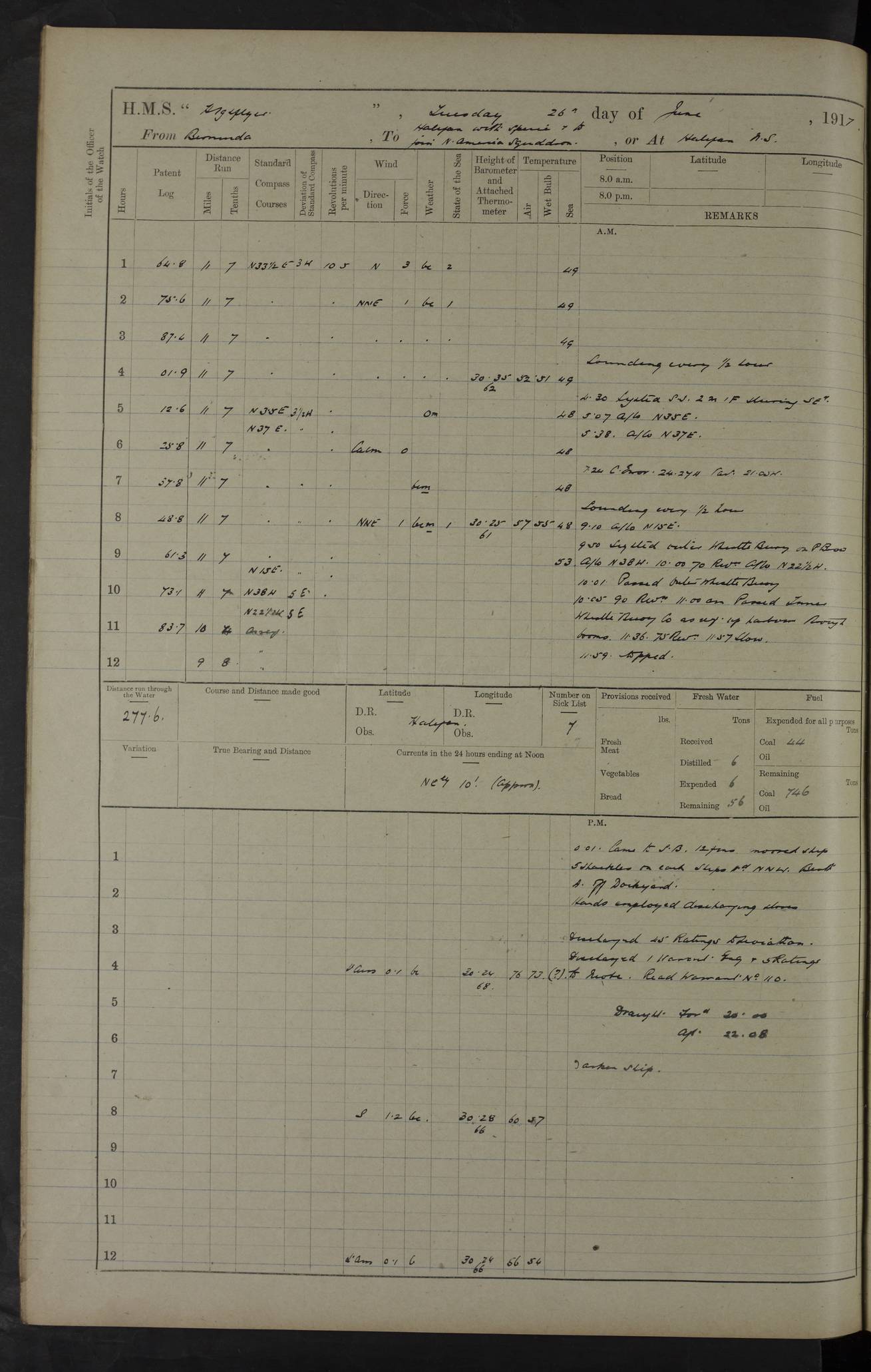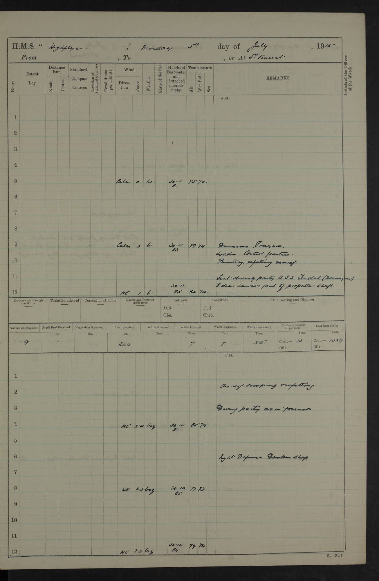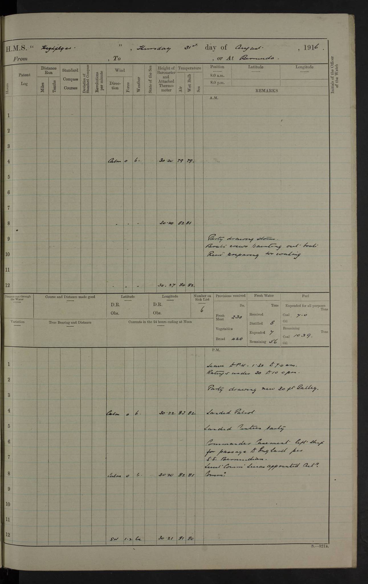 (Maps prepared using Journey Plotter, developed by Maikel. The Plots can only be approximate. They are made by joining-up positions on successive days, and sometimes positions are not given. There will therefore be occasions when the ship appears to have travelled overland) LOG BOOK – JUNE 14TH 1913 TO MAY 31ST 1914 4f960fe4a2fc8e2def00041b: (http://s3.amazonaws.com/oldweather/ADM53-44291/ADM 53-44291-001_0.jpg) 4f960fe5a2fc8e2def00041c: (http://s3.amazonaws.com/oldweather/ADM53-44291/ADM 53-44291-001_1.jpg) 4f960fe5a2fc8e2def00041d: (http://s3.amazonaws.com/oldweather/ADM53-44291/ADM 53-44291-002_0.jpg) 4f960fe5a2fc8e2def00041e: (http://s3.amazonaws.com/oldweather/ADM53-44291/ADM 53-44291-002_1.jpg) LOG of HMS Highflyer Commanded by Captain HT Buller MVO FOR THE PERIOD Commencing Saturday 14th June 1913 Ending Sunday 31st May 1914 Tonnage (displacement): 5600 Extreme length: 350 ft Extreme breadth: 54 ft ENGINES Manufacturer: Fairfield Shipbuilding & Engineering Co, Glasgow IHP: 10.000 Description: Vertical triple expansion 4 cylinders When fixed on board: 1898 BOILERS Manufacturer: Fairfield Shipbuilding & Engineering Co Description: Belleville with economisers 18 in No When made: 1898 When put in vessel: 1898 SCREW PROPELLER Manufacturer: Fairfield Shipbuilding & Engineering Co Description: Twin 3 bladed Admiralty design (bronze) General state of repair: Good 4f960fe6a2fc8e2def00041f: (http://s3.amazonaws.com/oldweather/ADM53-44291/ADM 53-44291-003_0.jpg) [Directions for using the log, figures to indicate the force of the wind and the state of the sea, and letters to denote the state of the weather.] 4f960fe6a2fc8e2def000420: (http://s3.amazonaws.com/oldweather/ADM53-44291/ADM 53-44291-003_1.jpg) Establishment of ship’s company Officers 32 Seamen 164 Boys 24 Marines 50 Engine-room establishment 134 Other non-executive ratings 466 BAROMETER Mercurial or aneroid: Mercurial Name of maker & number: Adie A 577 Height of cistern above sea: 9 feet Thermometers for air temperature Position in ship: Fore bridge Whether in screen: Yes Maker & number: Negretti & Zambra MO/A 9607 dry; from June 14, 1913 to June 1, 1914 MO/A 9603 wet; from June 14, 1913 to June 1, 1914 Thermometer for sea temperature Maker & number: J Hicks A 434; from June 14, 1913 to June 1, 1914 Position of standard compass Fore upper bridge DEVIATION OF STANDARD COMPASS Date obtained: August 29th 1913 Position: Sheerness, No 28 buoy ARMAMENT Fxle: one 6” QF PII S waist: four 6” QF PII P waist: four 6” QF PII OD: two 6” QF PII Battle deck: two 12-pounder 12-cwt SII S waist: three 12-pounder 12-cwt SII P waist: three 12-pounder 12-cwt SII AS deck: 3-pounder QF (Hotchkiss) P waist: 12-pounder 8-cwt field gun Torpedo armament 2 18” tubes BOATS 2 pinnaces, 36 ft sailing 2 cutters 1 gig, 30 ft 1 whaler 1 steam cutter, 32 ft MISCELLANEOUS INFORMATION Draught of water with bunkers full, and complete with provisions, stores and water: forward 22 ft 0 in, aft 23 ft 2 in Load draught, 600 tons coal: forward 19 ft 6 in, aft 21 ft 6 in Number of tons necessary to increase draught 1 inch: 31.5 Number of tons of coal carried (43 cubic feet per ton): a) At load draught, 600 b) With bunkers full, 1132 c) In places other than bunkers, nil Quantity of water carried: a) For boilers, 207 tons b) For drinking 60 tons THE VOYAGES OF HMS HIGHFLYER 1913-1914