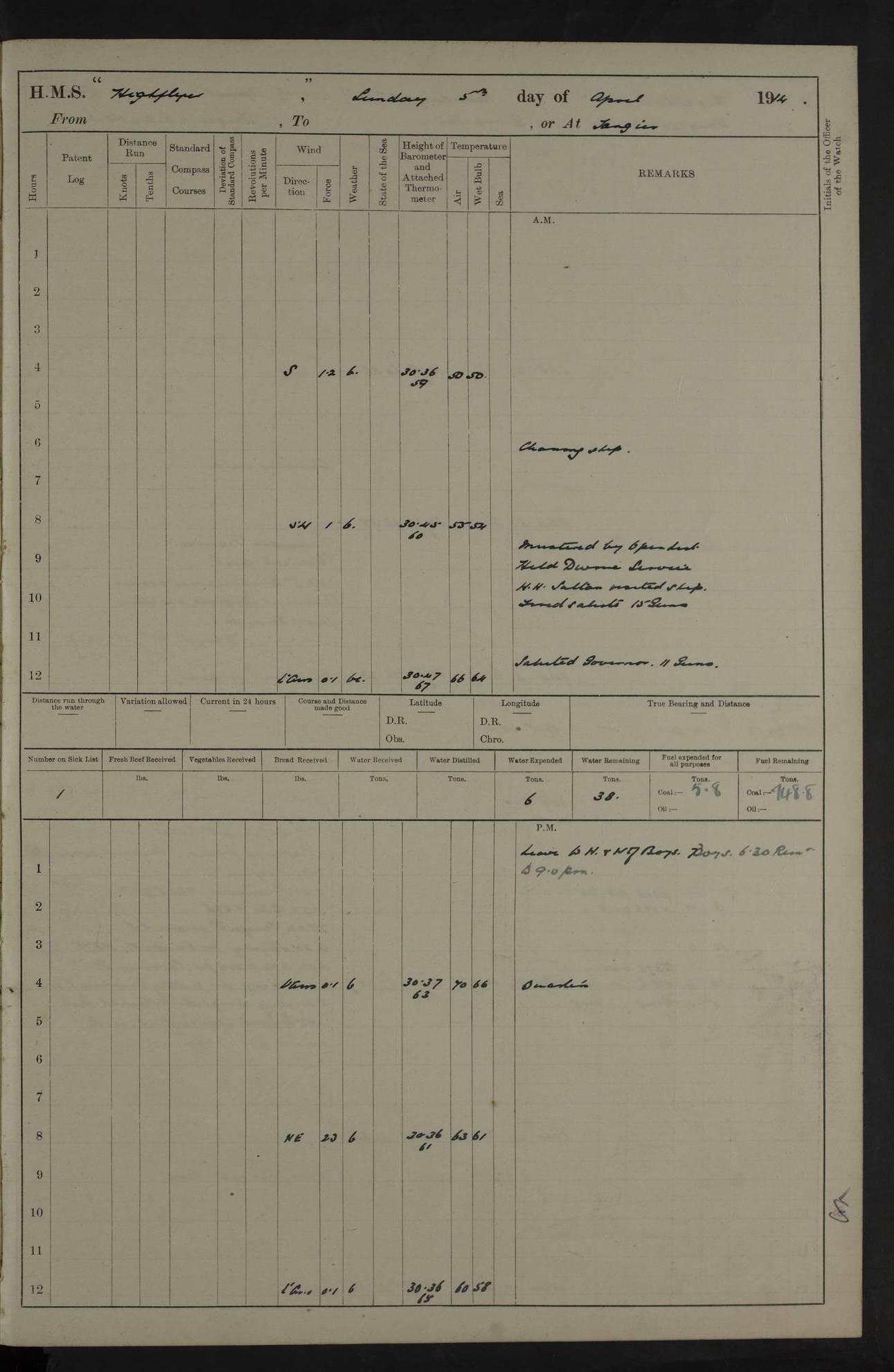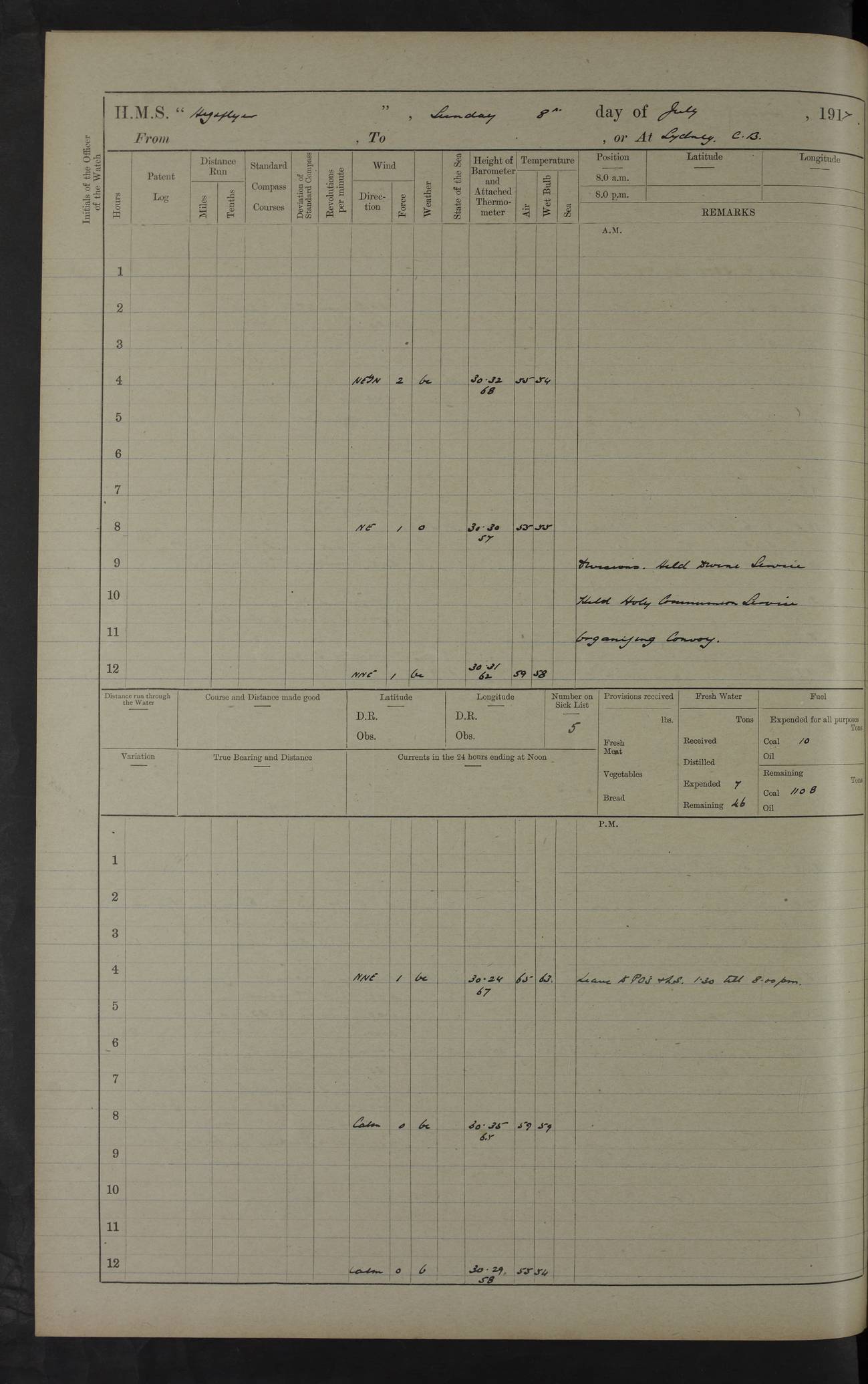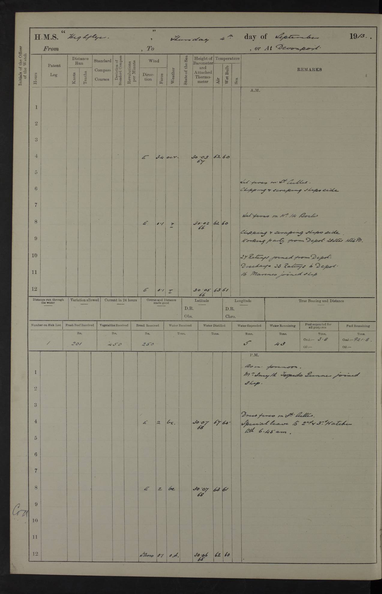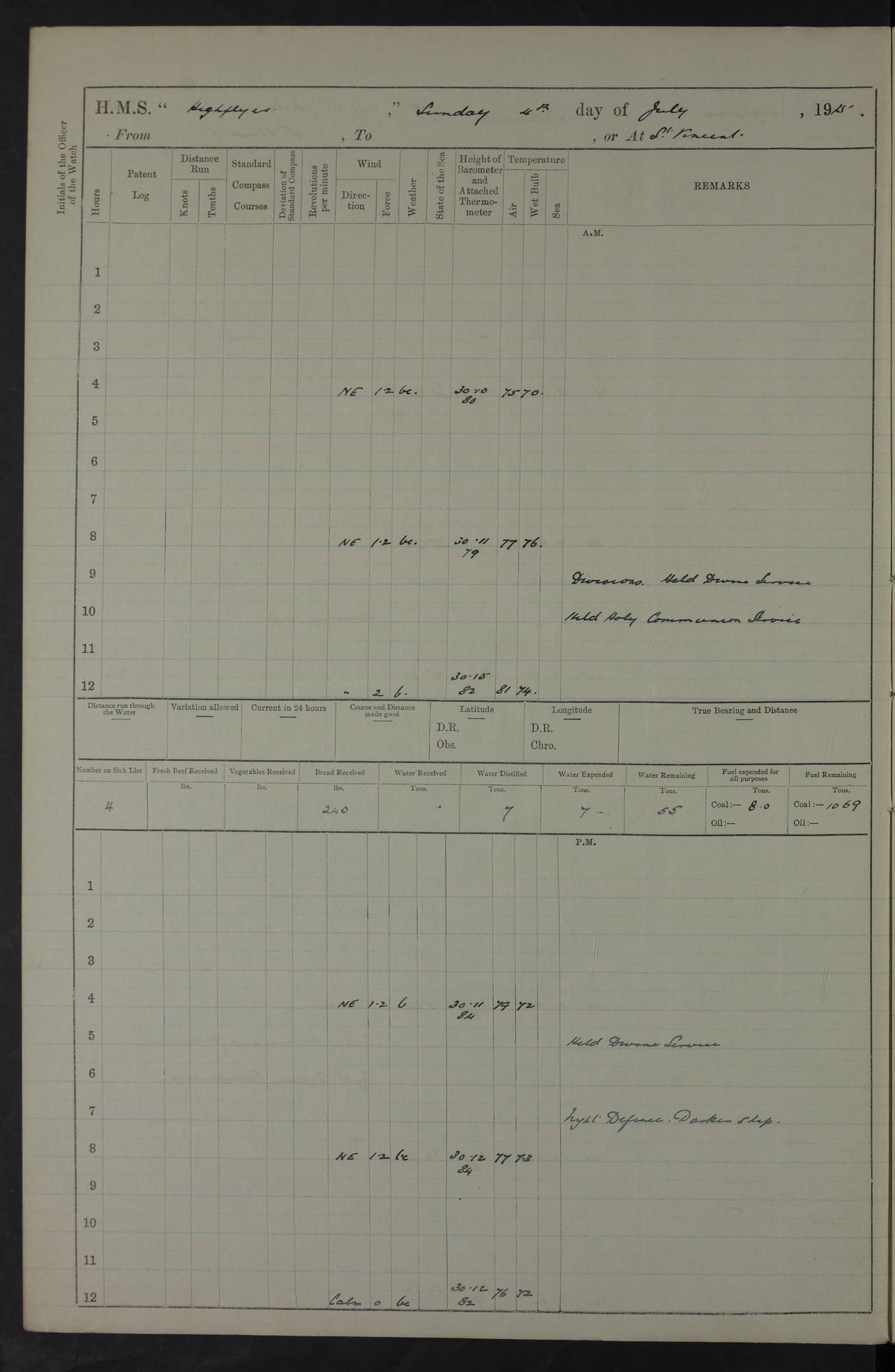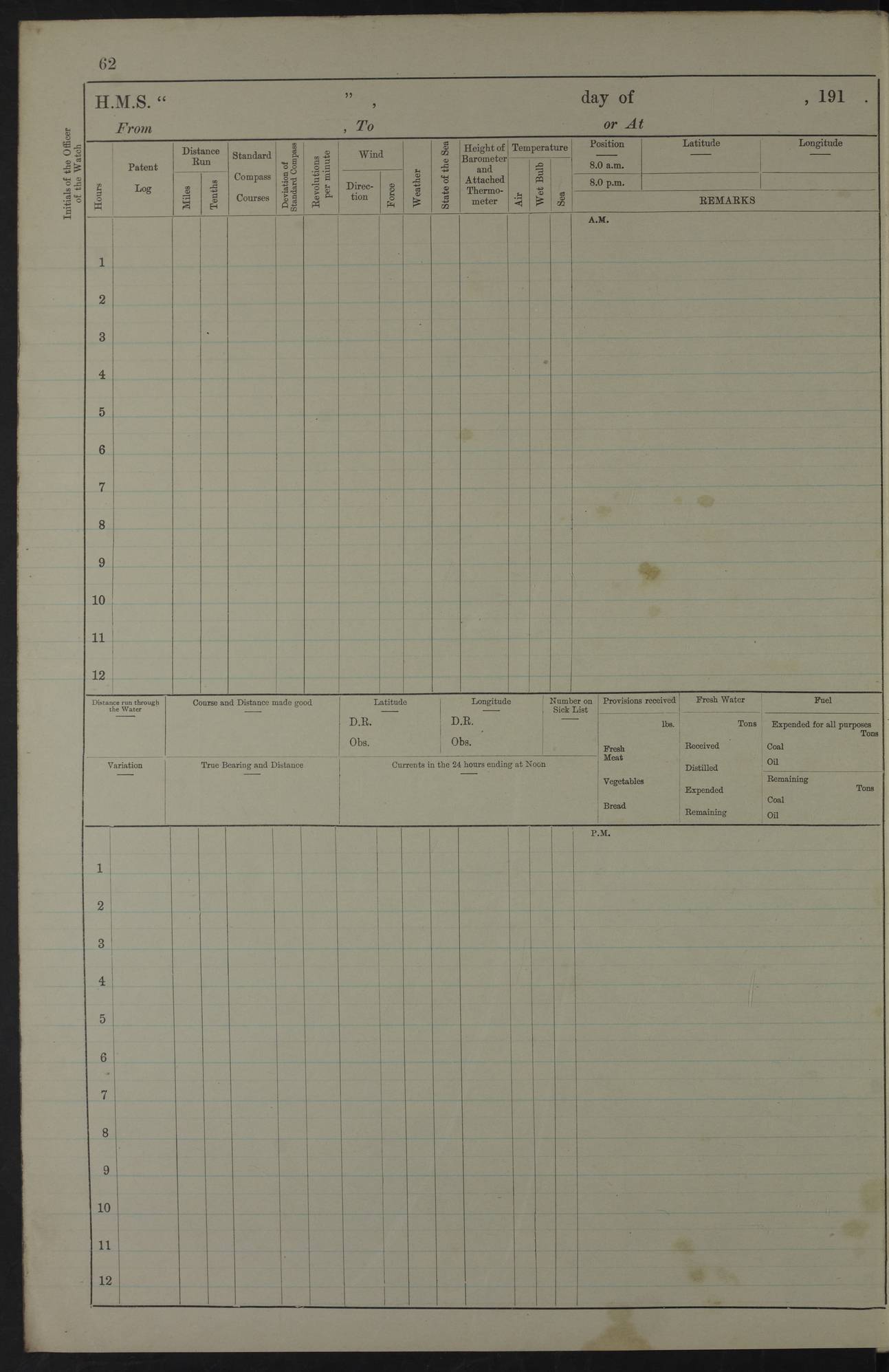 (Maps prepared using Journey Plotter, developed by Maikel. The Plots can only be approximate. They are made by joining-up positions on successive days, and sometimes positions are not given. There will therefore be occasions when the ship appears to have travelled overland) LOG BOOK – JUNE 14TH 1913 TO MAY 31ST 1914 4f960fe4a2fc8e2def00041b: (http://s3.amazonaws.com/oldweather/ADM53-44291/ADM 53-44291-001_0.jpg) 4f960fe5a2fc8e2def00041c: (http://s3.amazonaws.com/oldweather/ADM53-44291/ADM 53-44291-001_1.jpg) 4f960fe5a2fc8e2def00041d: (http://s3.amazonaws.com/oldweather/ADM53-44291/ADM 53-44291-002_0.jpg) 4f960fe5a2fc8e2def00041e: (http://s3.amazonaws.com/oldweather/ADM53-44291/ADM 53-44291-002_1.jpg) LOG of HMS Highflyer Commanded by Captain HT Buller MVO FOR THE PERIOD Commencing Saturday 14th June 1913 Ending Sunday 31st May 1914 Tonnage (displacement): 5600 Extreme length: 350 ft Extreme breadth: 54 ft ENGINES Manufacturer: Fairfield Shipbuilding & Engineering Co, Glasgow IHP: 10.000 Description: Vertical triple expansion 4 cylinders When fixed on board: 1898 BOILERS Manufacturer: Fairfield Shipbuilding & Engineering Co Description: Belleville with economisers 18 in No When made: 1898 When put in vessel: 1898 SCREW PROPELLER Manufacturer: Fairfield Shipbuilding & Engineering Co Description: Twin 3 bladed Admiralty design (bronze) General state of repair: Good 4f960fe6a2fc8e2def00041f: (http://s3.amazonaws.com/oldweather/ADM53-44291/ADM 53-44291-003_0.jpg) [Directions for using the log, figures to indicate the force of the wind and the state of the sea, and letters to denote the state of the weather.] 4f960fe6a2fc8e2def000420: (http://s3.amazonaws.com/oldweather/ADM53-44291/ADM 53-44291-003_1.jpg) Establishment of ship’s company Officers 32 Seamen 164 Boys 24 Marines 50 Engine-room establishment 134 Other non-executive ratings 466 BAROMETER Mercurial or aneroid: Mercurial Name of maker & number: Adie A 577 Height of cistern above sea: 9 feet Thermometers for air temperature Position in ship: Fore bridge Whether in screen: Yes Maker & number: Negretti & Zambra MO/A 9607 dry; from June 14, 1913 to June 1, 1914 MO/A 9603 wet; from June 14, 1913 to June 1, 1914 Thermometer for sea temperature Maker & number: J Hicks A 434; from June 14, 1913 to June 1, 1914 Position of standard compass Fore upper bridge DEVIATION OF STANDARD COMPASS Date obtained: August 29th 1913 Position: Sheerness, No 28 buoy ARMAMENT Fxle: one 6” QF PII S waist: four 6” QF PII P waist: four 6” QF PII OD: two 6” QF PII Battle deck: two 12-pounder 12-cwt SII S waist: three 12-pounder 12-cwt SII P waist: three 12-pounder 12-cwt SII AS deck: 3-pounder QF (Hotchkiss) P waist: 12-pounder 8-cwt field gun Torpedo armament 2 18” tubes BOATS 2 pinnaces, 36 ft sailing 2 cutters 1 gig, 30 ft 1 whaler 1 steam cutter, 32 ft MISCELLANEOUS INFORMATION Draught of water with bunkers full, and complete with provisions, stores and water: forward 22 ft 0 in, aft 23 ft 2 in Load draught, 600 tons coal: forward 19 ft 6 in, aft 21 ft 6 in Number of tons necessary to increase draught 1 inch: 31.5 Number of tons of coal carried (43 cubic feet per ton): a) At load draught, 600 b) With bunkers full, 1132 c) In places other than bunkers, nil Quantity of water carried: a) For boilers, 207 tons b) For drinking 60 tons THE VOYAGES OF HMS HIGHFLYER 1913-1914