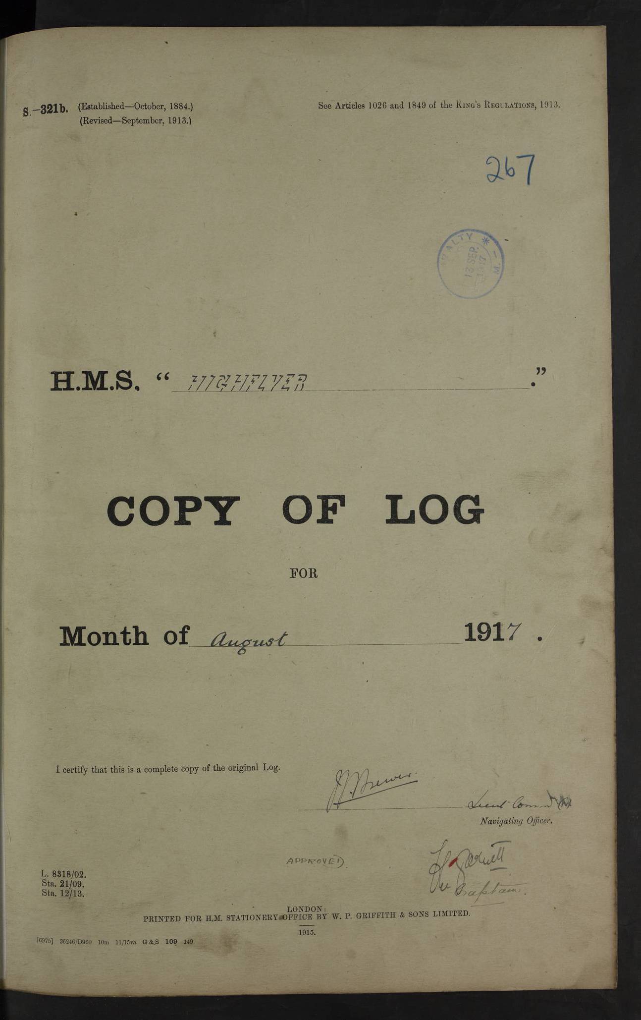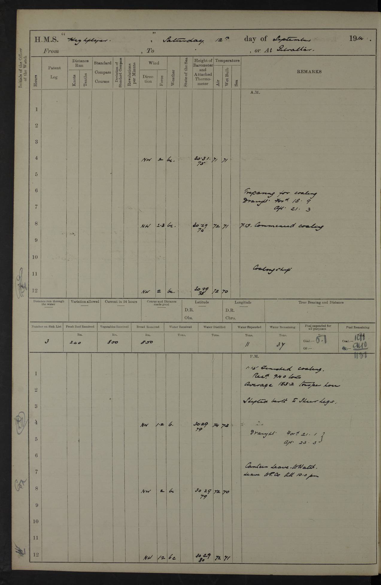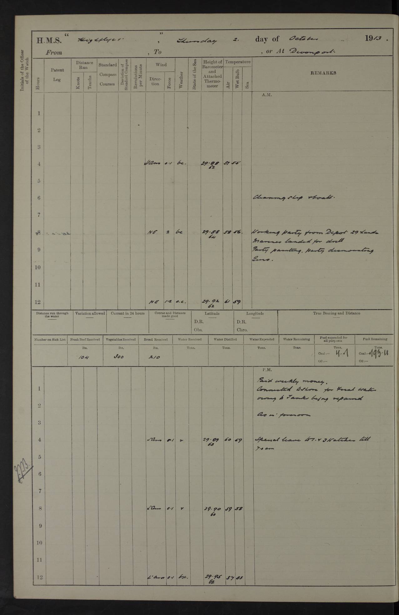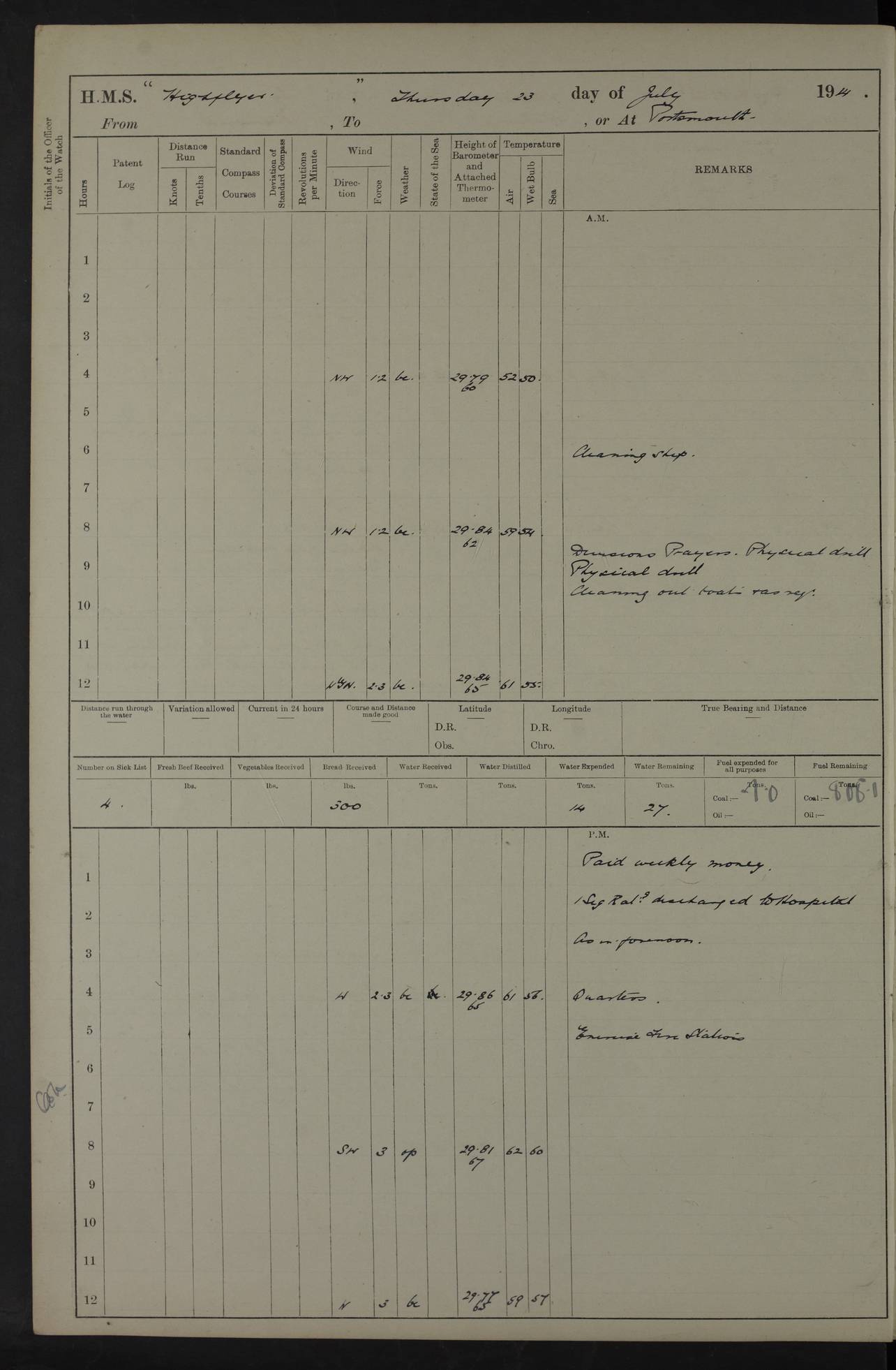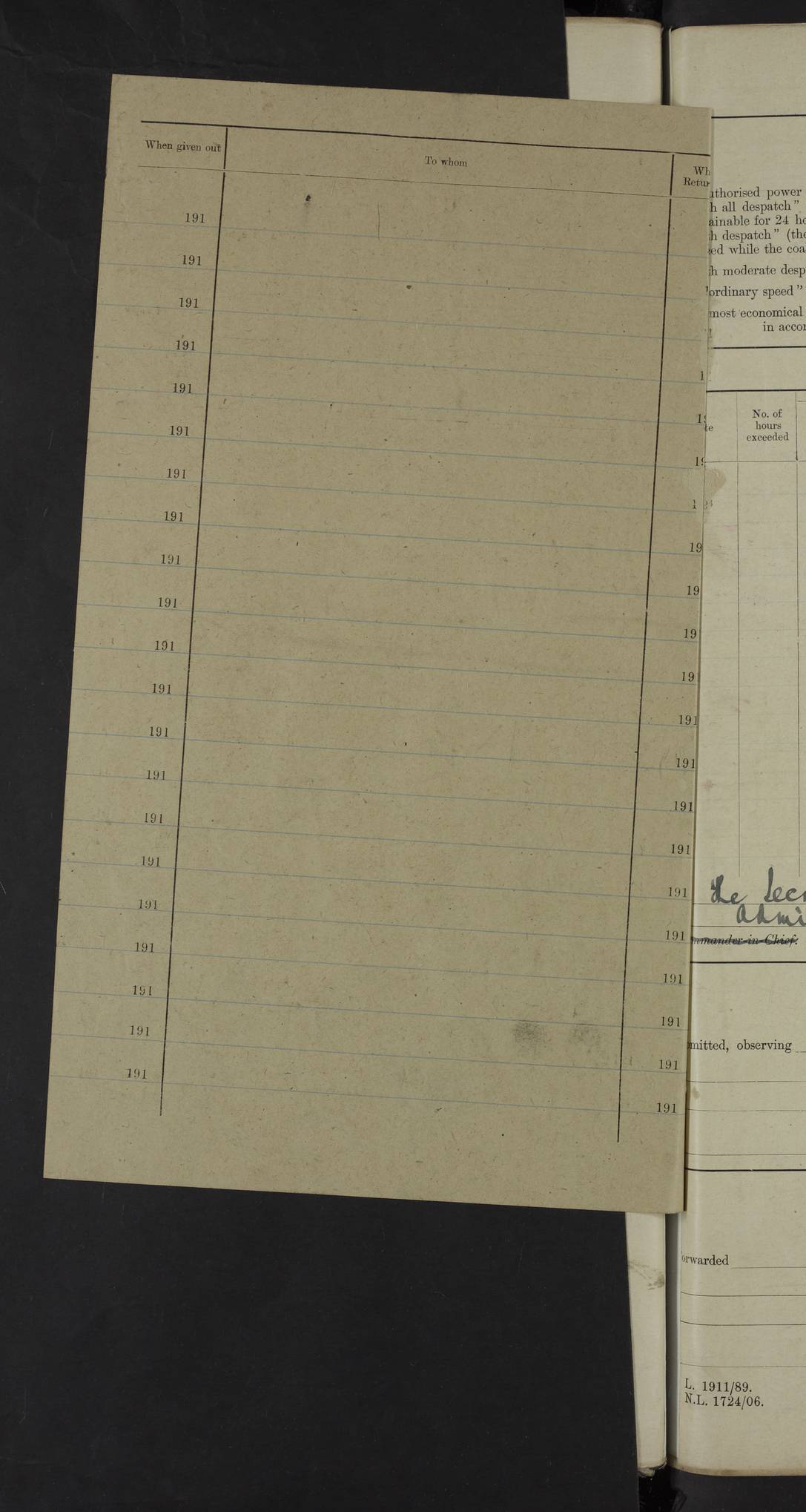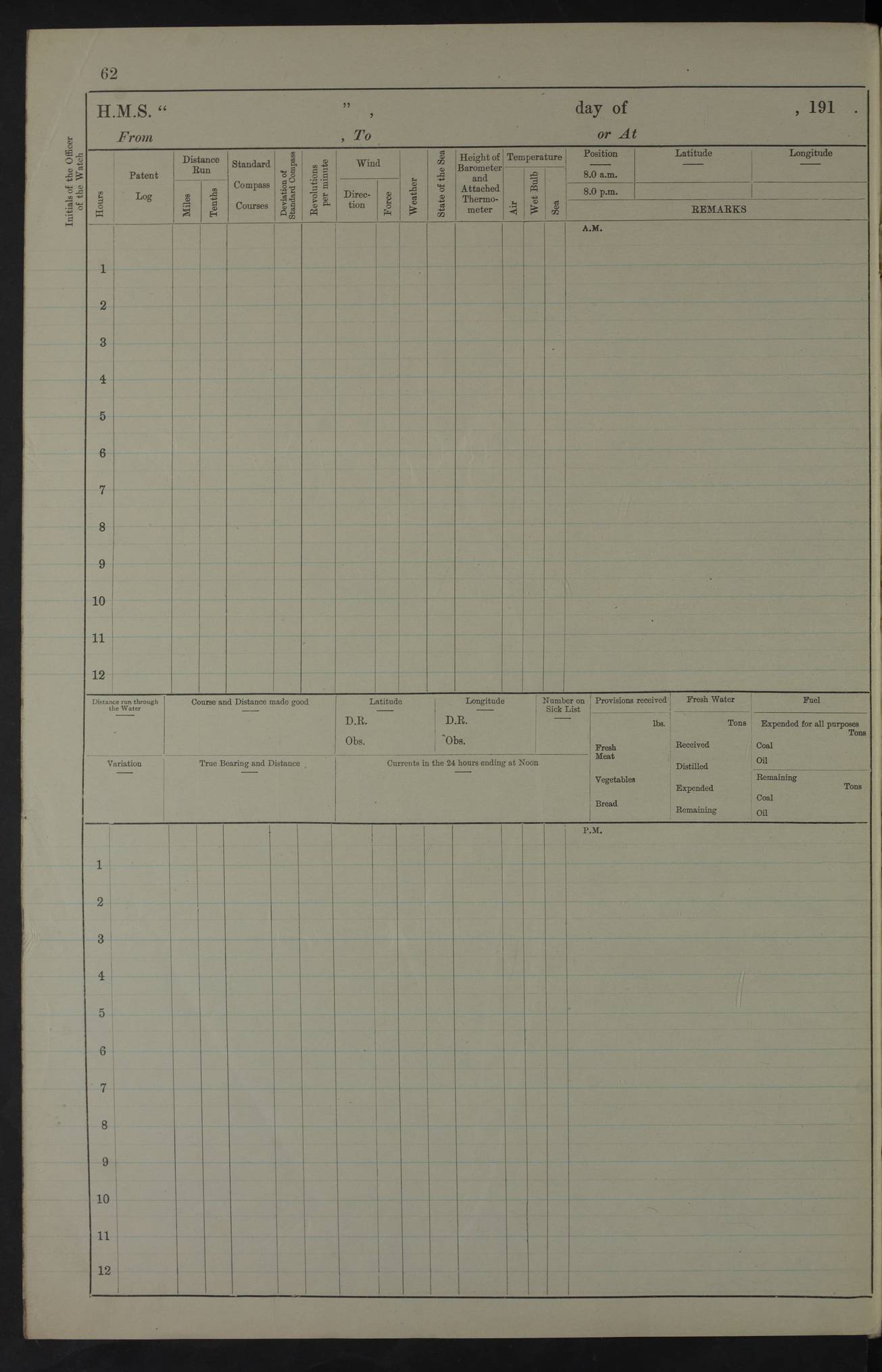 (Maps prepared using Journey Plotter, developed by Maikel. The Plots can only be approximate. They are made by joining-up positions on successive days, and sometimes positions are not given. There will therefore be occasions when the ship appears to have travelled overland) LOG BOOK – JUNE 14TH 1913 TO MAY 31ST 1914 4f960fe4a2fc8e2def00041b: (http://s3.amazonaws.com/oldweather/ADM53-44291/ADM 53-44291-001_0.jpg) 4f960fe5a2fc8e2def00041c: (http://s3.amazonaws.com/oldweather/ADM53-44291/ADM 53-44291-001_1.jpg) 4f960fe5a2fc8e2def00041d: (http://s3.amazonaws.com/oldweather/ADM53-44291/ADM 53-44291-002_0.jpg) 4f960fe5a2fc8e2def00041e: (http://s3.amazonaws.com/oldweather/ADM53-44291/ADM 53-44291-002_1.jpg) LOG of HMS Highflyer Commanded by Captain HT Buller MVO FOR THE PERIOD Commencing Saturday 14th June 1913 Ending Sunday 31st May 1914 Tonnage (displacement): 5600 Extreme length: 350 ft Extreme breadth: 54 ft ENGINES Manufacturer: Fairfield Shipbuilding & Engineering Co, Glasgow IHP: 10.000 Description: Vertical triple expansion 4 cylinders When fixed on board: 1898 BOILERS Manufacturer: Fairfield Shipbuilding & Engineering Co Description: Belleville with economisers 18 in No When made: 1898 When put in vessel: 1898 SCREW PROPELLER Manufacturer: Fairfield Shipbuilding & Engineering Co Description: Twin 3 bladed Admiralty design (bronze) General state of repair: Good 4f960fe6a2fc8e2def00041f: (http://s3.amazonaws.com/oldweather/ADM53-44291/ADM 53-44291-003_0.jpg) [Directions for using the log, figures to indicate the force of the wind and the state of the sea, and letters to denote the state of the weather.] 4f960fe6a2fc8e2def000420: (http://s3.amazonaws.com/oldweather/ADM53-44291/ADM 53-44291-003_1.jpg) Establishment of ship’s company Officers 32 Seamen 164 Boys 24 Marines 50 Engine-room establishment 134 Other non-executive ratings 466 BAROMETER Mercurial or aneroid: Mercurial Name of maker & number: Adie A 577 Height of cistern above sea: 9 feet Thermometers for air temperature Position in ship: Fore bridge Whether in screen: Yes Maker & number: Negretti & Zambra MO/A 9607 dry; from June 14, 1913 to June 1, 1914 MO/A 9603 wet; from June 14, 1913 to June 1, 1914 Thermometer for sea temperature Maker & number: J Hicks A 434; from June 14, 1913 to June 1, 1914 Position of standard compass Fore upper bridge DEVIATION OF STANDARD COMPASS Date obtained: August 29th 1913 Position: Sheerness, No 28 buoy ARMAMENT Fxle: one 6” QF PII S waist: four 6” QF PII P waist: four 6” QF PII OD: two 6” QF PII Battle deck: two 12-pounder 12-cwt SII S waist: three 12-pounder 12-cwt SII P waist: three 12-pounder 12-cwt SII AS deck: 3-pounder QF (Hotchkiss) P waist: 12-pounder 8-cwt field gun Torpedo armament 2 18” tubes BOATS 2 pinnaces, 36 ft sailing 2 cutters 1 gig, 30 ft 1 whaler 1 steam cutter, 32 ft MISCELLANEOUS INFORMATION Draught of water with bunkers full, and complete with provisions, stores and water: forward 22 ft 0 in, aft 23 ft 2 in Load draught, 600 tons coal: forward 19 ft 6 in, aft 21 ft 6 in Number of tons necessary to increase draught 1 inch: 31.5 Number of tons of coal carried (43 cubic feet per ton): a) At load draught, 600 b) With bunkers full, 1132 c) In places other than bunkers, nil Quantity of water carried: a) For boilers, 207 tons b) For drinking 60 tons THE VOYAGES OF HMS HIGHFLYER 1913-1914