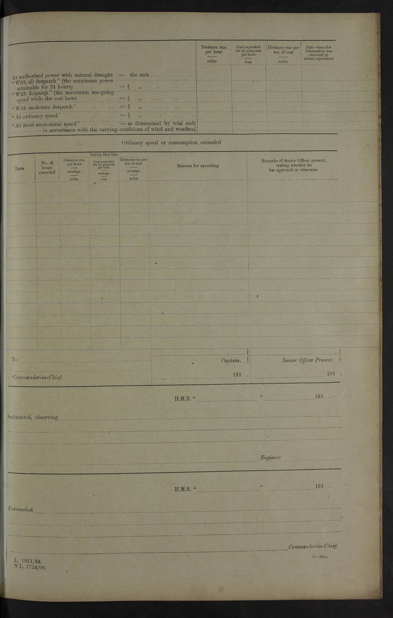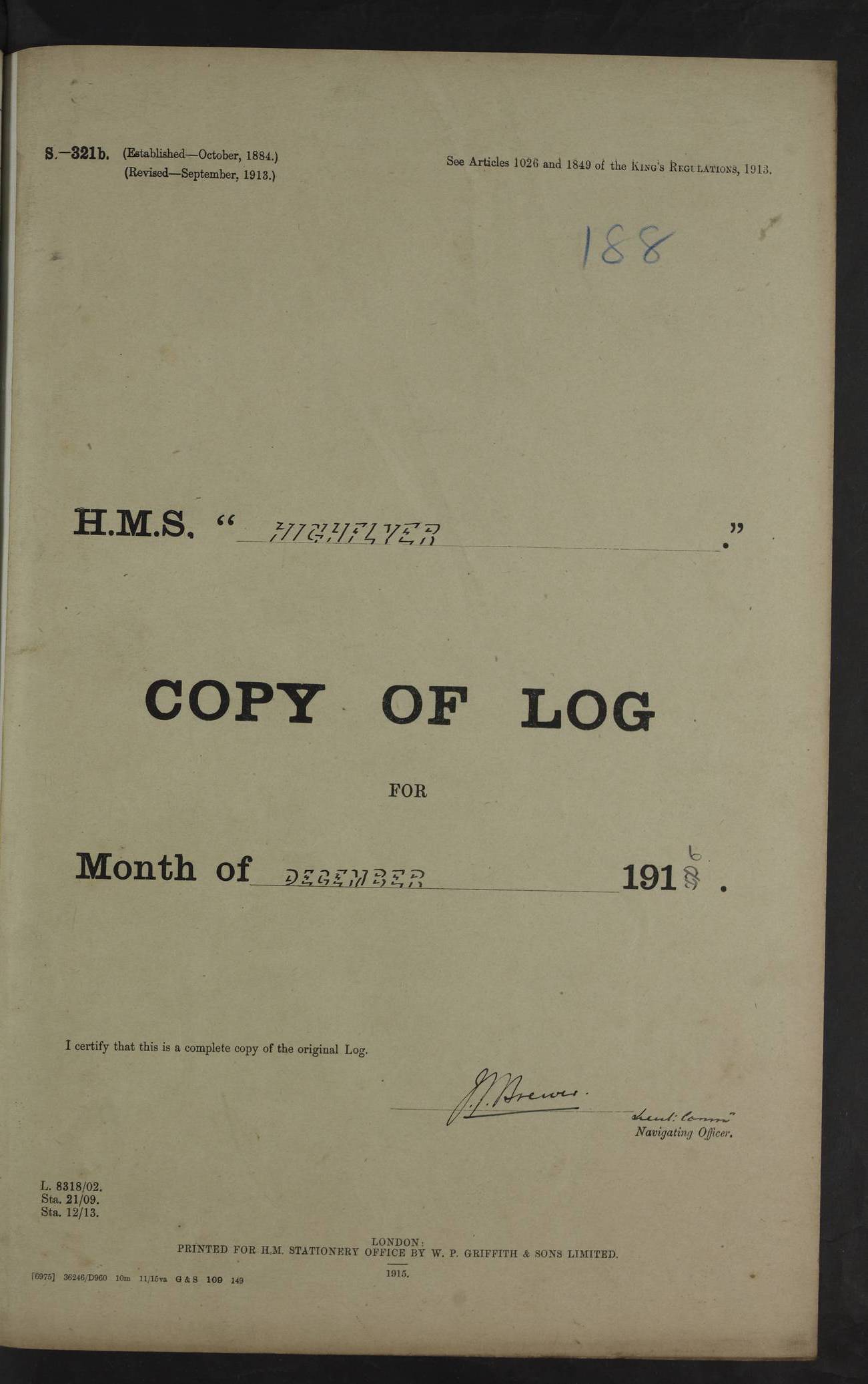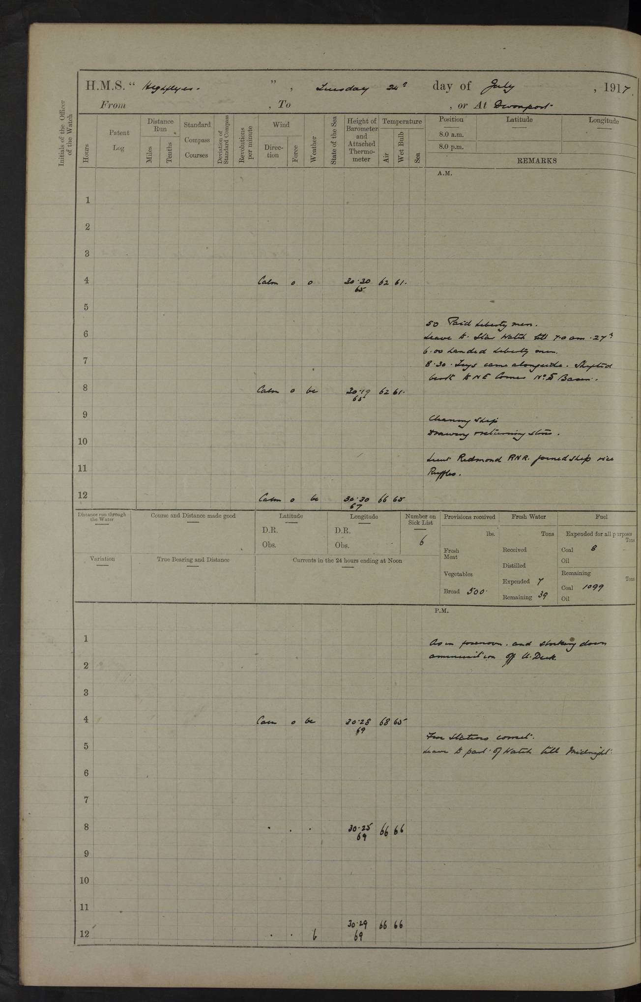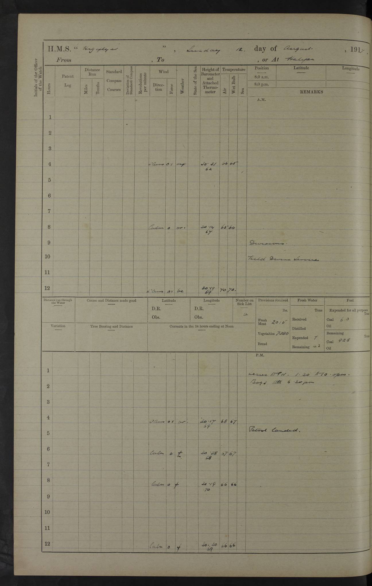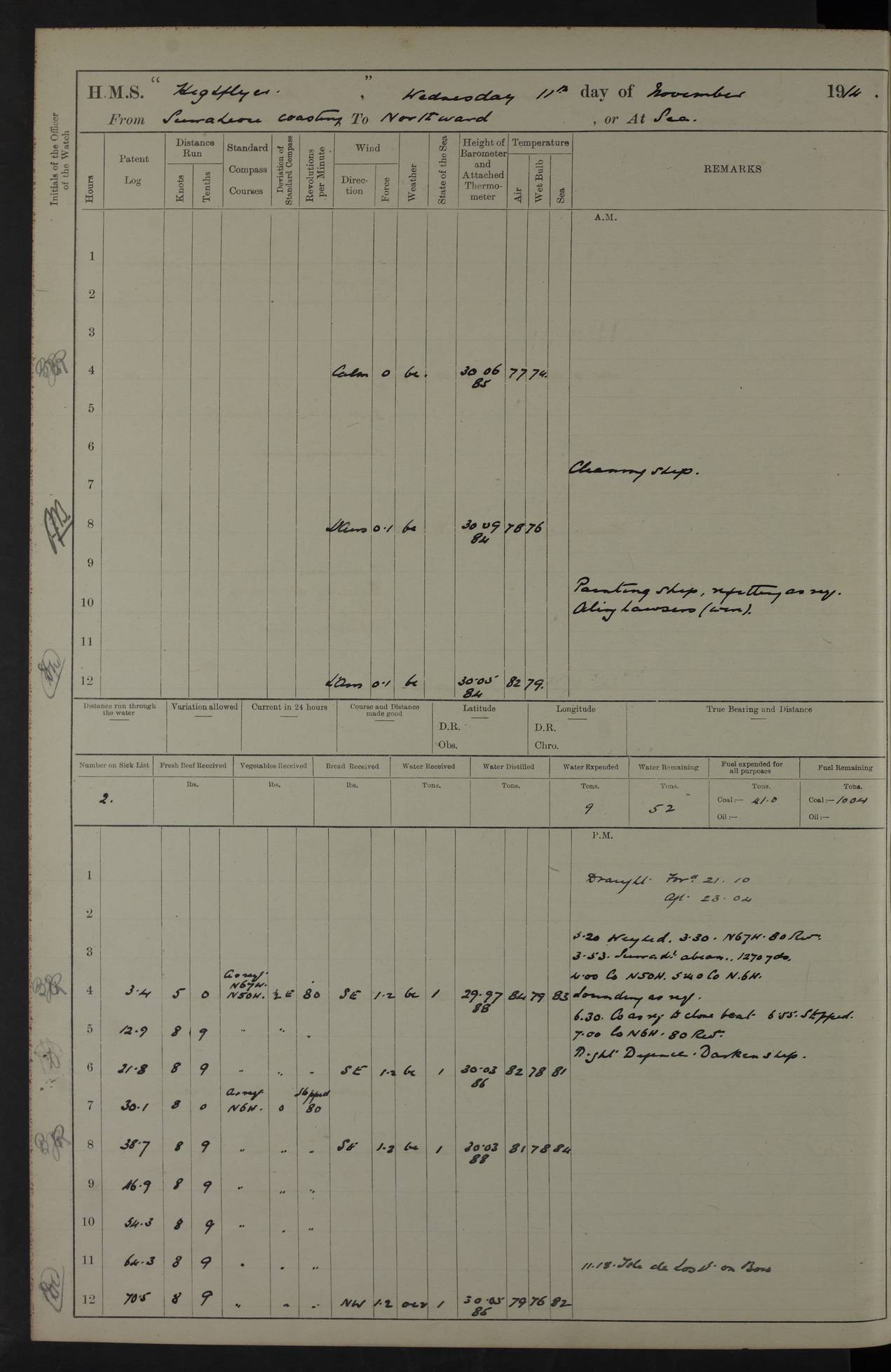 (Maps prepared using Journey Plotter, developed by Maikel. The Plots can only be approximate. They are made by joining-up positions on successive days, and sometimes positions are not given. There will therefore be occasions when the ship appears to have travelled overland) LOG BOOK – JUNE 14TH 1913 TO MAY 31ST 1914 4f960fe4a2fc8e2def00041b: (http://s3.amazonaws.com/oldweather/ADM53-44291/ADM 53-44291-001_0.jpg) 4f960fe5a2fc8e2def00041c: (http://s3.amazonaws.com/oldweather/ADM53-44291/ADM 53-44291-001_1.jpg) 4f960fe5a2fc8e2def00041d: (http://s3.amazonaws.com/oldweather/ADM53-44291/ADM 53-44291-002_0.jpg) 4f960fe5a2fc8e2def00041e: (http://s3.amazonaws.com/oldweather/ADM53-44291/ADM 53-44291-002_1.jpg) LOG of HMS Highflyer Commanded by Captain HT Buller MVO FOR THE PERIOD Commencing Saturday 14th June 1913 Ending Sunday 31st May 1914 Tonnage (displacement): 5600 Extreme length: 350 ft Extreme breadth: 54 ft ENGINES Manufacturer: Fairfield Shipbuilding & Engineering Co, Glasgow IHP: 10.000 Description: Vertical triple expansion 4 cylinders When fixed on board: 1898 BOILERS Manufacturer: Fairfield Shipbuilding & Engineering Co Description: Belleville with economisers 18 in No When made: 1898 When put in vessel: 1898 SCREW PROPELLER Manufacturer: Fairfield Shipbuilding & Engineering Co Description: Twin 3 bladed Admiralty design (bronze) General state of repair: Good 4f960fe6a2fc8e2def00041f: (http://s3.amazonaws.com/oldweather/ADM53-44291/ADM 53-44291-003_0.jpg) [Directions for using the log, figures to indicate the force of the wind and the state of the sea, and letters to denote the state of the weather.] 4f960fe6a2fc8e2def000420: (http://s3.amazonaws.com/oldweather/ADM53-44291/ADM 53-44291-003_1.jpg) Establishment of ship’s company Officers 32 Seamen 164 Boys 24 Marines 50 Engine-room establishment 134 Other non-executive ratings 466 BAROMETER Mercurial or aneroid: Mercurial Name of maker & number: Adie A 577 Height of cistern above sea: 9 feet Thermometers for air temperature Position in ship: Fore bridge Whether in screen: Yes Maker & number: Negretti & Zambra MO/A 9607 dry; from June 14, 1913 to June 1, 1914 MO/A 9603 wet; from June 14, 1913 to June 1, 1914 Thermometer for sea temperature Maker & number: J Hicks A 434; from June 14, 1913 to June 1, 1914 Position of standard compass Fore upper bridge DEVIATION OF STANDARD COMPASS Date obtained: August 29th 1913 Position: Sheerness, No 28 buoy ARMAMENT Fxle: one 6” QF PII S waist: four 6” QF PII P waist: four 6” QF PII OD: two 6” QF PII Battle deck: two 12-pounder 12-cwt SII S waist: three 12-pounder 12-cwt SII P waist: three 12-pounder 12-cwt SII AS deck: 3-pounder QF (Hotchkiss) P waist: 12-pounder 8-cwt field gun Torpedo armament 2 18” tubes BOATS 2 pinnaces, 36 ft sailing 2 cutters 1 gig, 30 ft 1 whaler 1 steam cutter, 32 ft MISCELLANEOUS INFORMATION Draught of water with bunkers full, and complete with provisions, stores and water: forward 22 ft 0 in, aft 23 ft 2 in Load draught, 600 tons coal: forward 19 ft 6 in, aft 21 ft 6 in Number of tons necessary to increase draught 1 inch: 31.5 Number of tons of coal carried (43 cubic feet per ton): a) At load draught, 600 b) With bunkers full, 1132 c) In places other than bunkers, nil Quantity of water carried: a) For boilers, 207 tons b) For drinking 60 tons THE VOYAGES OF HMS HIGHFLYER 1913-1914
