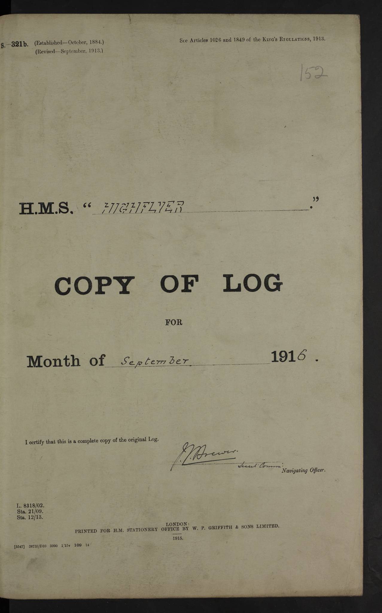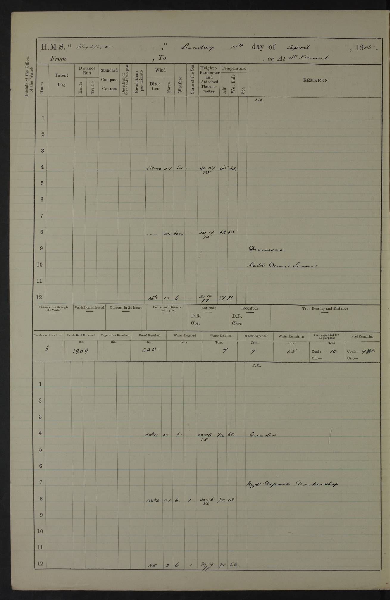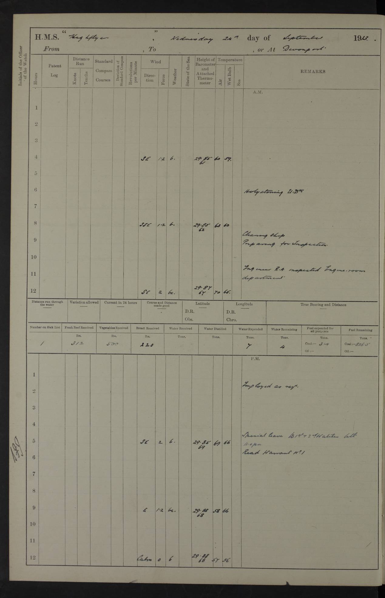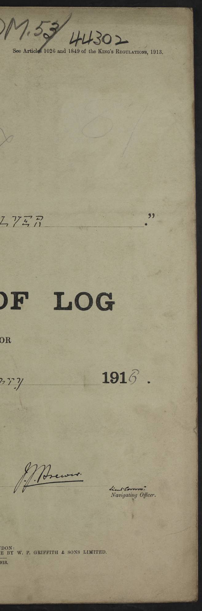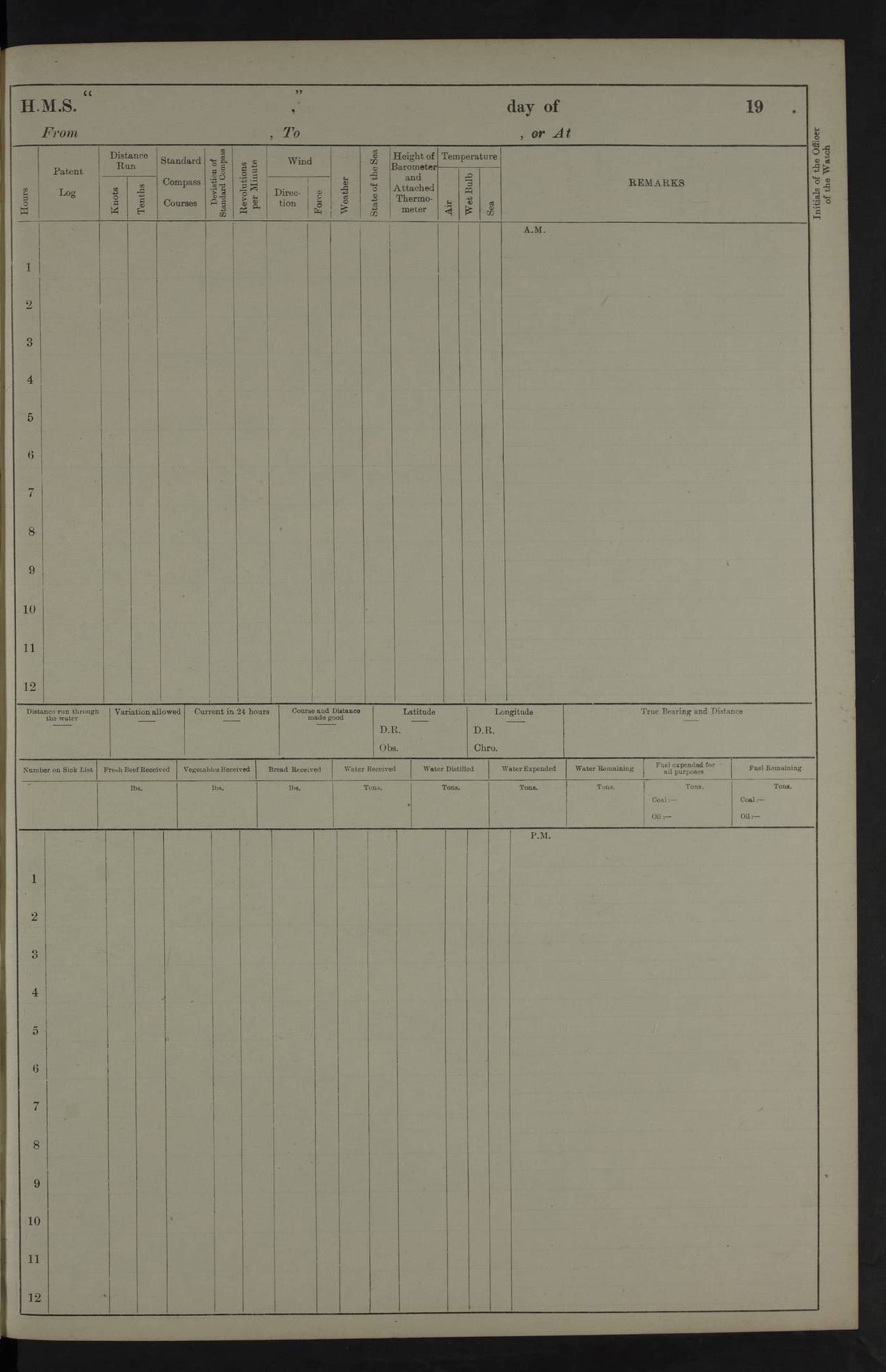 (Maps prepared using Journey Plotter, developed by Maikel. The Plots can only be approximate. They are made by joining-up positions on successive days, and sometimes positions are not given. There will therefore be occasions when the ship appears to have travelled overland) LOG BOOK – JUNE 14TH 1913 TO MAY 31ST 1914 4f960fe4a2fc8e2def00041b: (http://s3.amazonaws.com/oldweather/ADM53-44291/ADM 53-44291-001_0.jpg) 4f960fe5a2fc8e2def00041c: (http://s3.amazonaws.com/oldweather/ADM53-44291/ADM 53-44291-001_1.jpg) 4f960fe5a2fc8e2def00041d: (http://s3.amazonaws.com/oldweather/ADM53-44291/ADM 53-44291-002_0.jpg) 4f960fe5a2fc8e2def00041e: (http://s3.amazonaws.com/oldweather/ADM53-44291/ADM 53-44291-002_1.jpg) LOG of HMS Highflyer Commanded by Captain HT Buller MVO FOR THE PERIOD Commencing Saturday 14th June 1913 Ending Sunday 31st May 1914 Tonnage (displacement): 5600 Extreme length: 350 ft Extreme breadth: 54 ft ENGINES Manufacturer: Fairfield Shipbuilding & Engineering Co, Glasgow IHP: 10.000 Description: Vertical triple expansion 4 cylinders When fixed on board: 1898 BOILERS Manufacturer: Fairfield Shipbuilding & Engineering Co Description: Belleville with economisers 18 in No When made: 1898 When put in vessel: 1898 SCREW PROPELLER Manufacturer: Fairfield Shipbuilding & Engineering Co Description: Twin 3 bladed Admiralty design (bronze) General state of repair: Good 4f960fe6a2fc8e2def00041f: (http://s3.amazonaws.com/oldweather/ADM53-44291/ADM 53-44291-003_0.jpg) [Directions for using the log, figures to indicate the force of the wind and the state of the sea, and letters to denote the state of the weather.] 4f960fe6a2fc8e2def000420: (http://s3.amazonaws.com/oldweather/ADM53-44291/ADM 53-44291-003_1.jpg) Establishment of ship’s company Officers 32 Seamen 164 Boys 24 Marines 50 Engine-room establishment 134 Other non-executive ratings 466 BAROMETER Mercurial or aneroid: Mercurial Name of maker & number: Adie A 577 Height of cistern above sea: 9 feet Thermometers for air temperature Position in ship: Fore bridge Whether in screen: Yes Maker & number: Negretti & Zambra MO/A 9607 dry; from June 14, 1913 to June 1, 1914 MO/A 9603 wet; from June 14, 1913 to June 1, 1914 Thermometer for sea temperature Maker & number: J Hicks A 434; from June 14, 1913 to June 1, 1914 Position of standard compass Fore upper bridge DEVIATION OF STANDARD COMPASS Date obtained: August 29th 1913 Position: Sheerness, No 28 buoy ARMAMENT Fxle: one 6” QF PII S waist: four 6” QF PII P waist: four 6” QF PII OD: two 6” QF PII Battle deck: two 12-pounder 12-cwt SII S waist: three 12-pounder 12-cwt SII P waist: three 12-pounder 12-cwt SII AS deck: 3-pounder QF (Hotchkiss) P waist: 12-pounder 8-cwt field gun Torpedo armament 2 18” tubes BOATS 2 pinnaces, 36 ft sailing 2 cutters 1 gig, 30 ft 1 whaler 1 steam cutter, 32 ft MISCELLANEOUS INFORMATION Draught of water with bunkers full, and complete with provisions, stores and water: forward 22 ft 0 in, aft 23 ft 2 in Load draught, 600 tons coal: forward 19 ft 6 in, aft 21 ft 6 in Number of tons necessary to increase draught 1 inch: 31.5 Number of tons of coal carried (43 cubic feet per ton): a) At load draught, 600 b) With bunkers full, 1132 c) In places other than bunkers, nil Quantity of water carried: a) For boilers, 207 tons b) For drinking 60 tons THE VOYAGES OF HMS HIGHFLYER 1913-1914