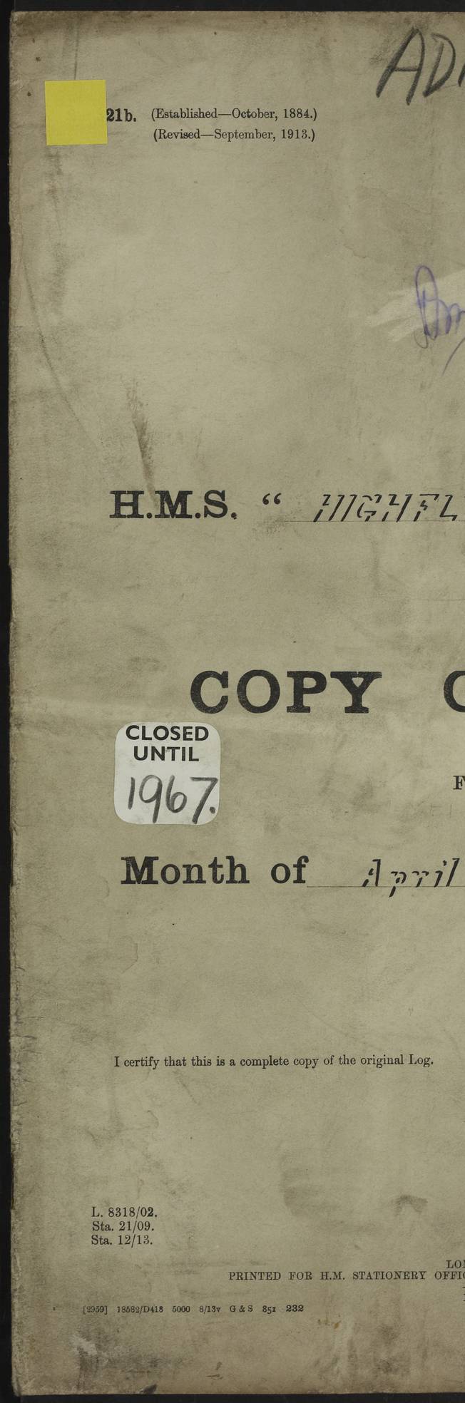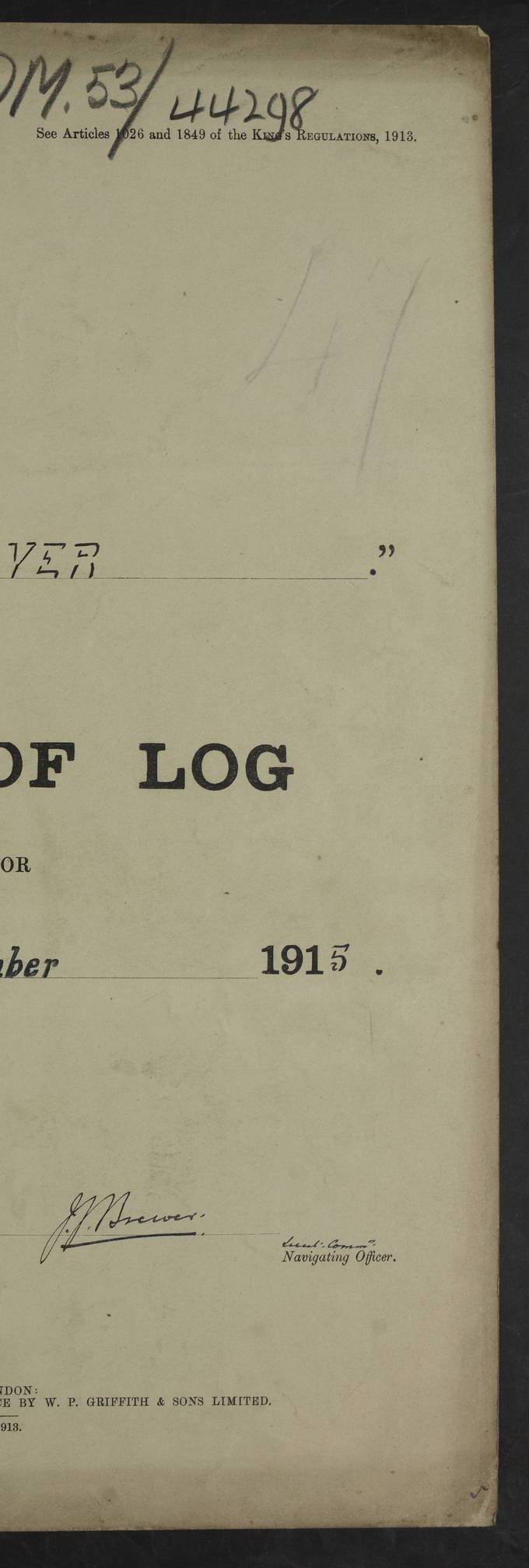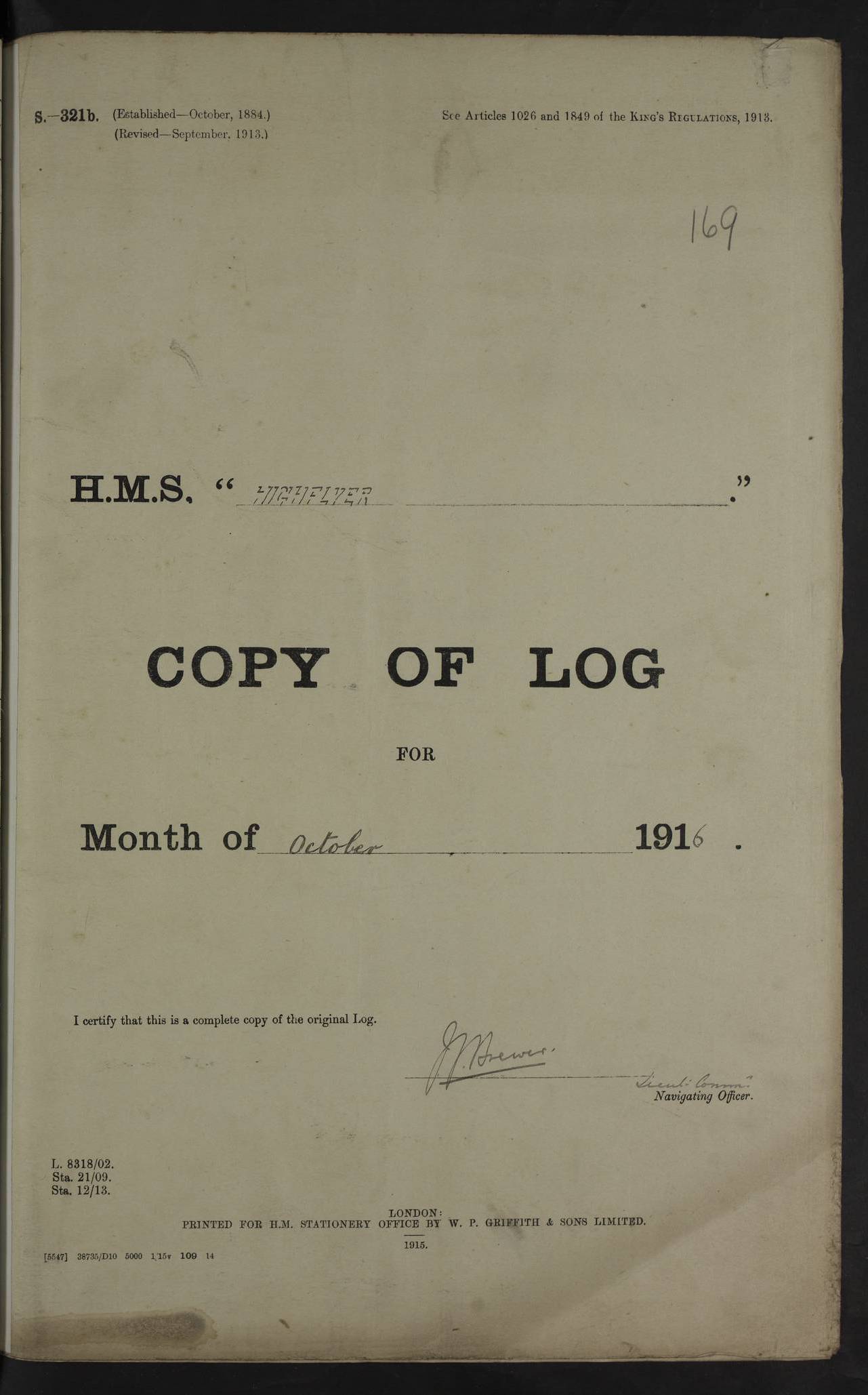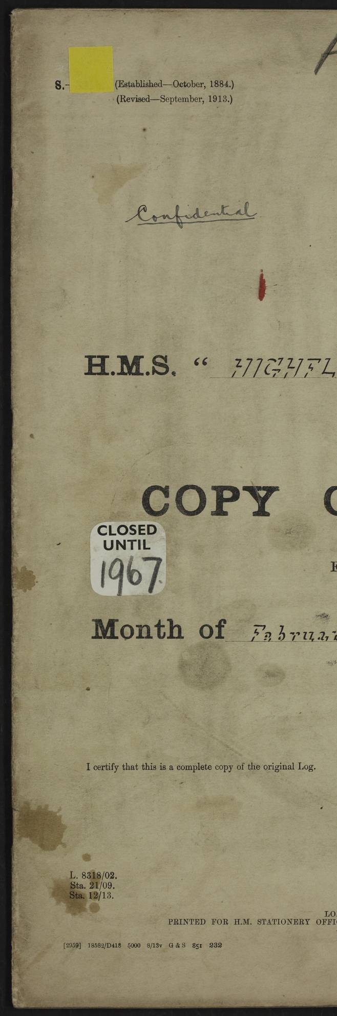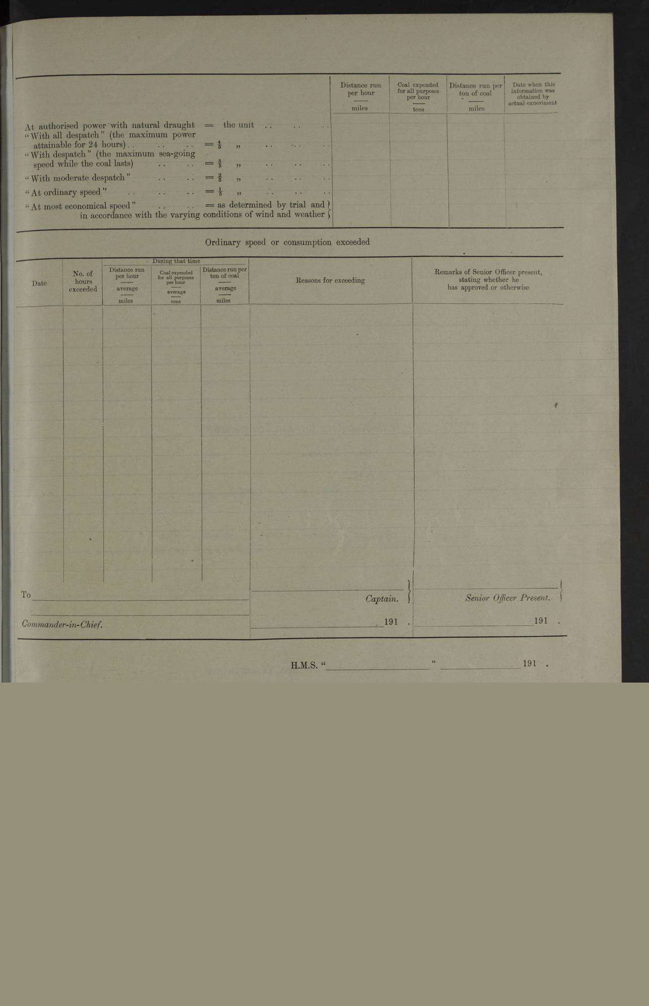 (Maps prepared using Journey Plotter, developed by Maikel. The Plots can only be approximate. They are made by joining-up positions on successive days, and sometimes positions are not given. There will therefore be occasions when the ship appears to have travelled overland) LOG BOOK – JUNE 14TH 1913 TO MAY 31ST 1914 4f960fe4a2fc8e2def00041b: (http://s3.amazonaws.com/oldweather/ADM53-44291/ADM 53-44291-001_0.jpg) 4f960fe5a2fc8e2def00041c: (http://s3.amazonaws.com/oldweather/ADM53-44291/ADM 53-44291-001_1.jpg) 4f960fe5a2fc8e2def00041d: (http://s3.amazonaws.com/oldweather/ADM53-44291/ADM 53-44291-002_0.jpg) 4f960fe5a2fc8e2def00041e: (http://s3.amazonaws.com/oldweather/ADM53-44291/ADM 53-44291-002_1.jpg) LOG of HMS Highflyer Commanded by Captain HT Buller MVO FOR THE PERIOD Commencing Saturday 14th June 1913 Ending Sunday 31st May 1914 Tonnage (displacement): 5600 Extreme length: 350 ft Extreme breadth: 54 ft ENGINES Manufacturer: Fairfield Shipbuilding & Engineering Co, Glasgow IHP: 10.000 Description: Vertical triple expansion 4 cylinders When fixed on board: 1898 BOILERS Manufacturer: Fairfield Shipbuilding & Engineering Co Description: Belleville with economisers 18 in No When made: 1898 When put in vessel: 1898 SCREW PROPELLER Manufacturer: Fairfield Shipbuilding & Engineering Co Description: Twin 3 bladed Admiralty design (bronze) General state of repair: Good 4f960fe6a2fc8e2def00041f: (http://s3.amazonaws.com/oldweather/ADM53-44291/ADM 53-44291-003_0.jpg) [Directions for using the log, figures to indicate the force of the wind and the state of the sea, and letters to denote the state of the weather.] 4f960fe6a2fc8e2def000420: (http://s3.amazonaws.com/oldweather/ADM53-44291/ADM 53-44291-003_1.jpg) Establishment of ship’s company Officers 32 Seamen 164 Boys 24 Marines 50 Engine-room establishment 134 Other non-executive ratings 466 BAROMETER Mercurial or aneroid: Mercurial Name of maker & number: Adie A 577 Height of cistern above sea: 9 feet Thermometers for air temperature Position in ship: Fore bridge Whether in screen: Yes Maker & number: Negretti & Zambra MO/A 9607 dry; from June 14, 1913 to June 1, 1914 MO/A 9603 wet; from June 14, 1913 to June 1, 1914 Thermometer for sea temperature Maker & number: J Hicks A 434; from June 14, 1913 to June 1, 1914 Position of standard compass Fore upper bridge DEVIATION OF STANDARD COMPASS Date obtained: August 29th 1913 Position: Sheerness, No 28 buoy ARMAMENT Fxle: one 6” QF PII S waist: four 6” QF PII P waist: four 6” QF PII OD: two 6” QF PII Battle deck: two 12-pounder 12-cwt SII S waist: three 12-pounder 12-cwt SII P waist: three 12-pounder 12-cwt SII AS deck: 3-pounder QF (Hotchkiss) P waist: 12-pounder 8-cwt field gun Torpedo armament 2 18” tubes BOATS 2 pinnaces, 36 ft sailing 2 cutters 1 gig, 30 ft 1 whaler 1 steam cutter, 32 ft MISCELLANEOUS INFORMATION Draught of water with bunkers full, and complete with provisions, stores and water: forward 22 ft 0 in, aft 23 ft 2 in Load draught, 600 tons coal: forward 19 ft 6 in, aft 21 ft 6 in Number of tons necessary to increase draught 1 inch: 31.5 Number of tons of coal carried (43 cubic feet per ton): a) At load draught, 600 b) With bunkers full, 1132 c) In places other than bunkers, nil Quantity of water carried: a) For boilers, 207 tons b) For drinking 60 tons THE VOYAGES OF HMS HIGHFLYER 1913-1914