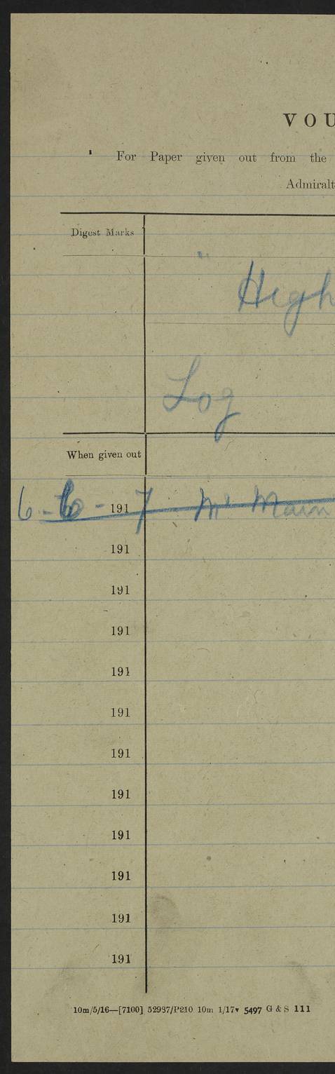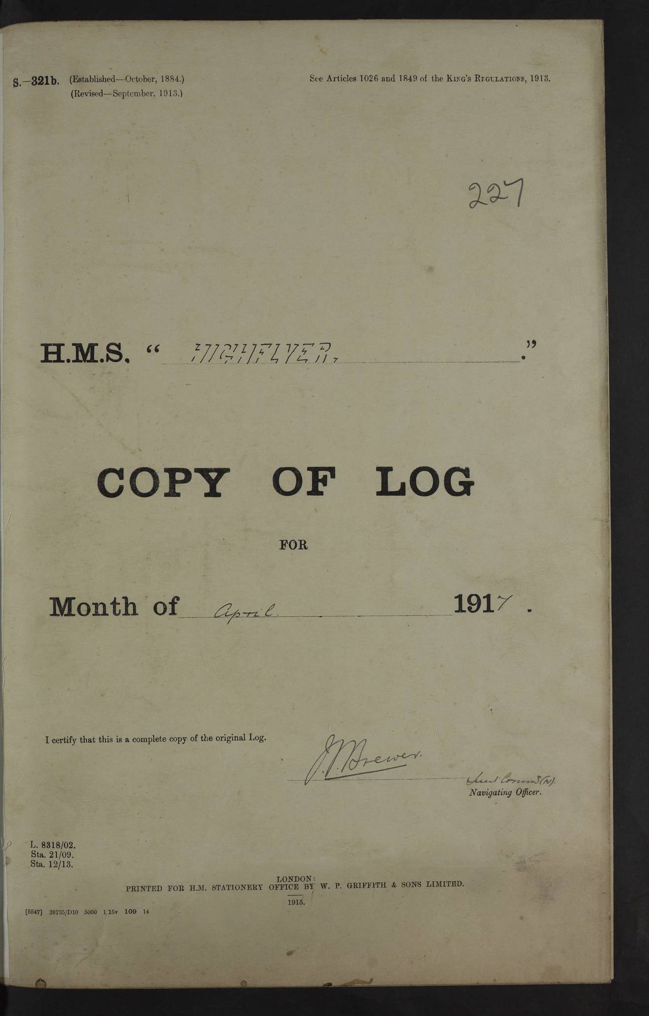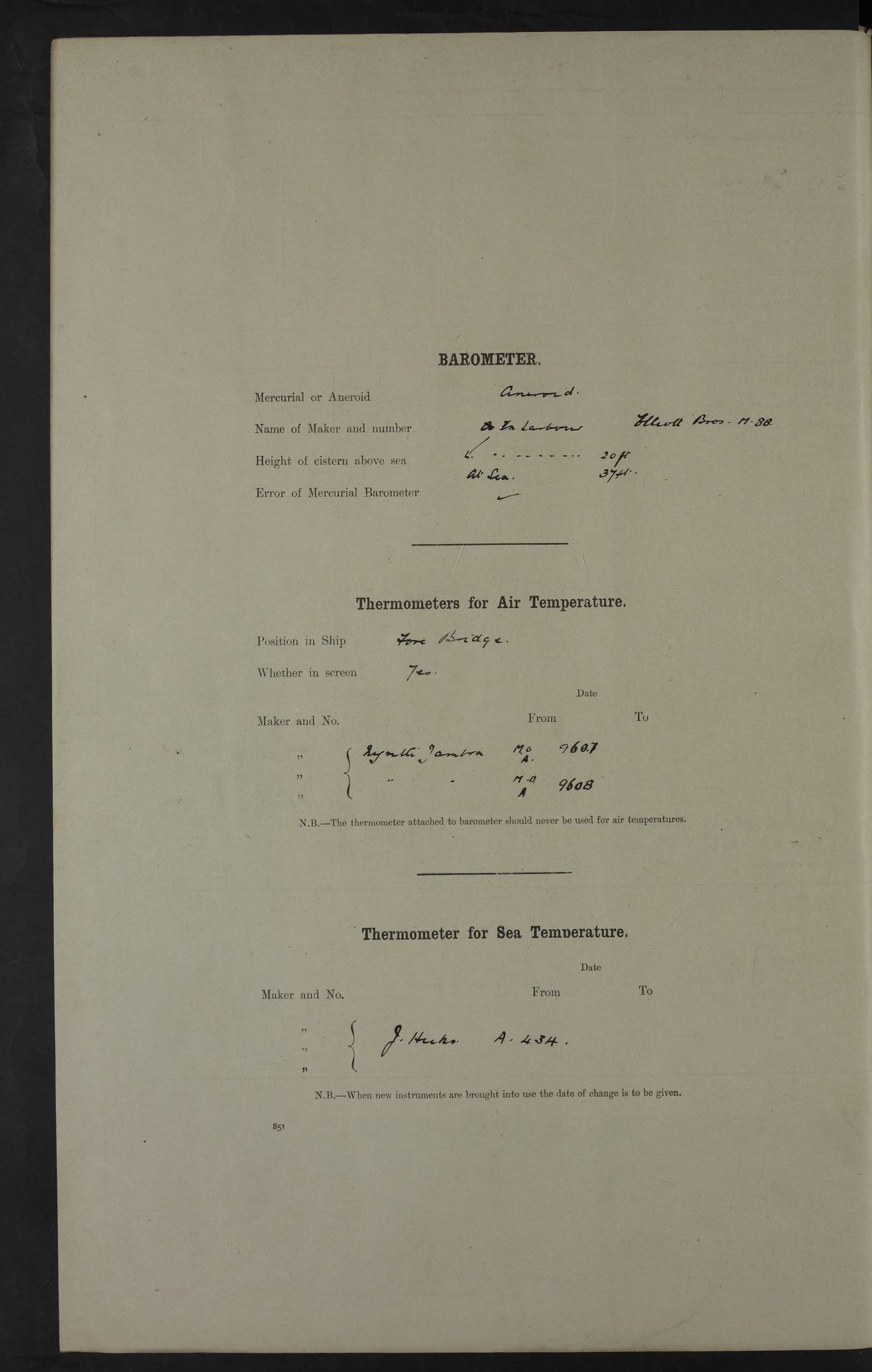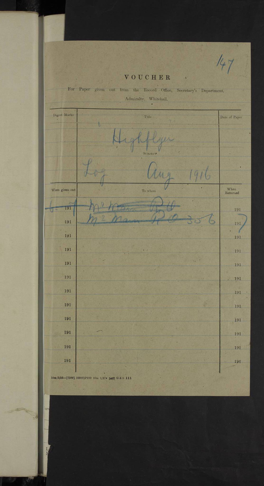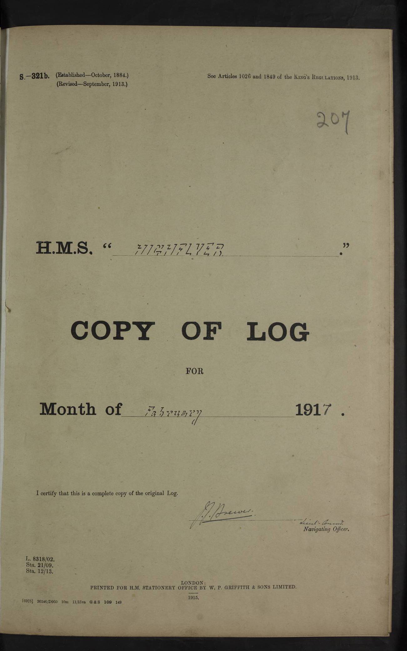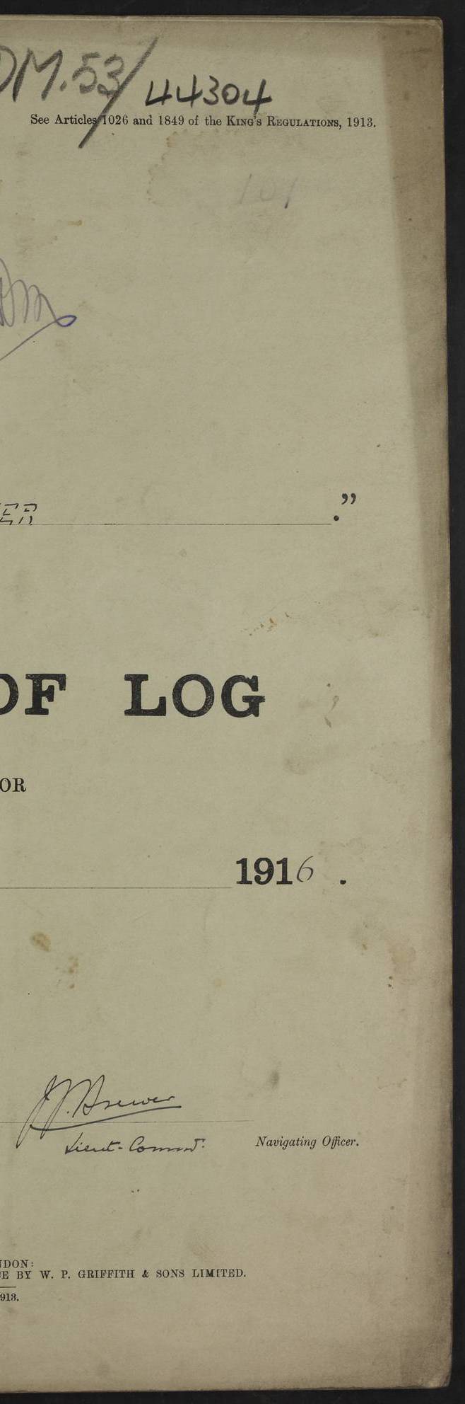 (Maps prepared using Journey Plotter, developed by Maikel. The Plots can only be approximate. They are made by joining-up positions on successive days, and sometimes positions are not given. There will therefore be occasions when the ship appears to have travelled overland) LOG BOOK – JUNE 14TH 1913 TO MAY 31ST 1914 4f960fe4a2fc8e2def00041b: (http://s3.amazonaws.com/oldweather/ADM53-44291/ADM 53-44291-001_0.jpg) 4f960fe5a2fc8e2def00041c: (http://s3.amazonaws.com/oldweather/ADM53-44291/ADM 53-44291-001_1.jpg) 4f960fe5a2fc8e2def00041d: (http://s3.amazonaws.com/oldweather/ADM53-44291/ADM 53-44291-002_0.jpg) 4f960fe5a2fc8e2def00041e: (http://s3.amazonaws.com/oldweather/ADM53-44291/ADM 53-44291-002_1.jpg) LOG of HMS Highflyer Commanded by Captain HT Buller MVO FOR THE PERIOD Commencing Saturday 14th June 1913 Ending Sunday 31st May 1914 Tonnage (displacement): 5600 Extreme length: 350 ft Extreme breadth: 54 ft ENGINES Manufacturer: Fairfield Shipbuilding & Engineering Co, Glasgow IHP: 10.000 Description: Vertical triple expansion 4 cylinders When fixed on board: 1898 BOILERS Manufacturer: Fairfield Shipbuilding & Engineering Co Description: Belleville with economisers 18 in No When made: 1898 When put in vessel: 1898 SCREW PROPELLER Manufacturer: Fairfield Shipbuilding & Engineering Co Description: Twin 3 bladed Admiralty design (bronze) General state of repair: Good 4f960fe6a2fc8e2def00041f: (http://s3.amazonaws.com/oldweather/ADM53-44291/ADM 53-44291-003_0.jpg) [Directions for using the log, figures to indicate the force of the wind and the state of the sea, and letters to denote the state of the weather.] 4f960fe6a2fc8e2def000420: (http://s3.amazonaws.com/oldweather/ADM53-44291/ADM 53-44291-003_1.jpg) Establishment of ship’s company Officers 32 Seamen 164 Boys 24 Marines 50 Engine-room establishment 134 Other non-executive ratings 466 BAROMETER Mercurial or aneroid: Mercurial Name of maker & number: Adie A 577 Height of cistern above sea: 9 feet Thermometers for air temperature Position in ship: Fore bridge Whether in screen: Yes Maker & number: Negretti & Zambra MO/A 9607 dry; from June 14, 1913 to June 1, 1914 MO/A 9603 wet; from June 14, 1913 to June 1, 1914 Thermometer for sea temperature Maker & number: J Hicks A 434; from June 14, 1913 to June 1, 1914 Position of standard compass Fore upper bridge DEVIATION OF STANDARD COMPASS Date obtained: August 29th 1913 Position: Sheerness, No 28 buoy ARMAMENT Fxle: one 6” QF PII S waist: four 6” QF PII P waist: four 6” QF PII OD: two 6” QF PII Battle deck: two 12-pounder 12-cwt SII S waist: three 12-pounder 12-cwt SII P waist: three 12-pounder 12-cwt SII AS deck: 3-pounder QF (Hotchkiss) P waist: 12-pounder 8-cwt field gun Torpedo armament 2 18” tubes BOATS 2 pinnaces, 36 ft sailing 2 cutters 1 gig, 30 ft 1 whaler 1 steam cutter, 32 ft MISCELLANEOUS INFORMATION Draught of water with bunkers full, and complete with provisions, stores and water: forward 22 ft 0 in, aft 23 ft 2 in Load draught, 600 tons coal: forward 19 ft 6 in, aft 21 ft 6 in Number of tons necessary to increase draught 1 inch: 31.5 Number of tons of coal carried (43 cubic feet per ton): a) At load draught, 600 b) With bunkers full, 1132 c) In places other than bunkers, nil Quantity of water carried: a) For boilers, 207 tons b) For drinking 60 tons THE VOYAGES OF HMS HIGHFLYER 1913-1914