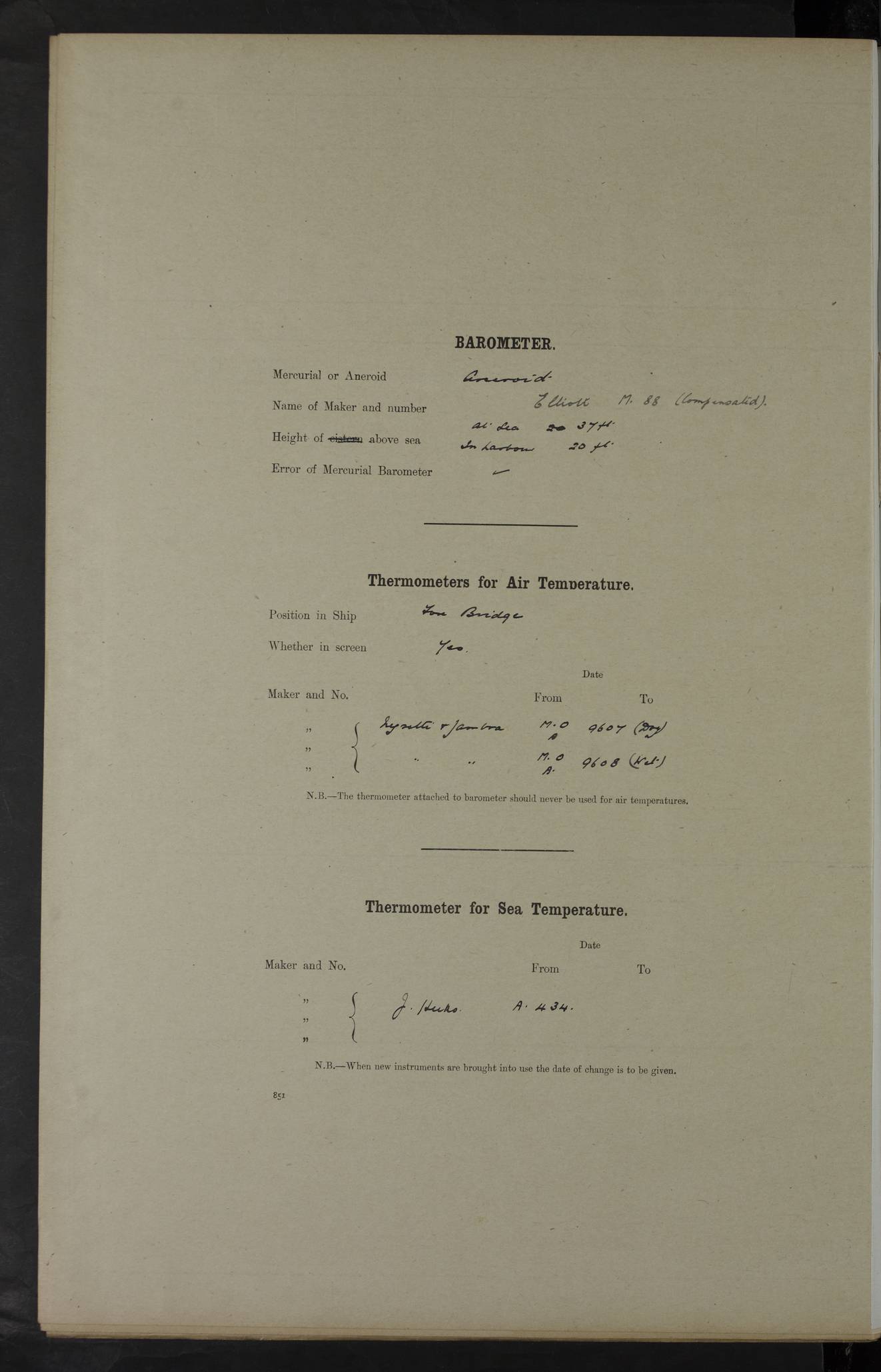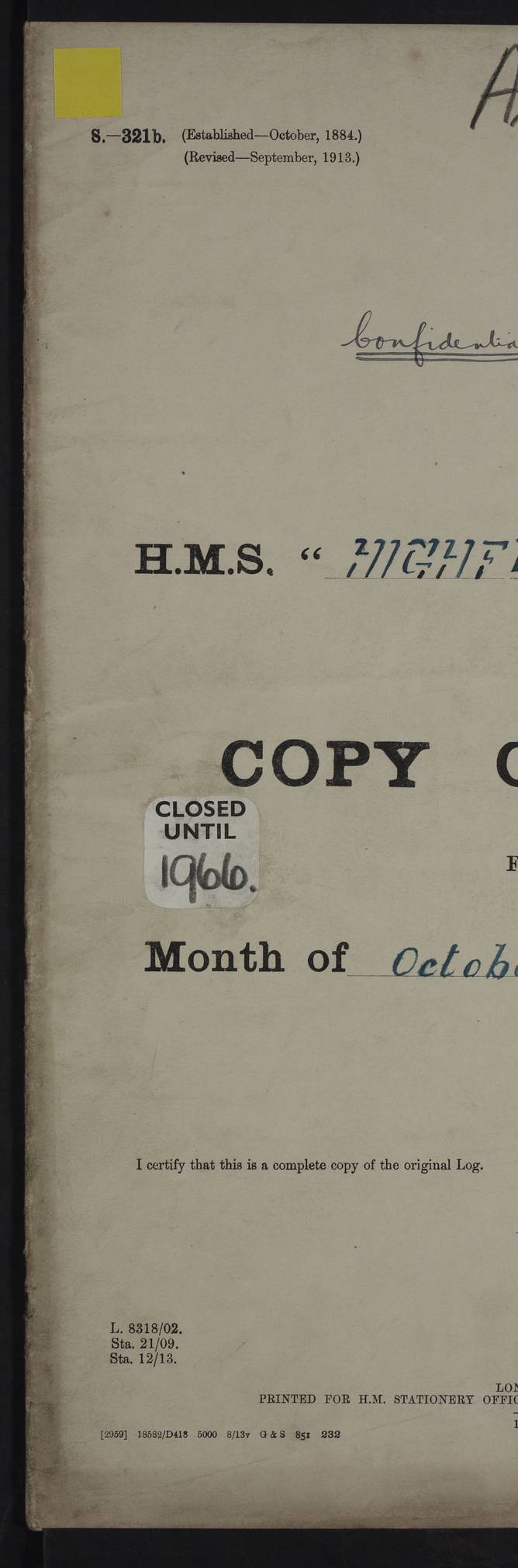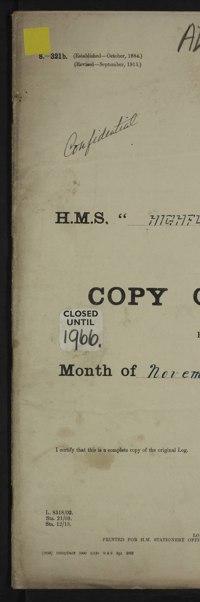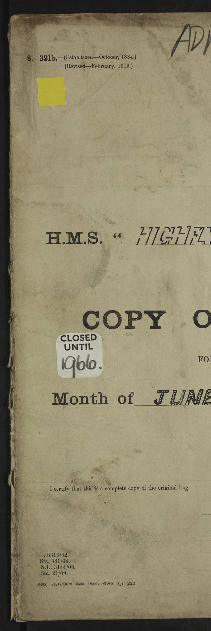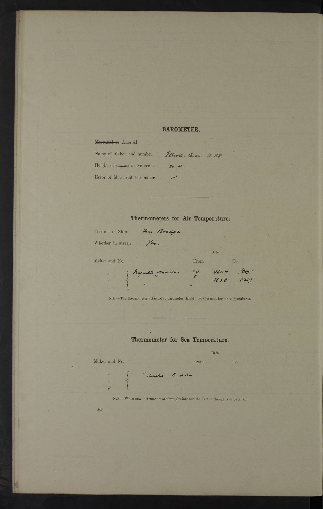 (Maps prepared using Journey Plotter, developed by Maikel. The Plots can only be approximate. They are made by joining-up positions on successive days, and sometimes positions are not given. There will therefore be occasions when the ship appears to have travelled overland) LOG BOOK – JUNE 14TH 1913 TO MAY 31ST 1914 4f960fe4a2fc8e2def00041b: (http://s3.amazonaws.com/oldweather/ADM53-44291/ADM 53-44291-001_0.jpg) 4f960fe5a2fc8e2def00041c: (http://s3.amazonaws.com/oldweather/ADM53-44291/ADM 53-44291-001_1.jpg) 4f960fe5a2fc8e2def00041d: (http://s3.amazonaws.com/oldweather/ADM53-44291/ADM 53-44291-002_0.jpg) 4f960fe5a2fc8e2def00041e: (http://s3.amazonaws.com/oldweather/ADM53-44291/ADM 53-44291-002_1.jpg) LOG of HMS Highflyer Commanded by Captain HT Buller MVO FOR THE PERIOD Commencing Saturday 14th June 1913 Ending Sunday 31st May 1914 Tonnage (displacement): 5600 Extreme length: 350 ft Extreme breadth: 54 ft ENGINES Manufacturer: Fairfield Shipbuilding & Engineering Co, Glasgow IHP: 10.000 Description: Vertical triple expansion 4 cylinders When fixed on board: 1898 BOILERS Manufacturer: Fairfield Shipbuilding & Engineering Co Description: Belleville with economisers 18 in No When made: 1898 When put in vessel: 1898 SCREW PROPELLER Manufacturer: Fairfield Shipbuilding & Engineering Co Description: Twin 3 bladed Admiralty design (bronze) General state of repair: Good 4f960fe6a2fc8e2def00041f: (http://s3.amazonaws.com/oldweather/ADM53-44291/ADM 53-44291-003_0.jpg) [Directions for using the log, figures to indicate the force of the wind and the state of the sea, and letters to denote the state of the weather.] 4f960fe6a2fc8e2def000420: (http://s3.amazonaws.com/oldweather/ADM53-44291/ADM 53-44291-003_1.jpg) Establishment of ship’s company Officers 32 Seamen 164 Boys 24 Marines 50 Engine-room establishment 134 Other non-executive ratings 466 BAROMETER Mercurial or aneroid: Mercurial Name of maker & number: Adie A 577 Height of cistern above sea: 9 feet Thermometers for air temperature Position in ship: Fore bridge Whether in screen: Yes Maker & number: Negretti & Zambra MO/A 9607 dry; from June 14, 1913 to June 1, 1914 MO/A 9603 wet; from June 14, 1913 to June 1, 1914 Thermometer for sea temperature Maker & number: J Hicks A 434; from June 14, 1913 to June 1, 1914 Position of standard compass Fore upper bridge DEVIATION OF STANDARD COMPASS Date obtained: August 29th 1913 Position: Sheerness, No 28 buoy ARMAMENT Fxle: one 6” QF PII S waist: four 6” QF PII P waist: four 6” QF PII OD: two 6” QF PII Battle deck: two 12-pounder 12-cwt SII S waist: three 12-pounder 12-cwt SII P waist: three 12-pounder 12-cwt SII AS deck: 3-pounder QF (Hotchkiss) P waist: 12-pounder 8-cwt field gun Torpedo armament 2 18” tubes BOATS 2 pinnaces, 36 ft sailing 2 cutters 1 gig, 30 ft 1 whaler 1 steam cutter, 32 ft MISCELLANEOUS INFORMATION Draught of water with bunkers full, and complete with provisions, stores and water: forward 22 ft 0 in, aft 23 ft 2 in Load draught, 600 tons coal: forward 19 ft 6 in, aft 21 ft 6 in Number of tons necessary to increase draught 1 inch: 31.5 Number of tons of coal carried (43 cubic feet per ton): a) At load draught, 600 b) With bunkers full, 1132 c) In places other than bunkers, nil Quantity of water carried: a) For boilers, 207 tons b) For drinking 60 tons THE VOYAGES OF HMS HIGHFLYER 1913-1914