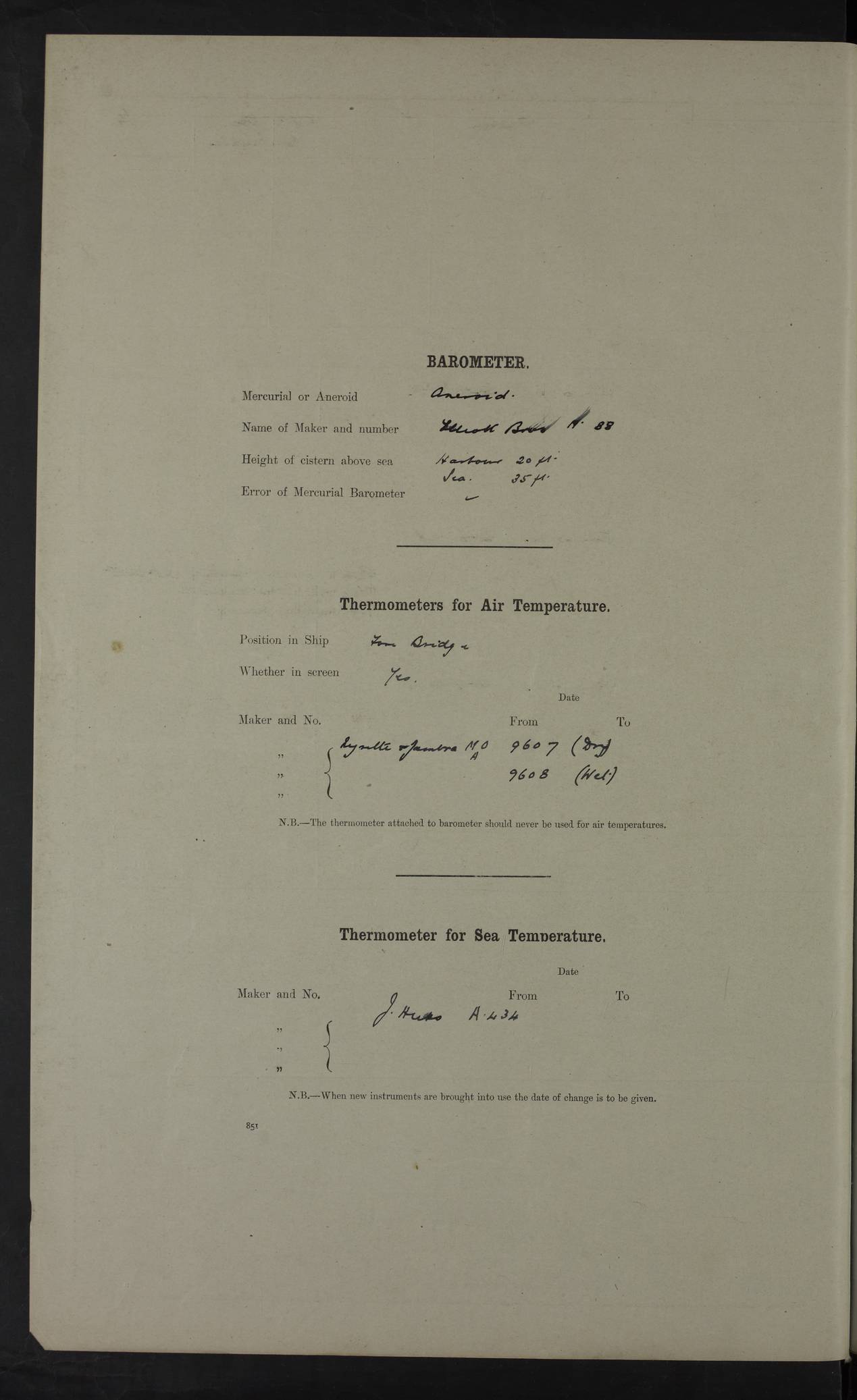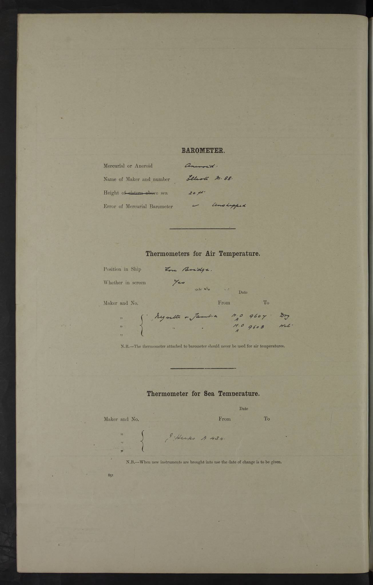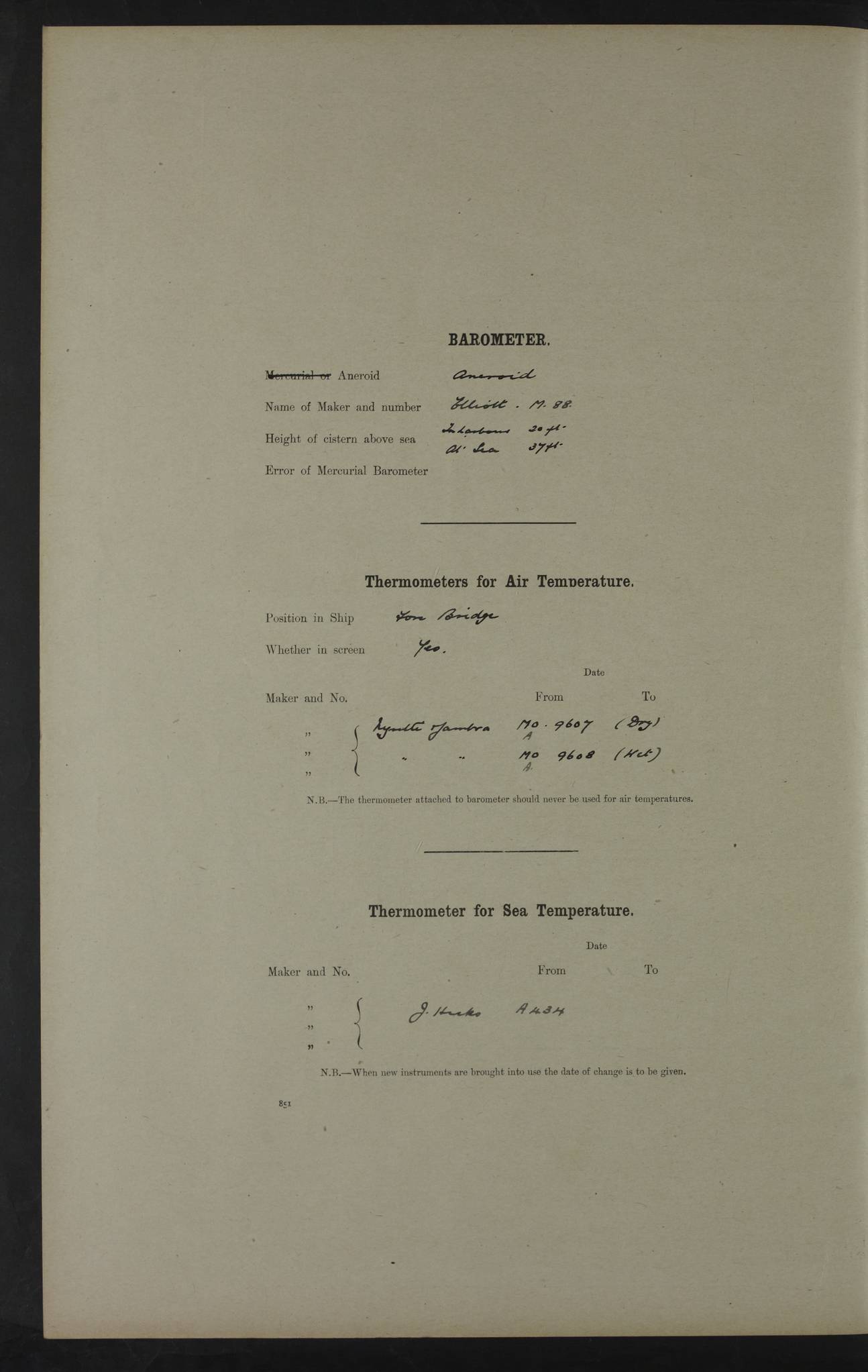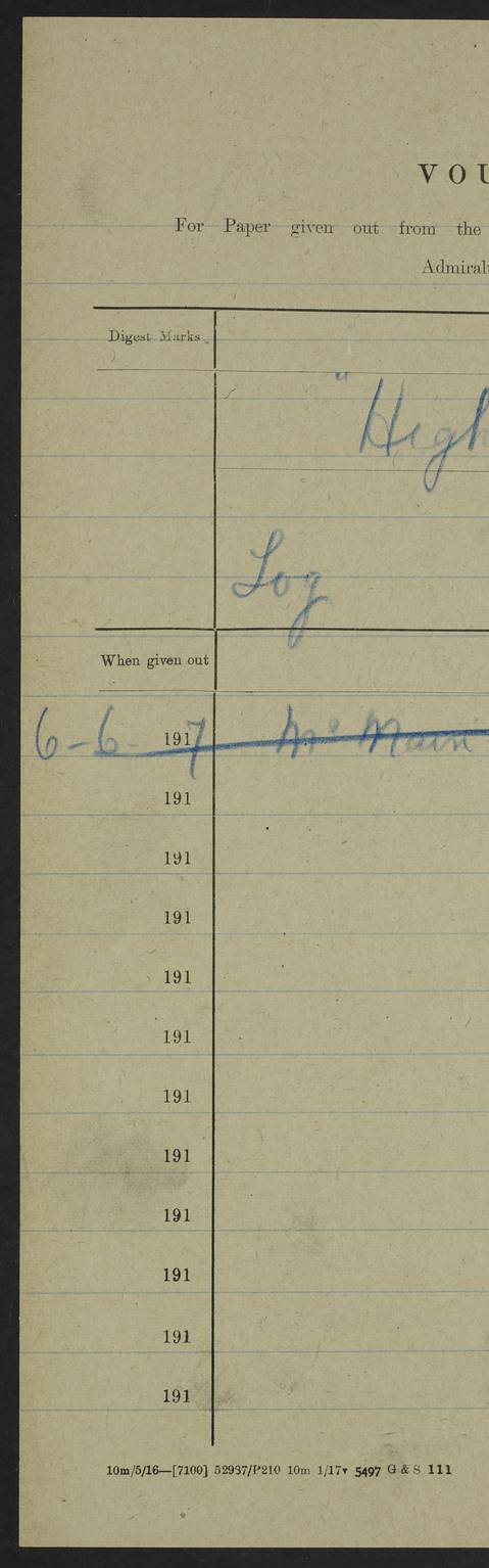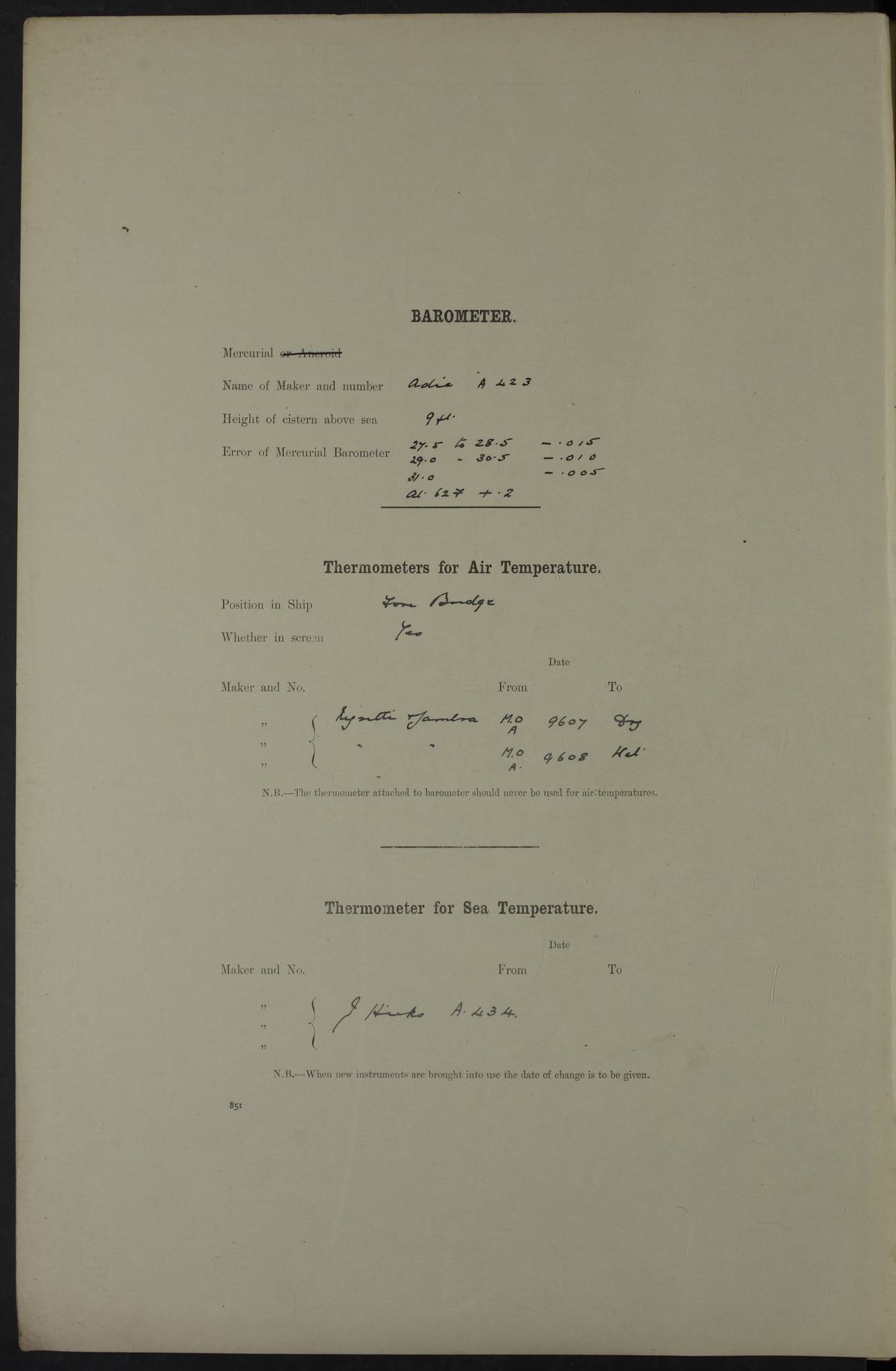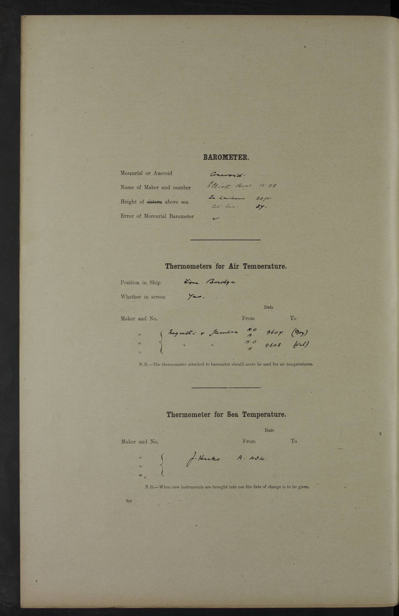 (Maps prepared using Journey Plotter, developed by Maikel. The Plots can only be approximate. They are made by joining-up positions on successive days, and sometimes positions are not given. There will therefore be occasions when the ship appears to have travelled overland) LOG BOOK – JUNE 14TH 1913 TO MAY 31ST 1914 4f960fe4a2fc8e2def00041b: (http://s3.amazonaws.com/oldweather/ADM53-44291/ADM 53-44291-001_0.jpg) 4f960fe5a2fc8e2def00041c: (http://s3.amazonaws.com/oldweather/ADM53-44291/ADM 53-44291-001_1.jpg) 4f960fe5a2fc8e2def00041d: (http://s3.amazonaws.com/oldweather/ADM53-44291/ADM 53-44291-002_0.jpg) 4f960fe5a2fc8e2def00041e: (http://s3.amazonaws.com/oldweather/ADM53-44291/ADM 53-44291-002_1.jpg) LOG of HMS Highflyer Commanded by Captain HT Buller MVO FOR THE PERIOD Commencing Saturday 14th June 1913 Ending Sunday 31st May 1914 Tonnage (displacement): 5600 Extreme length: 350 ft Extreme breadth: 54 ft ENGINES Manufacturer: Fairfield Shipbuilding & Engineering Co, Glasgow IHP: 10.000 Description: Vertical triple expansion 4 cylinders When fixed on board: 1898 BOILERS Manufacturer: Fairfield Shipbuilding & Engineering Co Description: Belleville with economisers 18 in No When made: 1898 When put in vessel: 1898 SCREW PROPELLER Manufacturer: Fairfield Shipbuilding & Engineering Co Description: Twin 3 bladed Admiralty design (bronze) General state of repair: Good 4f960fe6a2fc8e2def00041f: (http://s3.amazonaws.com/oldweather/ADM53-44291/ADM 53-44291-003_0.jpg) [Directions for using the log, figures to indicate the force of the wind and the state of the sea, and letters to denote the state of the weather.] 4f960fe6a2fc8e2def000420: (http://s3.amazonaws.com/oldweather/ADM53-44291/ADM 53-44291-003_1.jpg) Establishment of ship’s company Officers 32 Seamen 164 Boys 24 Marines 50 Engine-room establishment 134 Other non-executive ratings 466 BAROMETER Mercurial or aneroid: Mercurial Name of maker & number: Adie A 577 Height of cistern above sea: 9 feet Thermometers for air temperature Position in ship: Fore bridge Whether in screen: Yes Maker & number: Negretti & Zambra MO/A 9607 dry; from June 14, 1913 to June 1, 1914 MO/A 9603 wet; from June 14, 1913 to June 1, 1914 Thermometer for sea temperature Maker & number: J Hicks A 434; from June 14, 1913 to June 1, 1914 Position of standard compass Fore upper bridge DEVIATION OF STANDARD COMPASS Date obtained: August 29th 1913 Position: Sheerness, No 28 buoy ARMAMENT Fxle: one 6” QF PII S waist: four 6” QF PII P waist: four 6” QF PII OD: two 6” QF PII Battle deck: two 12-pounder 12-cwt SII S waist: three 12-pounder 12-cwt SII P waist: three 12-pounder 12-cwt SII AS deck: 3-pounder QF (Hotchkiss) P waist: 12-pounder 8-cwt field gun Torpedo armament 2 18” tubes BOATS 2 pinnaces, 36 ft sailing 2 cutters 1 gig, 30 ft 1 whaler 1 steam cutter, 32 ft MISCELLANEOUS INFORMATION Draught of water with bunkers full, and complete with provisions, stores and water: forward 22 ft 0 in, aft 23 ft 2 in Load draught, 600 tons coal: forward 19 ft 6 in, aft 21 ft 6 in Number of tons necessary to increase draught 1 inch: 31.5 Number of tons of coal carried (43 cubic feet per ton): a) At load draught, 600 b) With bunkers full, 1132 c) In places other than bunkers, nil Quantity of water carried: a) For boilers, 207 tons b) For drinking 60 tons THE VOYAGES OF HMS HIGHFLYER 1913-1914