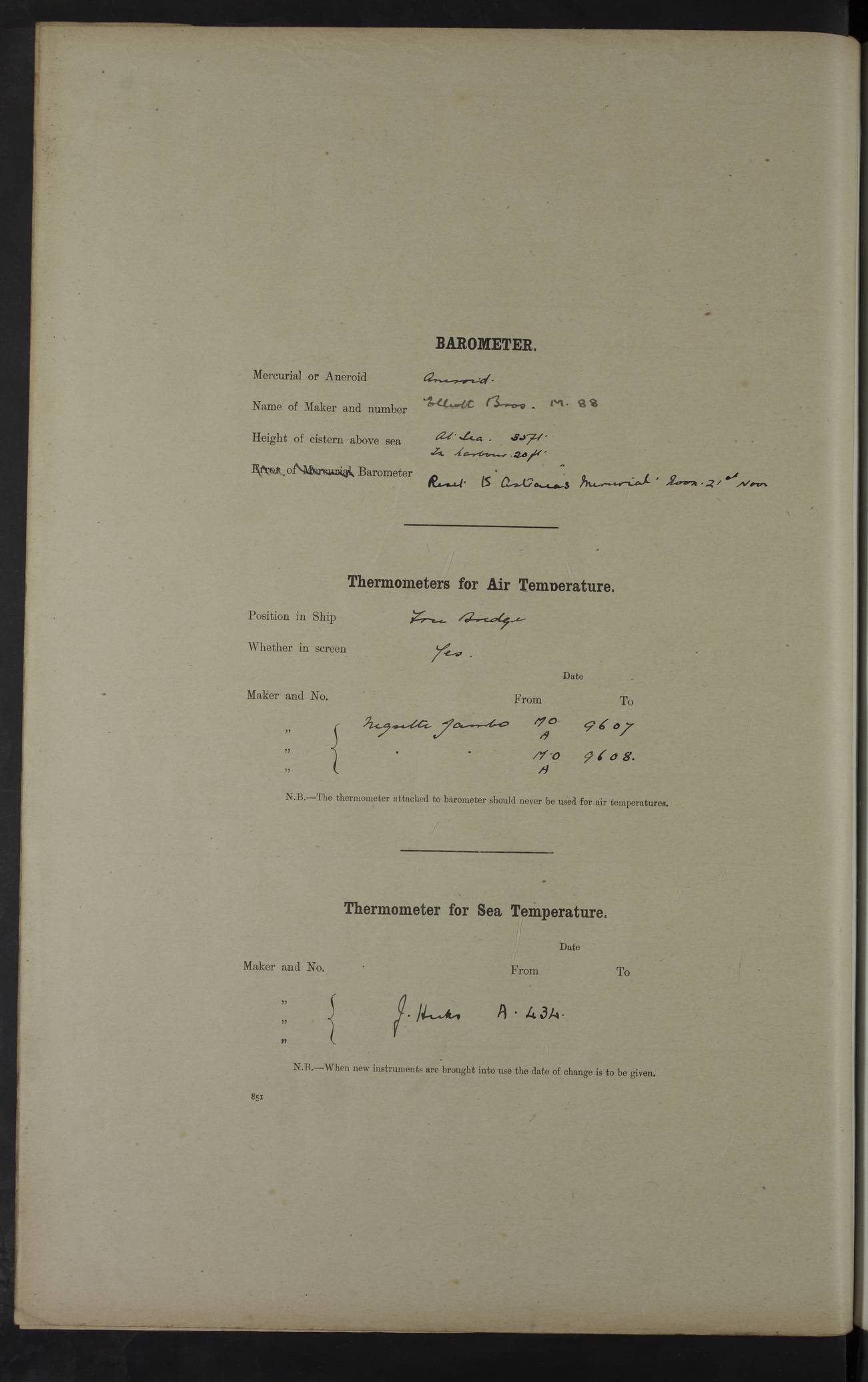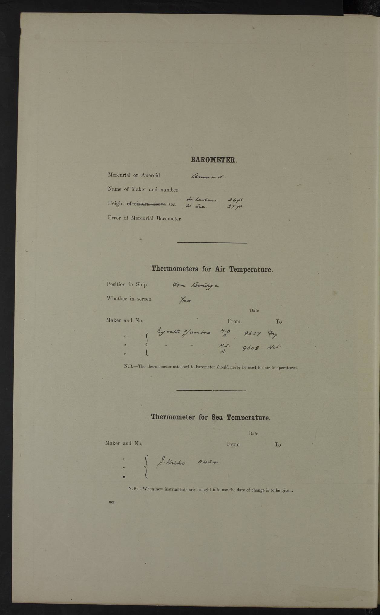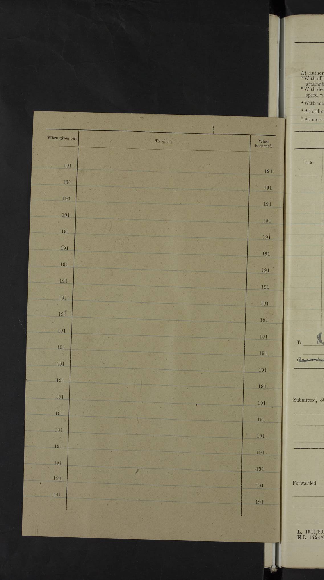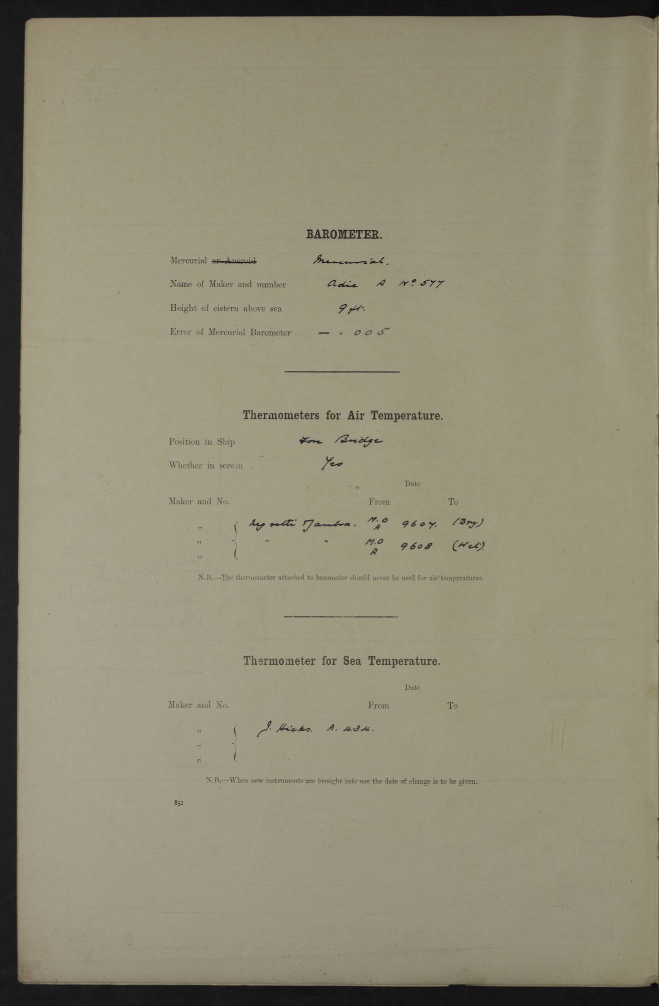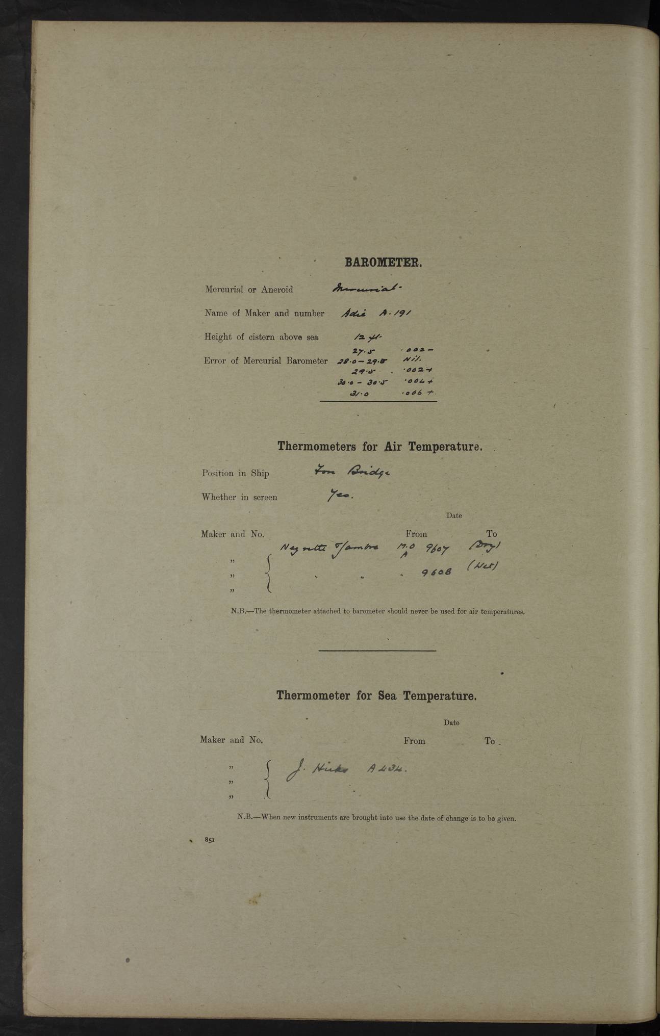 (Maps prepared using Journey Plotter, developed by Maikel. The Plots can only be approximate. They are made by joining-up positions on successive days, and sometimes positions are not given. There will therefore be occasions when the ship appears to have travelled overland) LOG BOOK – JUNE 14TH 1913 TO MAY 31ST 1914 4f960fe4a2fc8e2def00041b: (http://s3.amazonaws.com/oldweather/ADM53-44291/ADM 53-44291-001_0.jpg) 4f960fe5a2fc8e2def00041c: (http://s3.amazonaws.com/oldweather/ADM53-44291/ADM 53-44291-001_1.jpg) 4f960fe5a2fc8e2def00041d: (http://s3.amazonaws.com/oldweather/ADM53-44291/ADM 53-44291-002_0.jpg) 4f960fe5a2fc8e2def00041e: (http://s3.amazonaws.com/oldweather/ADM53-44291/ADM 53-44291-002_1.jpg) LOG of HMS Highflyer Commanded by Captain HT Buller MVO FOR THE PERIOD Commencing Saturday 14th June 1913 Ending Sunday 31st May 1914 Tonnage (displacement): 5600 Extreme length: 350 ft Extreme breadth: 54 ft ENGINES Manufacturer: Fairfield Shipbuilding & Engineering Co, Glasgow IHP: 10.000 Description: Vertical triple expansion 4 cylinders When fixed on board: 1898 BOILERS Manufacturer: Fairfield Shipbuilding & Engineering Co Description: Belleville with economisers 18 in No When made: 1898 When put in vessel: 1898 SCREW PROPELLER Manufacturer: Fairfield Shipbuilding & Engineering Co Description: Twin 3 bladed Admiralty design (bronze) General state of repair: Good 4f960fe6a2fc8e2def00041f: (http://s3.amazonaws.com/oldweather/ADM53-44291/ADM 53-44291-003_0.jpg) [Directions for using the log, figures to indicate the force of the wind and the state of the sea, and letters to denote the state of the weather.] 4f960fe6a2fc8e2def000420: (http://s3.amazonaws.com/oldweather/ADM53-44291/ADM 53-44291-003_1.jpg) Establishment of ship’s company Officers 32 Seamen 164 Boys 24 Marines 50 Engine-room establishment 134 Other non-executive ratings 466 BAROMETER Mercurial or aneroid: Mercurial Name of maker & number: Adie A 577 Height of cistern above sea: 9 feet Thermometers for air temperature Position in ship: Fore bridge Whether in screen: Yes Maker & number: Negretti & Zambra MO/A 9607 dry; from June 14, 1913 to June 1, 1914 MO/A 9603 wet; from June 14, 1913 to June 1, 1914 Thermometer for sea temperature Maker & number: J Hicks A 434; from June 14, 1913 to June 1, 1914 Position of standard compass Fore upper bridge DEVIATION OF STANDARD COMPASS Date obtained: August 29th 1913 Position: Sheerness, No 28 buoy ARMAMENT Fxle: one 6” QF PII S waist: four 6” QF PII P waist: four 6” QF PII OD: two 6” QF PII Battle deck: two 12-pounder 12-cwt SII S waist: three 12-pounder 12-cwt SII P waist: three 12-pounder 12-cwt SII AS deck: 3-pounder QF (Hotchkiss) P waist: 12-pounder 8-cwt field gun Torpedo armament 2 18” tubes BOATS 2 pinnaces, 36 ft sailing 2 cutters 1 gig, 30 ft 1 whaler 1 steam cutter, 32 ft MISCELLANEOUS INFORMATION Draught of water with bunkers full, and complete with provisions, stores and water: forward 22 ft 0 in, aft 23 ft 2 in Load draught, 600 tons coal: forward 19 ft 6 in, aft 21 ft 6 in Number of tons necessary to increase draught 1 inch: 31.5 Number of tons of coal carried (43 cubic feet per ton): a) At load draught, 600 b) With bunkers full, 1132 c) In places other than bunkers, nil Quantity of water carried: a) For boilers, 207 tons b) For drinking 60 tons THE VOYAGES OF HMS HIGHFLYER 1913-1914