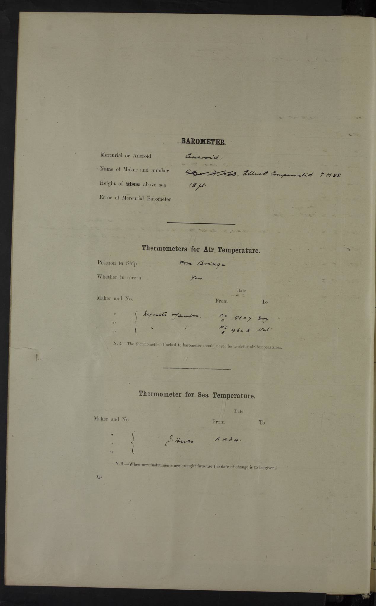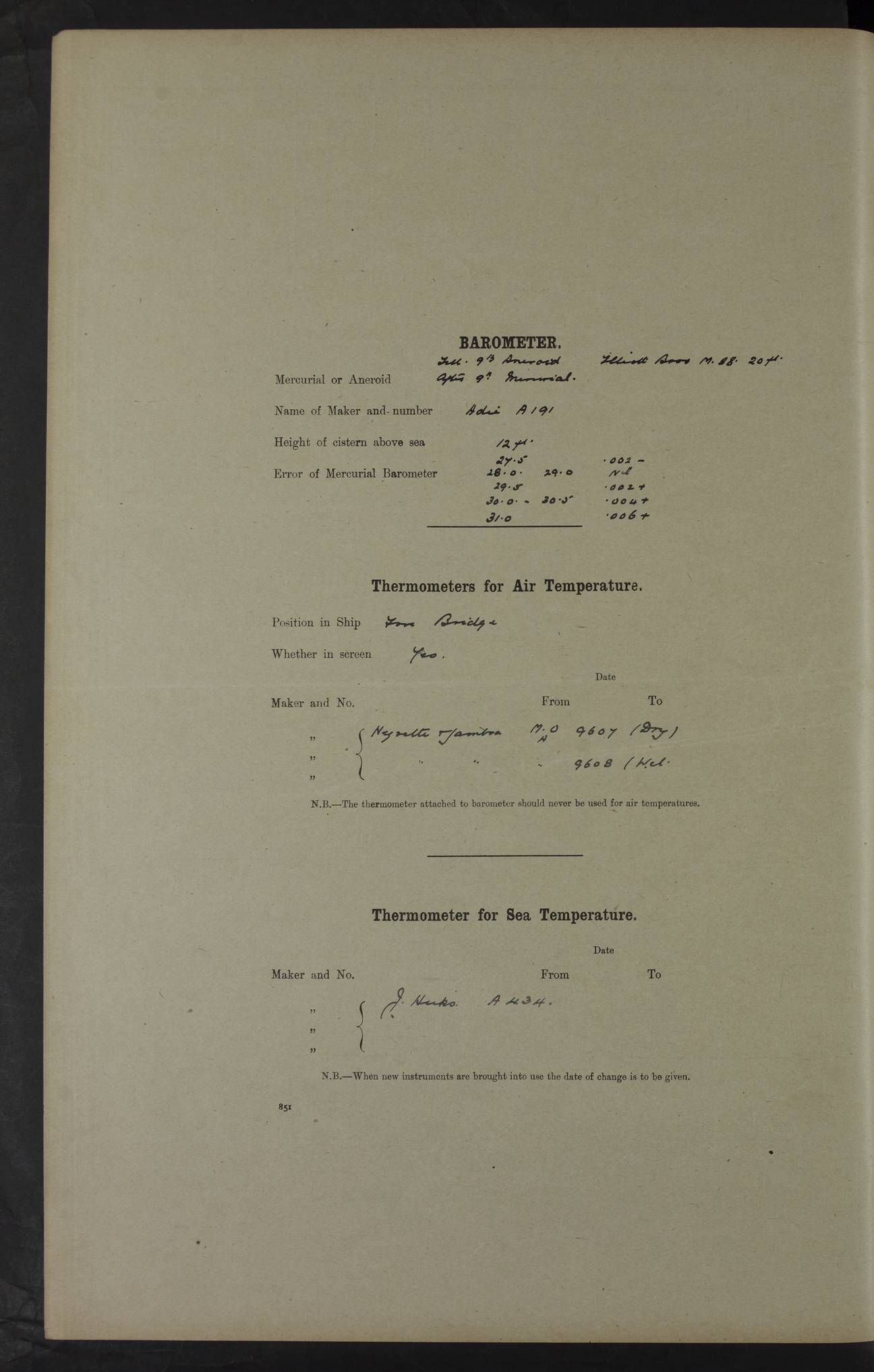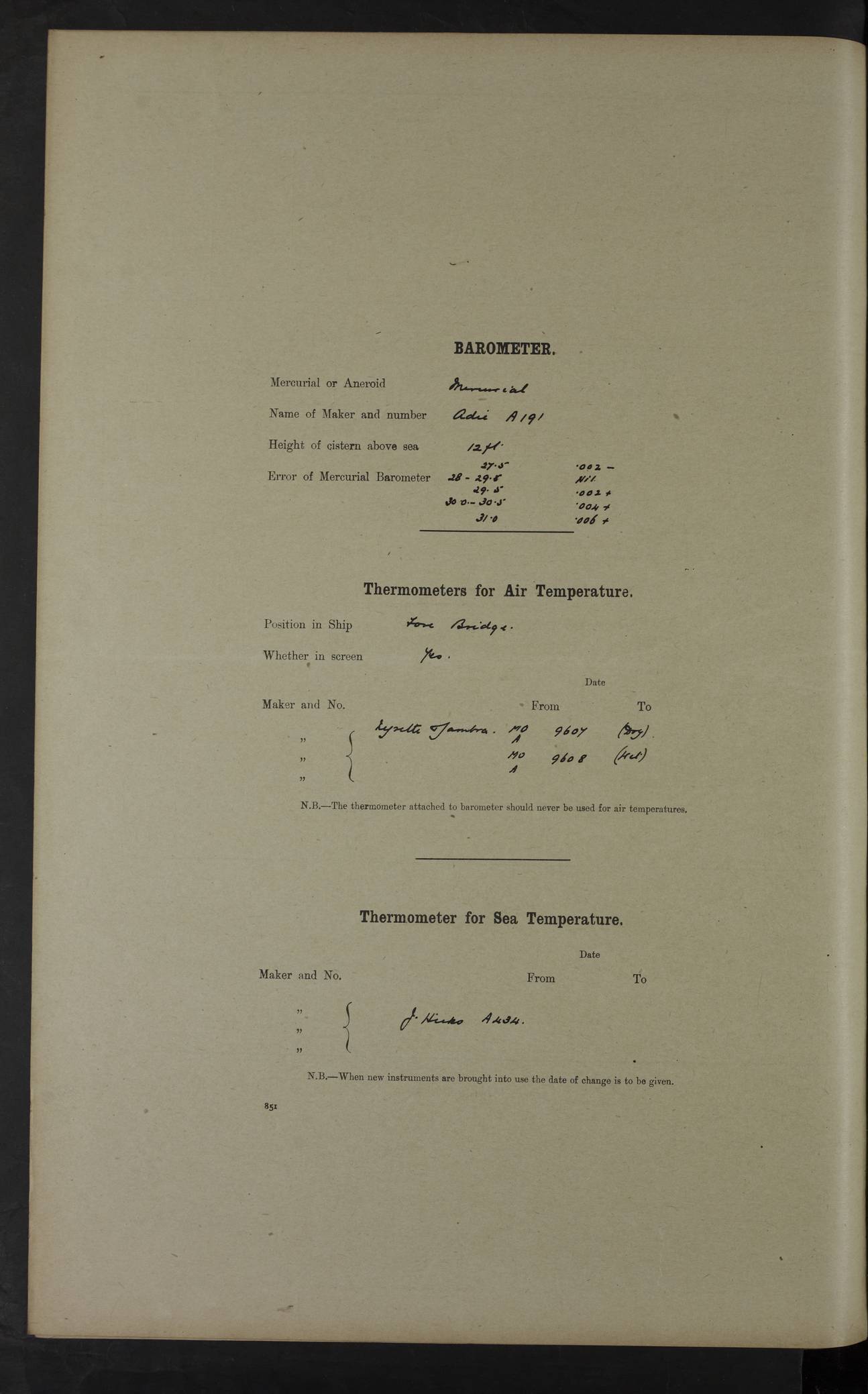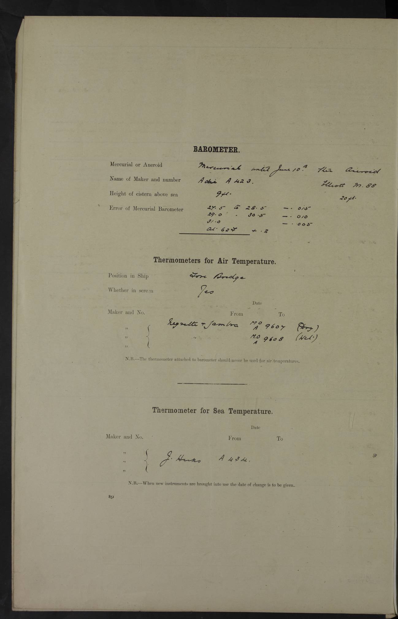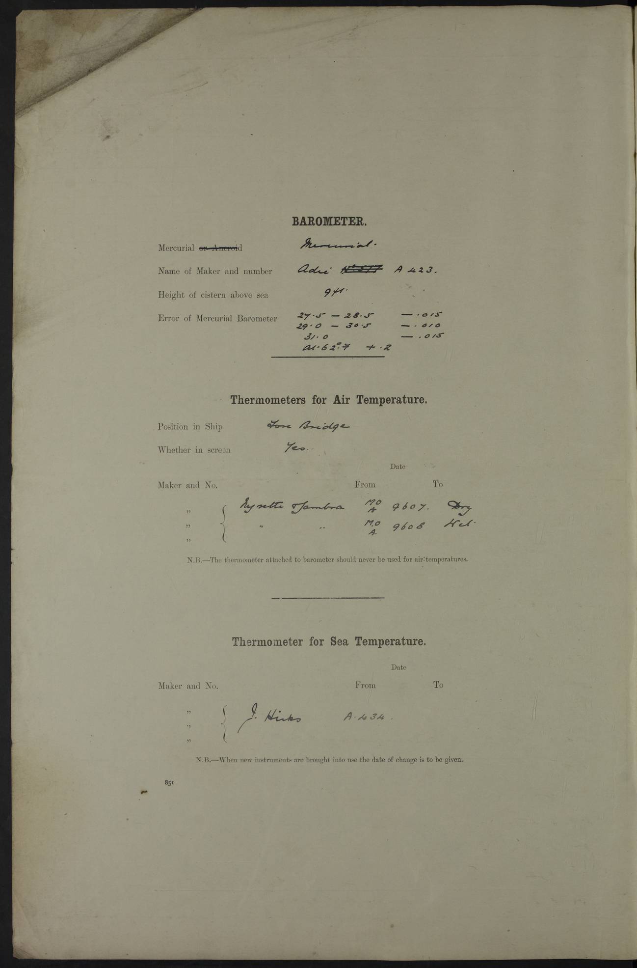 (Maps prepared using Journey Plotter, developed by Maikel. The Plots can only be approximate. They are made by joining-up positions on successive days, and sometimes positions are not given. There will therefore be occasions when the ship appears to have travelled overland) LOG BOOK – JUNE 14TH 1913 TO MAY 31ST 1914 4f960fe4a2fc8e2def00041b: (http://s3.amazonaws.com/oldweather/ADM53-44291/ADM 53-44291-001_0.jpg) 4f960fe5a2fc8e2def00041c: (http://s3.amazonaws.com/oldweather/ADM53-44291/ADM 53-44291-001_1.jpg) 4f960fe5a2fc8e2def00041d: (http://s3.amazonaws.com/oldweather/ADM53-44291/ADM 53-44291-002_0.jpg) 4f960fe5a2fc8e2def00041e: (http://s3.amazonaws.com/oldweather/ADM53-44291/ADM 53-44291-002_1.jpg) LOG of HMS Highflyer Commanded by Captain HT Buller MVO FOR THE PERIOD Commencing Saturday 14th June 1913 Ending Sunday 31st May 1914 Tonnage (displacement): 5600 Extreme length: 350 ft Extreme breadth: 54 ft ENGINES Manufacturer: Fairfield Shipbuilding & Engineering Co, Glasgow IHP: 10.000 Description: Vertical triple expansion 4 cylinders When fixed on board: 1898 BOILERS Manufacturer: Fairfield Shipbuilding & Engineering Co Description: Belleville with economisers 18 in No When made: 1898 When put in vessel: 1898 SCREW PROPELLER Manufacturer: Fairfield Shipbuilding & Engineering Co Description: Twin 3 bladed Admiralty design (bronze) General state of repair: Good 4f960fe6a2fc8e2def00041f: (http://s3.amazonaws.com/oldweather/ADM53-44291/ADM 53-44291-003_0.jpg) [Directions for using the log, figures to indicate the force of the wind and the state of the sea, and letters to denote the state of the weather.] 4f960fe6a2fc8e2def000420: (http://s3.amazonaws.com/oldweather/ADM53-44291/ADM 53-44291-003_1.jpg) Establishment of ship’s company Officers 32 Seamen 164 Boys 24 Marines 50 Engine-room establishment 134 Other non-executive ratings 466 BAROMETER Mercurial or aneroid: Mercurial Name of maker & number: Adie A 577 Height of cistern above sea: 9 feet Thermometers for air temperature Position in ship: Fore bridge Whether in screen: Yes Maker & number: Negretti & Zambra MO/A 9607 dry; from June 14, 1913 to June 1, 1914 MO/A 9603 wet; from June 14, 1913 to June 1, 1914 Thermometer for sea temperature Maker & number: J Hicks A 434; from June 14, 1913 to June 1, 1914 Position of standard compass Fore upper bridge DEVIATION OF STANDARD COMPASS Date obtained: August 29th 1913 Position: Sheerness, No 28 buoy ARMAMENT Fxle: one 6” QF PII S waist: four 6” QF PII P waist: four 6” QF PII OD: two 6” QF PII Battle deck: two 12-pounder 12-cwt SII S waist: three 12-pounder 12-cwt SII P waist: three 12-pounder 12-cwt SII AS deck: 3-pounder QF (Hotchkiss) P waist: 12-pounder 8-cwt field gun Torpedo armament 2 18” tubes BOATS 2 pinnaces, 36 ft sailing 2 cutters 1 gig, 30 ft 1 whaler 1 steam cutter, 32 ft MISCELLANEOUS INFORMATION Draught of water with bunkers full, and complete with provisions, stores and water: forward 22 ft 0 in, aft 23 ft 2 in Load draught, 600 tons coal: forward 19 ft 6 in, aft 21 ft 6 in Number of tons necessary to increase draught 1 inch: 31.5 Number of tons of coal carried (43 cubic feet per ton): a) At load draught, 600 b) With bunkers full, 1132 c) In places other than bunkers, nil Quantity of water carried: a) For boilers, 207 tons b) For drinking 60 tons THE VOYAGES OF HMS HIGHFLYER 1913-1914