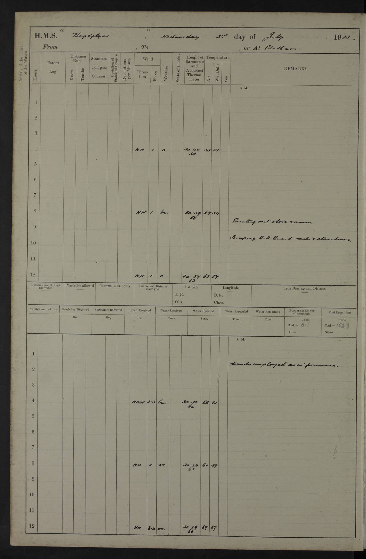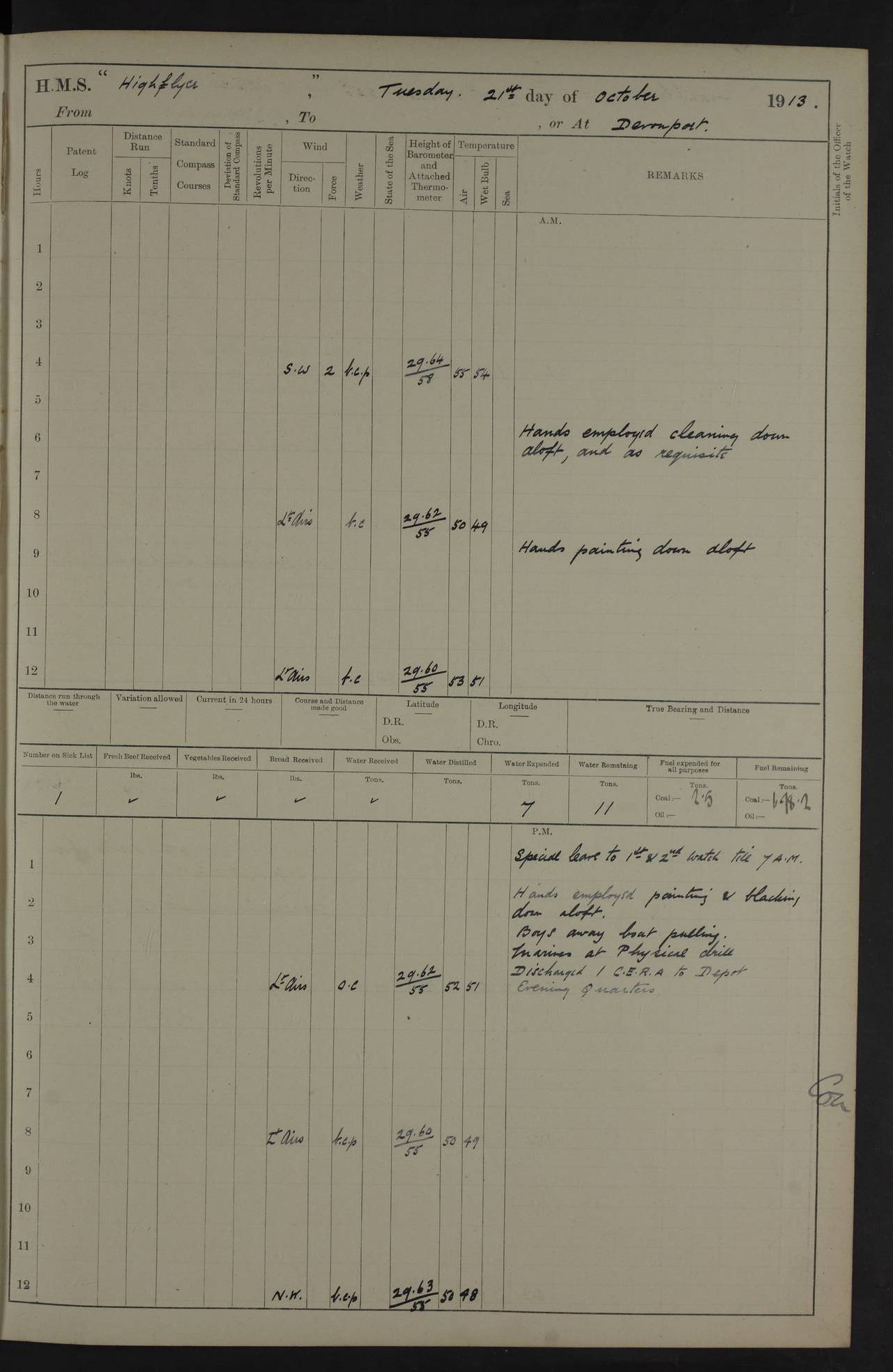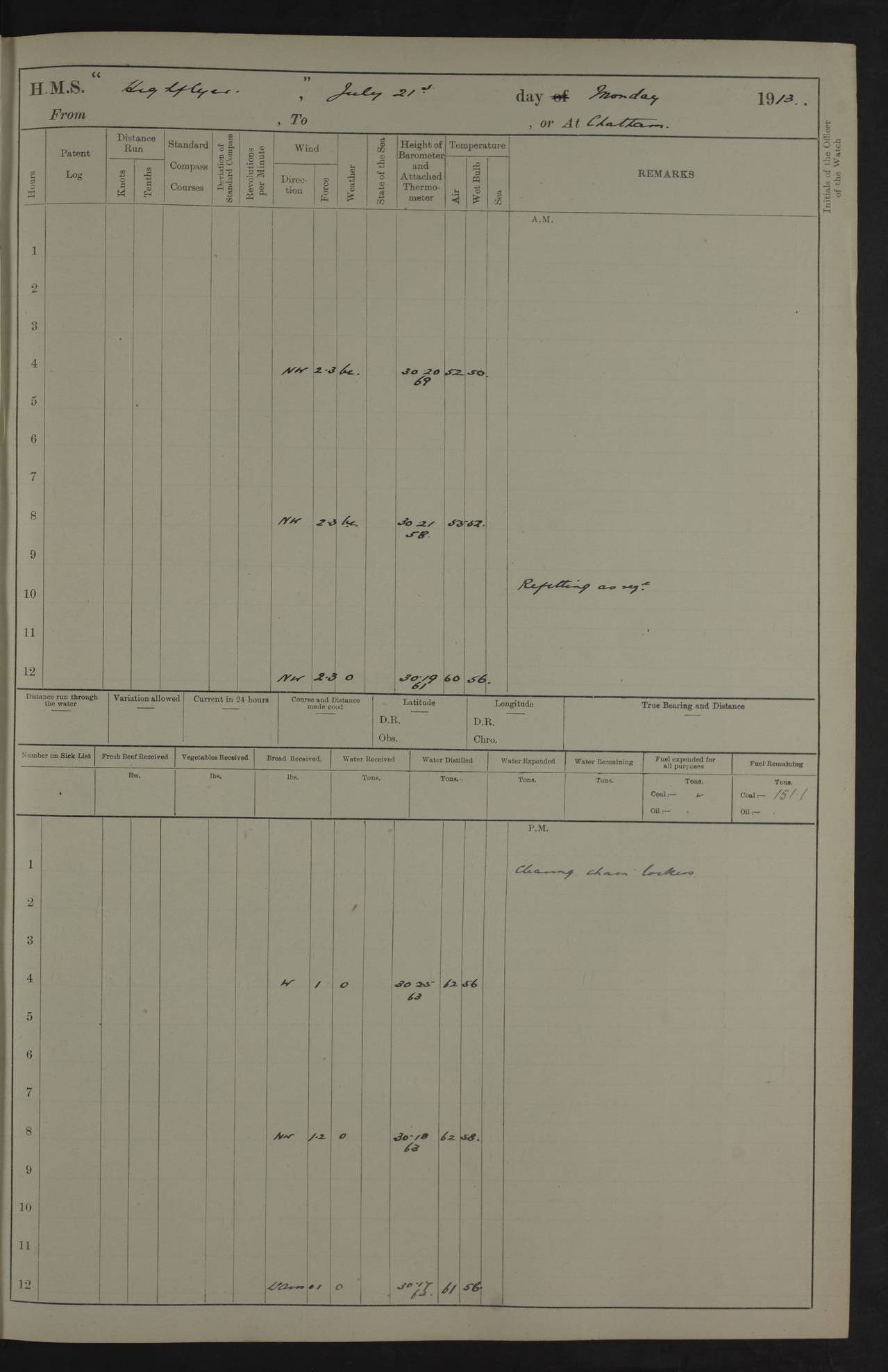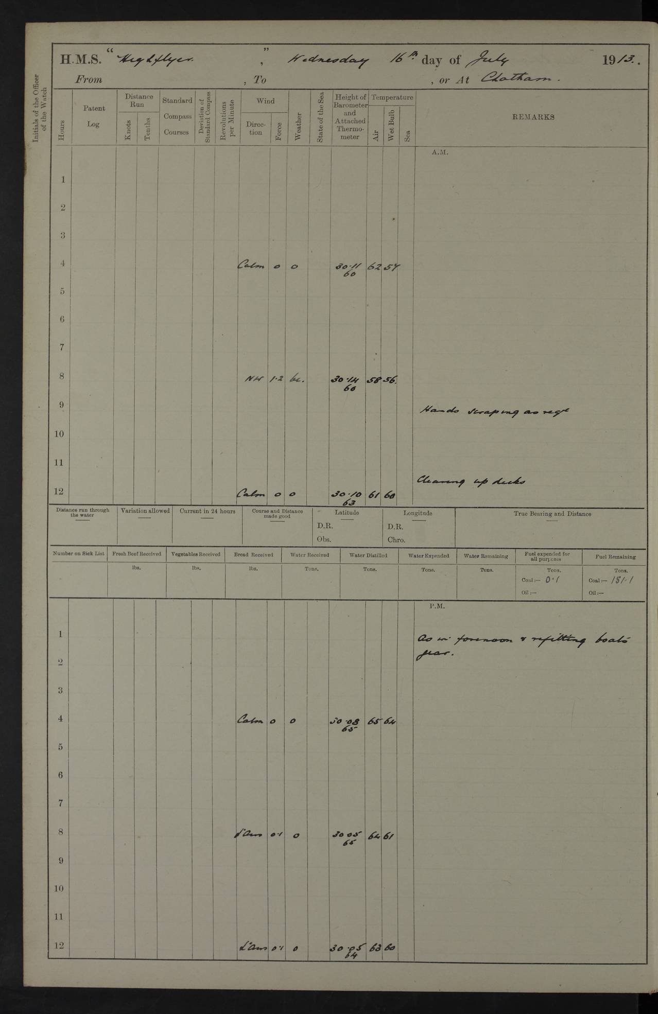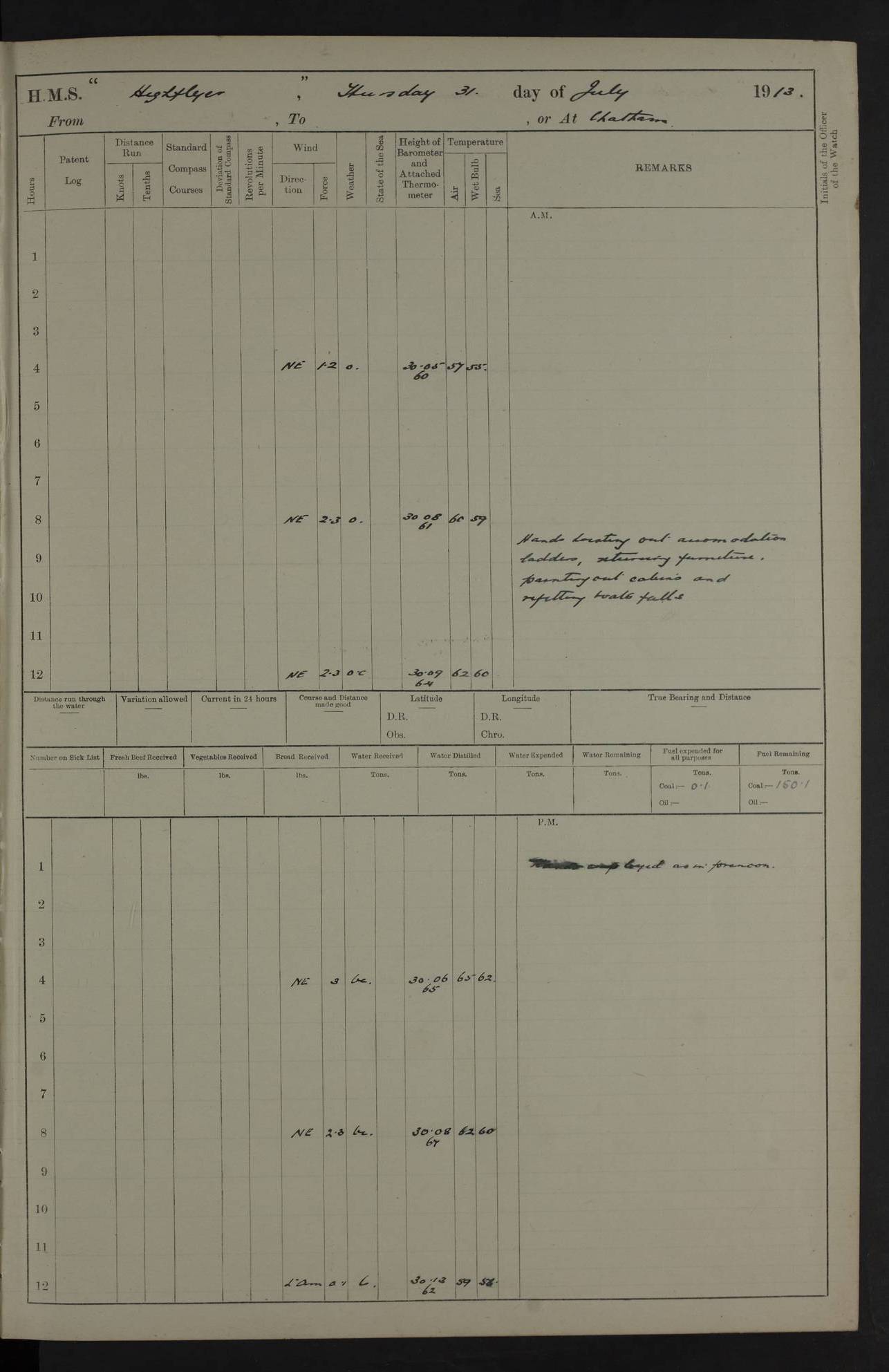 LOGS FOR JUNE 1913 4f960fe6a2fc8e2def000421: (http://s3.amazonaws.com/oldweather/ADM53-44291/ADM 53-44291-004_0.jpg) 14 June 1913 Chatham Lat 51.3855, Long 0.5174 Recommissioned ship. Ship’s company living on board ABOUKIR. 4 watch keepers, 1 PO and 3 AB on board. 4f960fe7a2fc8e2def000422: (http://s3.amazonaws.com/oldweather/ADM53-44291/ADM 53-44291-004_1.jpg) 15 June 1913 Chatham Lat 51.3855, Long 0.5174 [Weather records only.] 4f960fe7a2fc8e2def000423: (http://s3.amazonaws.com/oldweather/ADM53-44291/ADM 53-44291-005_0.jpg) 16 June 1913 Chatham, Lat 51.3855, Long 0.5174 Cleaning the ship. 4f960fe7a2fc8e2def000424: (http://s3.amazonaws.com/oldweather/ADM53-44291/ADM 53-44291-005_1.jpg) 17 June 1913 Chatham Lat 51.40, Long 0.50 2.00pm: Mr. Wright, carpenter, joined ship. 4f960fe8a2fc8e2def000425: (http://s3.amazonaws.com/oldweather/ADM53-44291/ADM 53-44291-006_0.jpg) 18 June 1913 Chatham Lat 51.3855, Long 0.5174 8.30am: BRILLIANT came alongside. 4f960fe8a2fc8e2def000426: (http://s3.amazonaws.com/oldweather/ADM53-44291/ADM 53-44291-006_1.jpg) 19 June 1913 Chatham Lat 51.4, Long 0.5 Hands employed stowing shell rooms and sail rooms. 4f960fe8a2fc8e2def000427: (http://s3.amazonaws.com/oldweather/ADM53-44291/ADM 53-44291-007_0.jpg) 20 June 1913 Chatham Lat 51.3855, Long 0.5174 FORTE secured alongside. 4f960fe9a2fc8e2def000428: (http://s3.amazonaws.com/oldweather/ADM53-44291/ADM 53-44291-007_1.jpg) 21 June 1913 Chatham Lat 51.3855, Long 0.5174 Cleaning ship. 4f960fe9a2fc8e2def000429: (http://s3.amazonaws.com/oldweather/ADM53-44291/ADM 53-44291-008_0.jpg) 22 June 1913 Chatham Lat 51.3855, Long 0.5174 [Weather records only.] 4f960fe9a2fc8e2def00042a: (http://s3.amazonaws.com/oldweather/ADM53-44291/ADM 53-44291-008_1.jpg) 23 June 1913 Chatham Lat 51.3855, Long 0.5174 Dressed ship masthead flags. 4f960feaa2fc8e2def00042b: (http://s3.amazonaws.com/oldweather/ADM53-44291/ADM 53-44291-009_0.jpg) 24 June 1913 Chatham Lat 51.3855, Long 0.5174 Marines at drill. 4f960feaa2fc8e2def00042c: (http://s3.amazonaws.com/oldweather/ADM53-44291/ADM 53-44291-009_1.jpg) 25 June 1913 Chatham Lat 51.3855, Long 0.5174 9.30am: Navy League party visited ship, 250. 4f960feaa2fc8e2def00042d: (http://s3.amazonaws.com/oldweather/ADM53-44291/ADM 53-44291-010_0.jpg) 26 June 1913 Chatham Lat 51.3855, Long 0.5174 Hands cleaning out provision rooms. 4f960feba2fc8e2def00042e: (http://s3.amazonaws.com/oldweather/ADM53-44291/ADM 53-44291-010_1.jpg) 27 June 1913 Chatham Lat 51.3855, Long 0.5174 Half masted colours. 4f960feba2fc8e2def00042f: (http://s3.amazonaws.com/oldweather/ADM53-44291/ADM 53-44291-011_0.jpg) 28 June 1913 Chatham Lat 51.3855, Long 0.5174 Cleaning ship. 4f960feba2fc8e2def000430: (http://s3.amazonaws.com/oldweather/ADM53-44291/ADM 53-44291-011_1.jpg) 29 June 1913 Chatham Lat 51.3855, Long 0.5174 [Weather records only.] 4f960feca2fc8e2def000431: (http://s3.amazonaws.com/oldweather/ADM53-44291/ADM 53-44291-012_0.jpg) 30 June 1913 Chatham Lat 51.3855, Long 0.5174 9.30am: One rating joined from Portsmouth. LOGS FOR JULY 1913 4f960feca2fc8e2def000432: (http://s3.amazonaws.com/oldweather/ADM53-44291/ADM 53-44291-012_1.jpg) 1 July 1913 Chatham Lat 51.3855, Long 0.5174 9.00am: Captain Butler joined ship. 2.30pm: 1 LS joined ship 4f960feca2fc8e2def000433: (http://s3.amazonaws.com/oldweather/ADM53-44291/ADM 53-44291-013_0.jpg) 2 July 1913 Chatham Lat 51.3855, Long 0.5174 Painting out store rooms. 4f960feda2fc8e2def000434: (http://s3.amazonaws.com/oldweather/ADM53-44291/ADM 53-44291-013_1.jpg) 3 July 1913 Chatham Lat 51.3855, Long 0.5174 Painting and scraping. 4f960feda2fc8e2def000435: (http://s3.amazonaws.com/oldweather/ADM53-44291/ADM 53-44291-014_0.jpg) 4 July 1913 Chatham Lat 51.3855, Long 0.5174 Painting and scraping. 4f960feda2fc8e2def000436: (http://s3.amazonaws.com/oldweather/ADM53-44291/ADM 53-44291-014_1.jpg) 5 July 1913 Chatham Lat 51.3855, Long 0.5174 Cleaning up. 4f960feea2fc8e2def000437: (http://s3.amazonaws.com/oldweather/ADM53-44291/ADM 53-44291-015_0.jpg) 6 July 1913 Chatham Lat 51.3855, Long 0.5174 [Weather records only.] 4f960feea2fc8e2def000438: (http://s3.amazonaws.com/oldweather/ADM53-44291/ADM 53-44291-015_1.jpg) 7 July 1913 Chatham Lat 51.3855, Long 0.5174 Painting. 4f960feea2fc8e2def000439: (http://s3.amazonaws.com/oldweather/ADM53-44291/ADM 53-44291-016_0.jpg) 8 July 1913 Chatham Lat 51.3855, Long 0.5174 Hands provisioning ship. 4f960fefa2fc8e2def00043a: (http://s3.amazonaws.com/oldweather/ADM53-44291/ADM 53-44291-016_1.jpg) 9 July 1913 Chatham Lat 51.3855, Long 0.5174 Provisioning ship. 4f960fefa2fc8e2def00043b: (http://s3.amazonaws.com/oldweather/ADM53-44291/ADM 53-44291-017_0.jpg) 10 July 1913 Chatham Lat 51.4, Long 0.5 Hands scraping, chipping & cleaning up generally. 4f960fefa2fc8e2def00043c: (http://s3.amazonaws.com/oldweather/ADM53-44291/ADM 53-44291-017_1.jpg) 11 July 1913 Chatham Lat 51.4, Long 0.5 Preparing ship for going into dock. 4f960fefa2fc8e2def00043d: (http://s3.amazonaws.com/oldweather/ADM53-44291/ADM 53-44291-018_0.jpg) 12 July 1913 Chatham Lat 51.3855, Long 0.5174 10.00am: Commenced docking. 4f960ff0a2fc8e2def00043e: (http://s3.amazonaws.com/oldweather/ADM53-44291/ADM 53-44291-018_1.jpg) 13 July 1913 Chatham Lat 51.3855, Long 0.5174 [Weather records only.] 4f960ff0a2fc8e2def00043f: (http://s3.amazonaws.com/oldweather/ADM53-44291/ADM 53-44291-019_0.jpg) 14 July 1913 Chatham Lat 51.3855, Long 0.5174 1.00pm: Transferred bags and hammocks from ABOUKIR to HIGHFLYER. 4f960ff0a2fc8e2def000440: (http://s3.amazonaws.com/oldweather/ADM53-44291/ADM 53-44291-019_1.jpg) 15 July 1913 Chatham Lat 51.4, Long 0.5 9.00am: Ships’ company transferring bags and hammocks to Depot. 4f960ff1a2fc8e2def000441: (http://s3.amazonaws.com/oldweather/ADM53-44291/ADM 53-44291-020_0.jpg) 16 July 1913 Chatham Lat 51.3855, Long 0.5174 Hands scraping as requisite. 4f960ff1a2fc8e2def000442: (http://s3.amazonaws.com/oldweather/ADM53-44291/ADM 53-44291-020_1.jpg) 17 July 1913 Chatham Lat 51.3855, Long 0.5174 Refitting